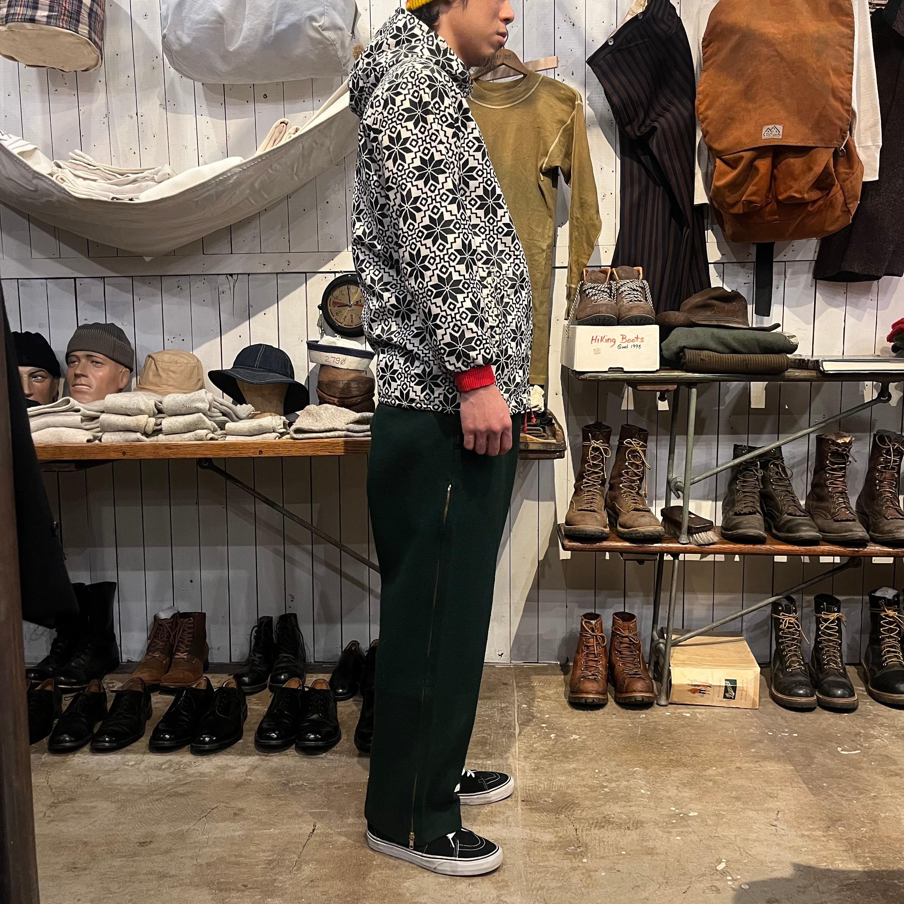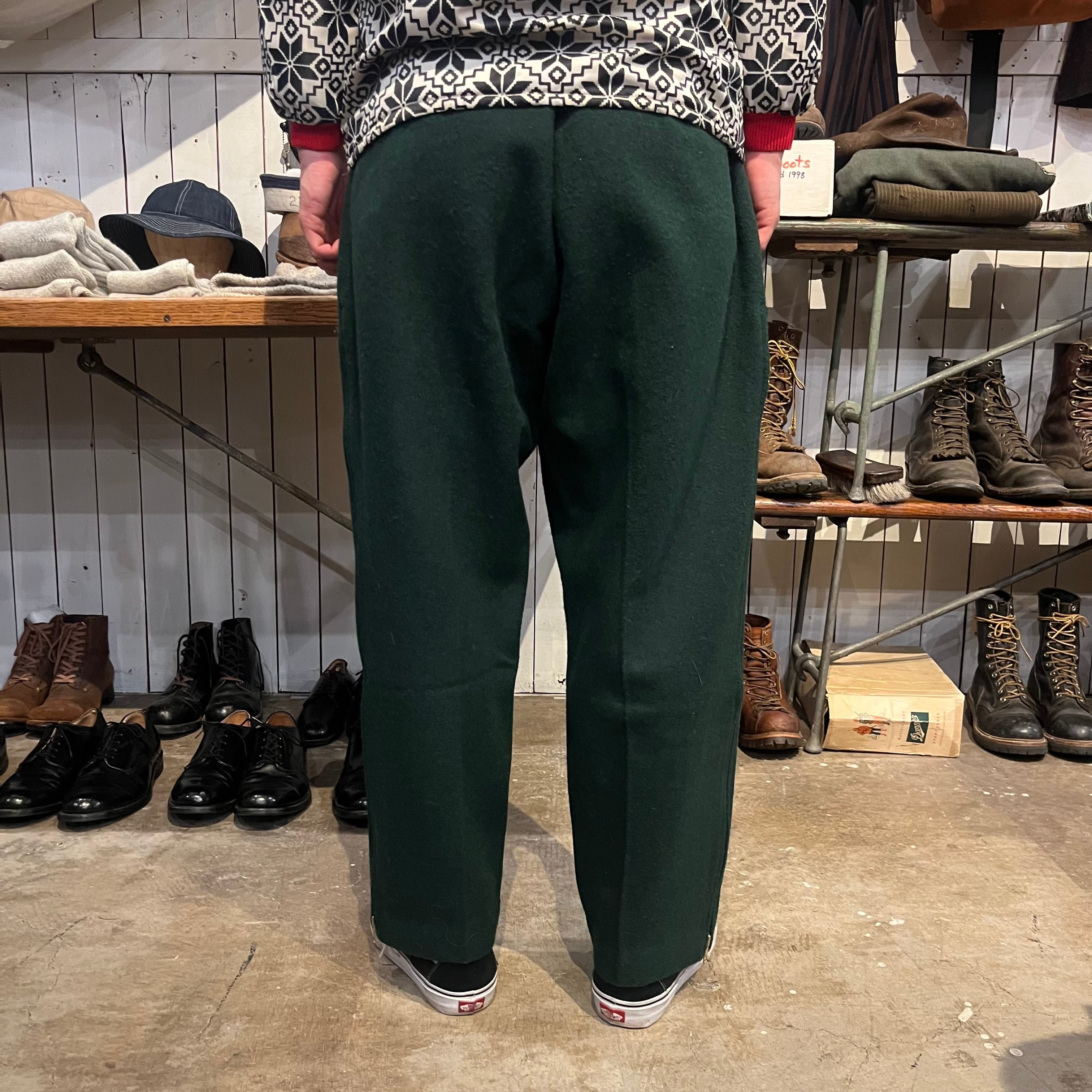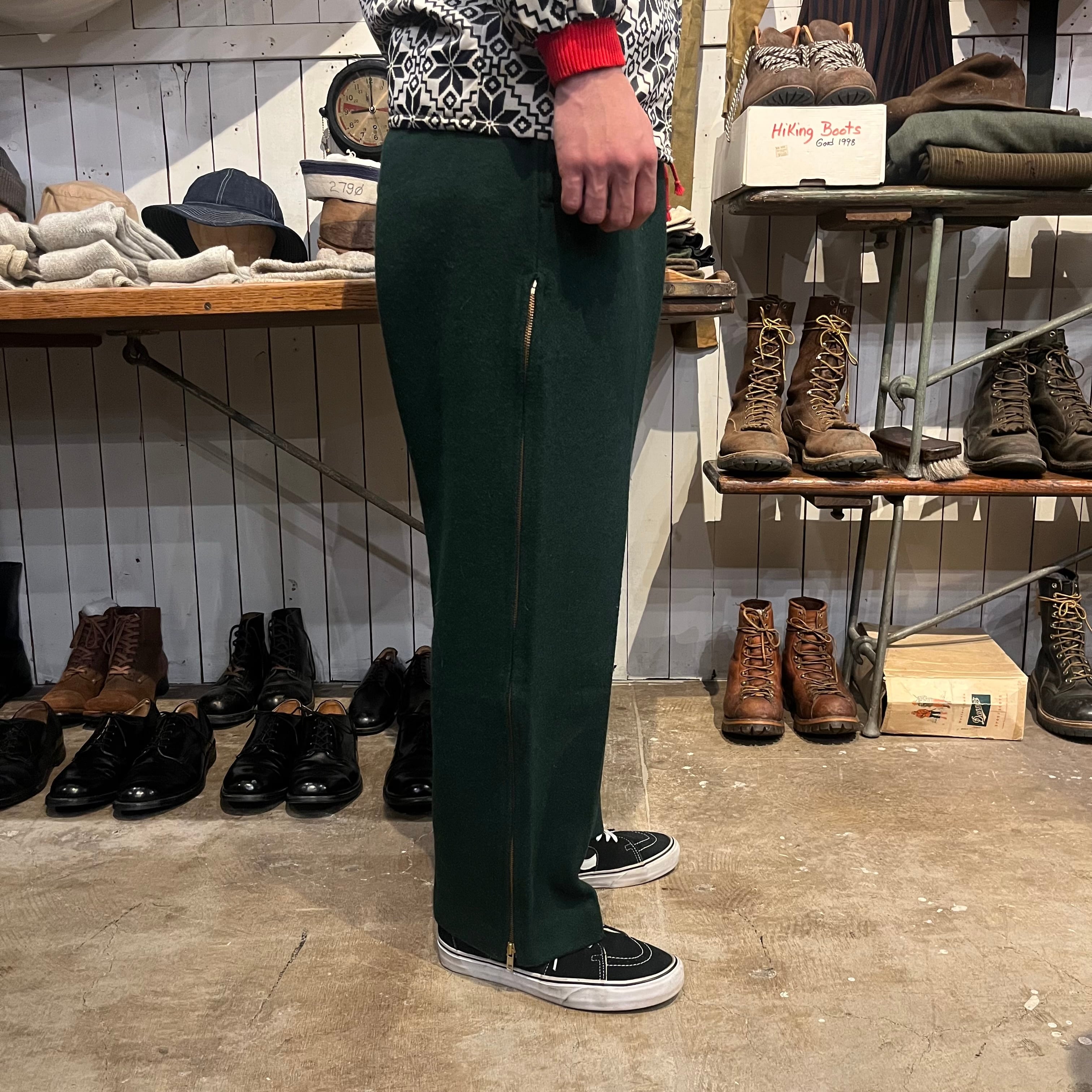 メルトンウールのパンツになります。色はオリーブのようなカラーです。サイドには長めのジップがついていてパンツをレイヤードして履くことも可能です。スカート感覚で重ねることができると思います。重さがあるので下にストンと落ちるようなシルエットになります。ベストの締め具合に寄って変化をつけて履くこともできそうです。