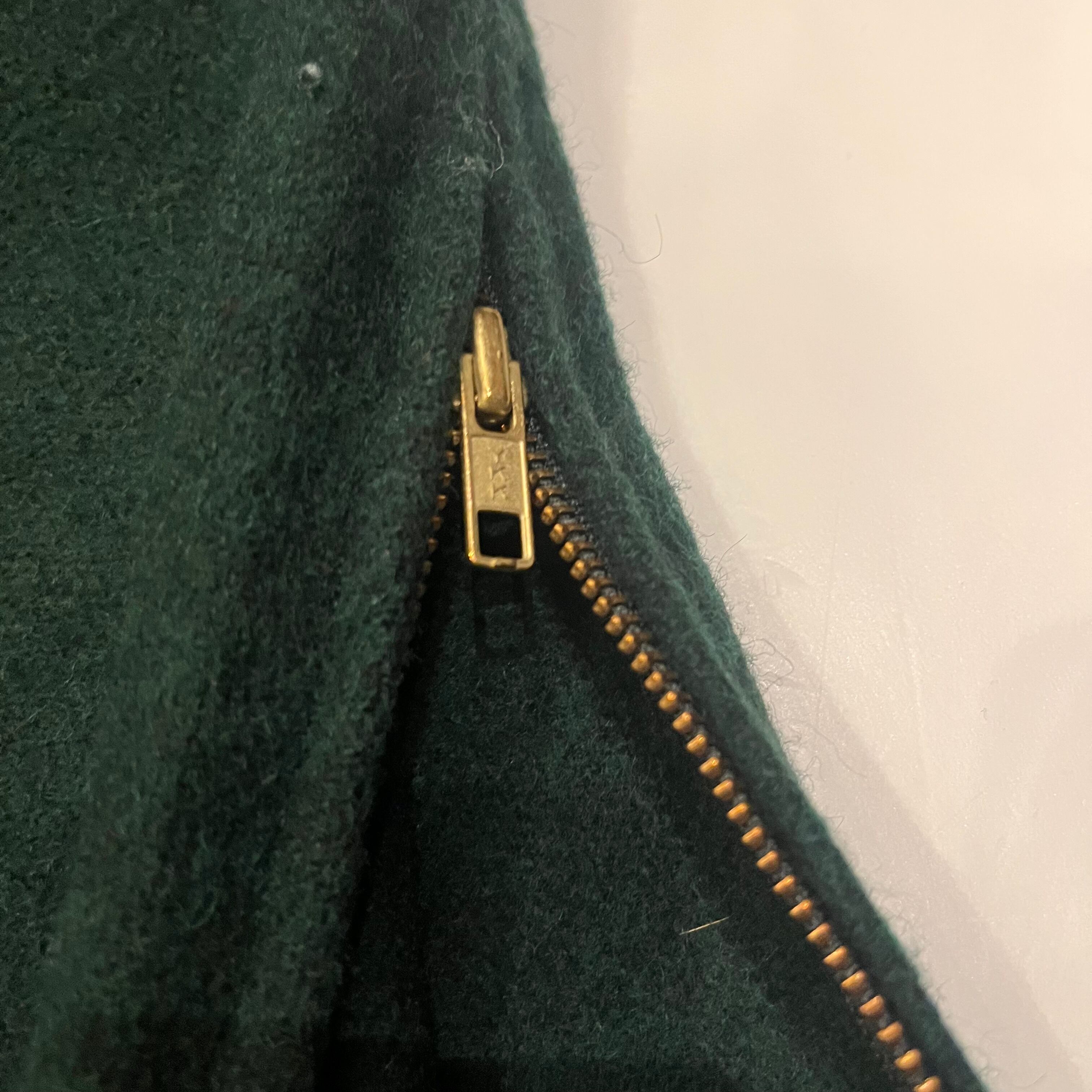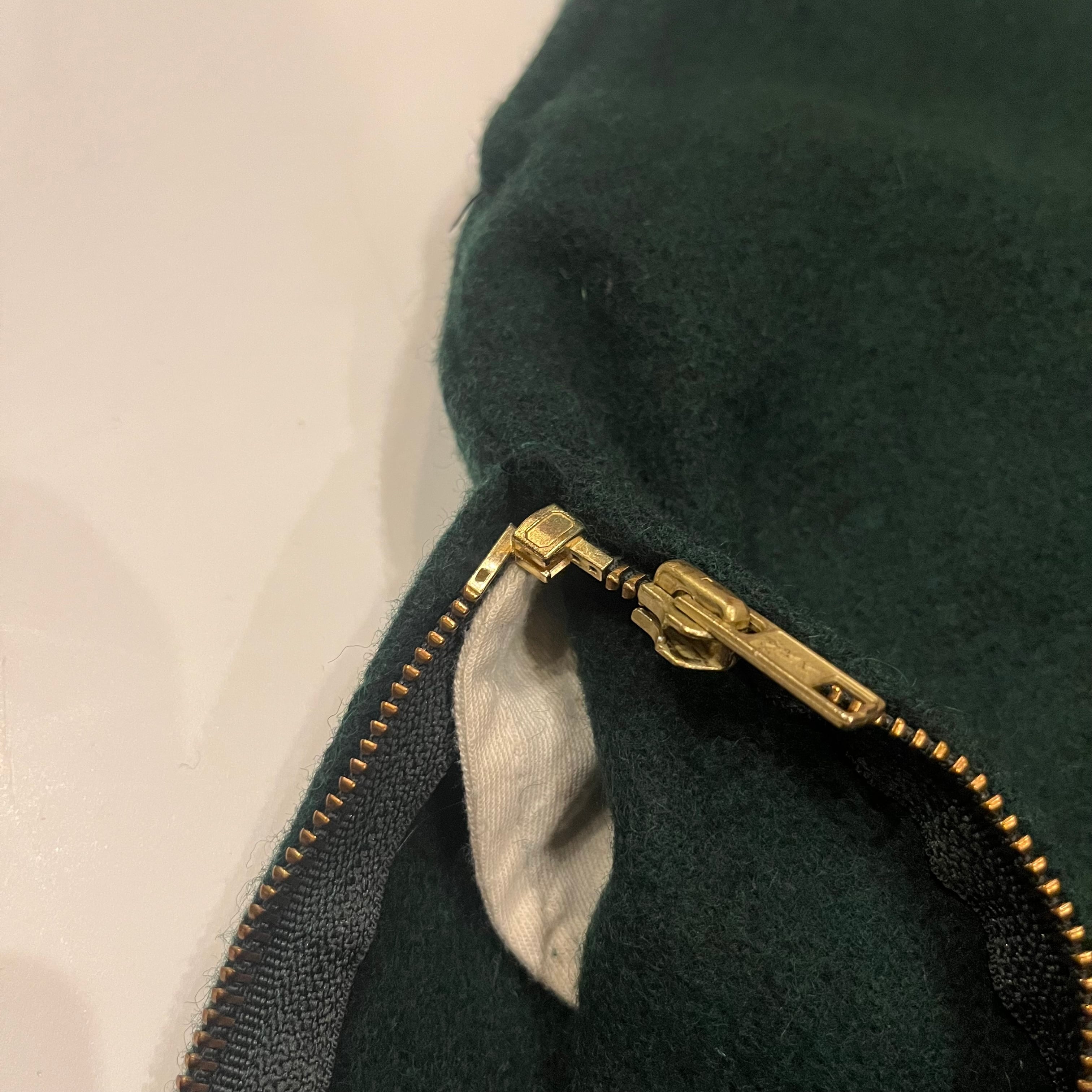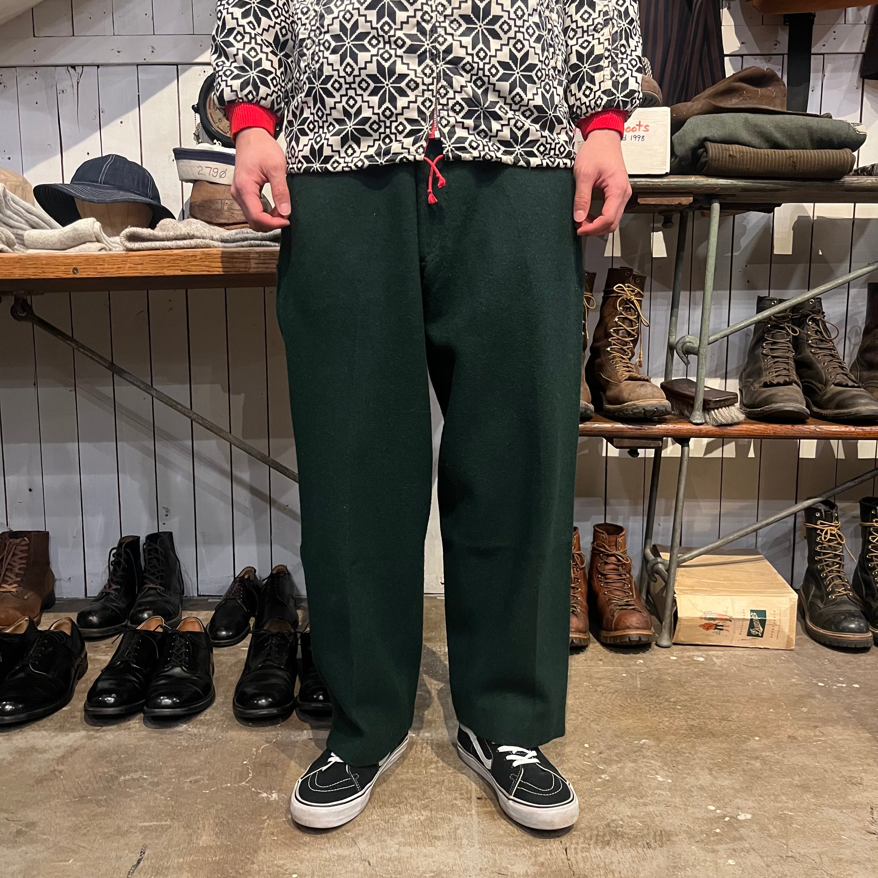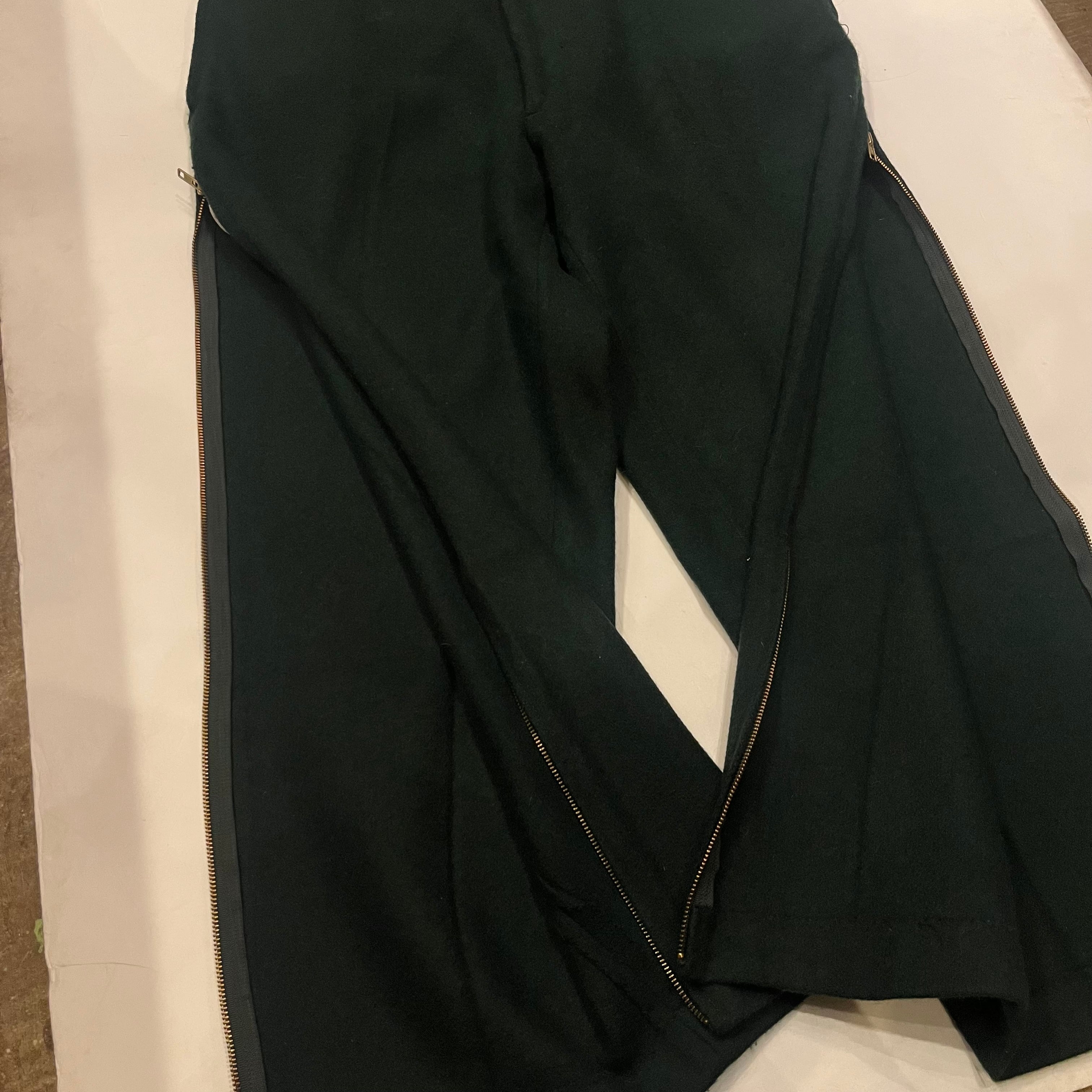 メルトンウールのパンツになります。色はオリーブのようなカラーです。サイドには長めのジップがついていてパンツをレイヤードして履くことも可能です。スカート感覚で重ねることができると思います。重さがあるので下にストンと落ちるようなシルエットになります。ベストの締め具合に寄って変化をつけて履くこともできそうです。