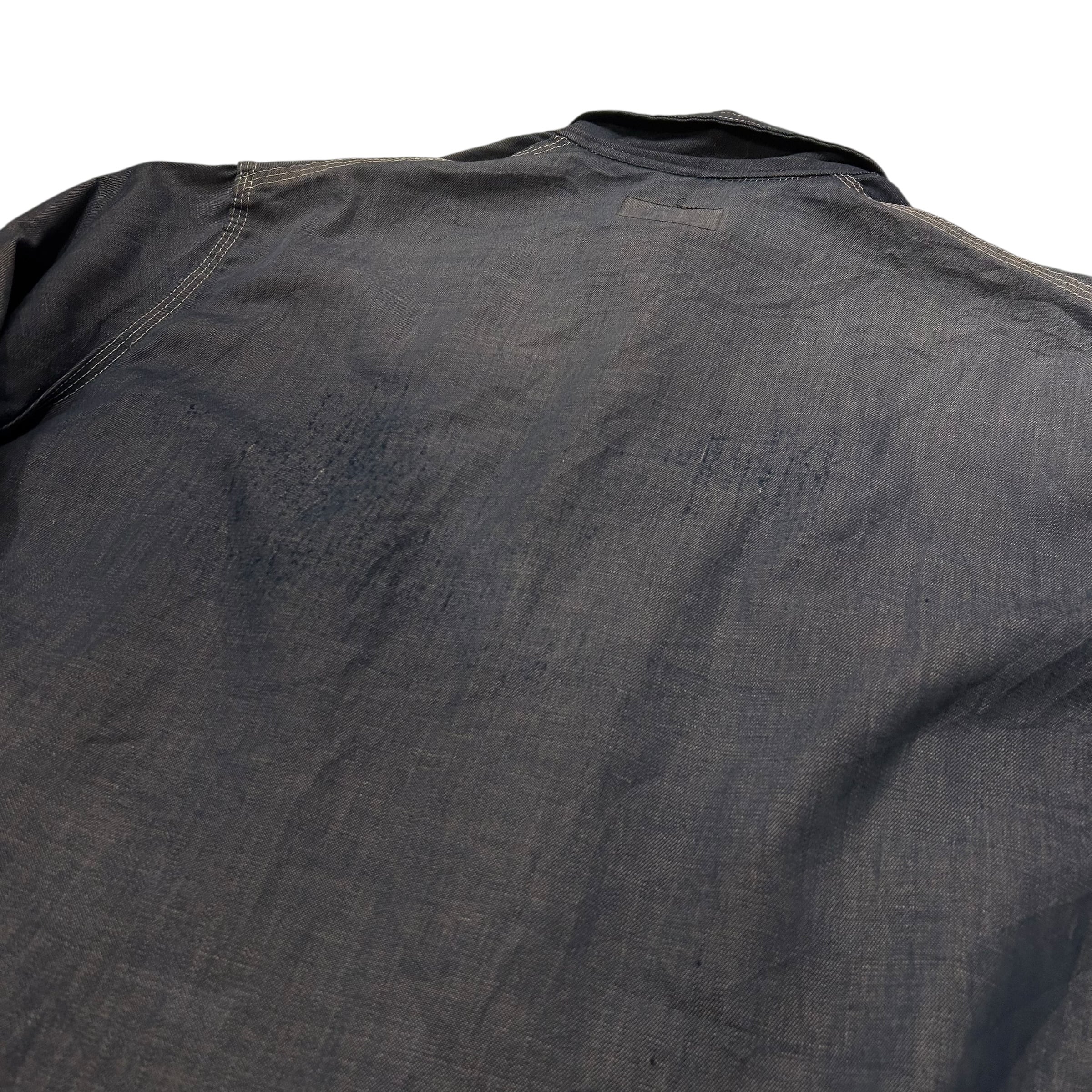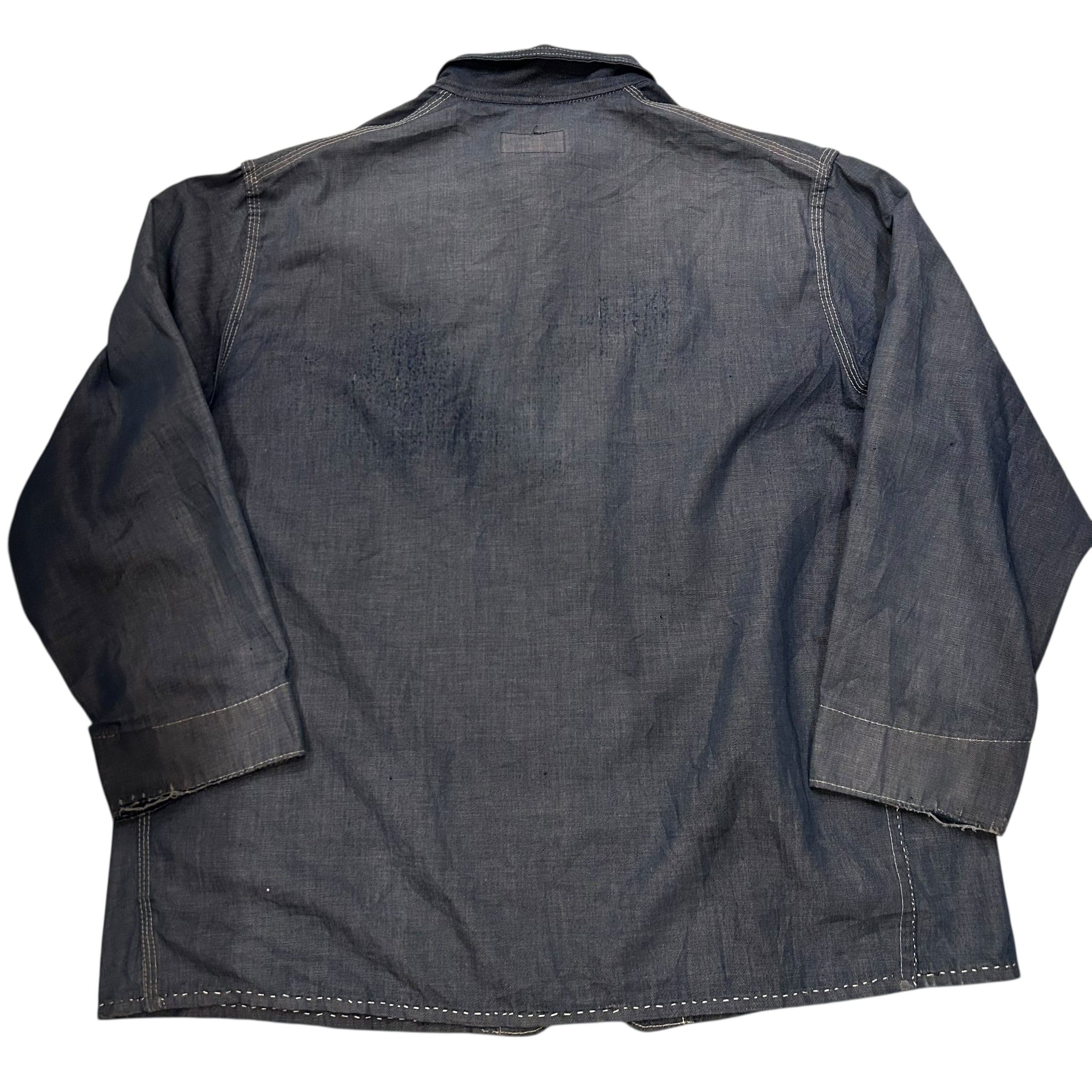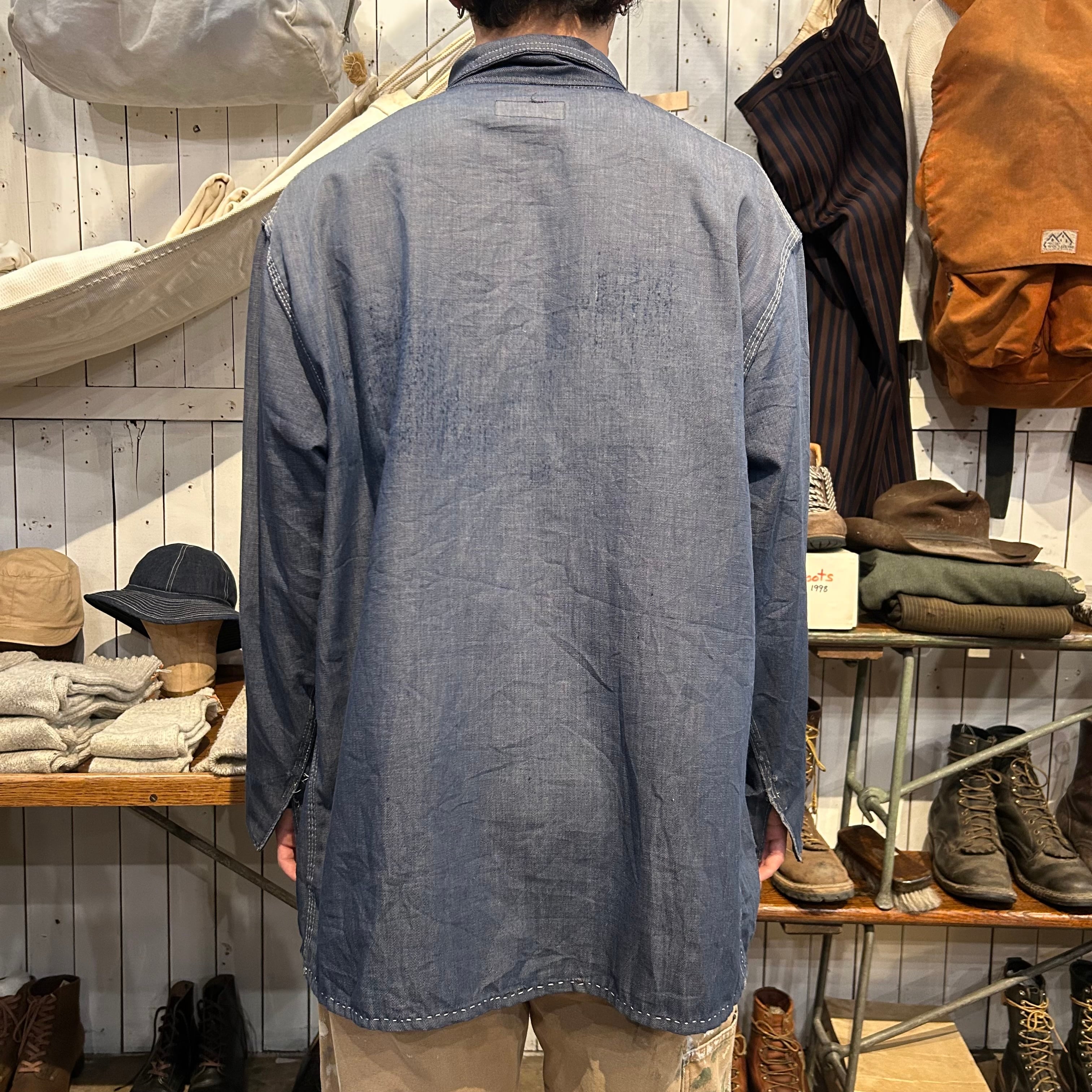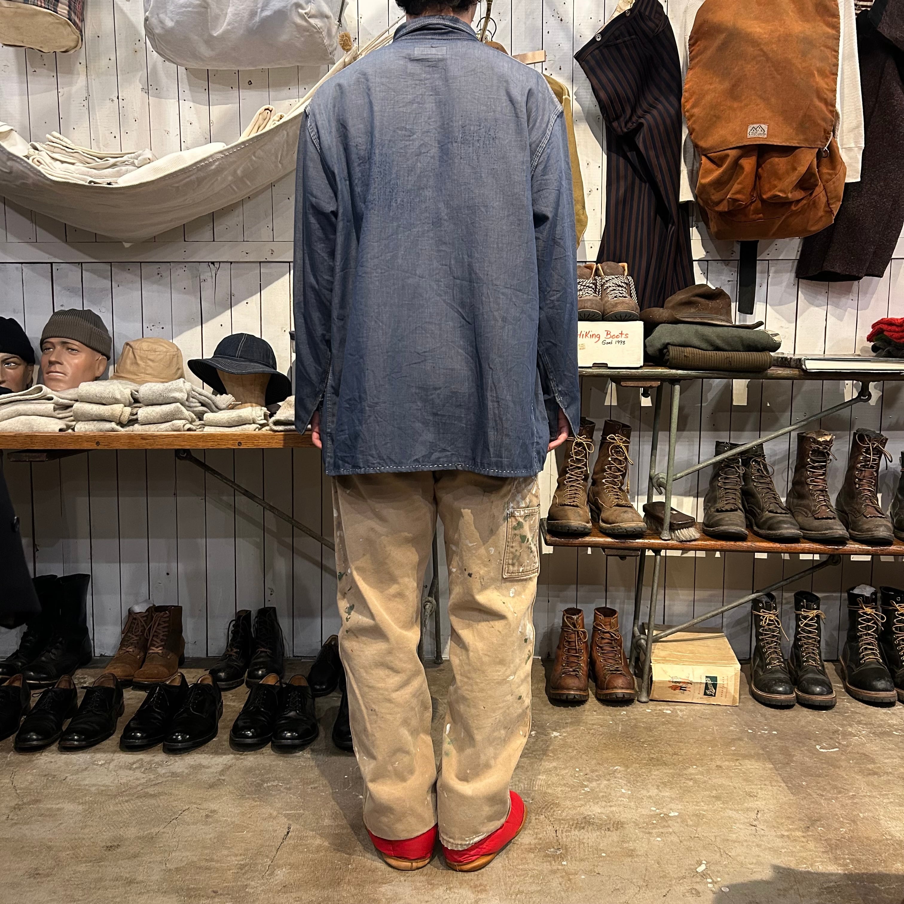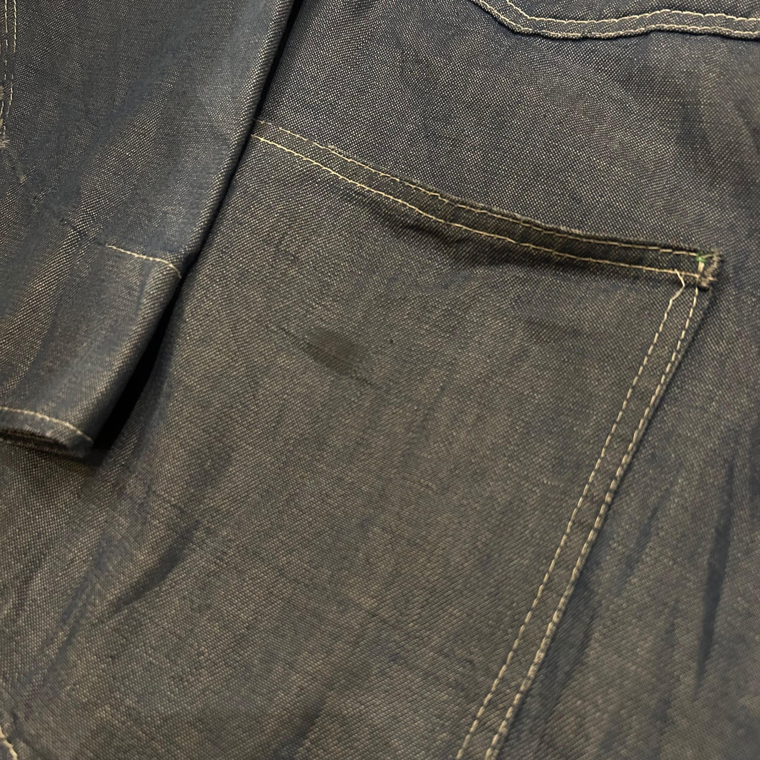 同ブランドの年代の古いカバオールよりもオンスが薄く、シャツジャケットのような印象です。コンディションは所々にダメージがございます。バック、袖にダメージ、フロントポケット、肩付近にシミがございます。ですが、あまり染みは目立たない印象です。