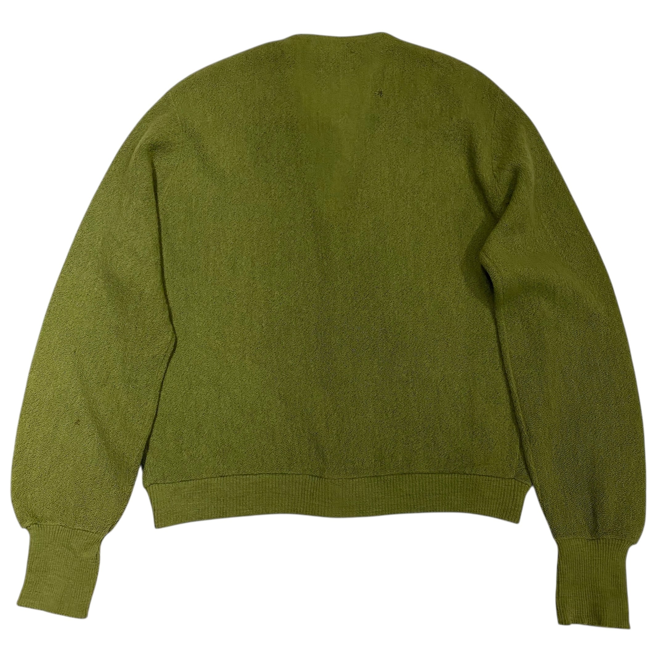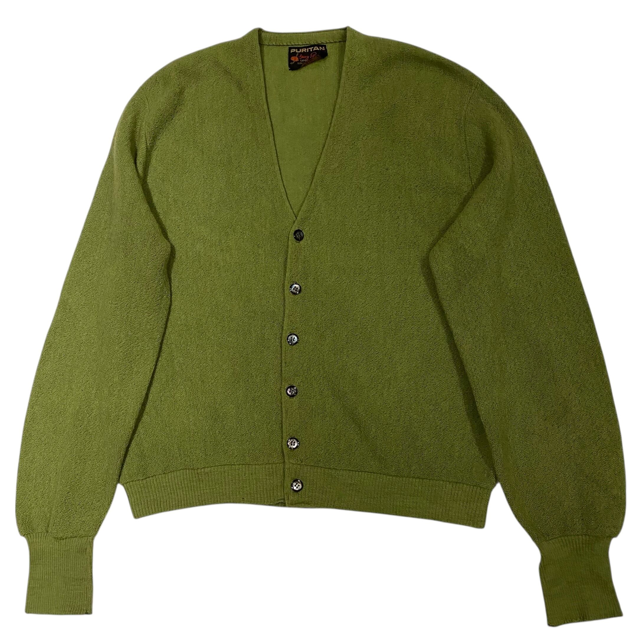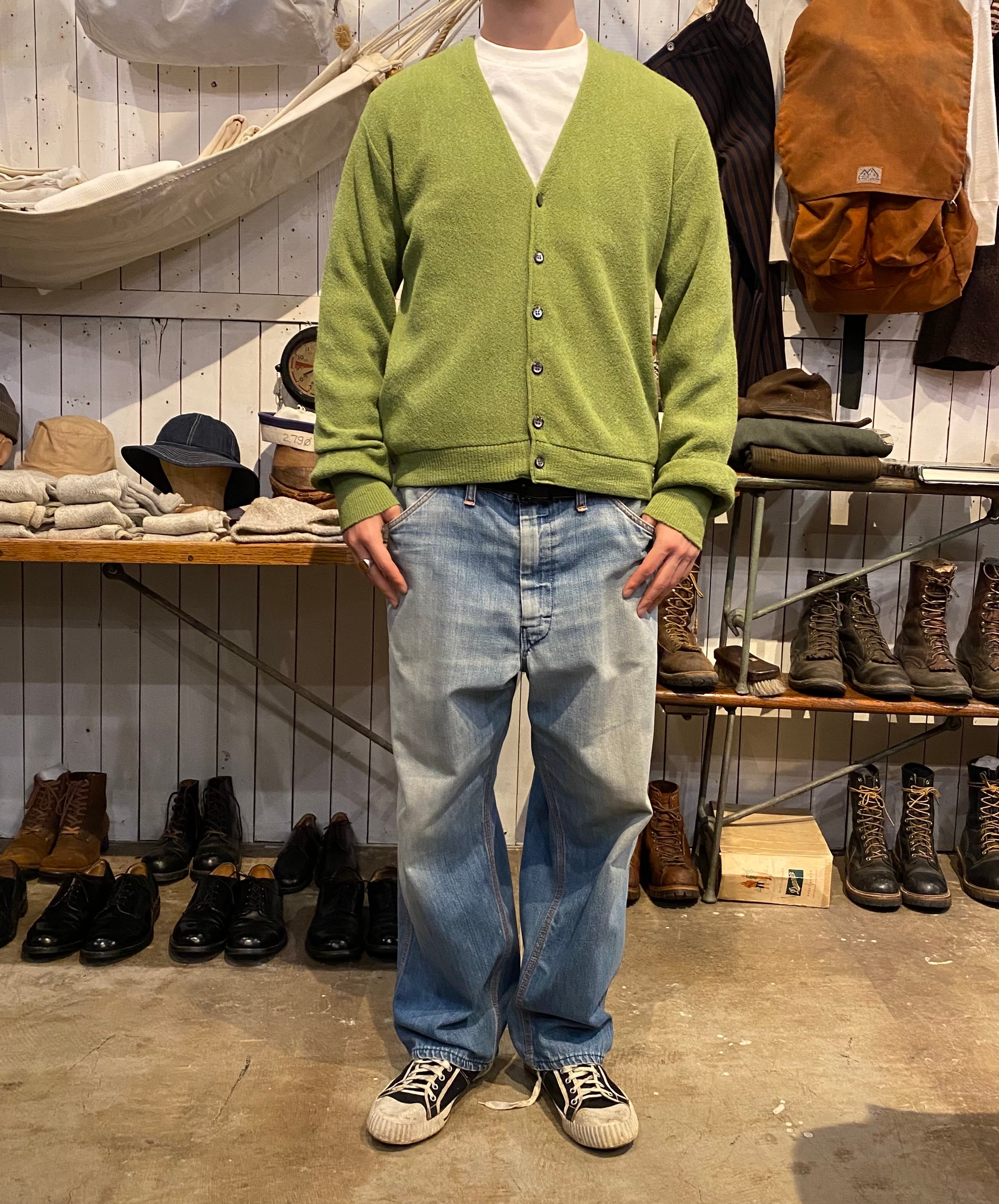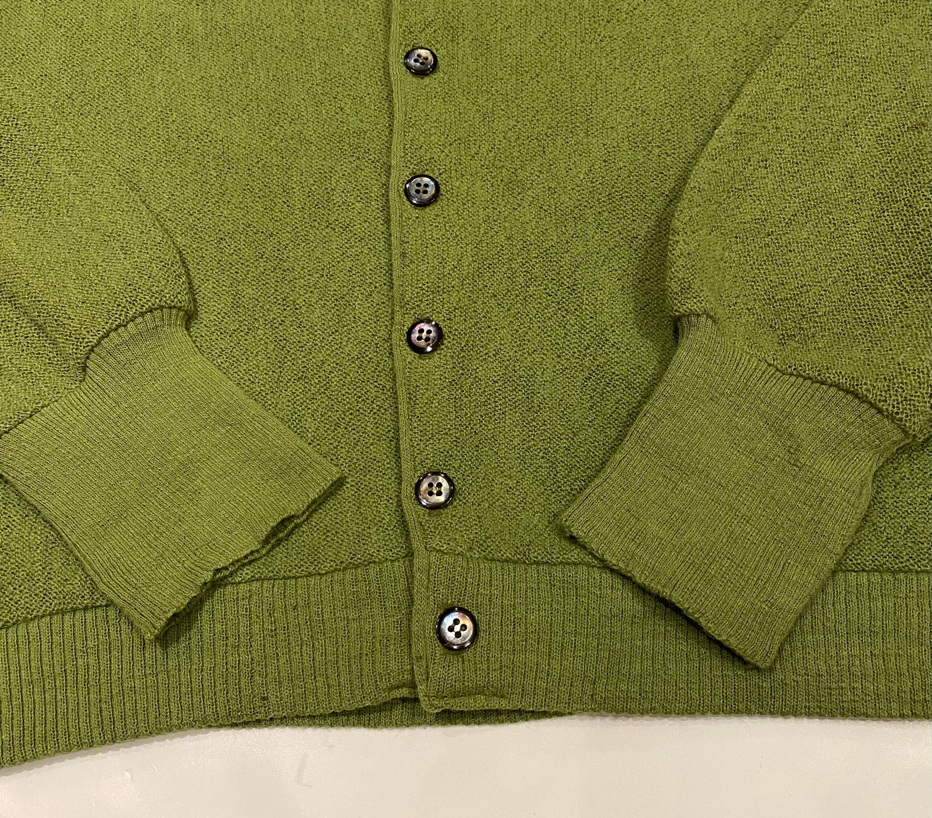 60年代〜70年代くらいのPURITAN製のアルパカウールカーディガンになります。ライトグリーンの発色がとても綺麗です。軽めの質感なのでいま時期でしたらインナー使いに、また春先にもとても良いと思います。明るめのカラーのデニムと合わせるのも気分で爽やかで良いですね。※後ろ襟下あたりに穴あり。左そでうしろに小さい汚れがあります。