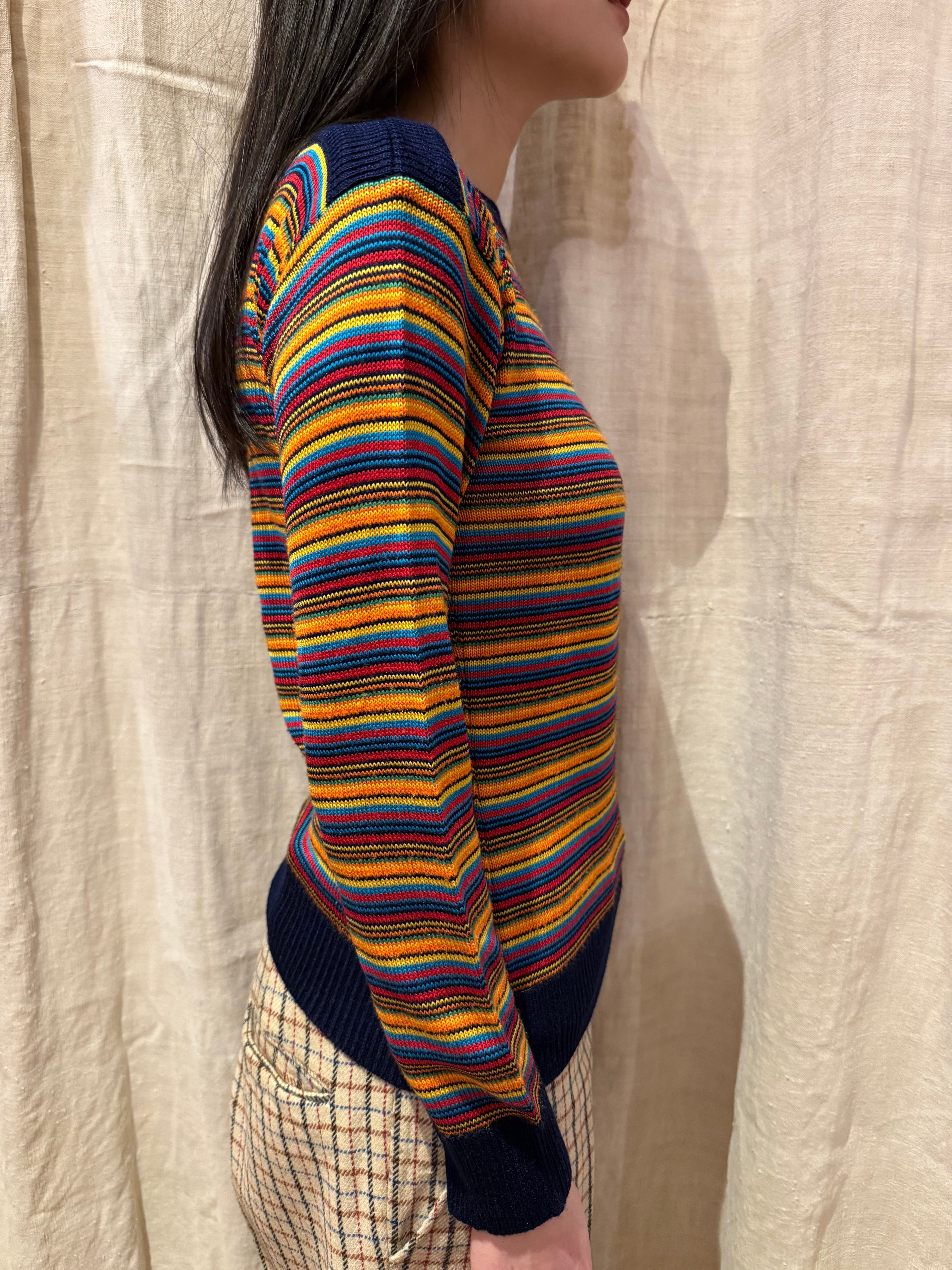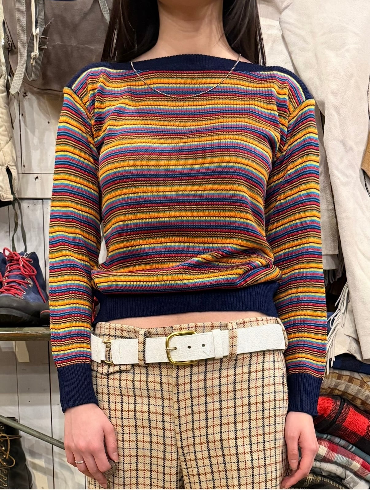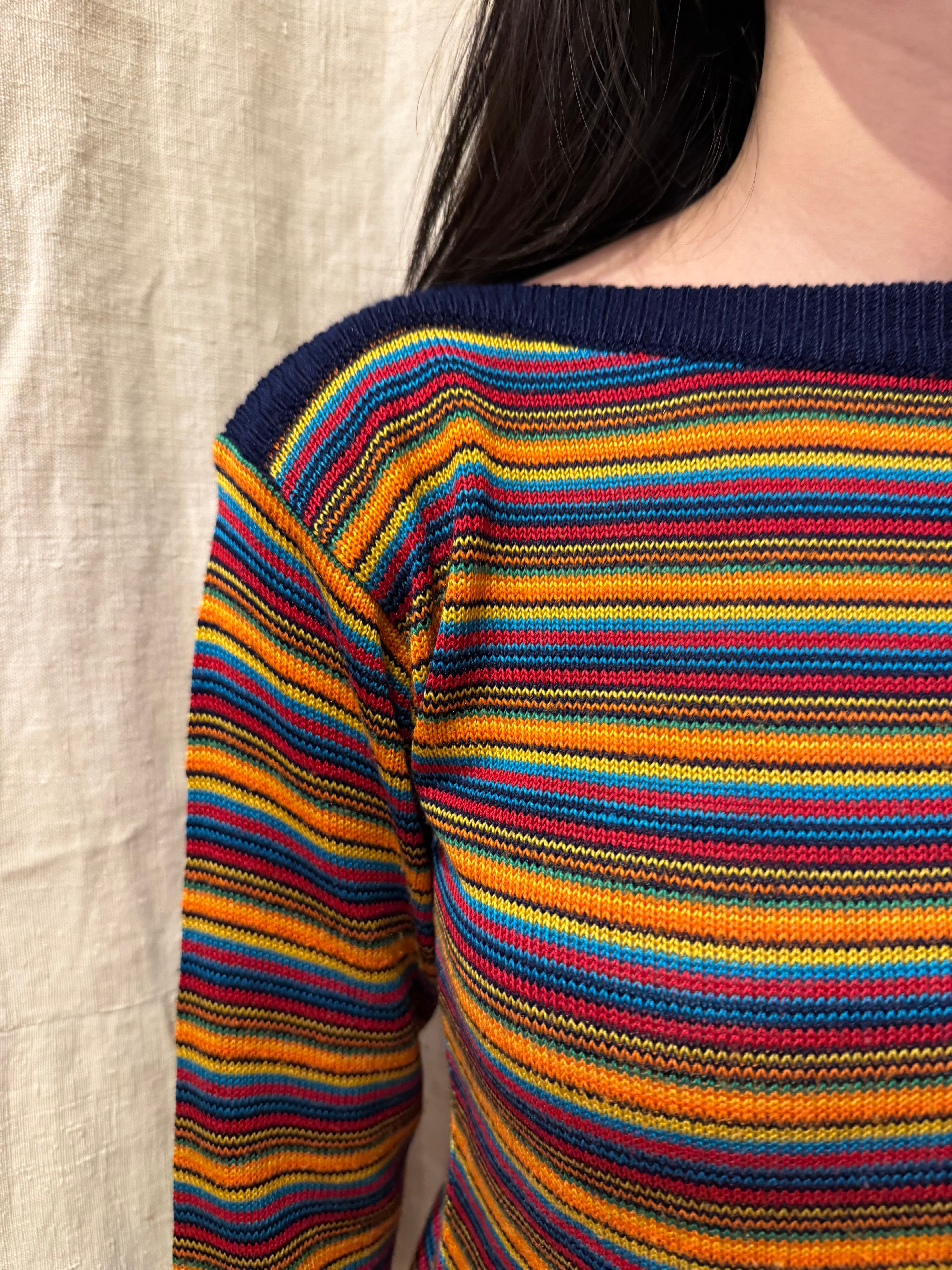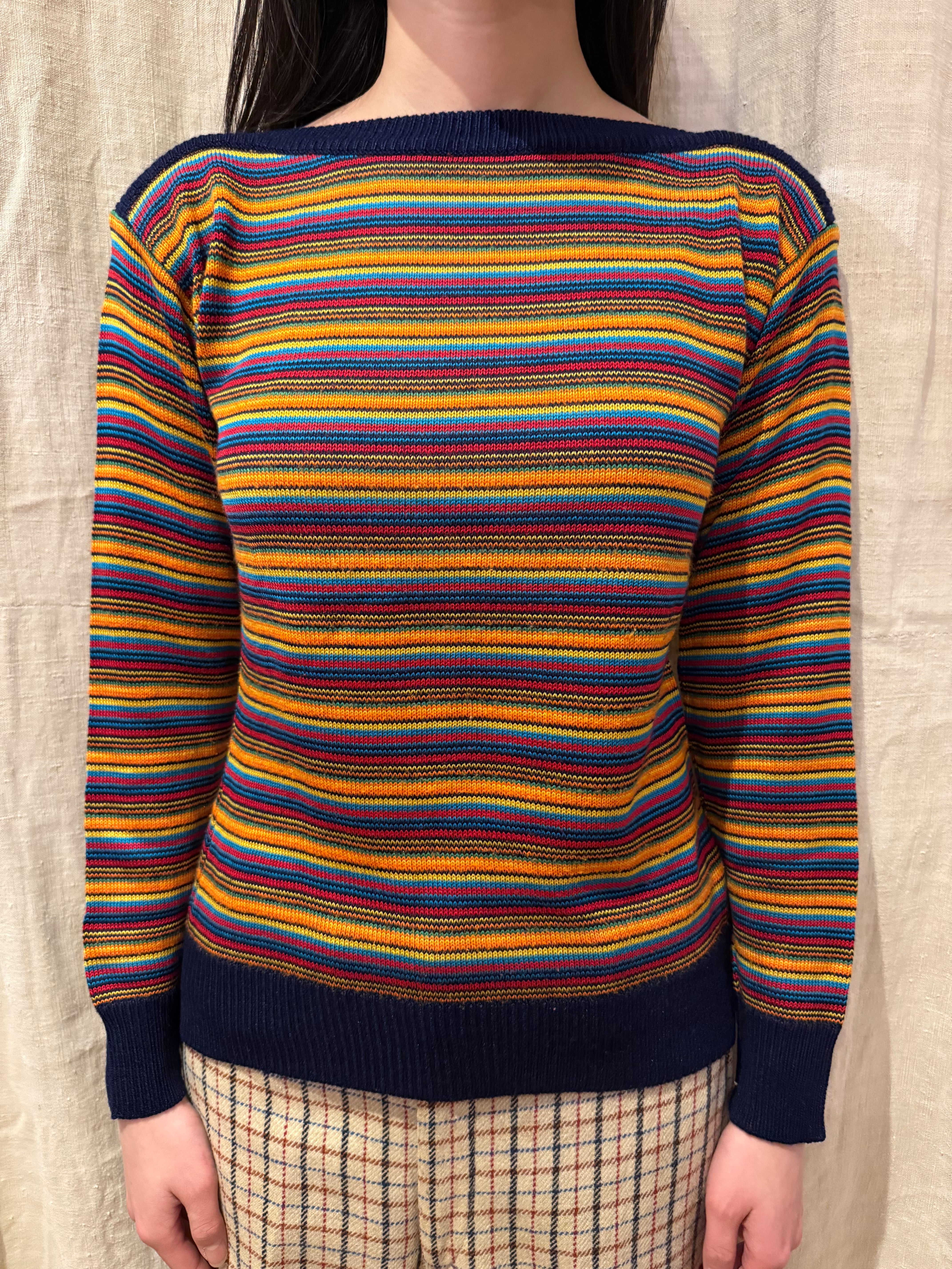 カラフルなカラーのボーダーのニットトップスです。ボートネックで程良くタイトめなシルエットが女性らしい印象です。ハッキリとしたカラーで光沢感のある糸は、スタイリングを引き締めてくれます。軽やかな素材感で着心地も良いです。