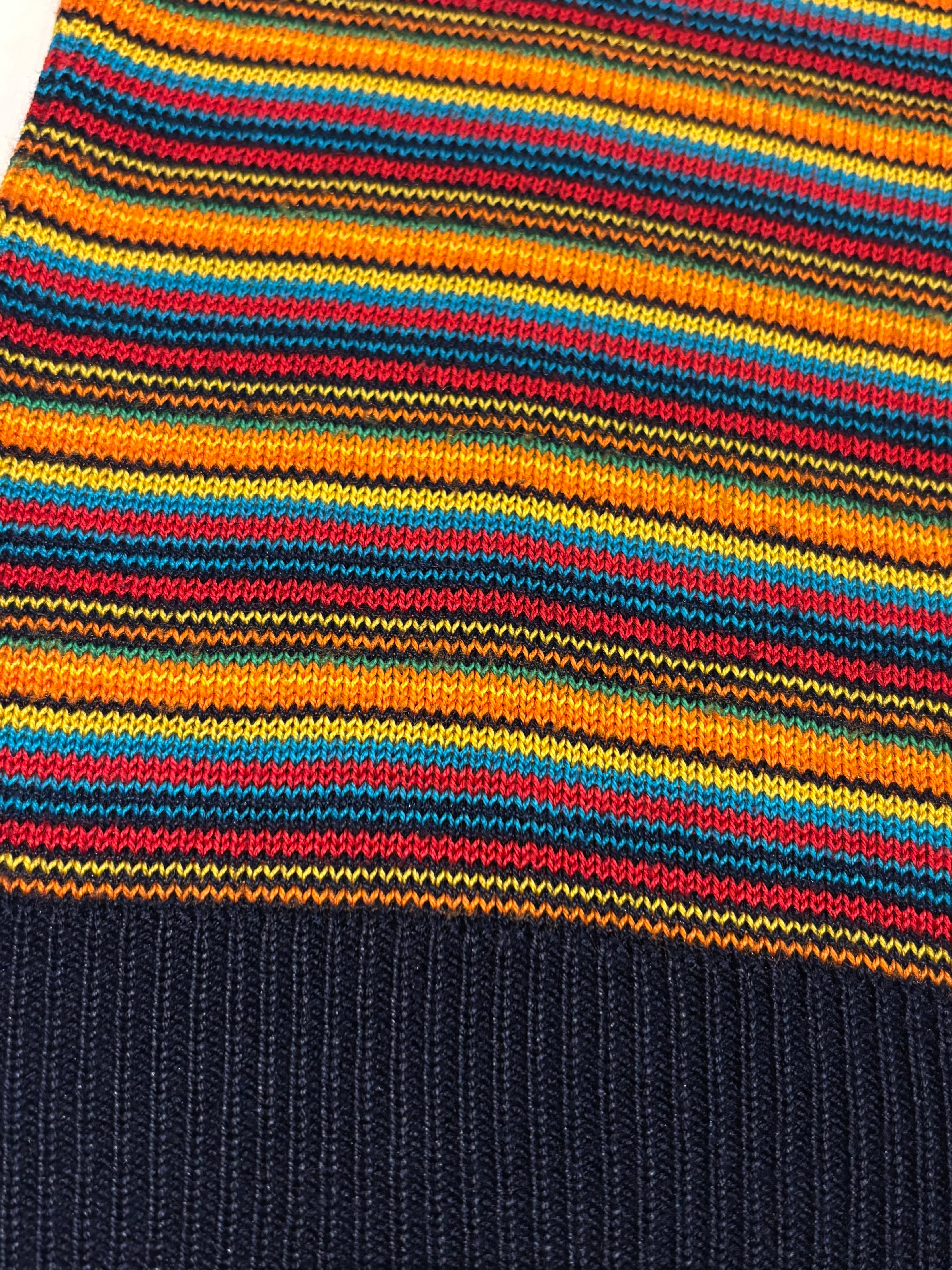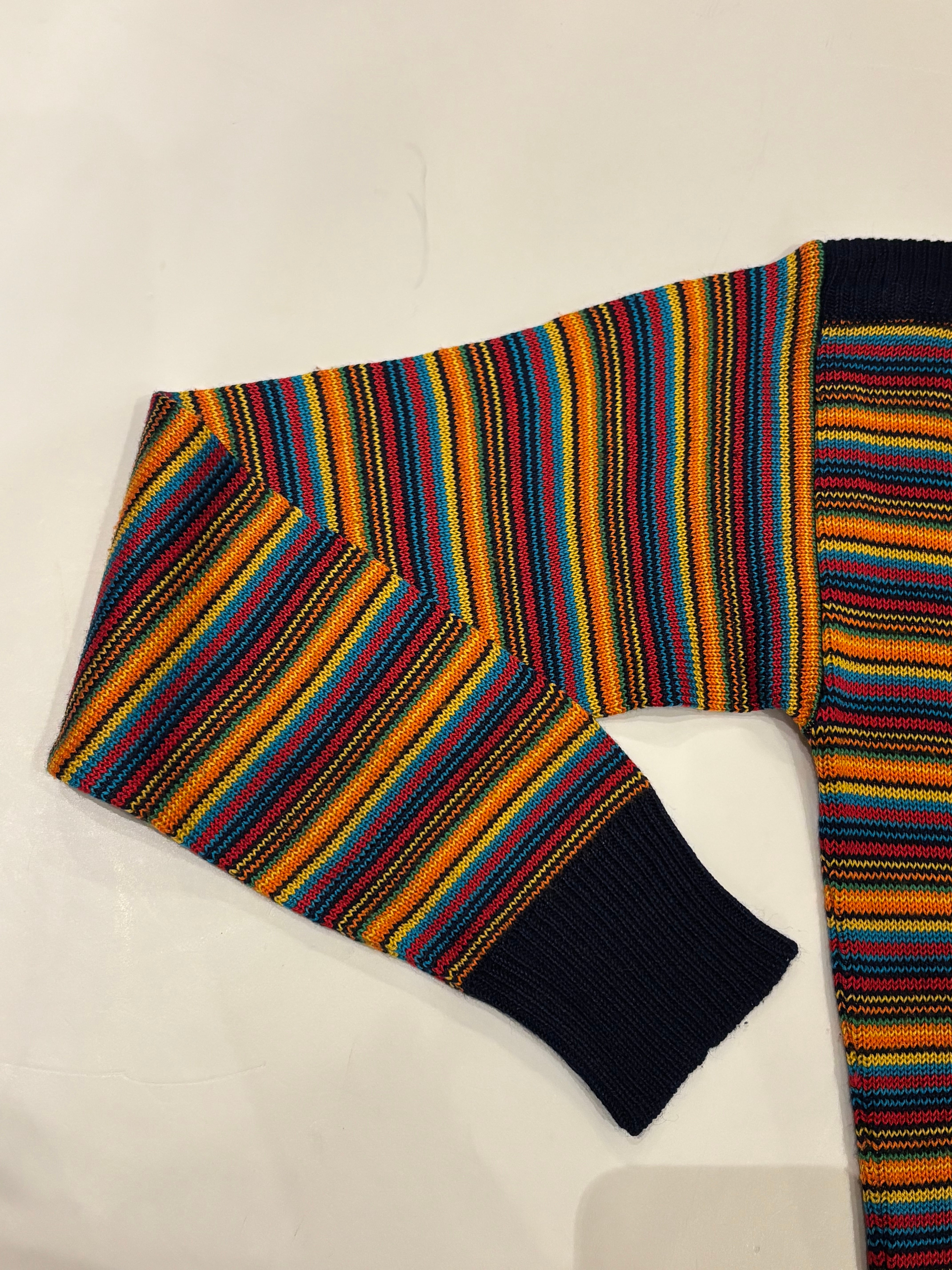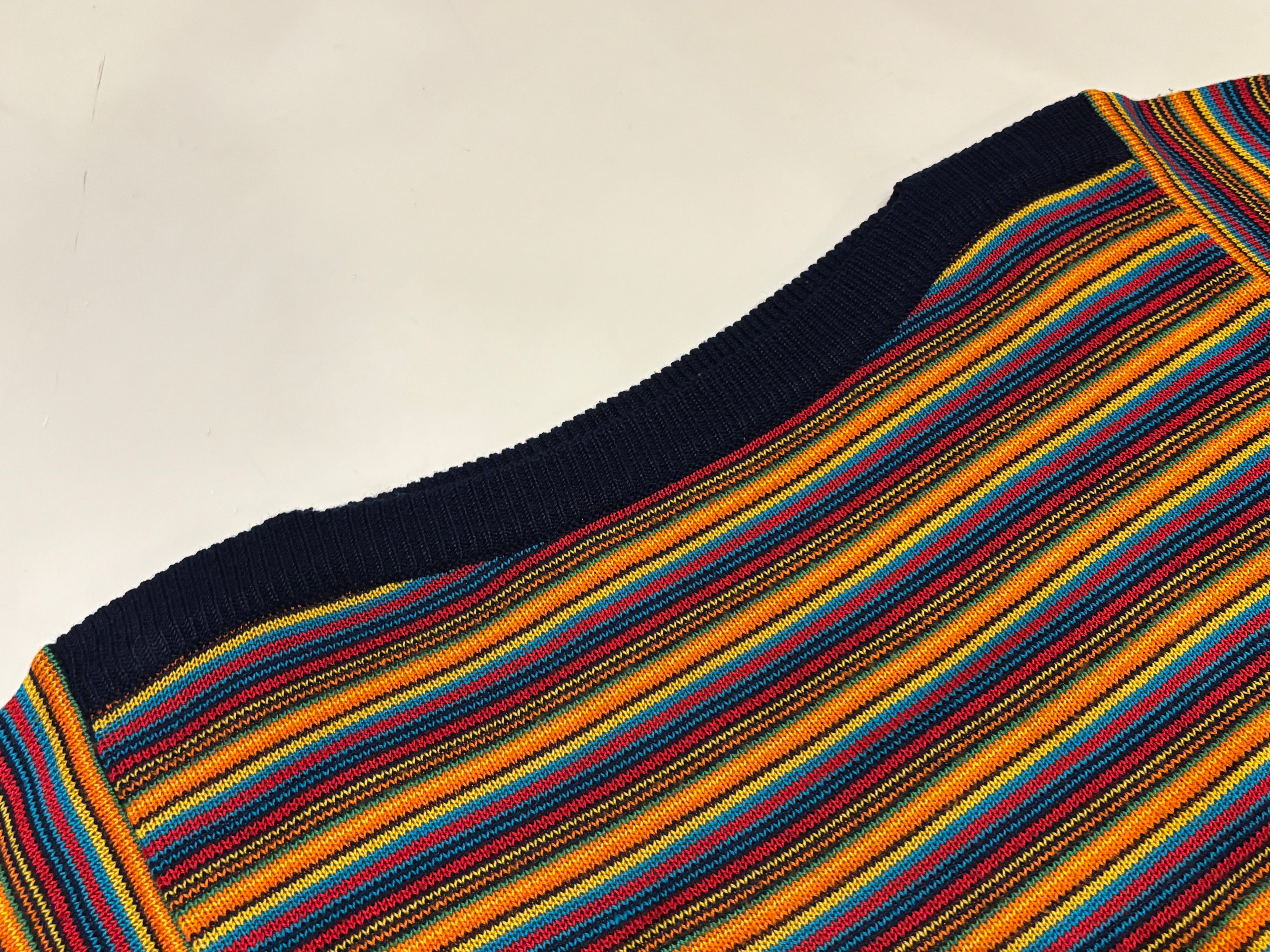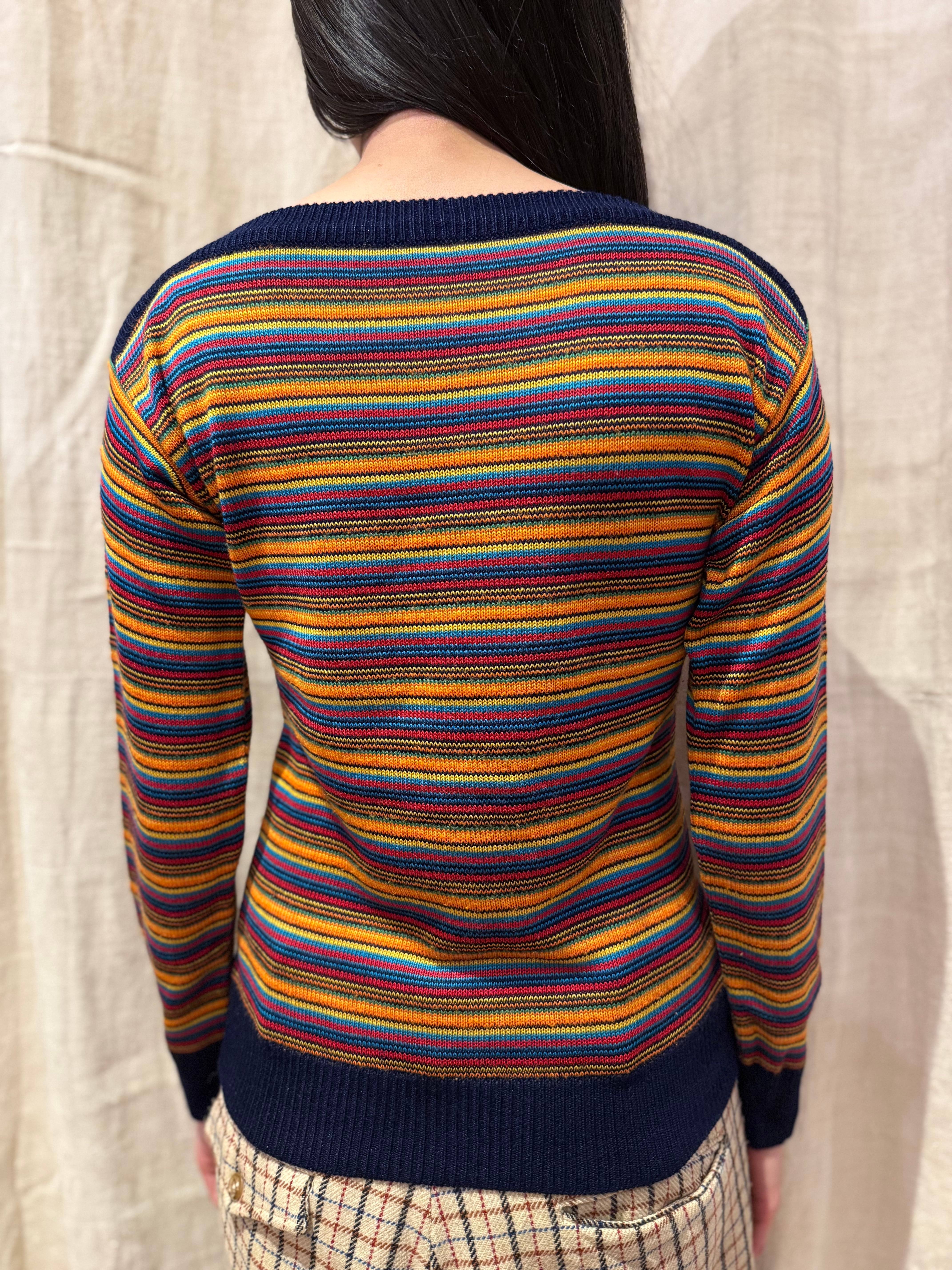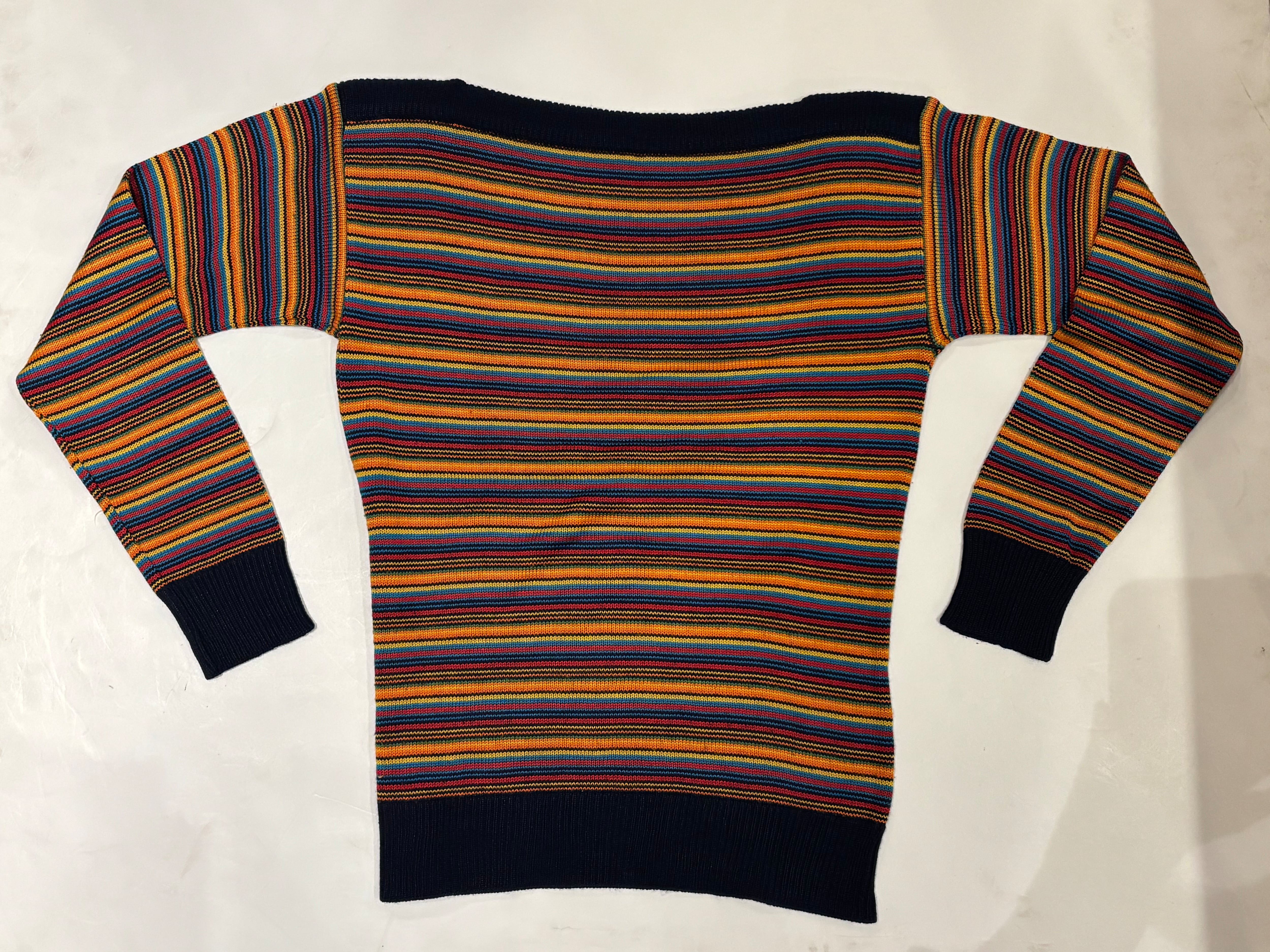 カラフルなカラーのボーダーのニットトップスです。ボートネックで程良くタイトめなシルエットが女性らしい印象です。ハッキリとしたカラーで光沢感のある糸は、スタイリングを引き締めてくれます。軽やかな素材感で着心地も良いです。