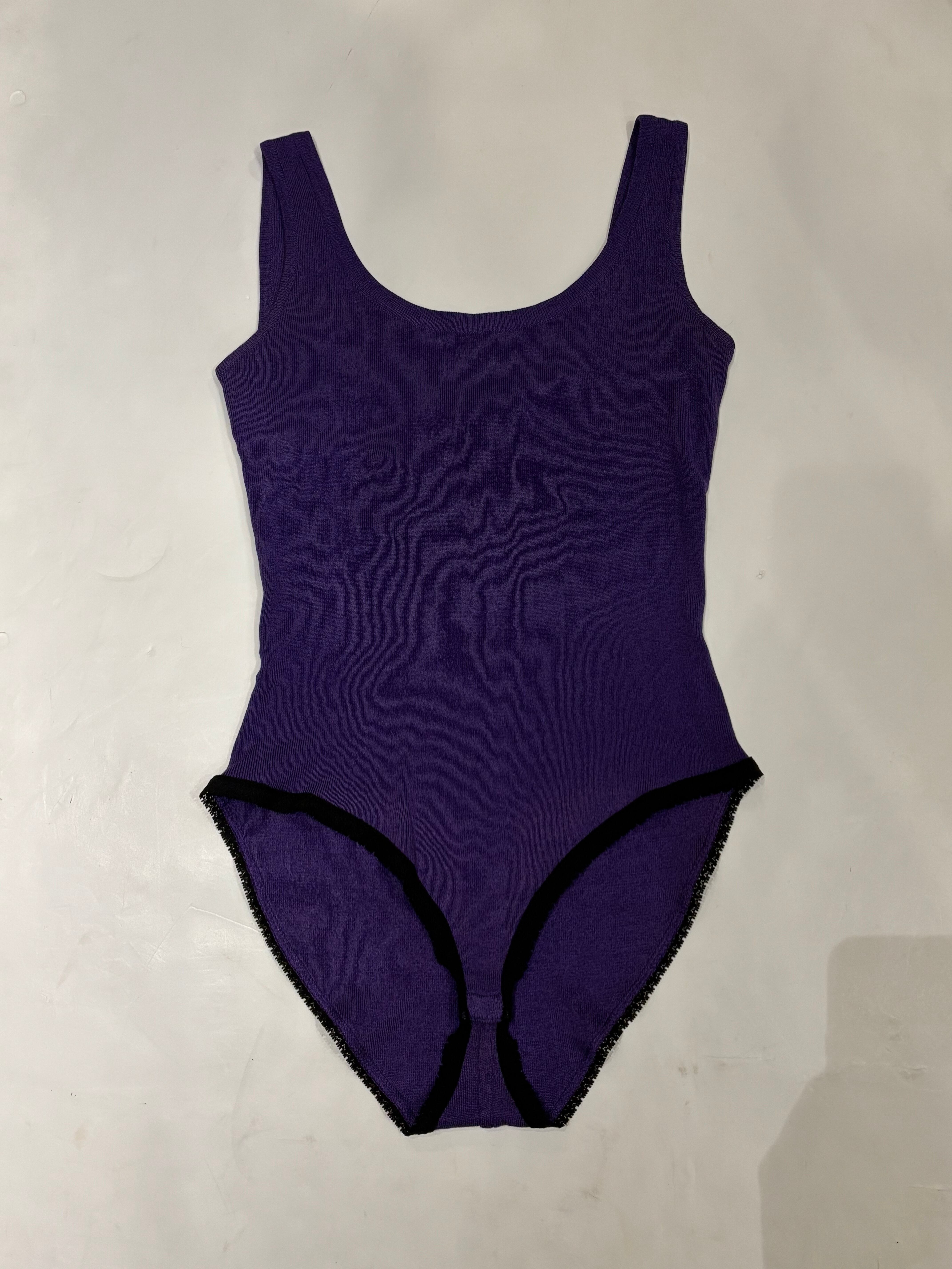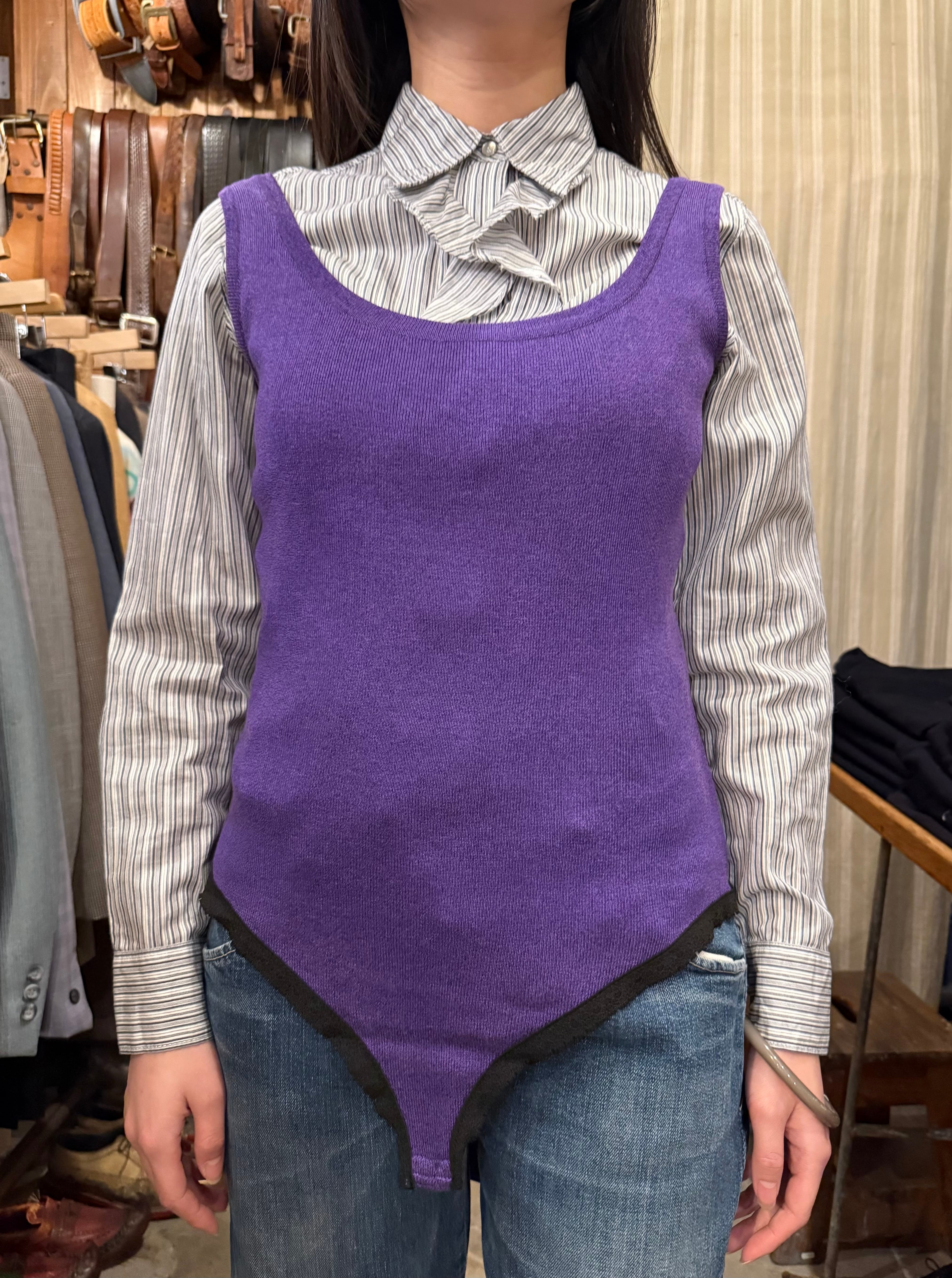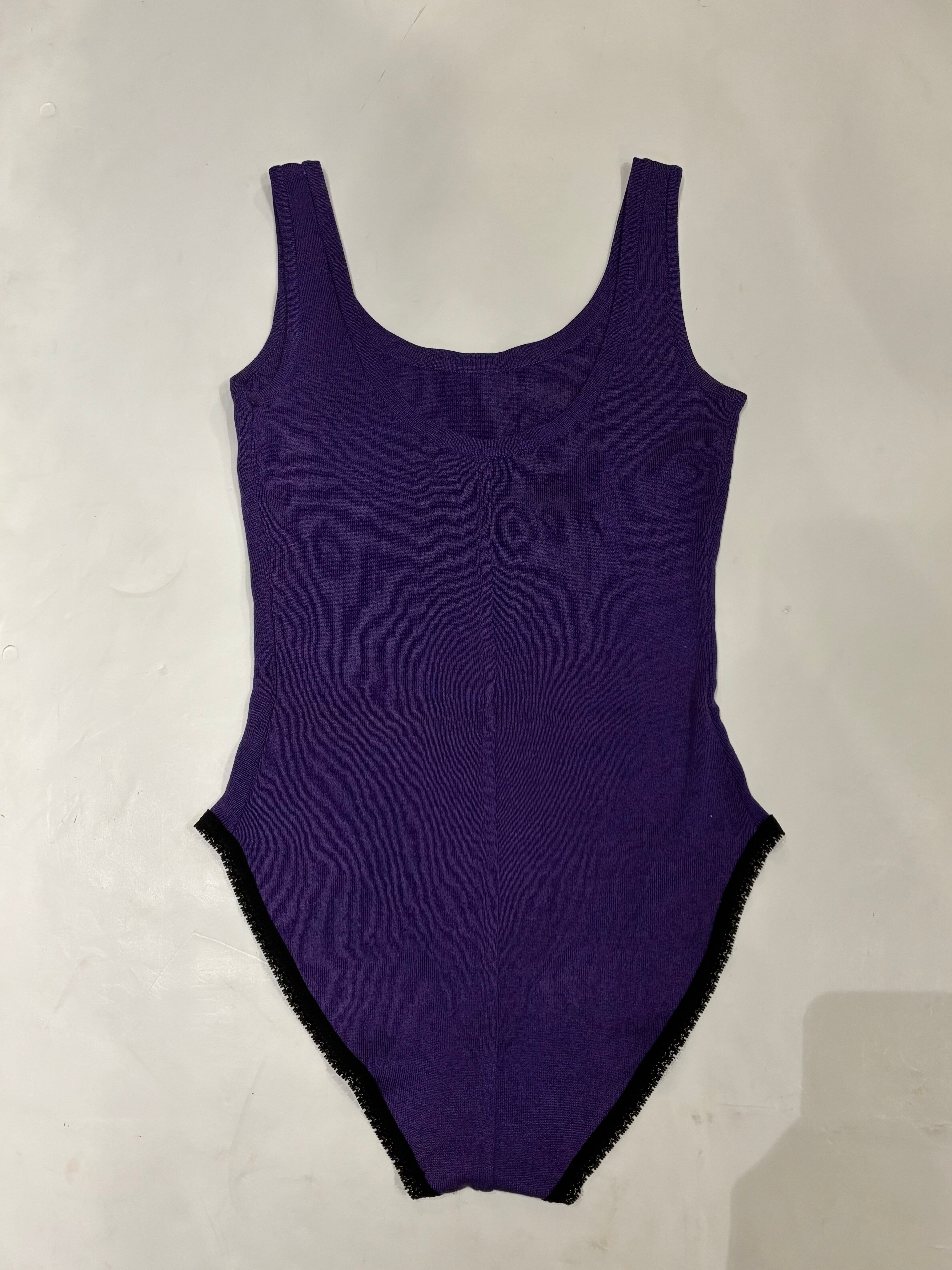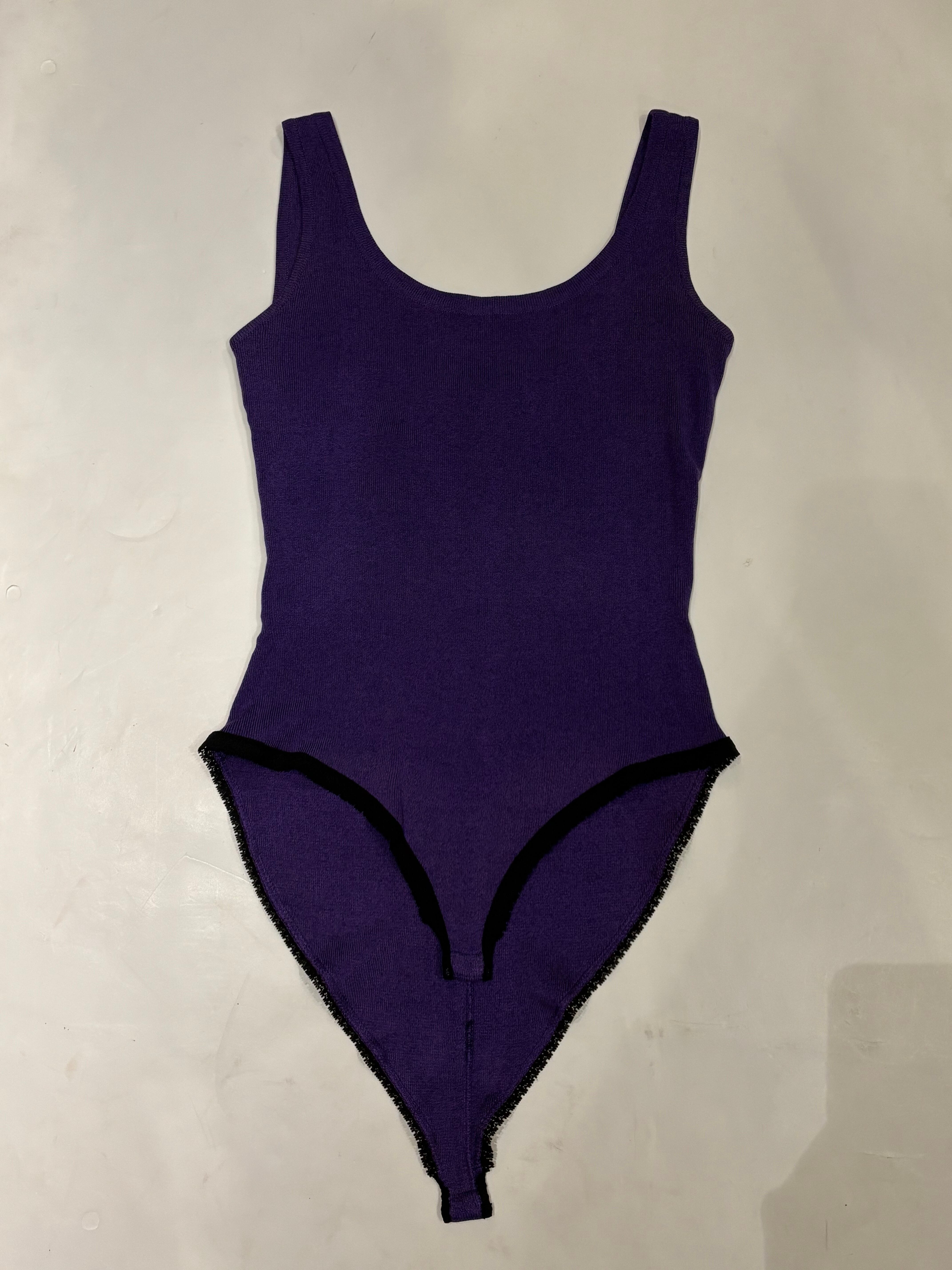 DNKYのニット生地のボディースーツです。程良くフィットします。少し深みのあるパープルカラーに黒のレースの組み合わせは、Y2Kなムードにもピッタリです。前後とも大きく襟ぐりが開いておりますので、スタイリング画像のように、柄物やフリルシャツとレイヤードしても可愛いです。