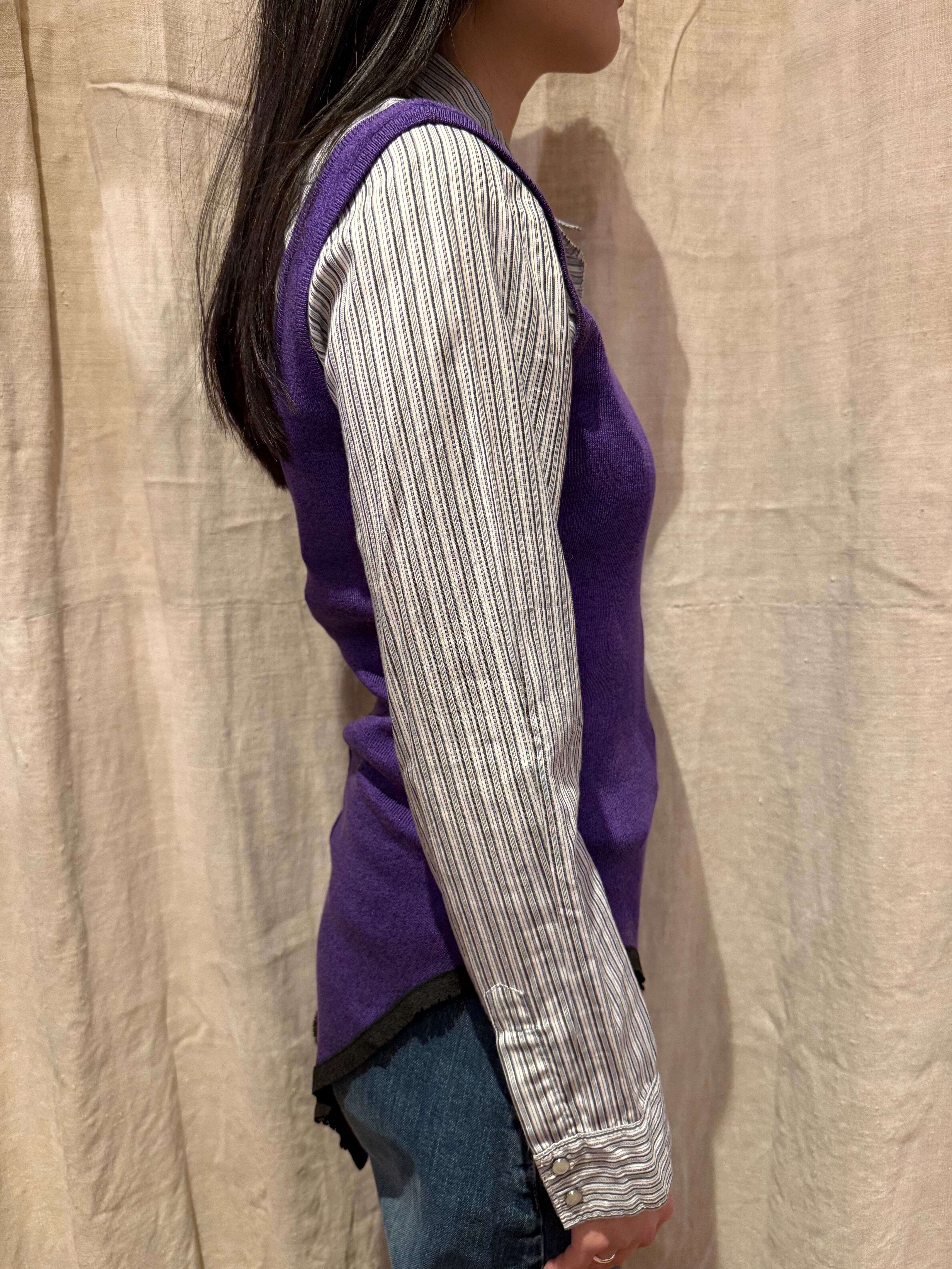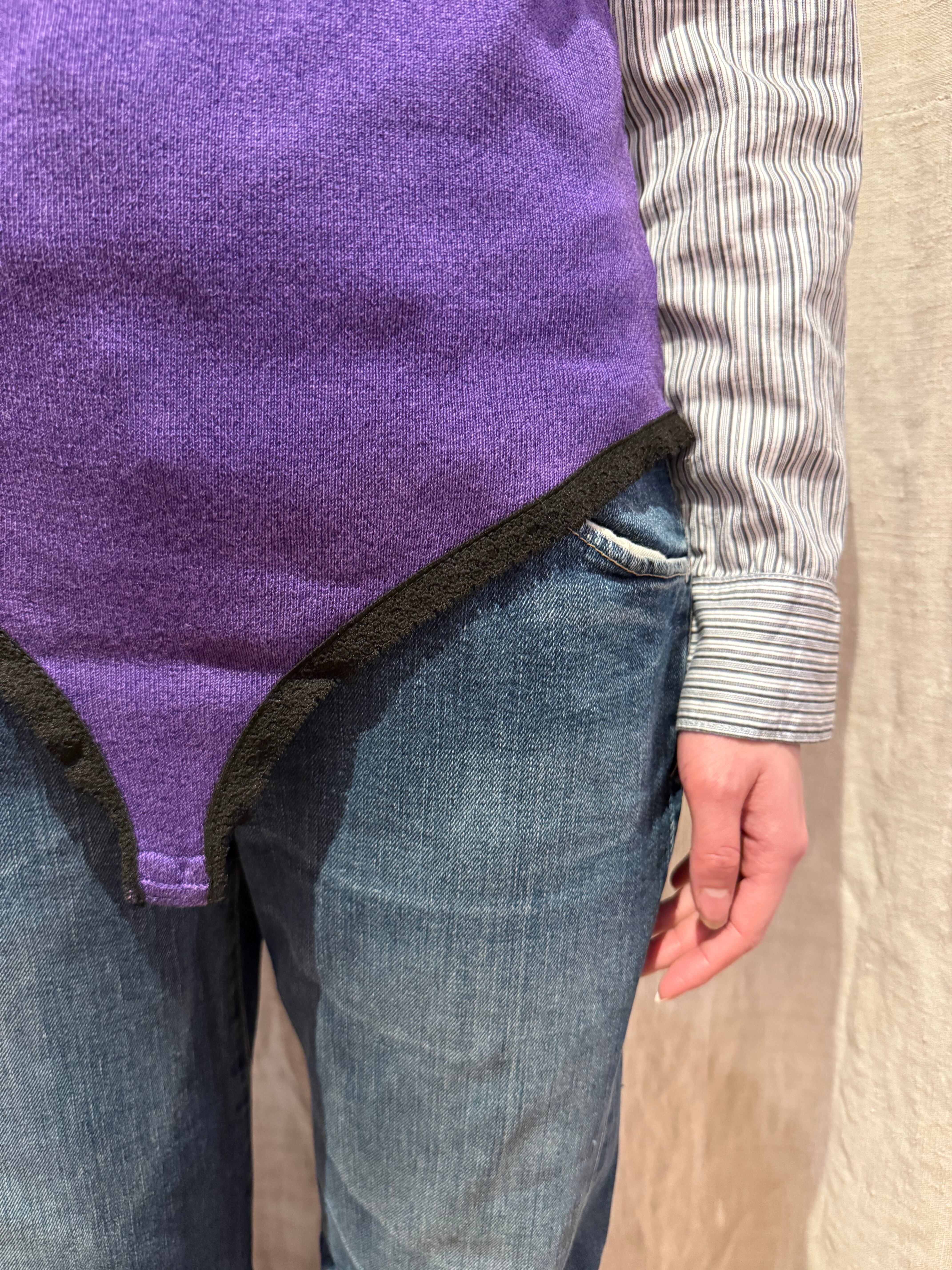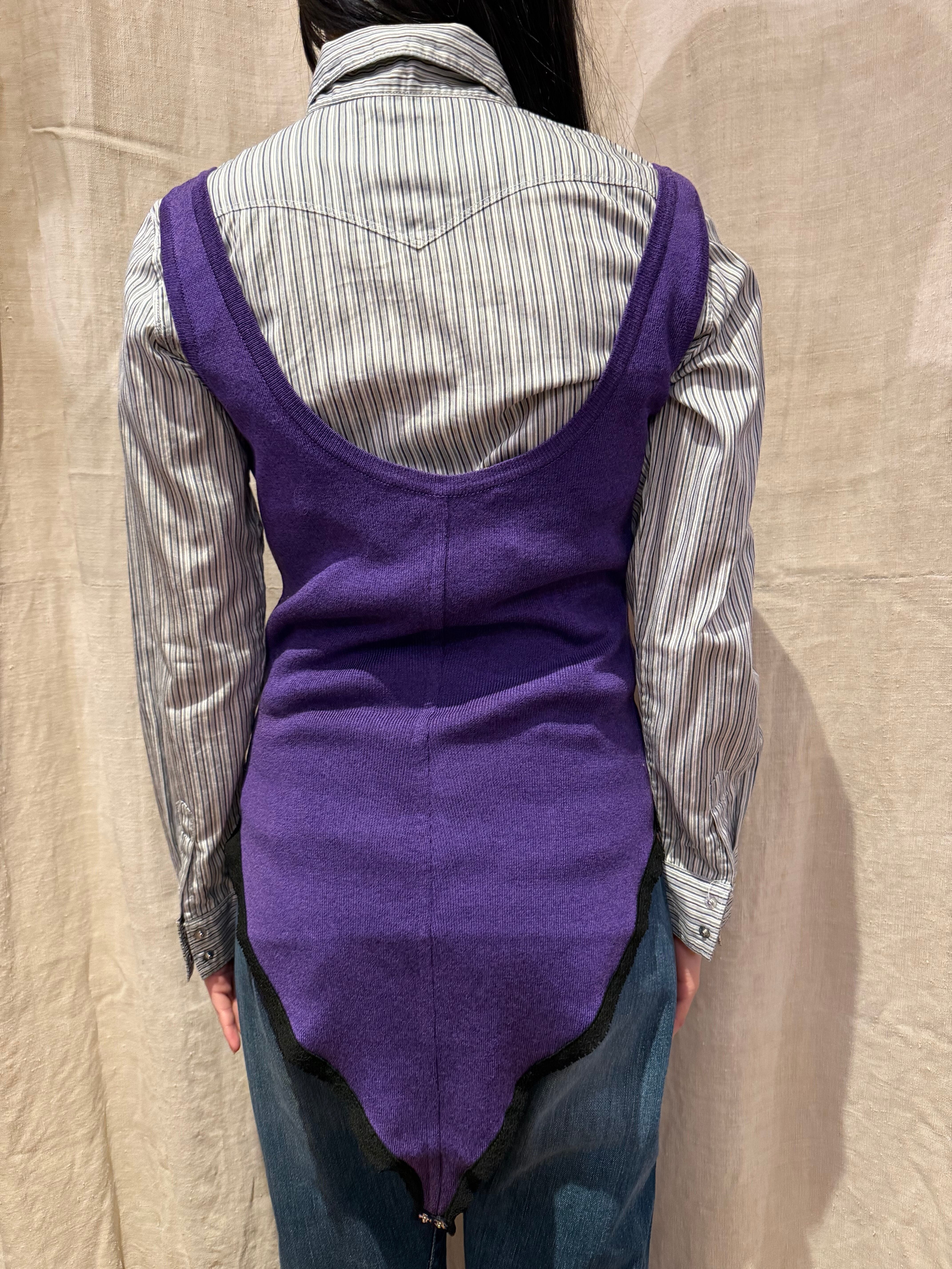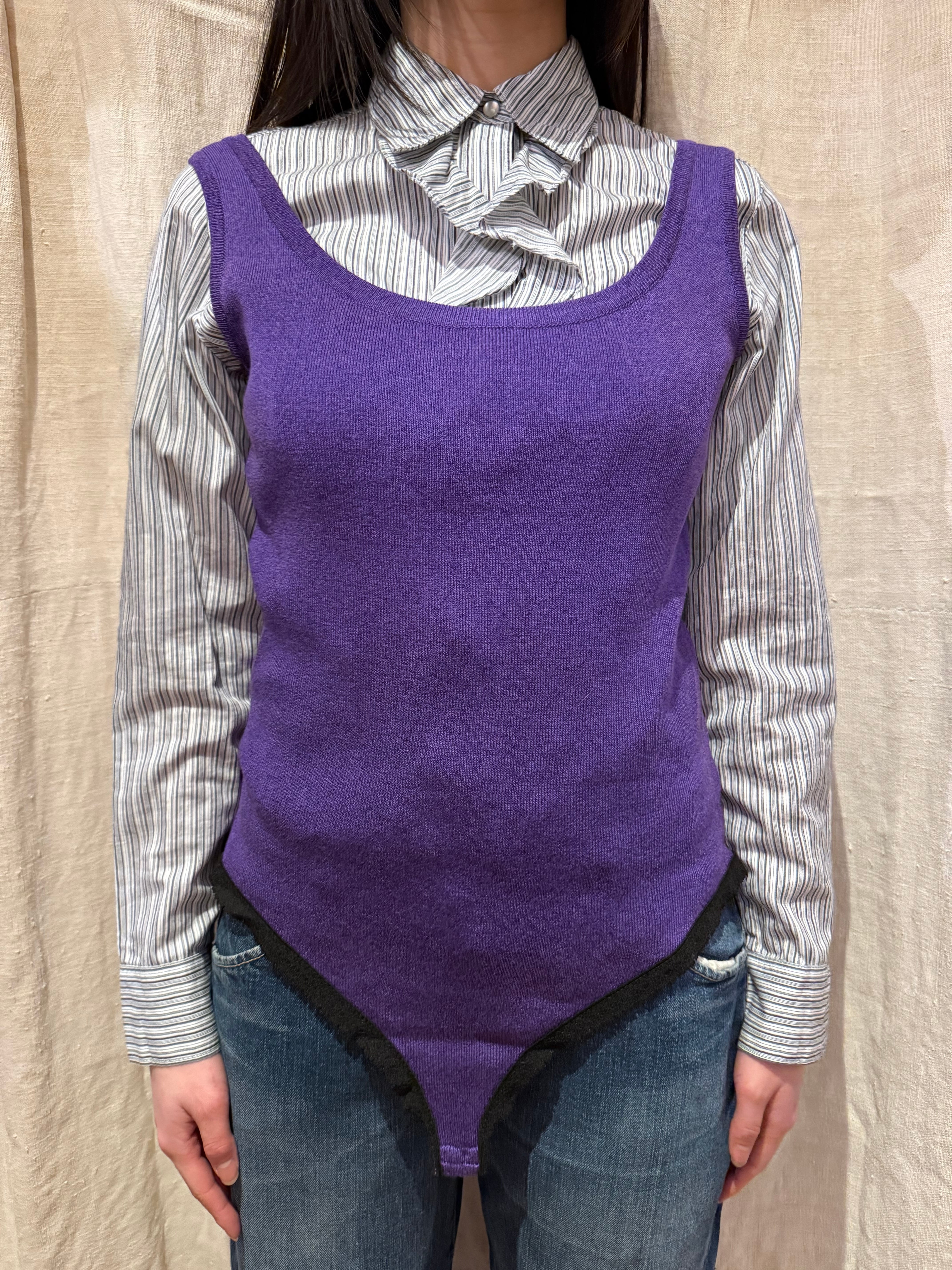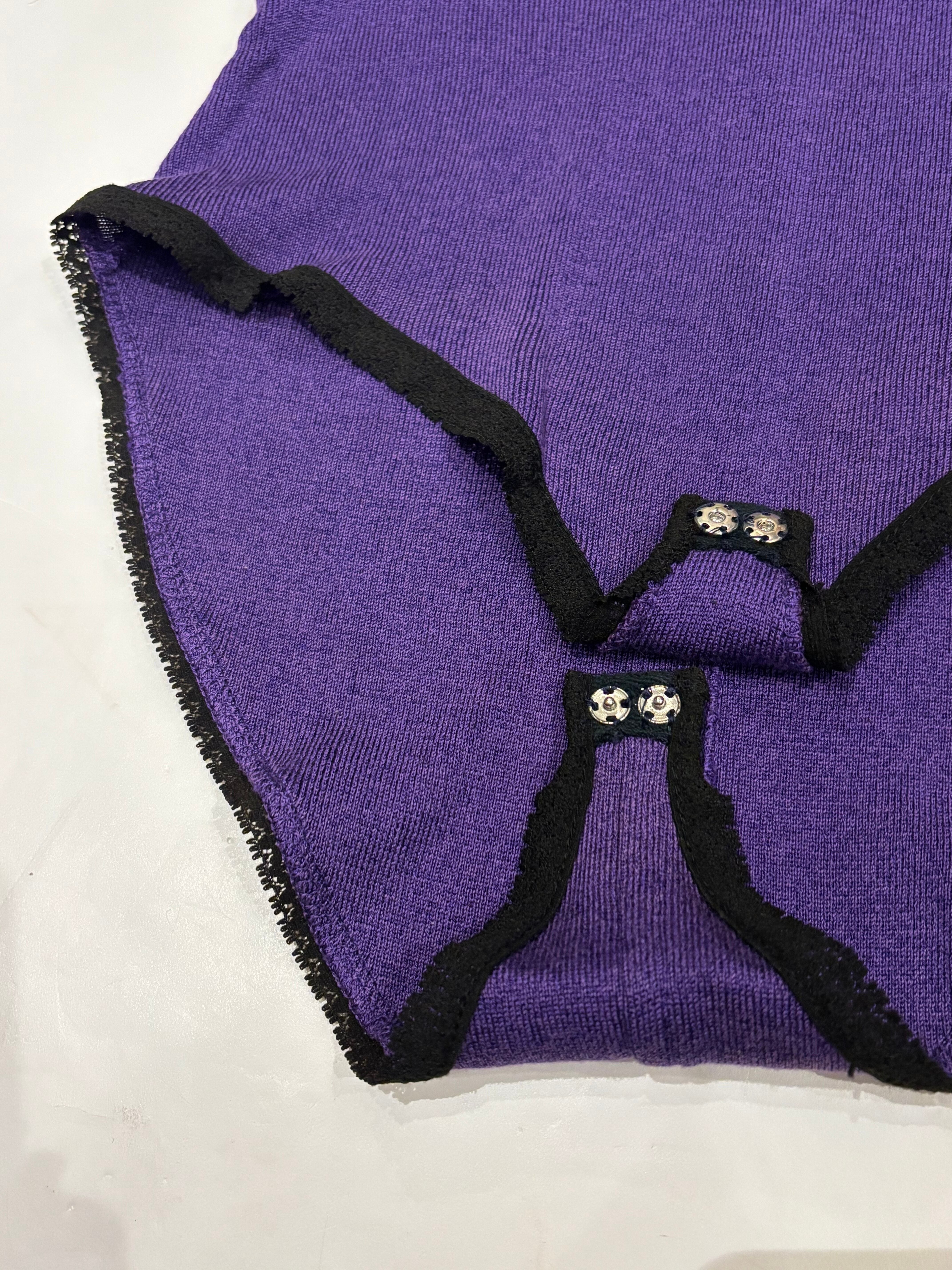 DNKYのニット生地のボディースーツです。程良くフィットします。少し深みのあるパープルカラーに黒のレースの組み合わせは、Y2Kなムードにもピッタリです。前後とも大きく襟ぐりが開いておりますので、スタイリング画像のように、柄物やフリルシャツとレイヤードしても可愛いです。