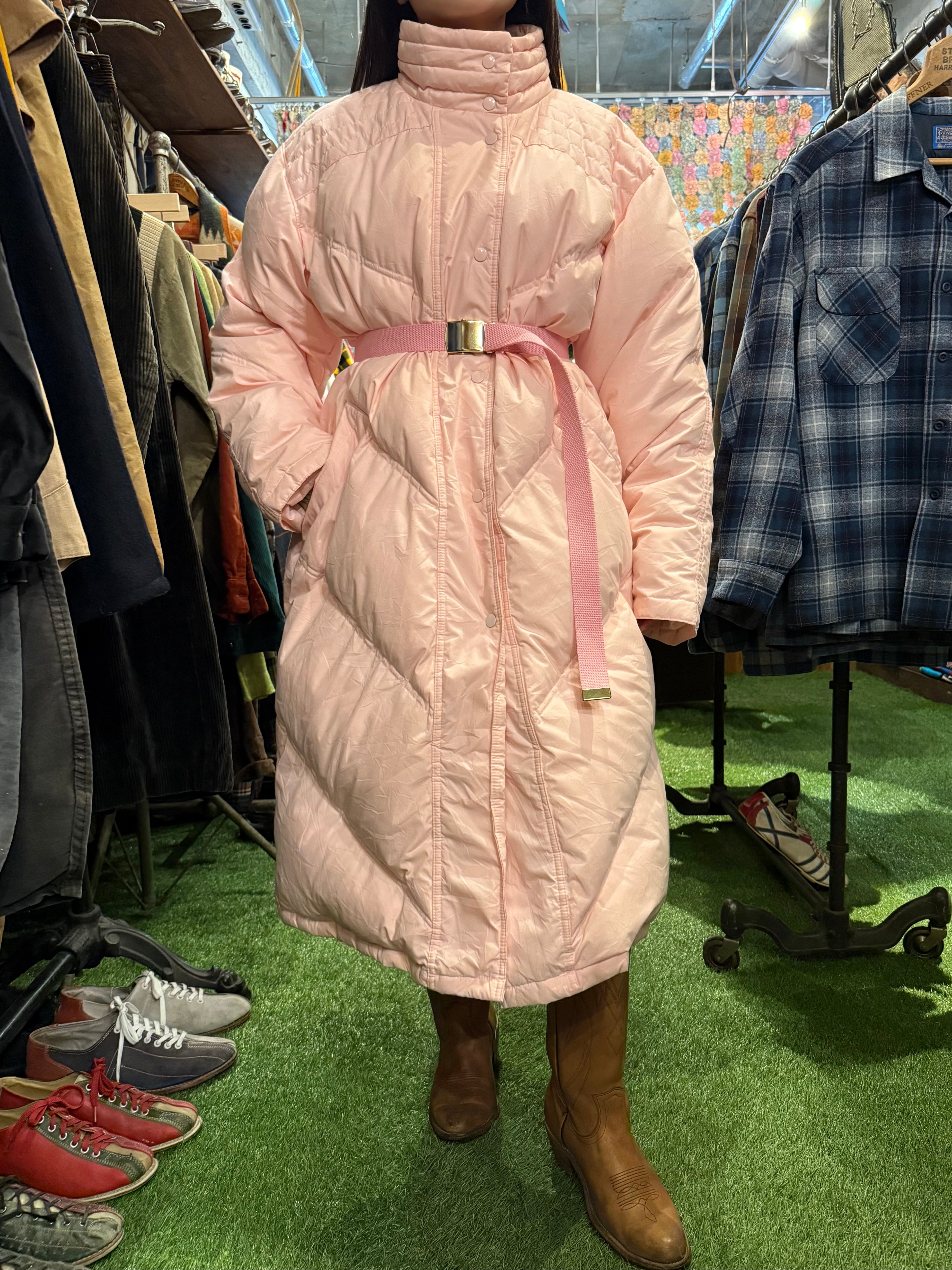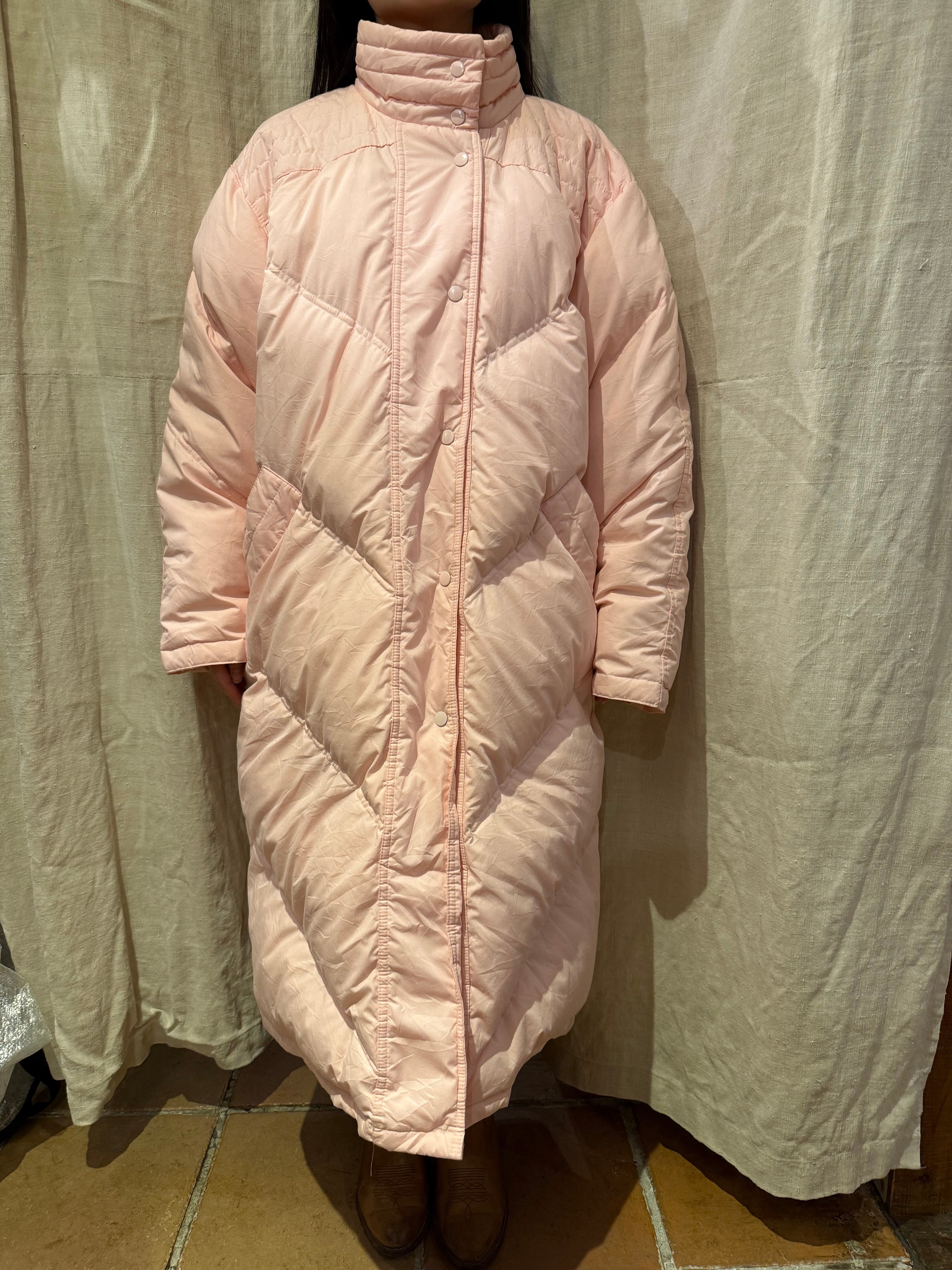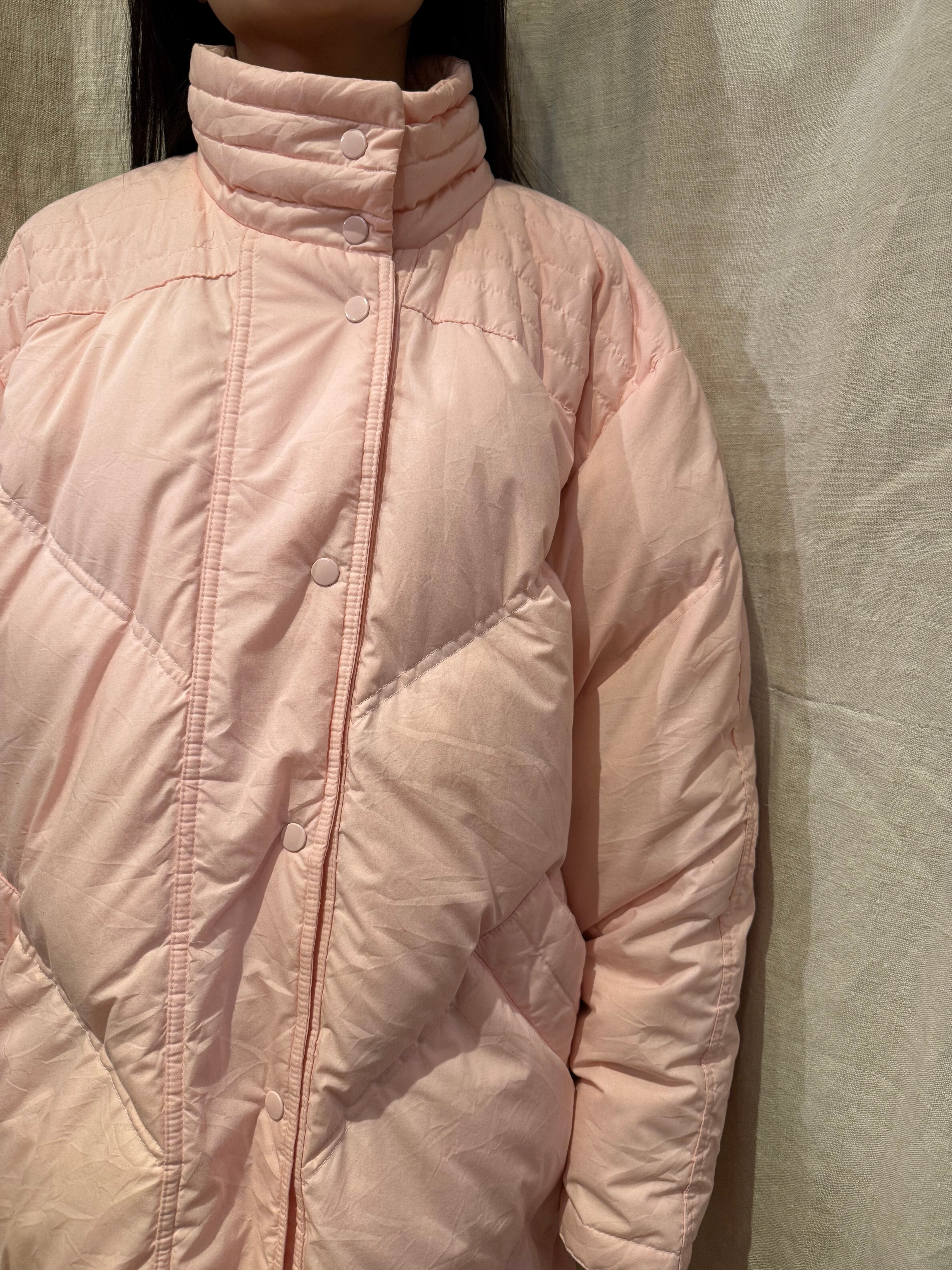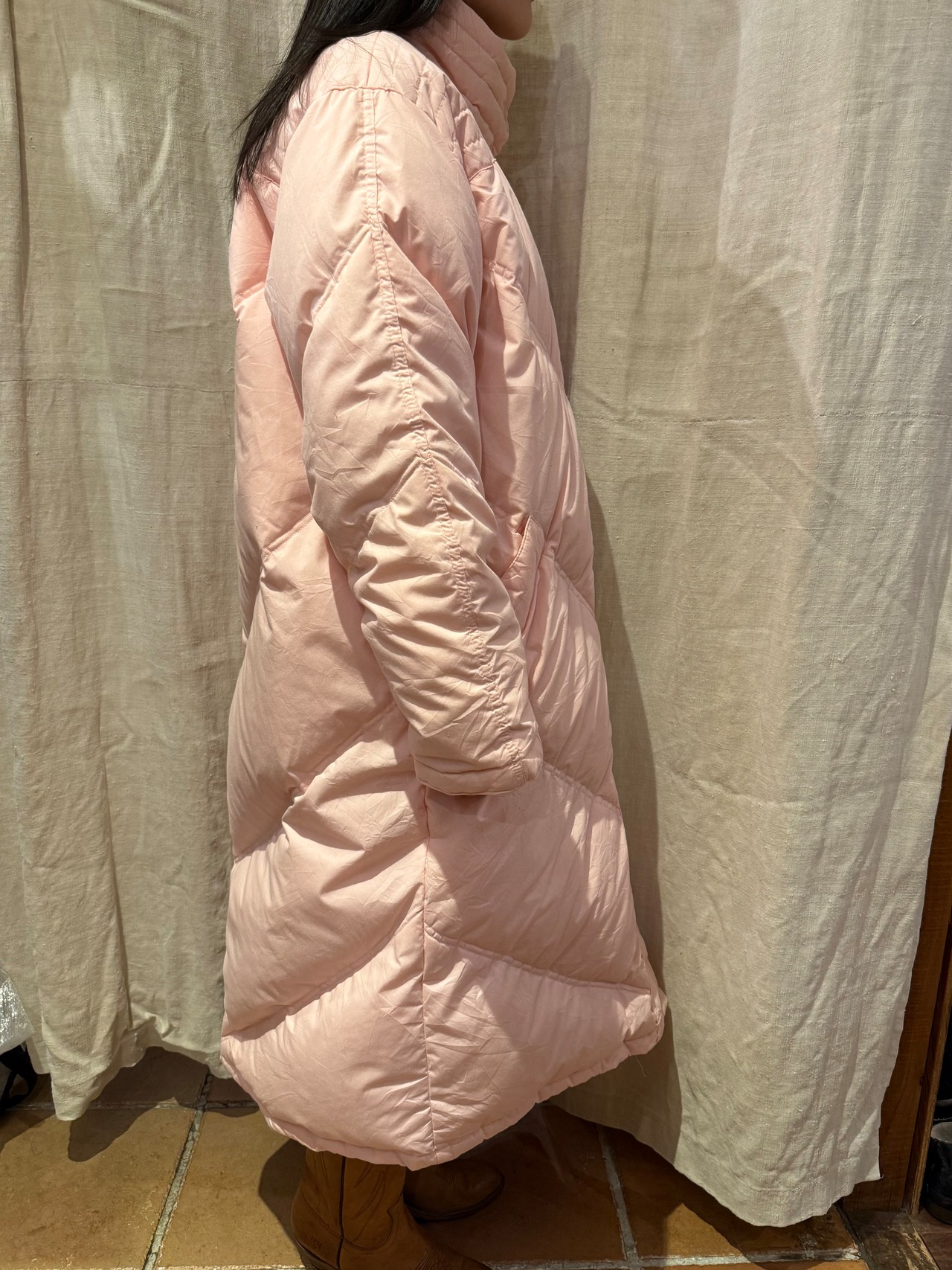 中綿のロングジャケットです。薄いピンクカラーでアイテムの存在感が抜群です☺︎ボリュームのあるシルエットですが、首元はゆとりがありますので、全体のバランスも良いです。着用画像のようにベルトでウエストマークをしてワンピースっぽく着用しても可愛いですし、開けても素敵です。