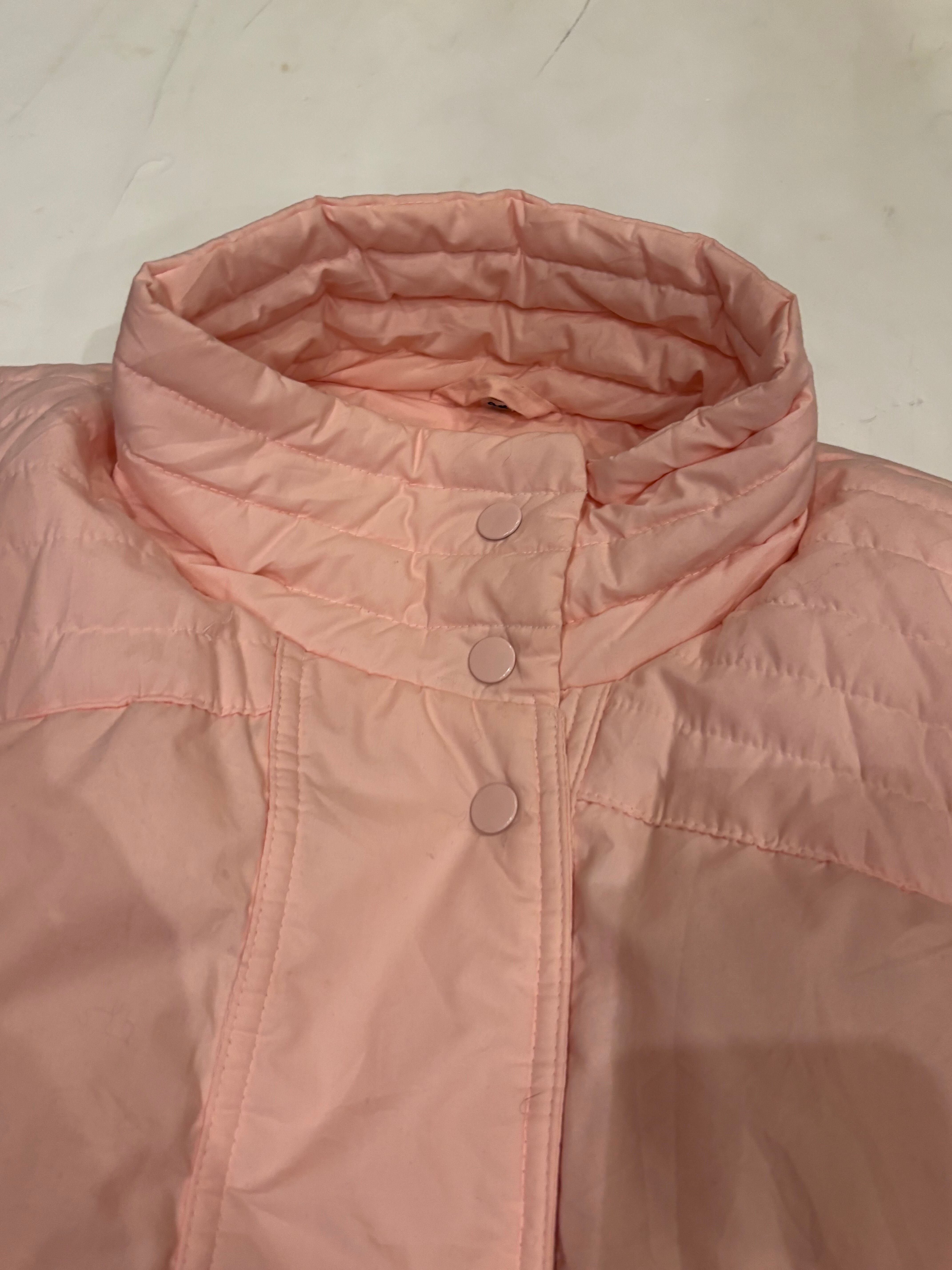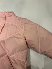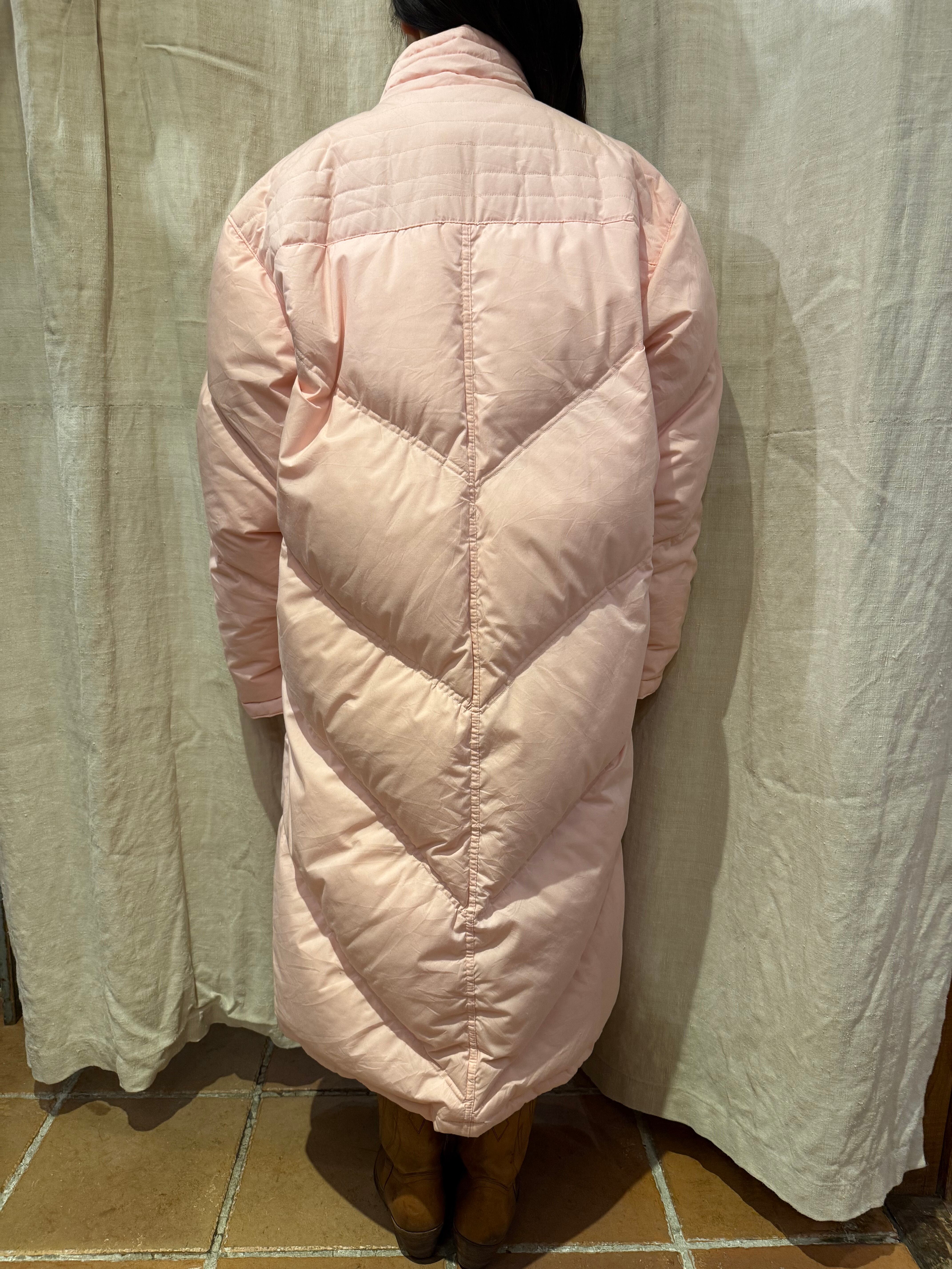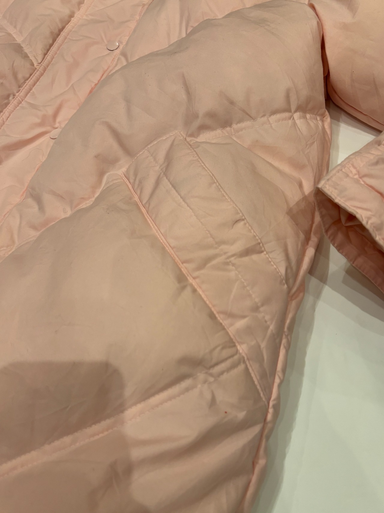 中綿のロングジャケットです。薄いピンクカラーでアイテムの存在感が抜群です☺︎ボリュームのあるシルエットですが、首元はゆとりがありますので、全体のバランスも良いです。着用画像のようにベルトでウエストマークをしてワンピースっぽく着用しても可愛いですし、開けても素敵です。