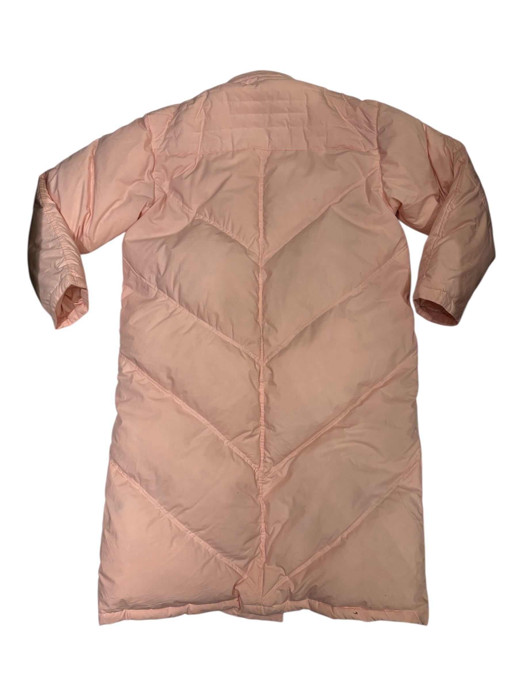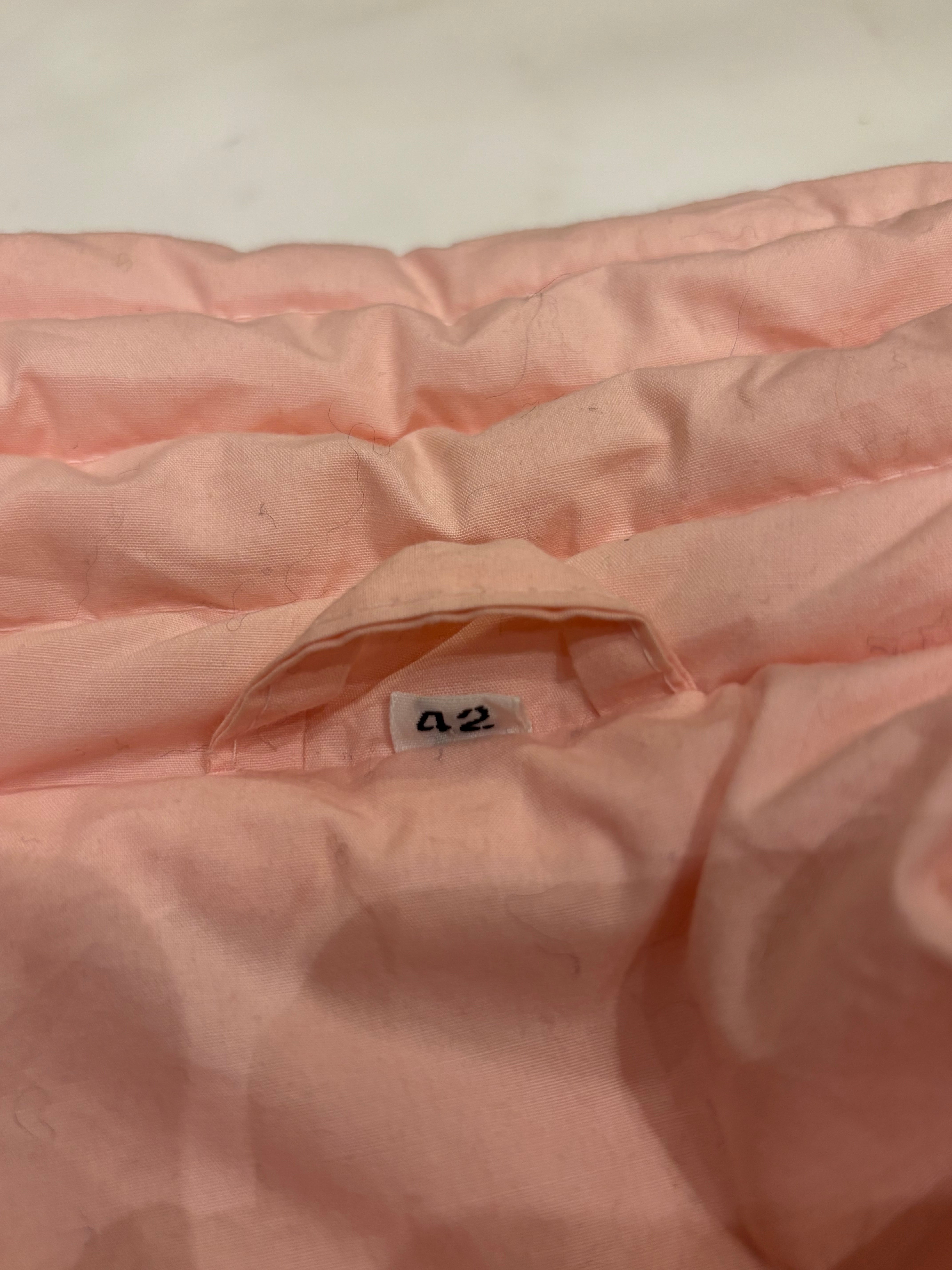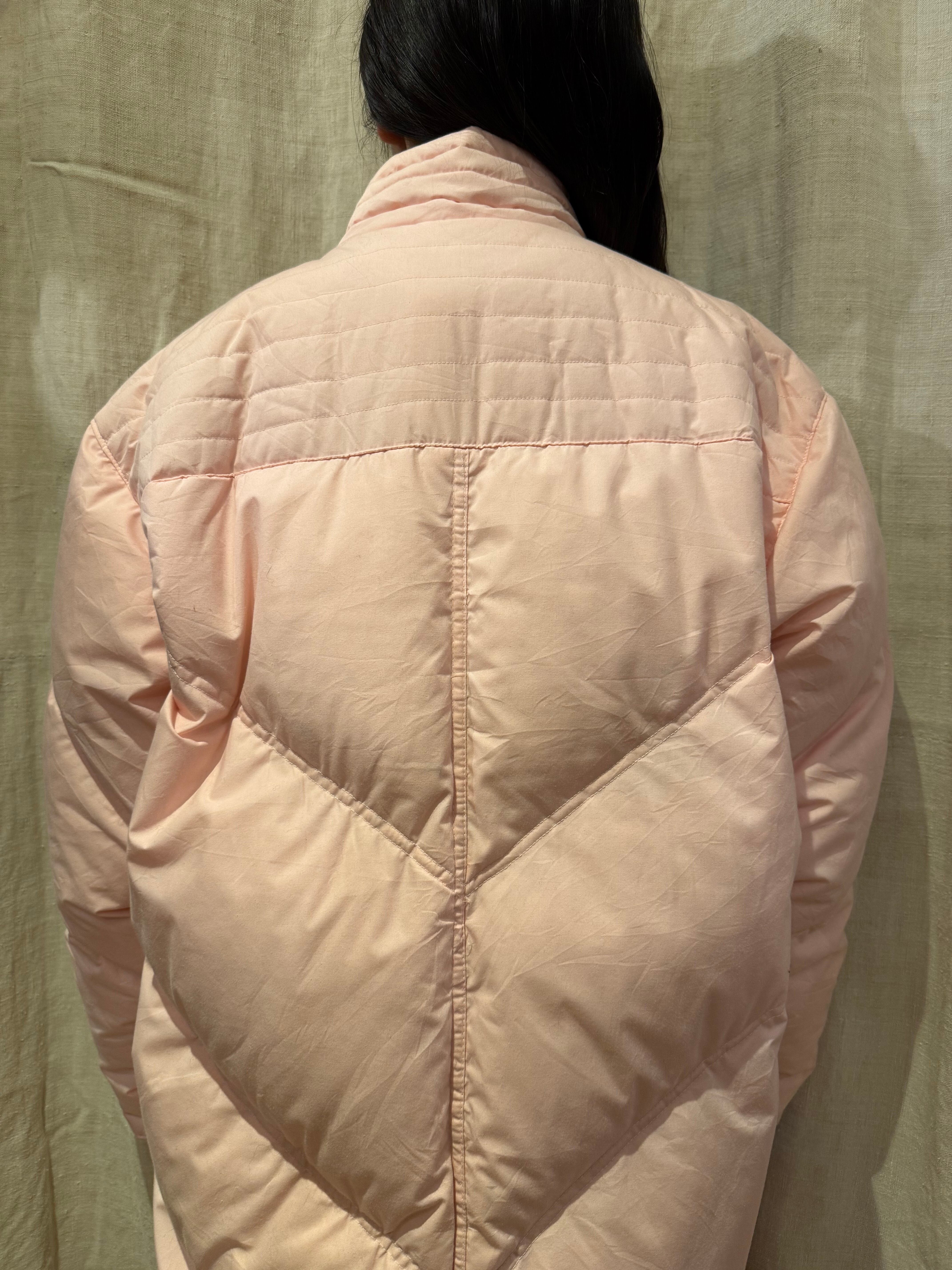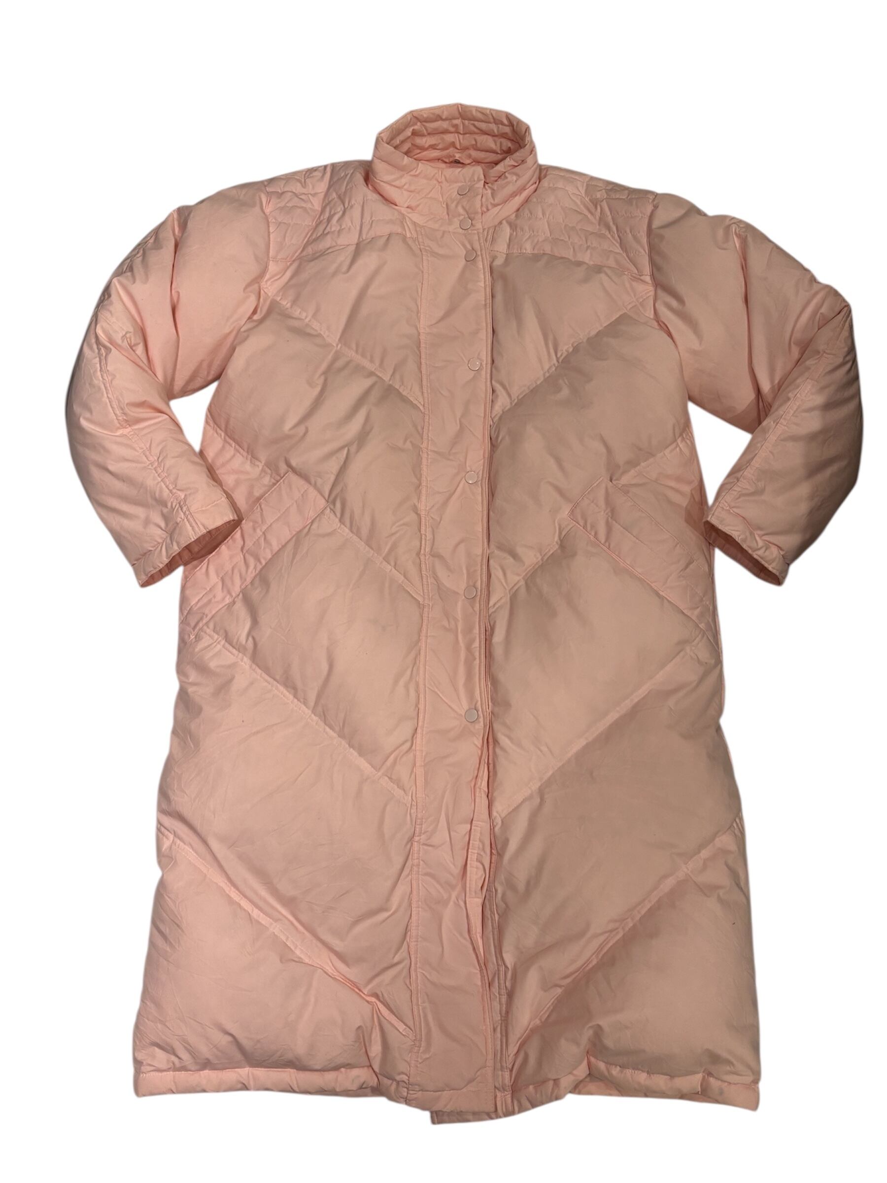 中綿のロングジャケットです。薄いピンクカラーでアイテムの存在感が抜群です☺︎ボリュームのあるシルエットですが、首元はゆとりがありますので、全体のバランスも良いです。着用画像のようにベルトでウエストマークをしてワンピースっぽく着用しても可愛いですし、開けても素敵です。