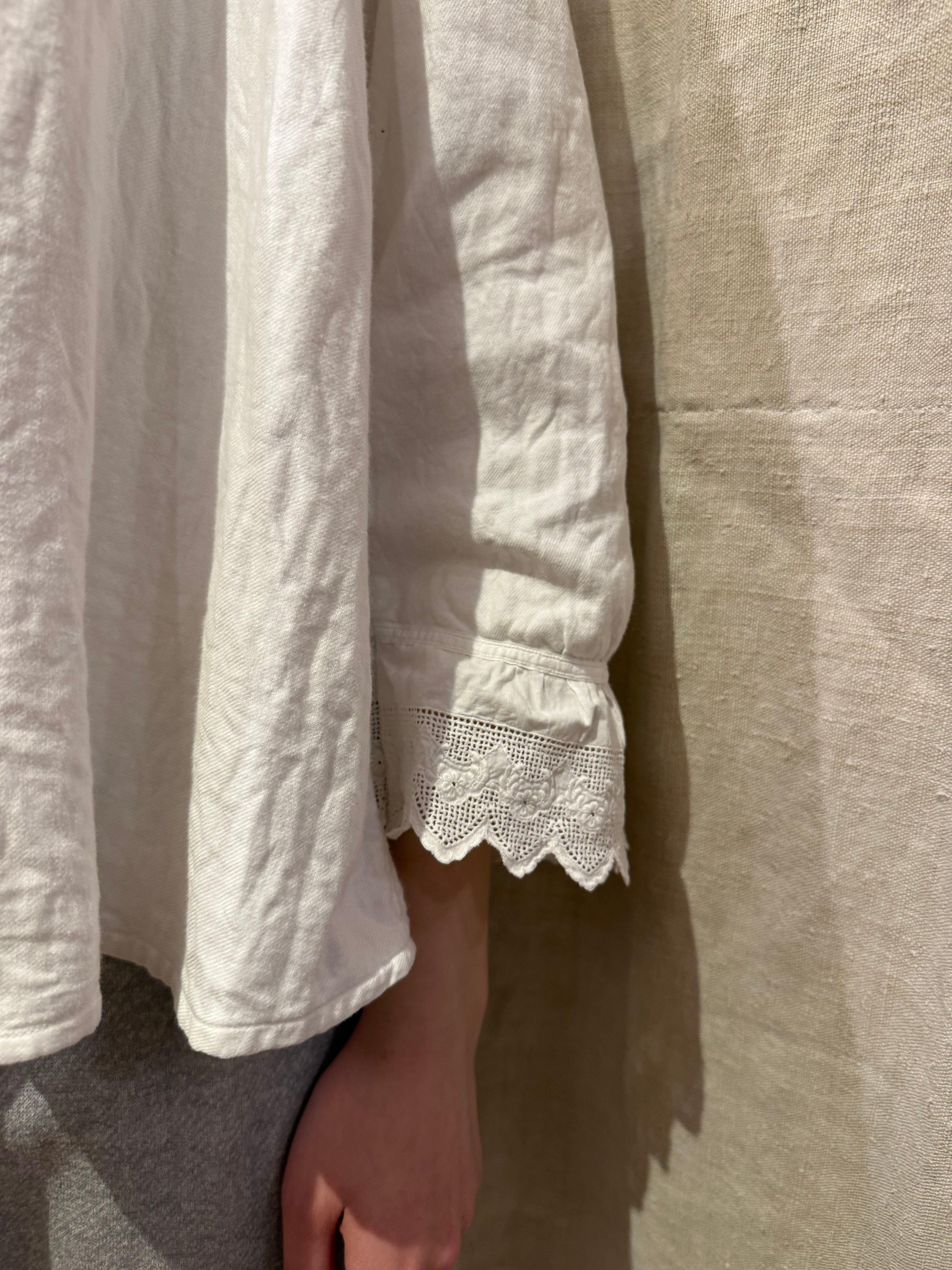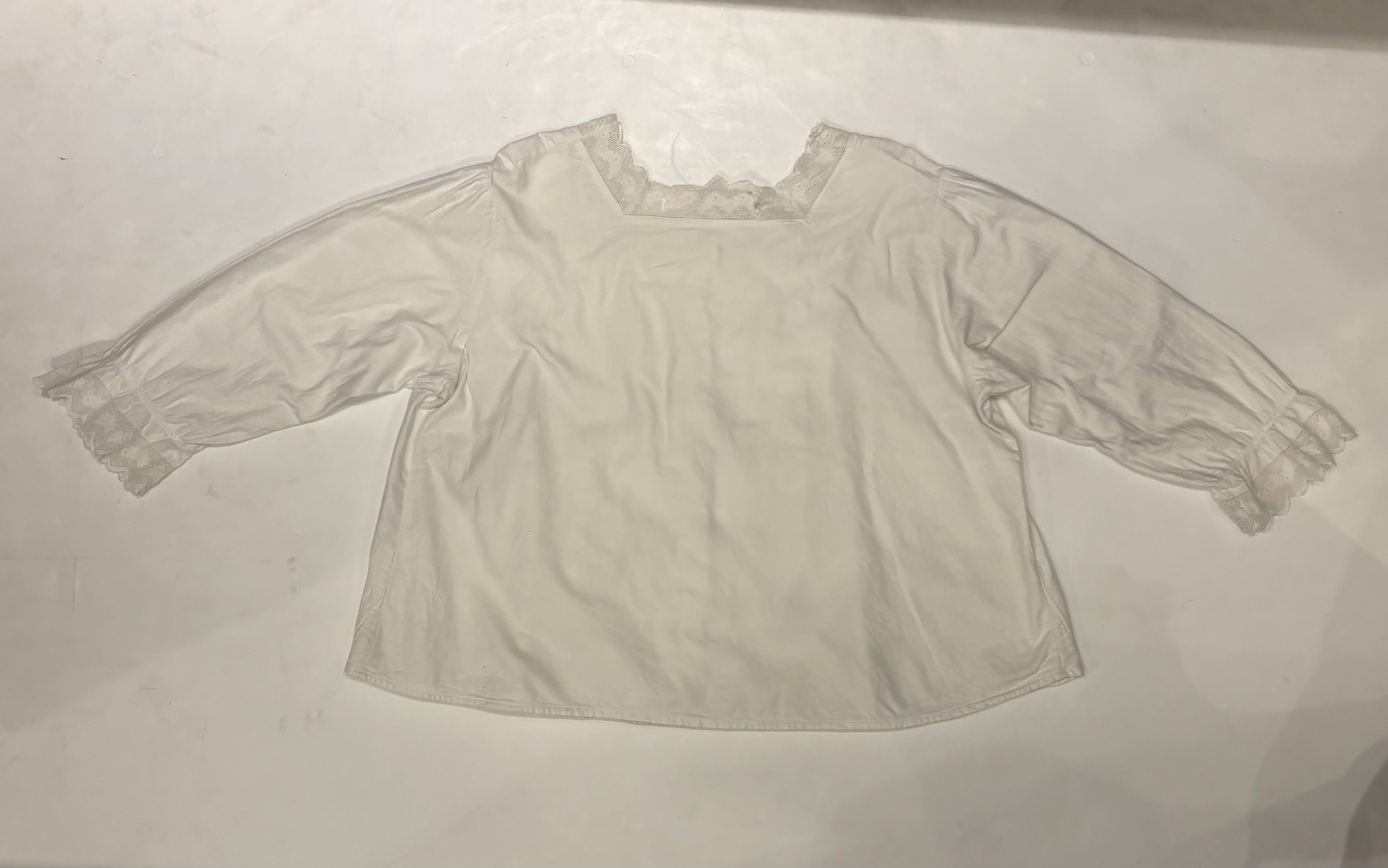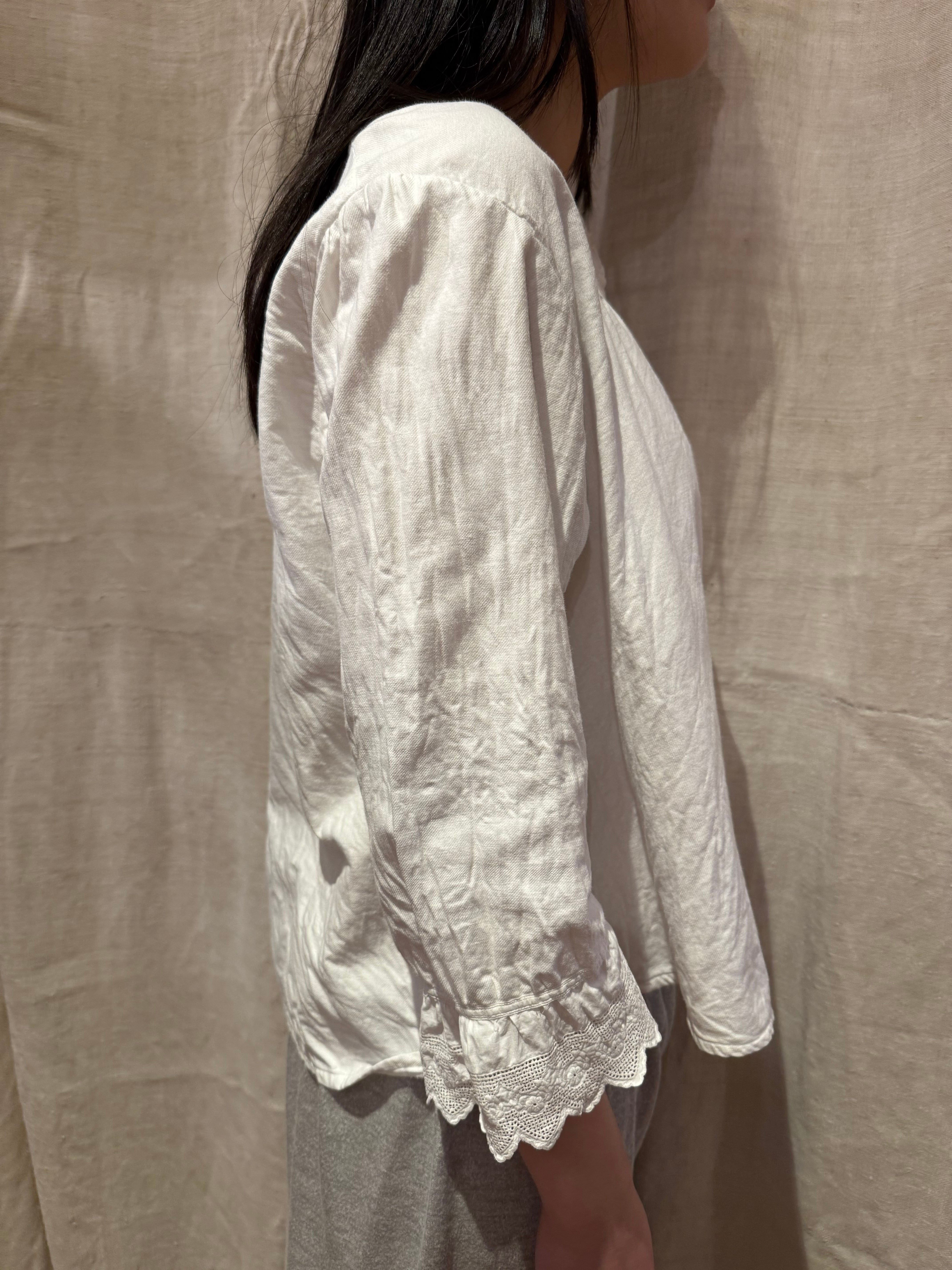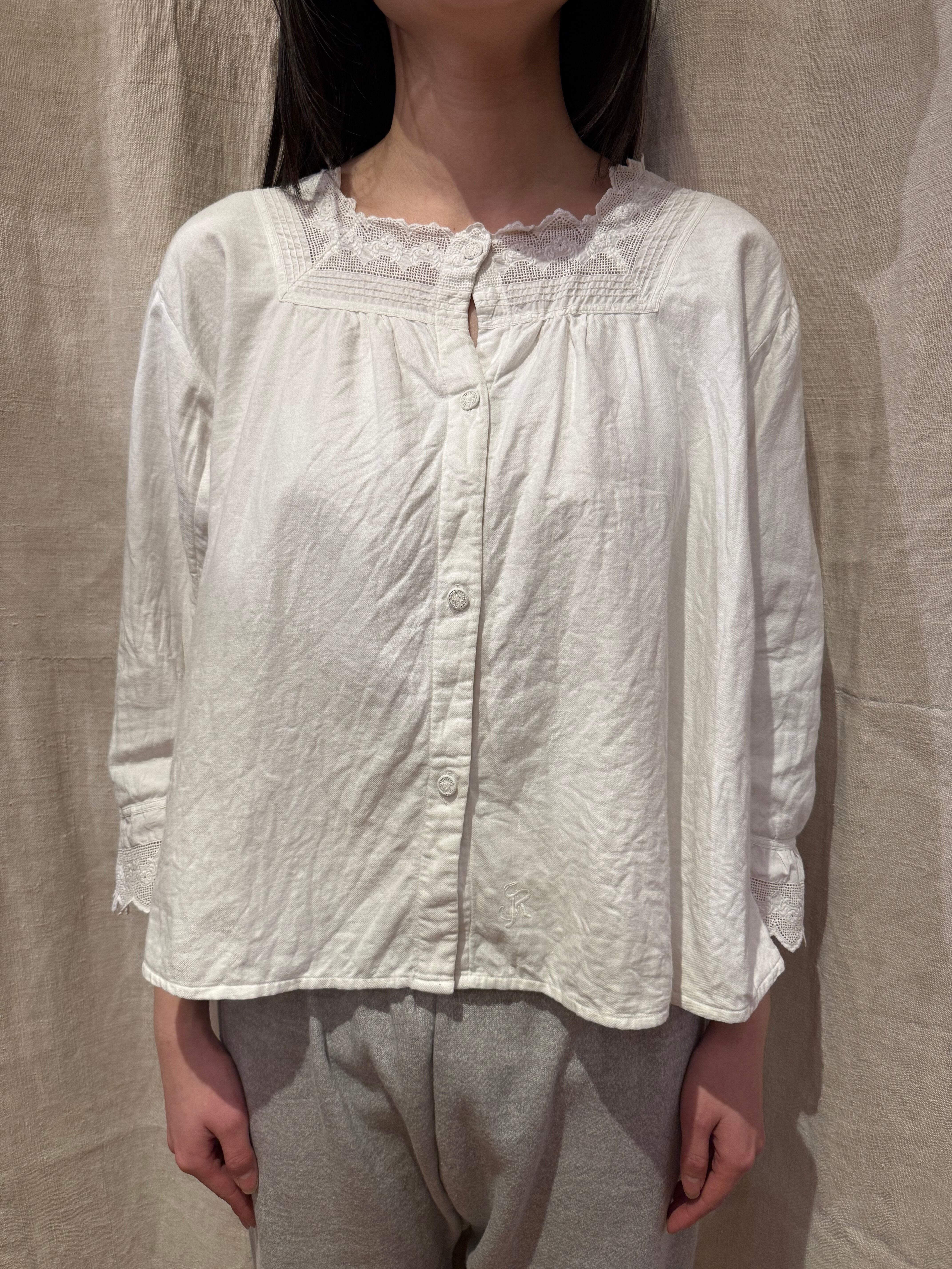 コットン素材のブラウスです。裏起毛で柔らかい生地感です。ふわっとしたシルエットで、襟元と袖裾には細かいレースが施されており、柔らかい雰囲気です。そんな雰囲気に馴染む糸ボタンがとても可愛いです。裾にはホワイトの糸でイニシャルの刺繍があります。