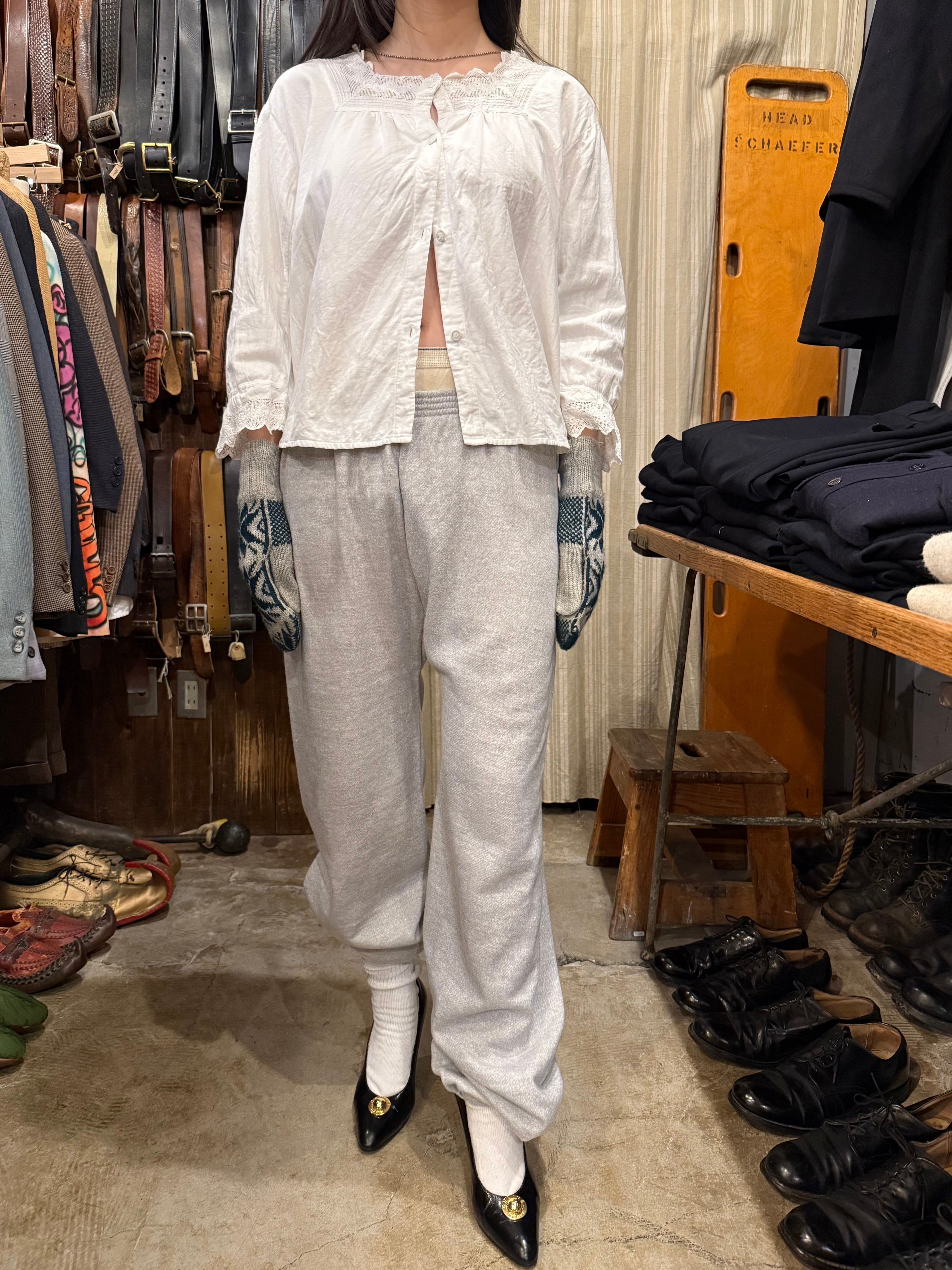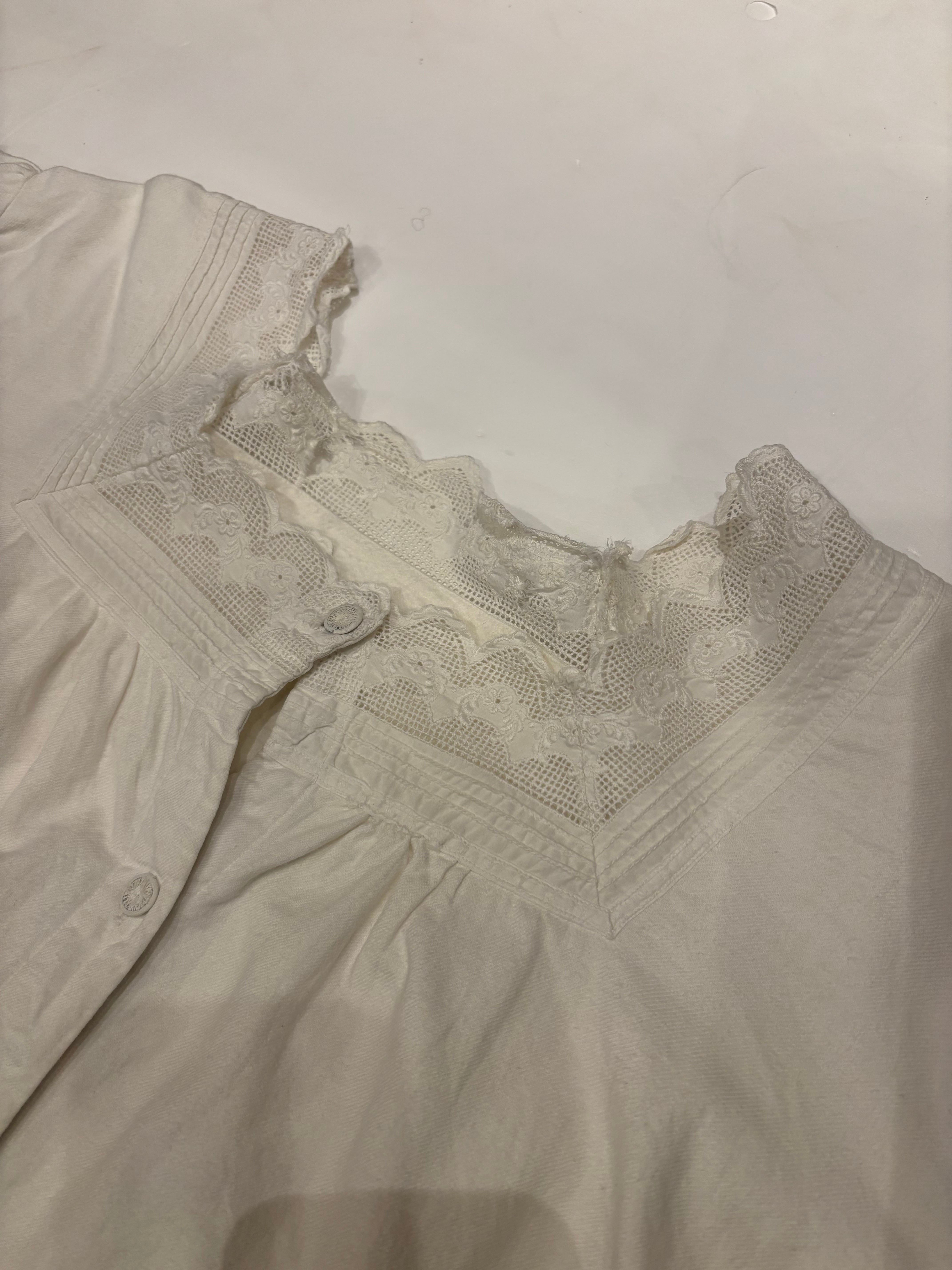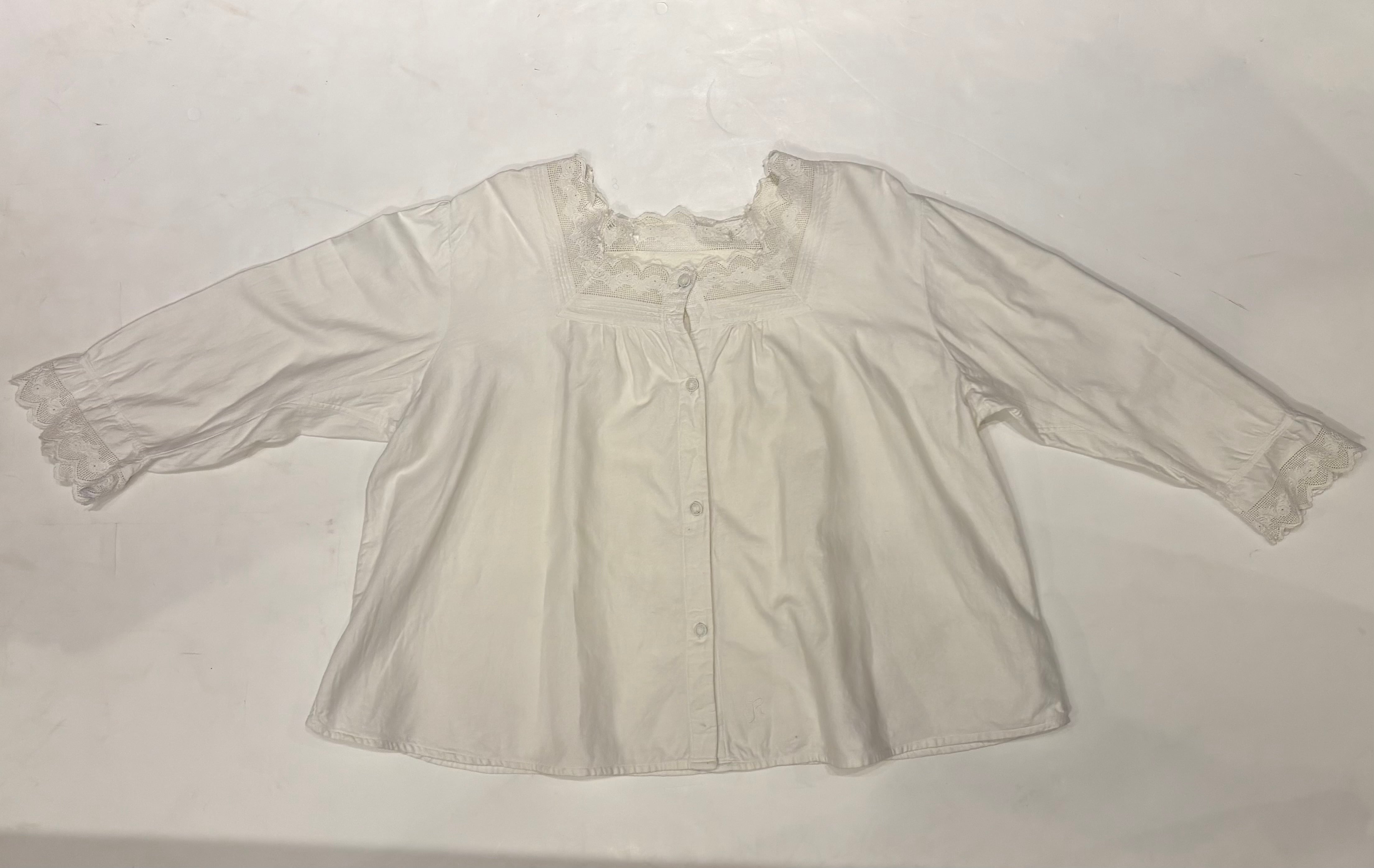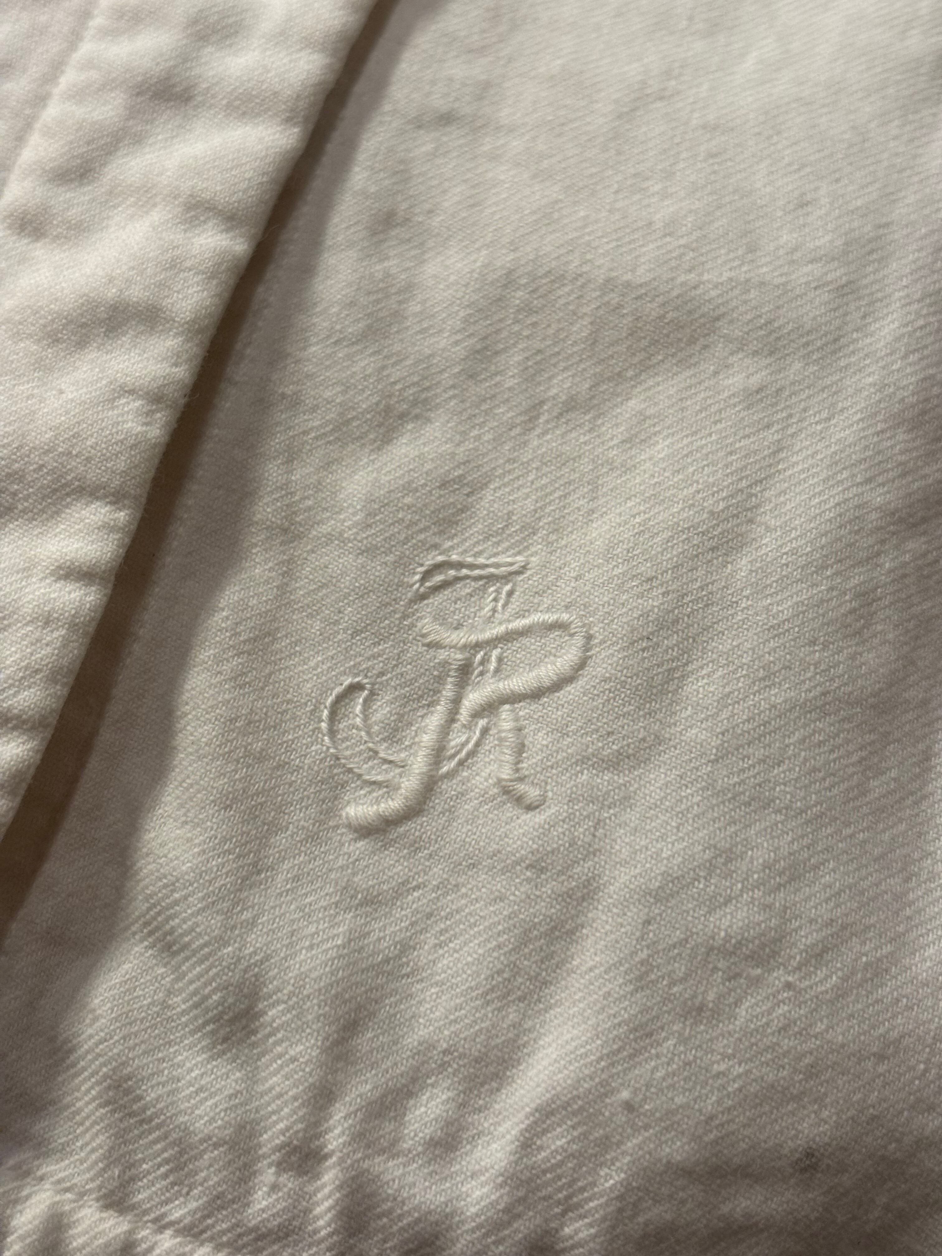 コットン素材のブラウスです。裏起毛で柔らかい生地感です。ふわっとしたシルエットで、襟元と袖裾には細かいレースが施されており、柔らかい雰囲気です。そんな雰囲気に馴染む糸ボタンがとても可愛いです。裾にはホワイトの糸でイニシャルの刺繍があります。