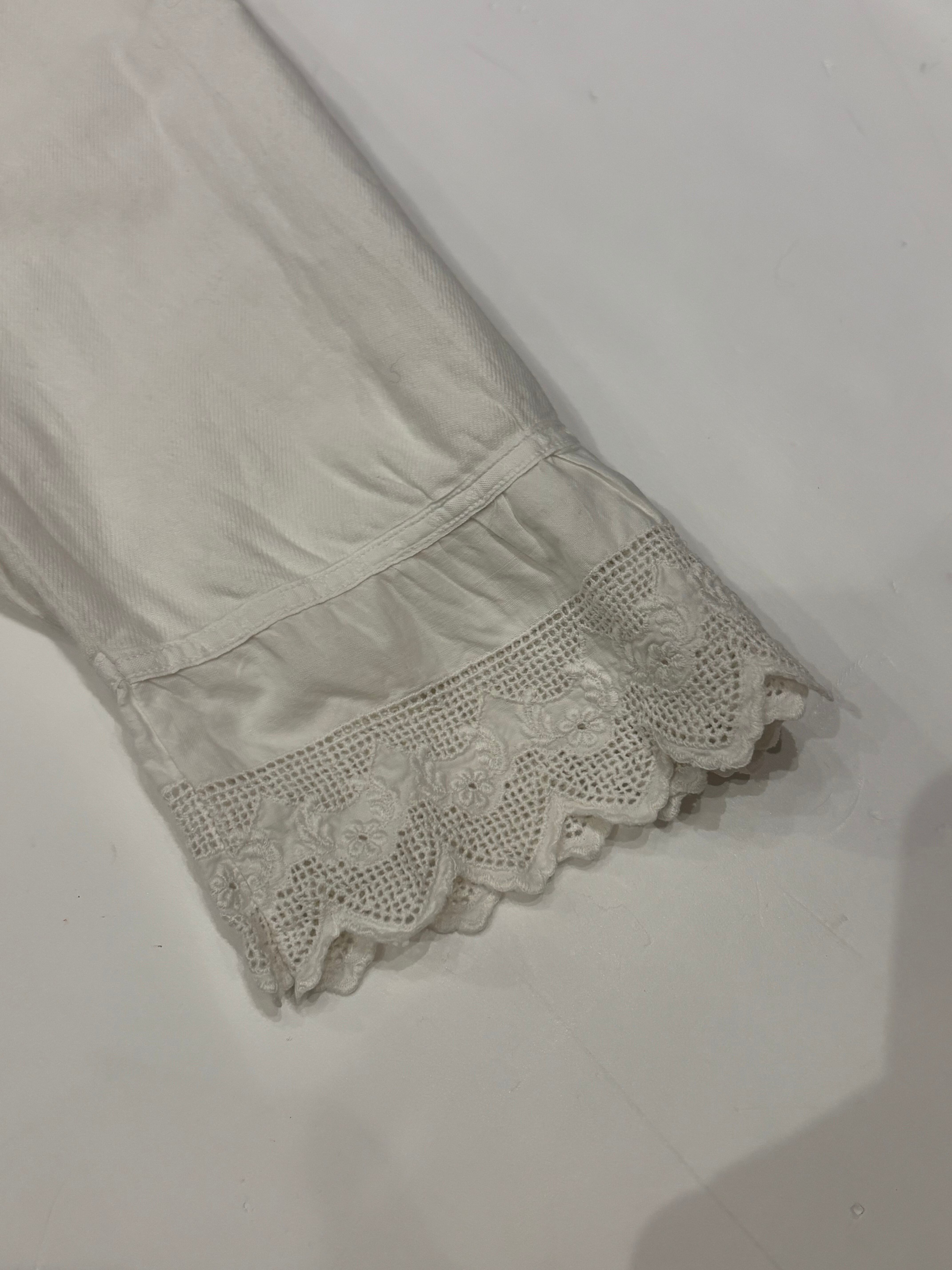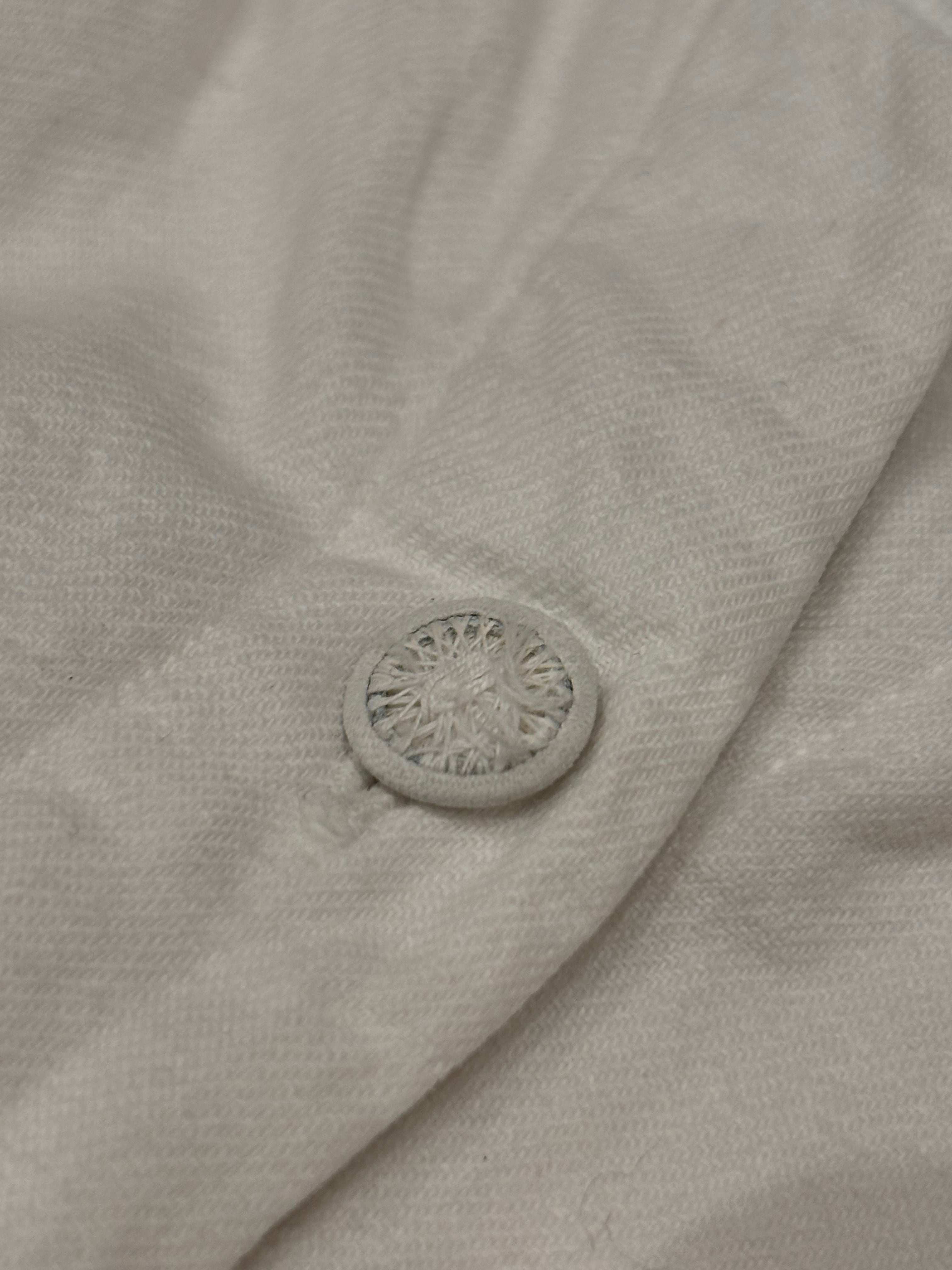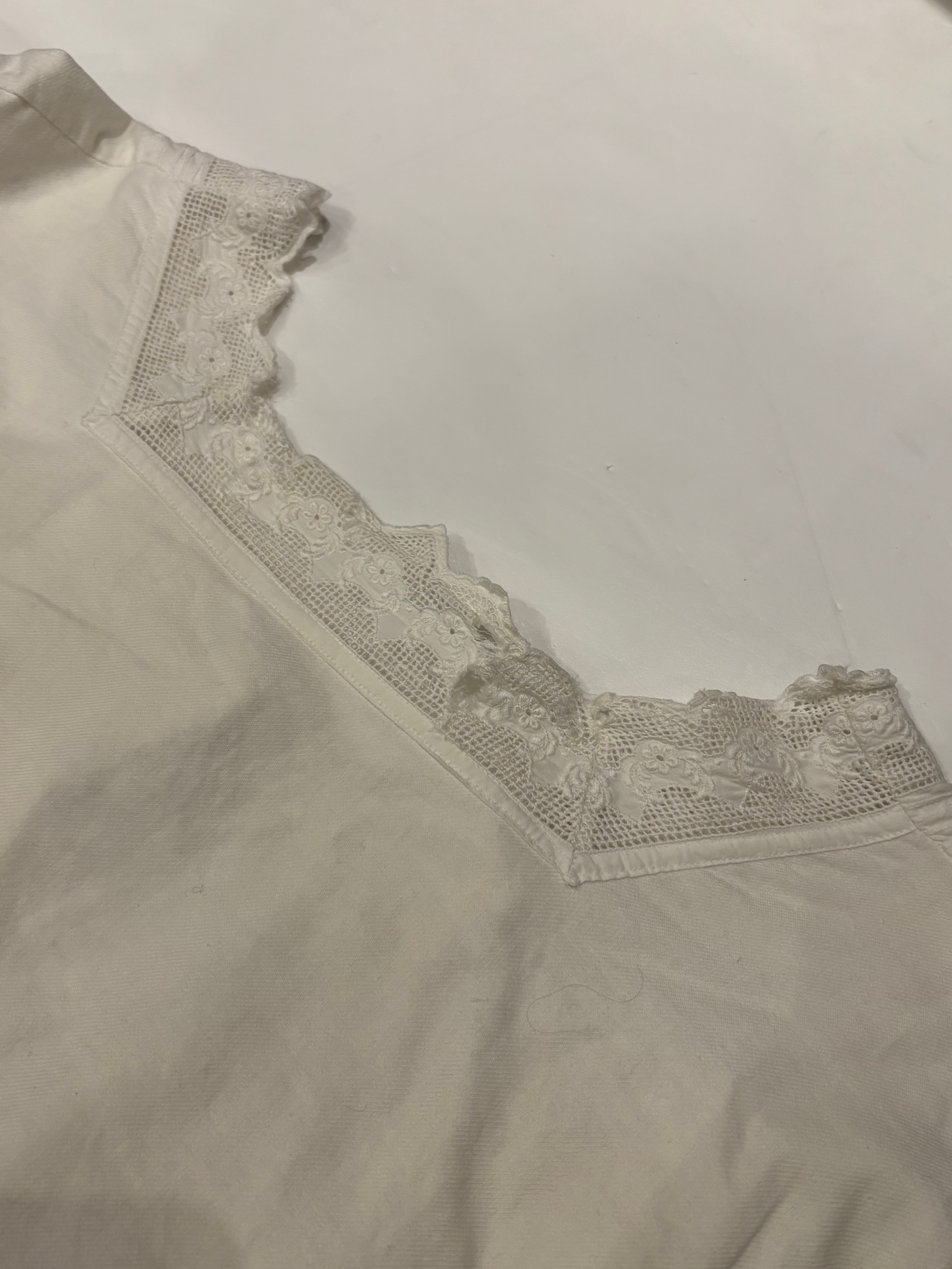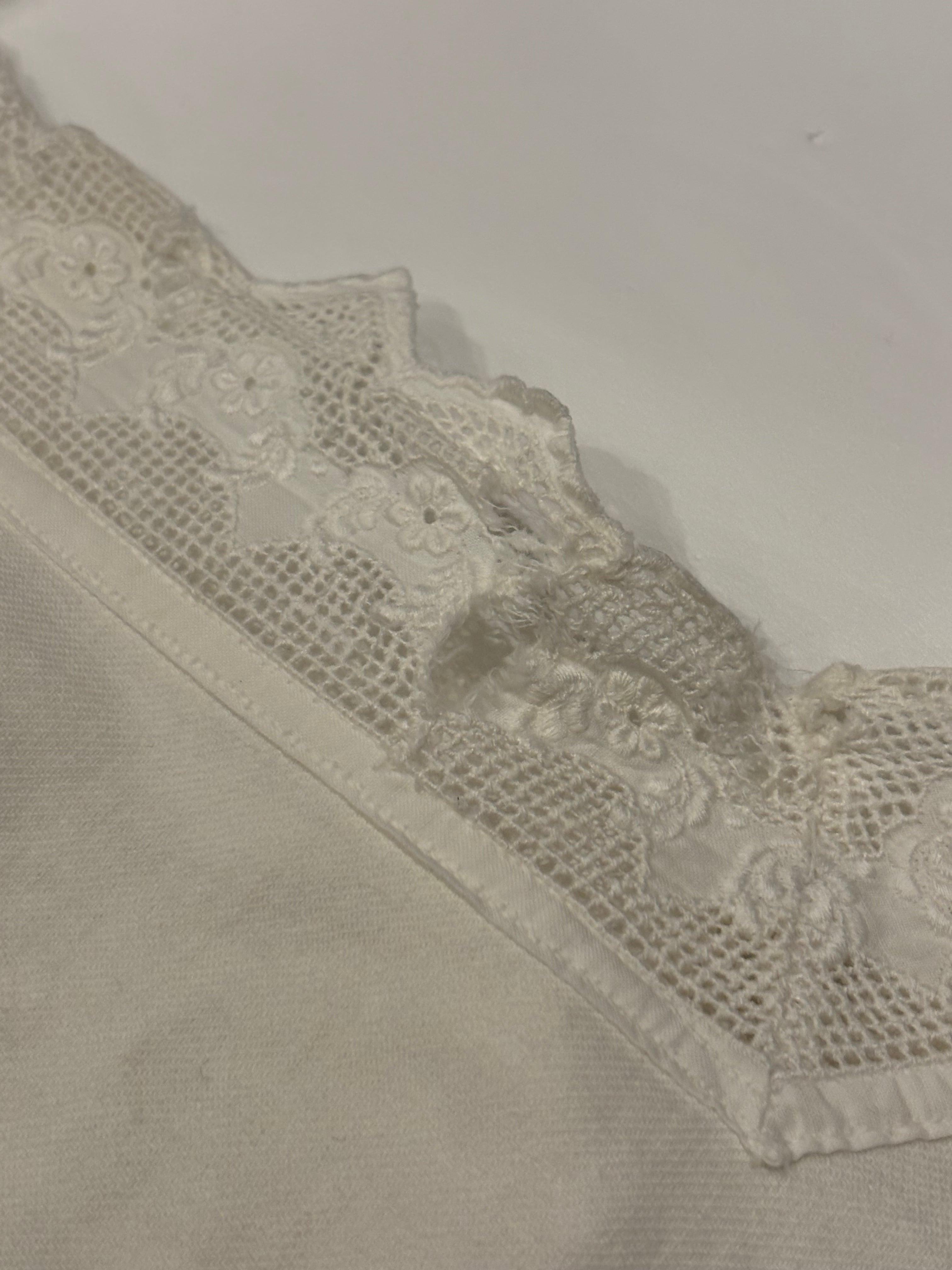 コットン素材のブラウスです。裏起毛で柔らかい生地感です。ふわっとしたシルエットで、襟元と袖裾には細かいレースが施されており、柔らかい雰囲気です。そんな雰囲気に馴染む糸ボタンがとても可愛いです。裾にはホワイトの糸でイニシャルの刺繍があります。