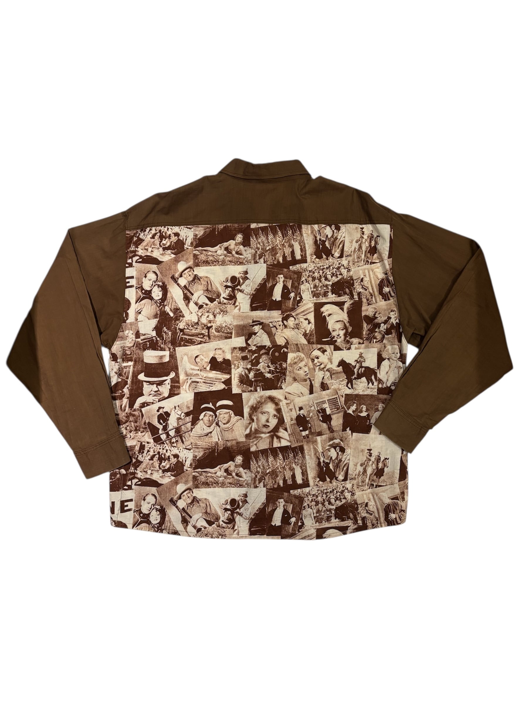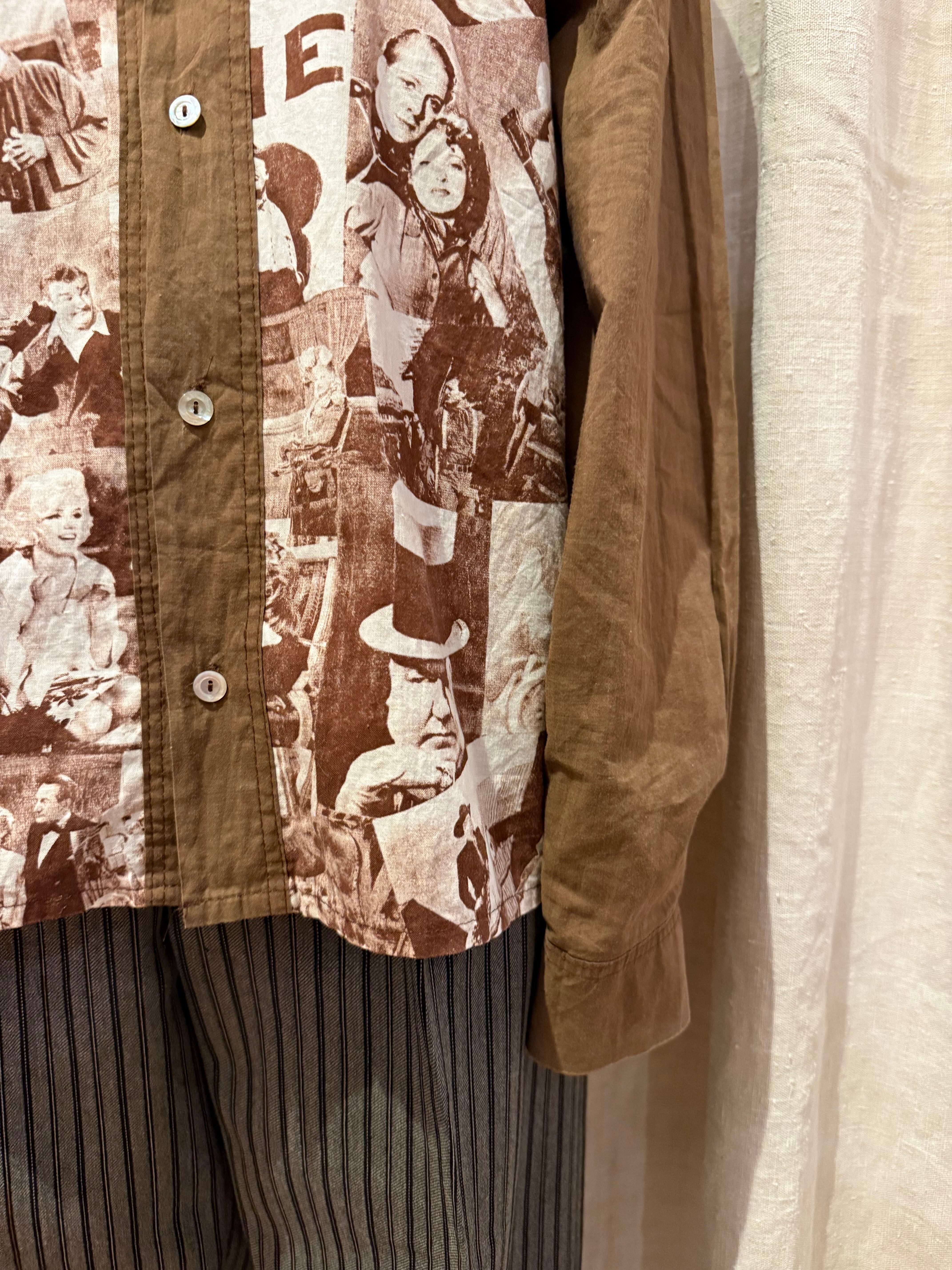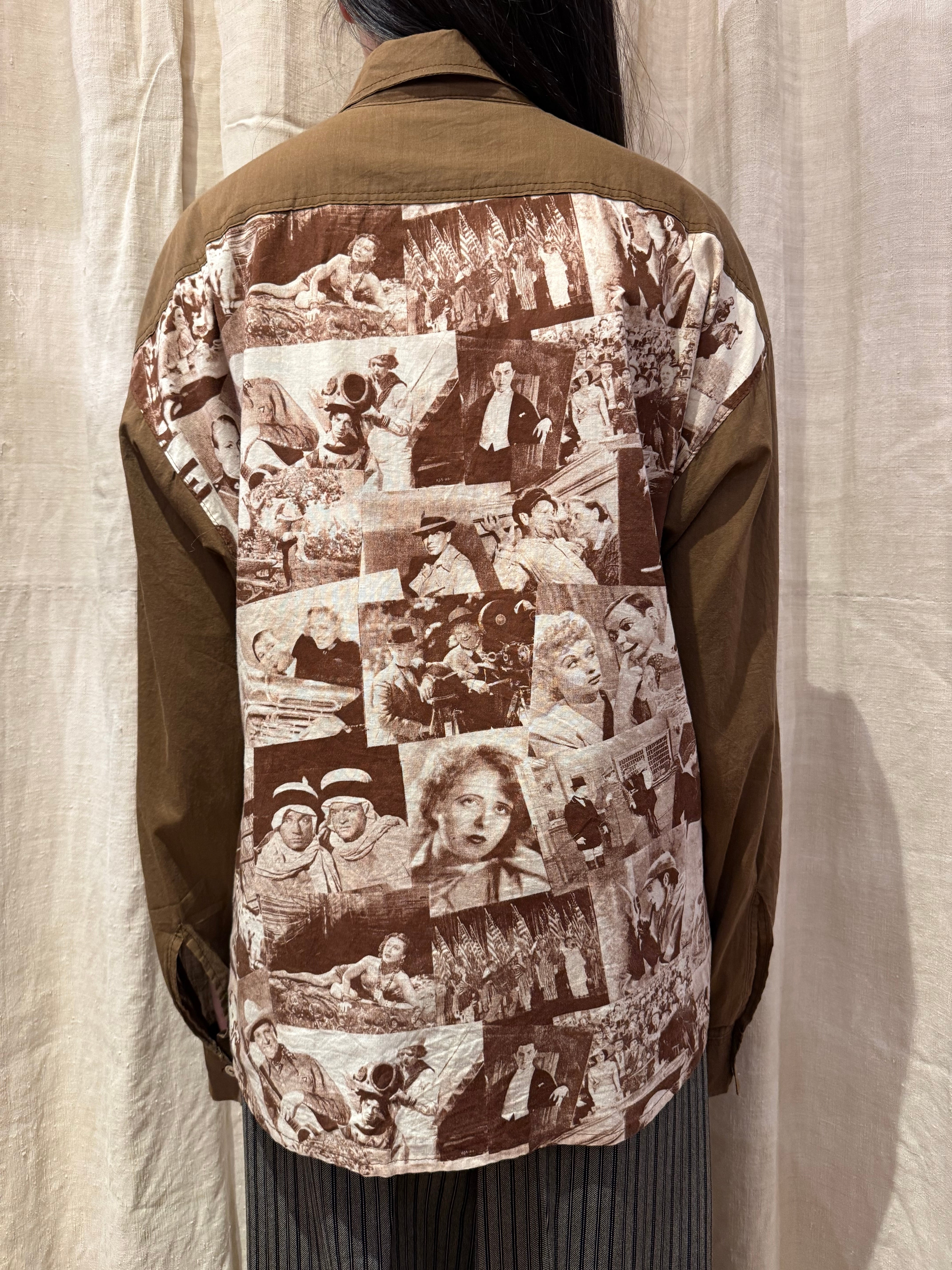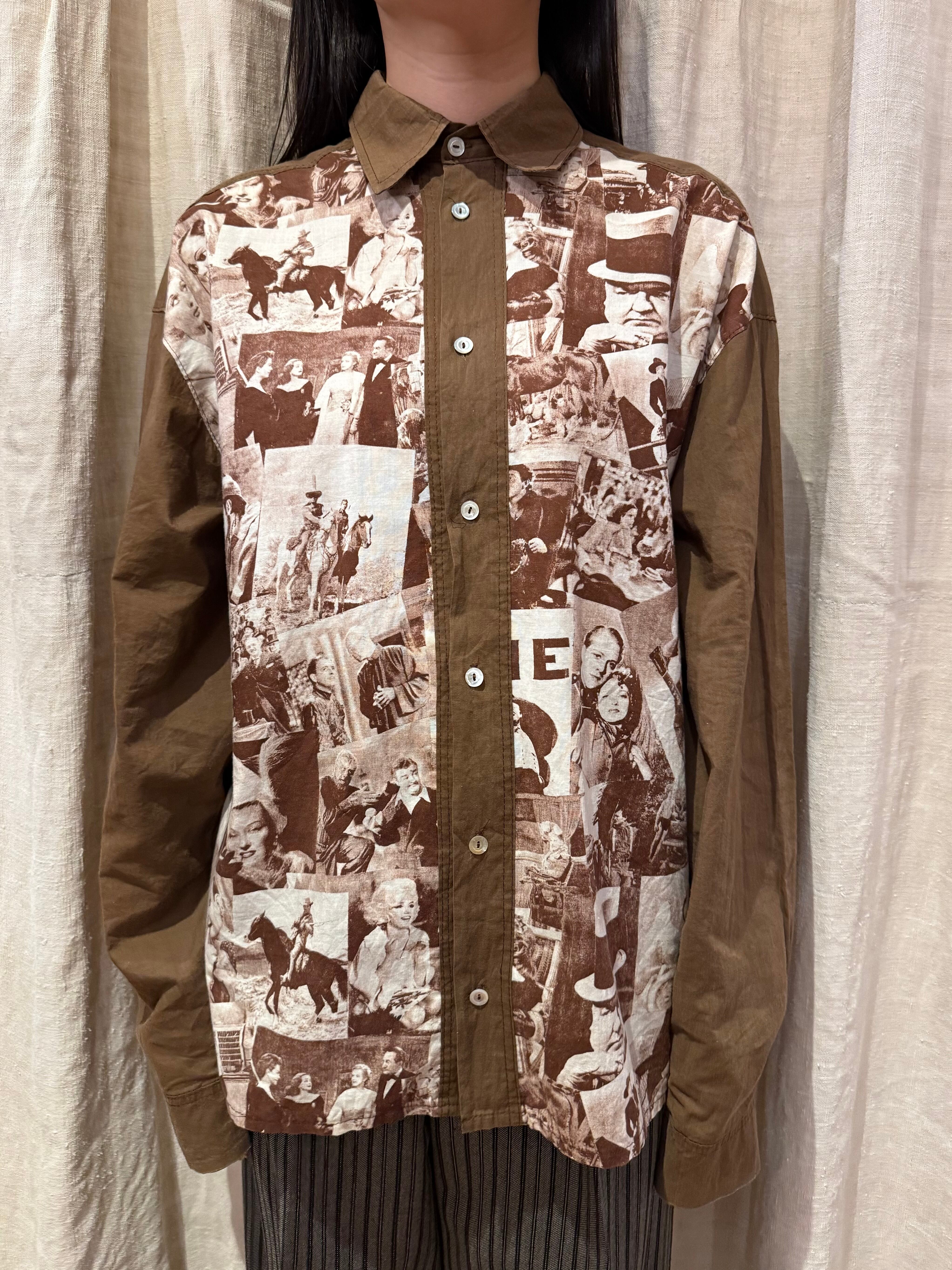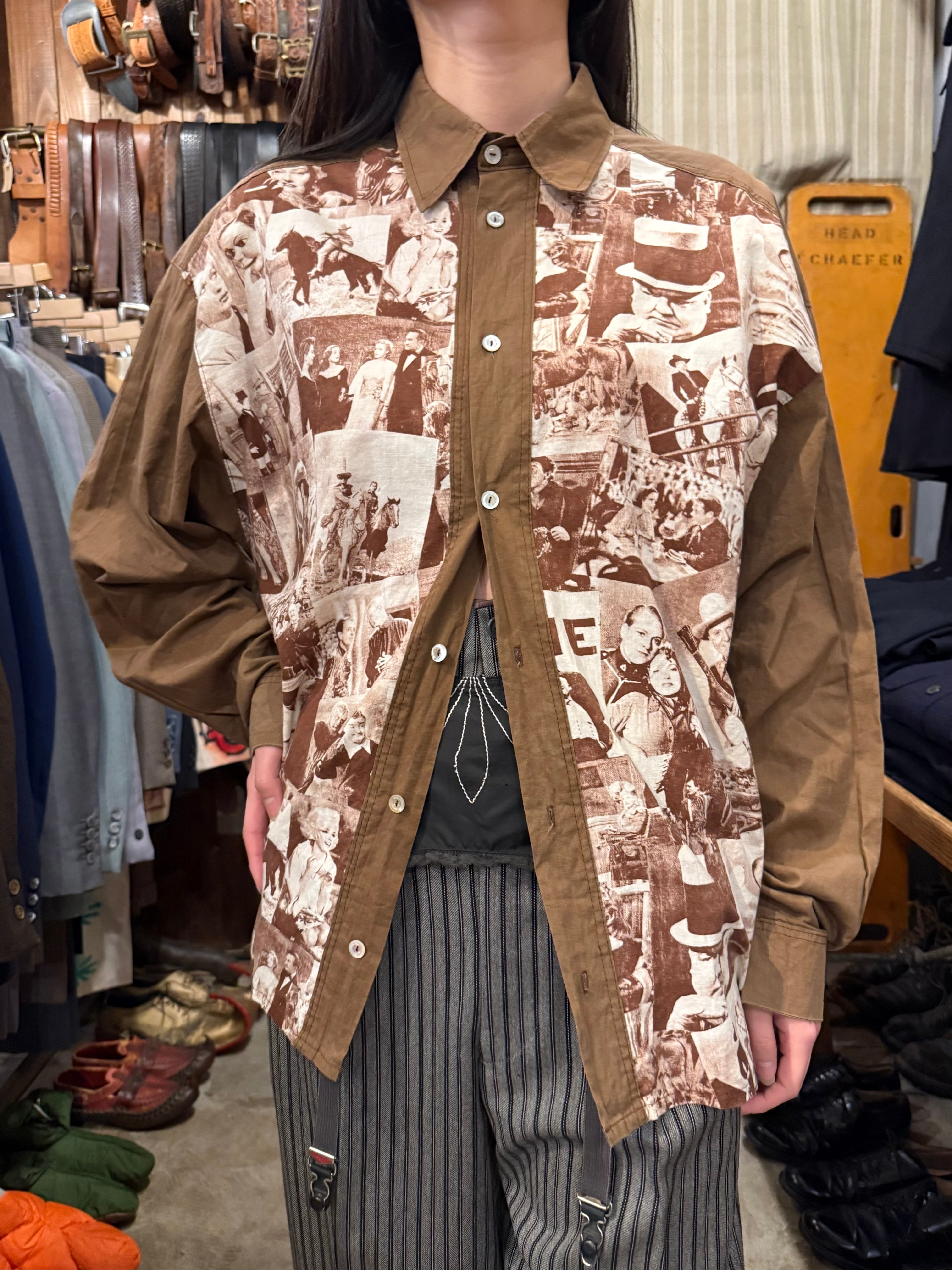 クラシック映画のワンシーンをコラージュしたシャツでございます。探偵・西部劇・社交界・ミュージカルなど当時の定番ジャンルのカットが混在しており、その当時のワンシーンが贅沢に使われています。着るだけではなく、肩にかけたり小物として使っても良いアイテムだと思います。