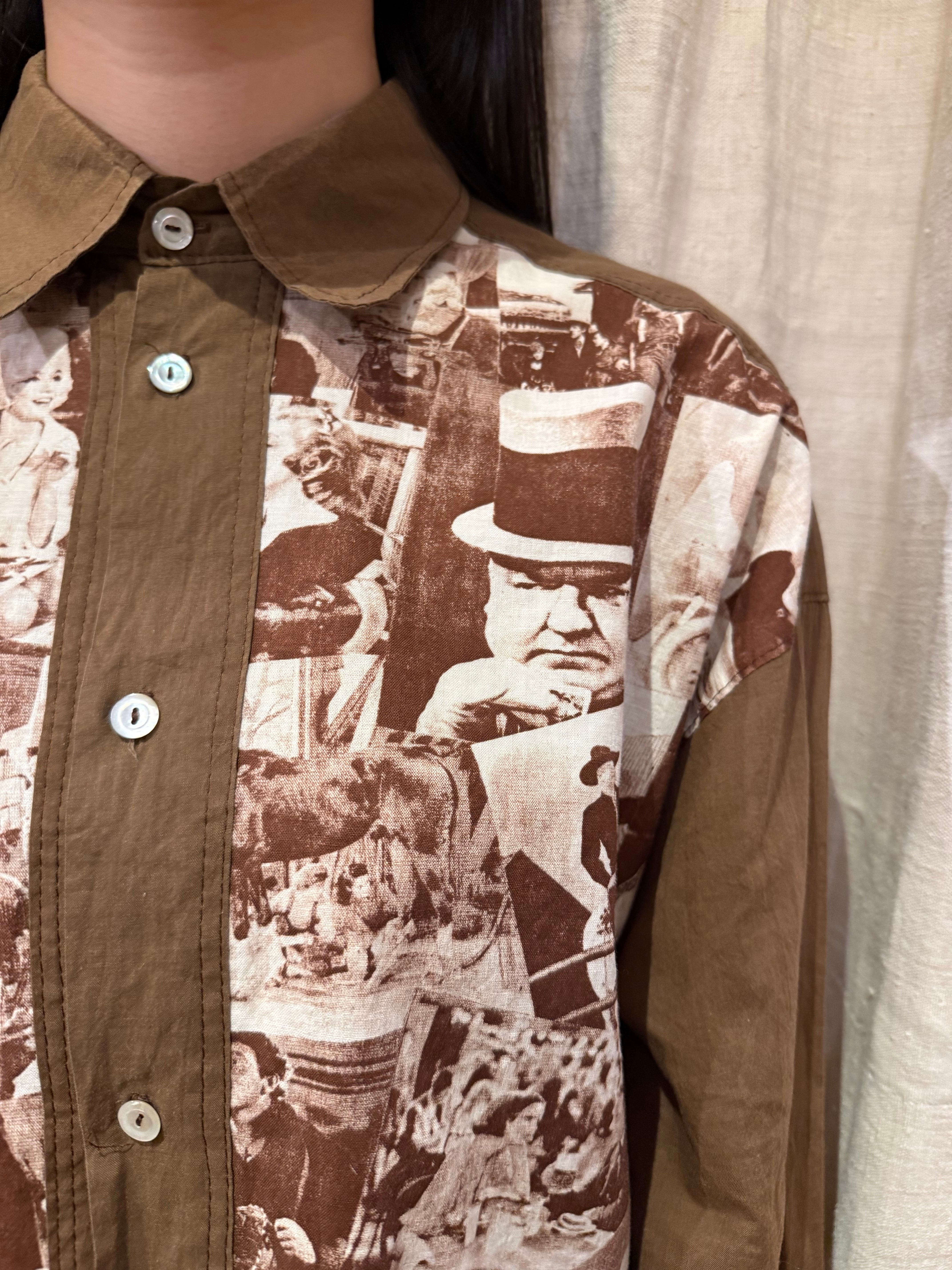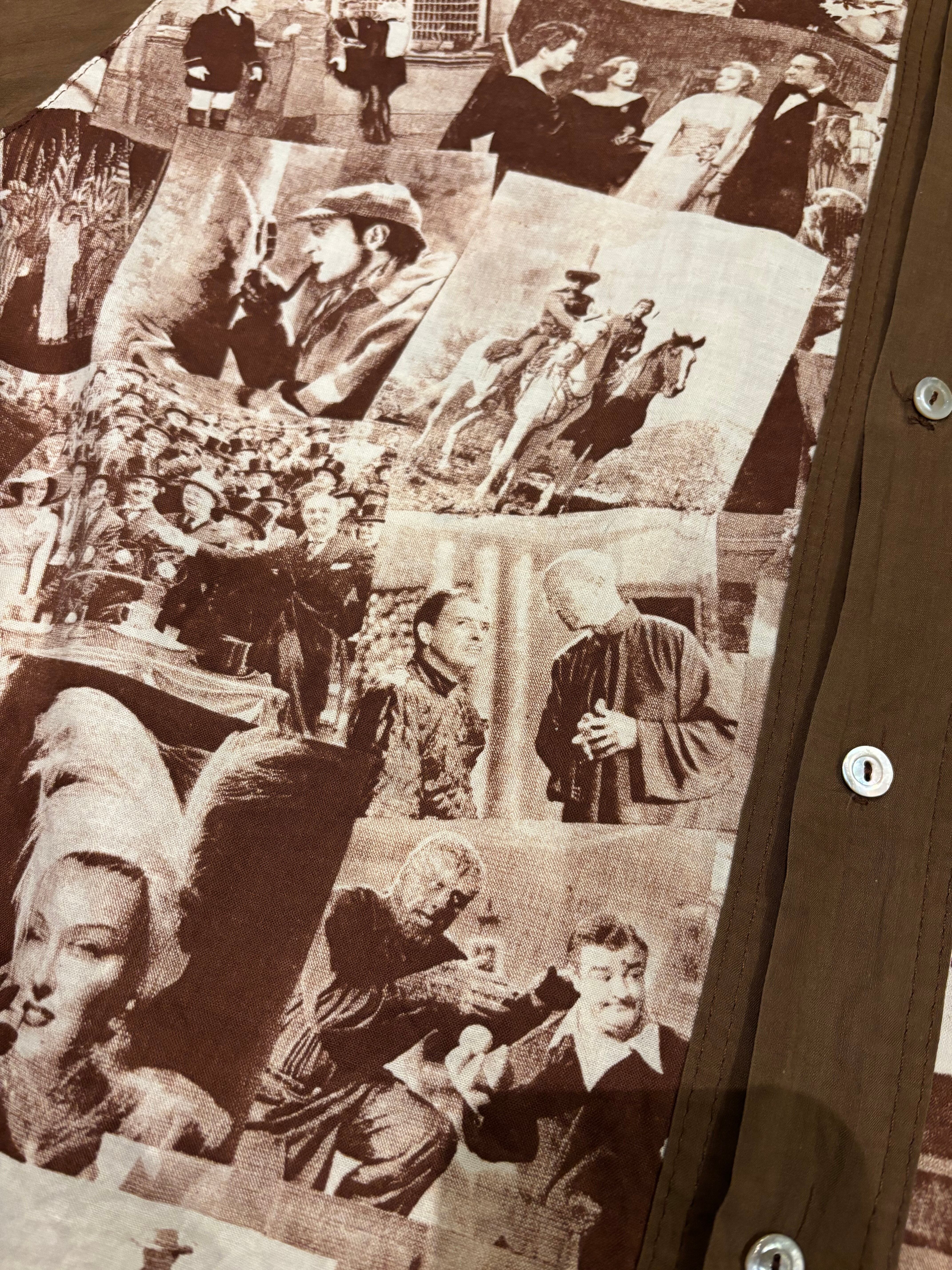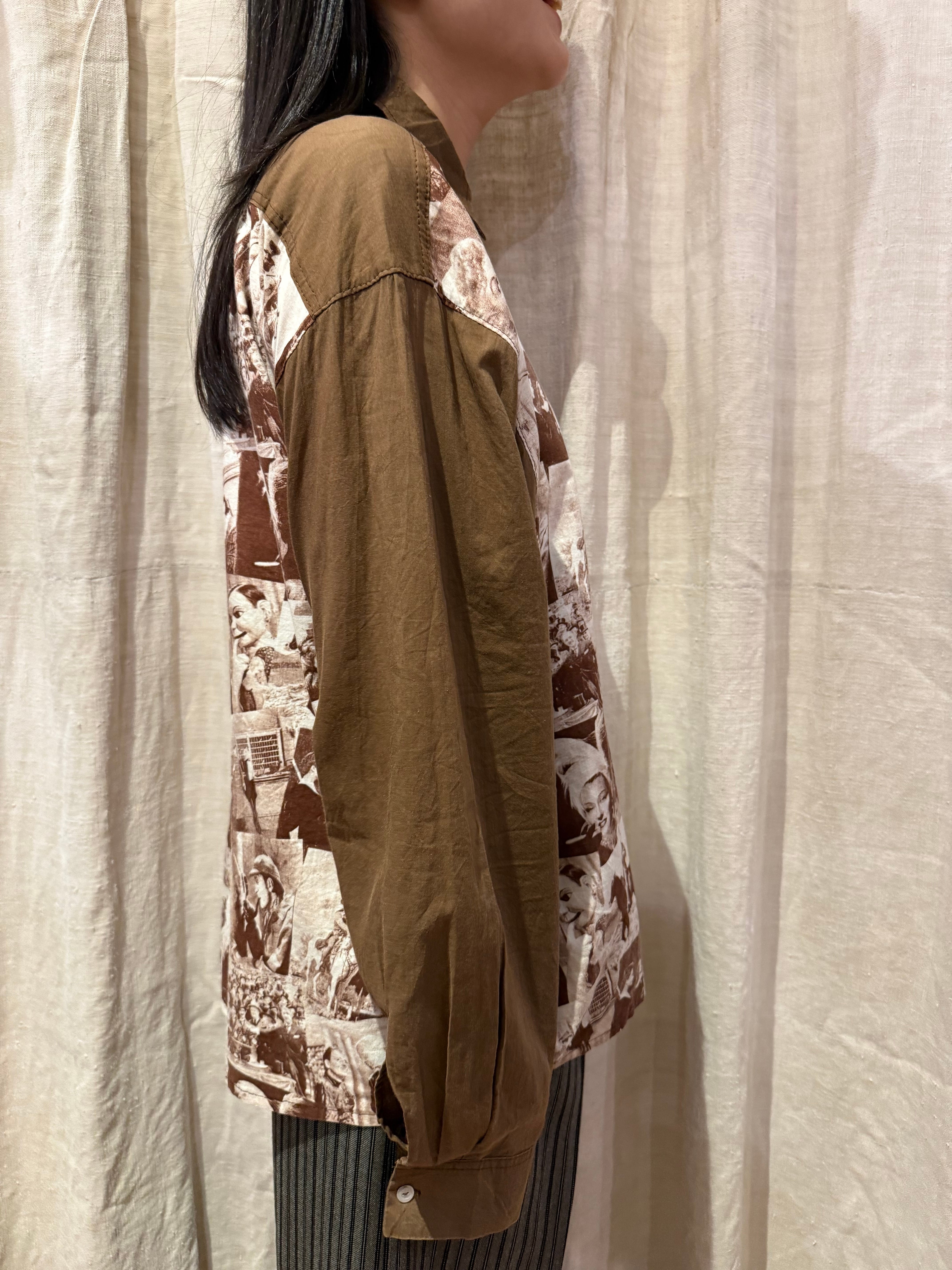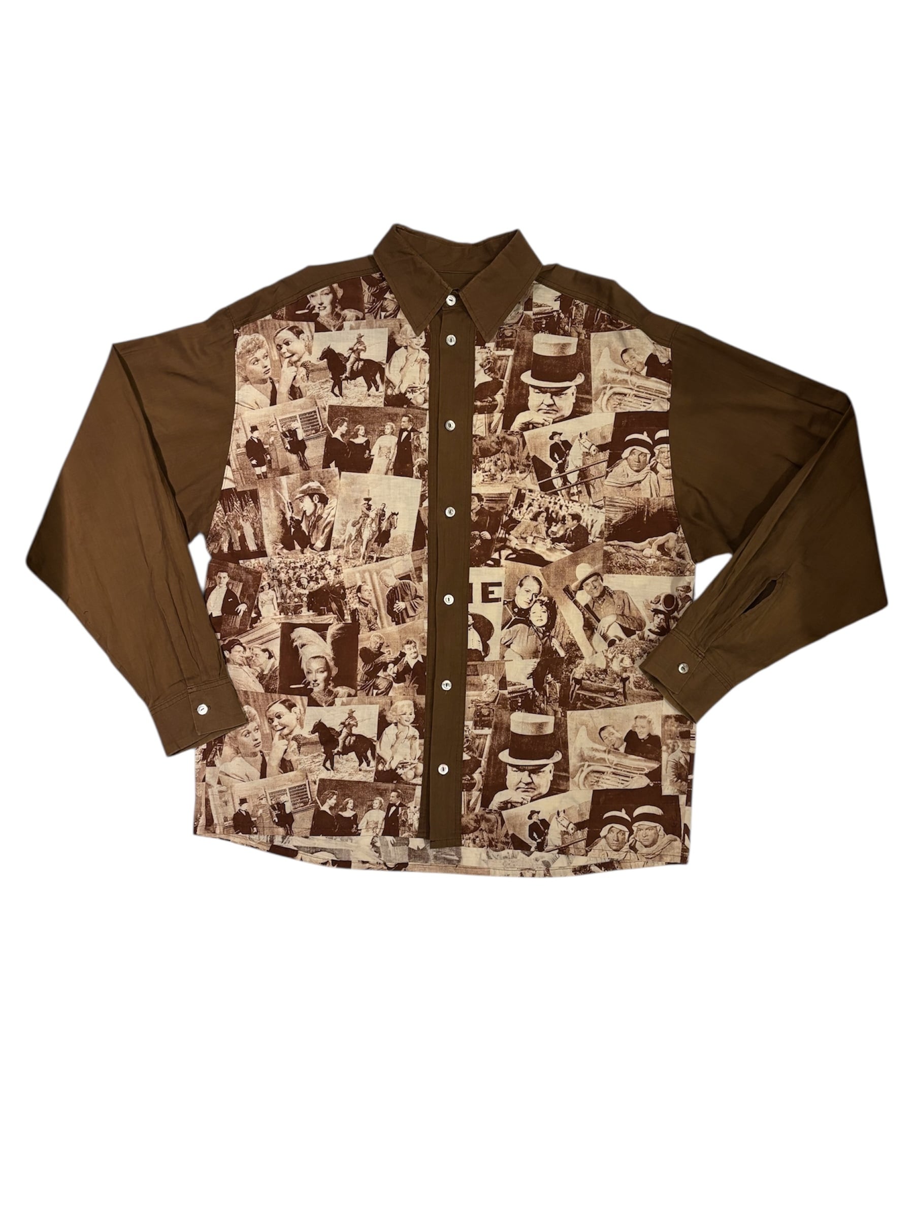 クラシック映画のワンシーンをコラージュしたシャツでございます。探偵・西部劇・社交界・ミュージカルなど当時の定番ジャンルのカットが混在しており、その当時のワンシーンが贅沢に使われています。着るだけではなく、肩にかけたり小物として使っても良いアイテムだと思います。