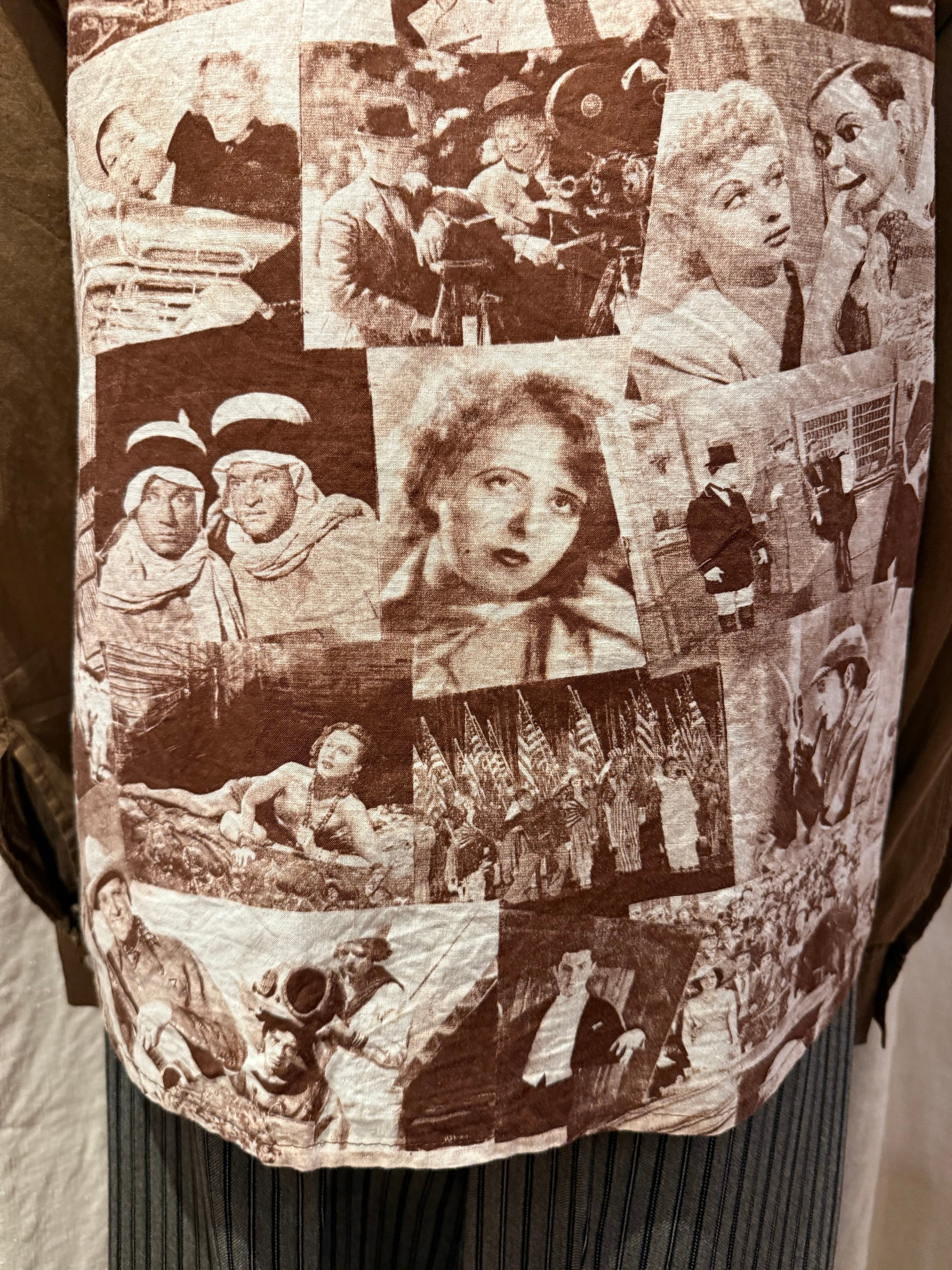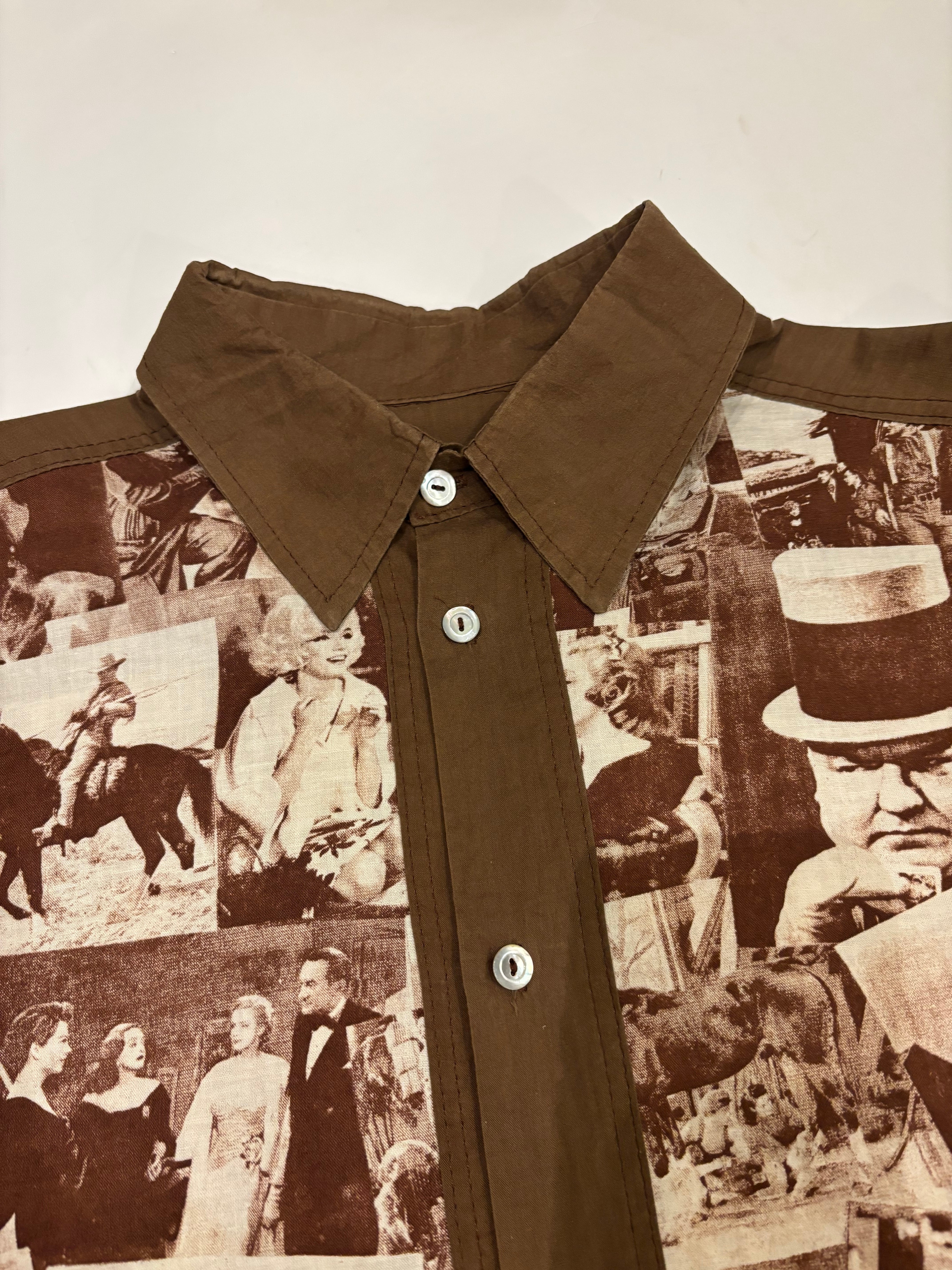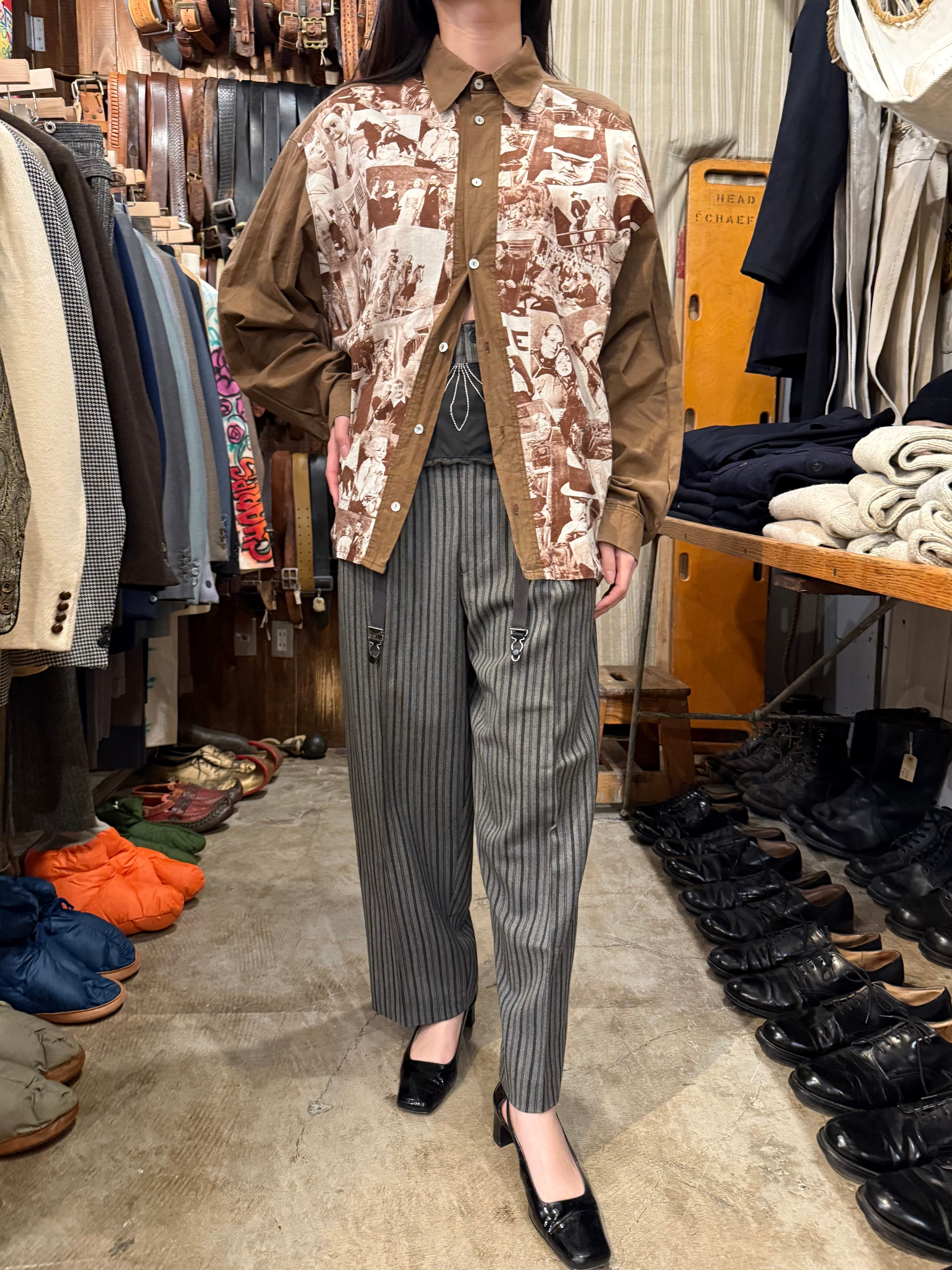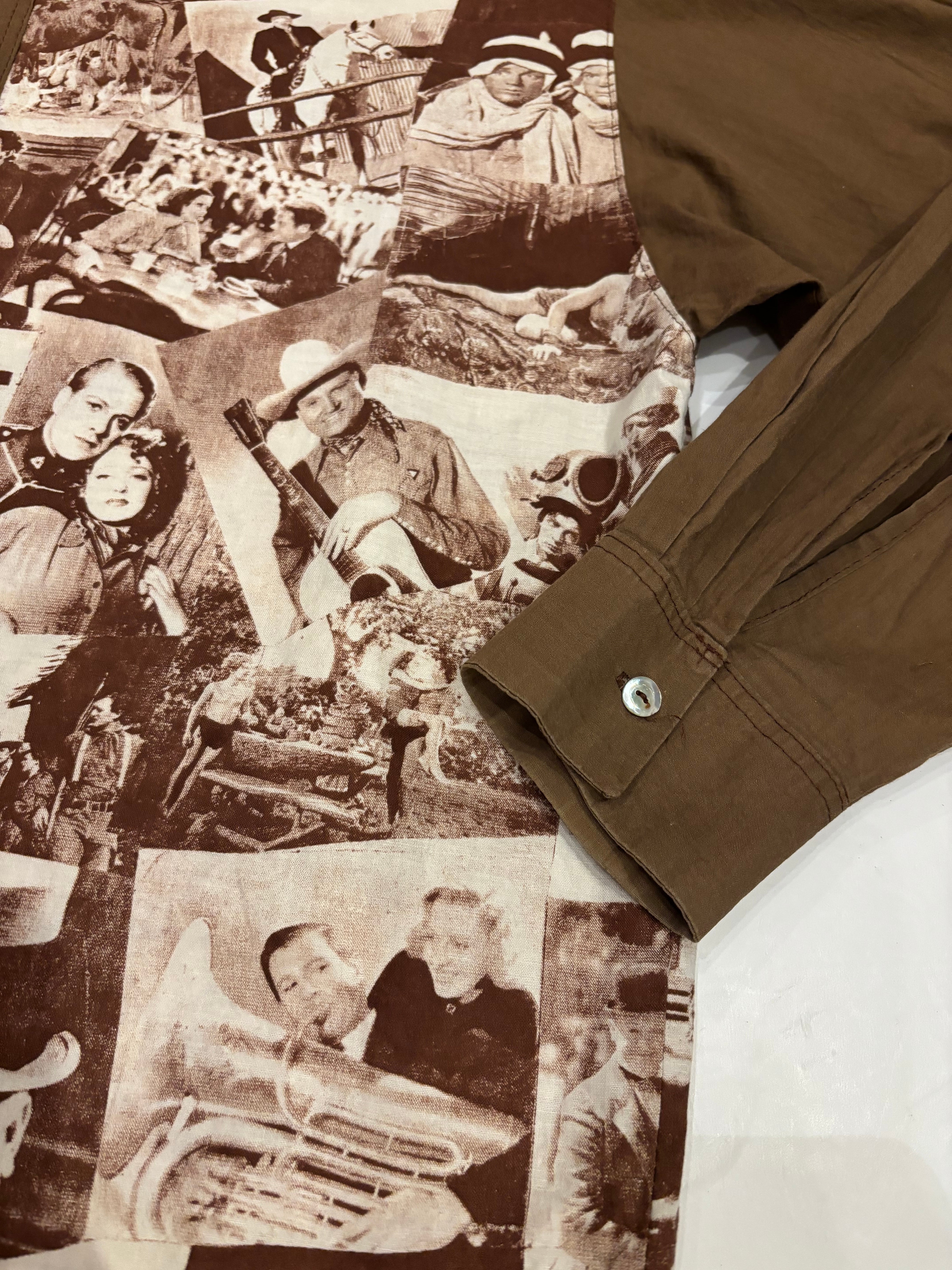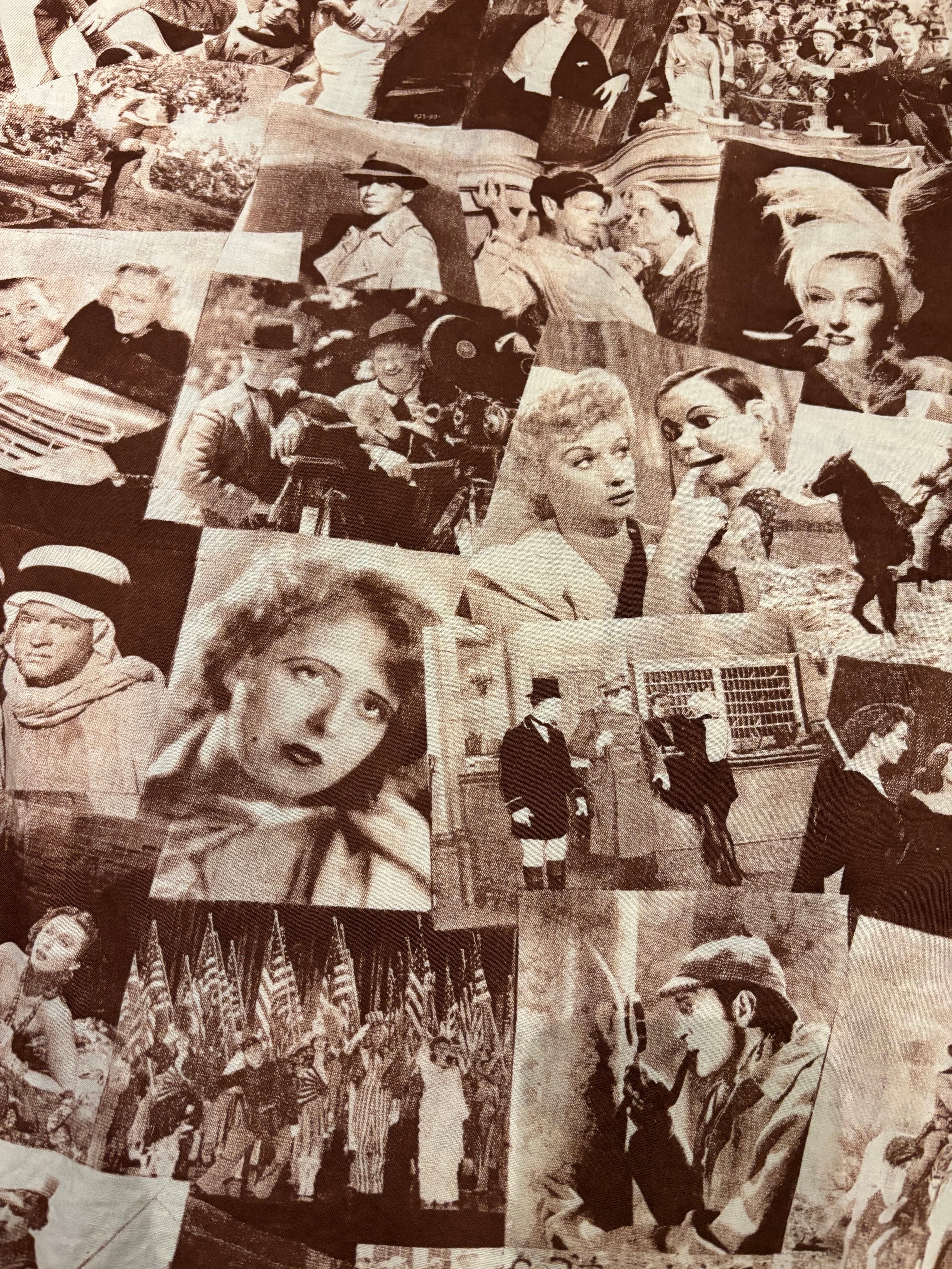 クラシック映画のワンシーンをコラージュしたシャツでございます。探偵・西部劇・社交界・ミュージカルなど当時の定番ジャンルのカットが混在しており、その当時のワンシーンが贅沢に使われています。着るだけではなく、肩にかけたり小物として使っても良いアイテムだと思います。