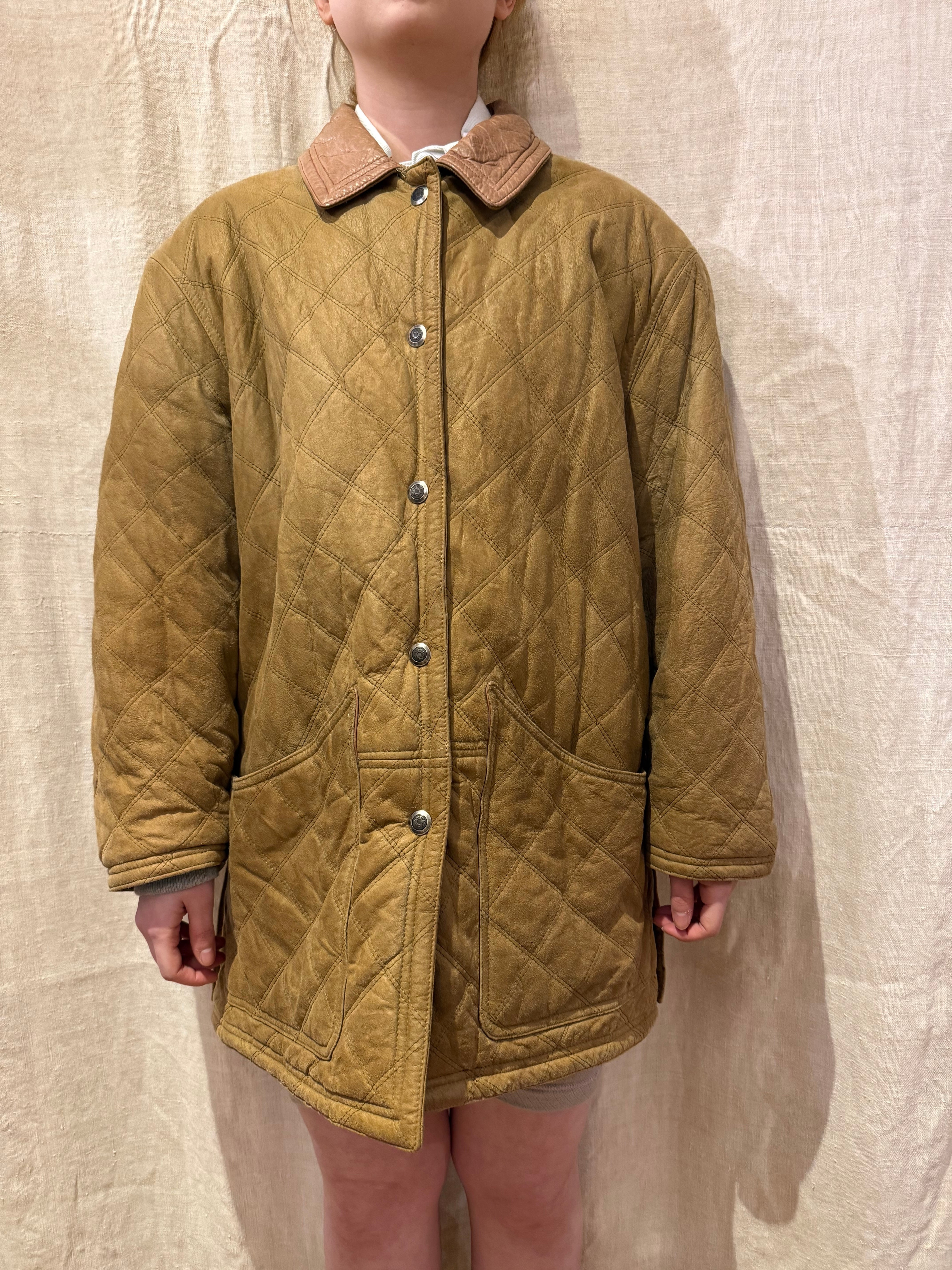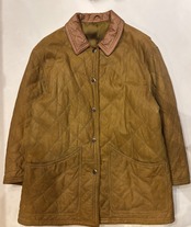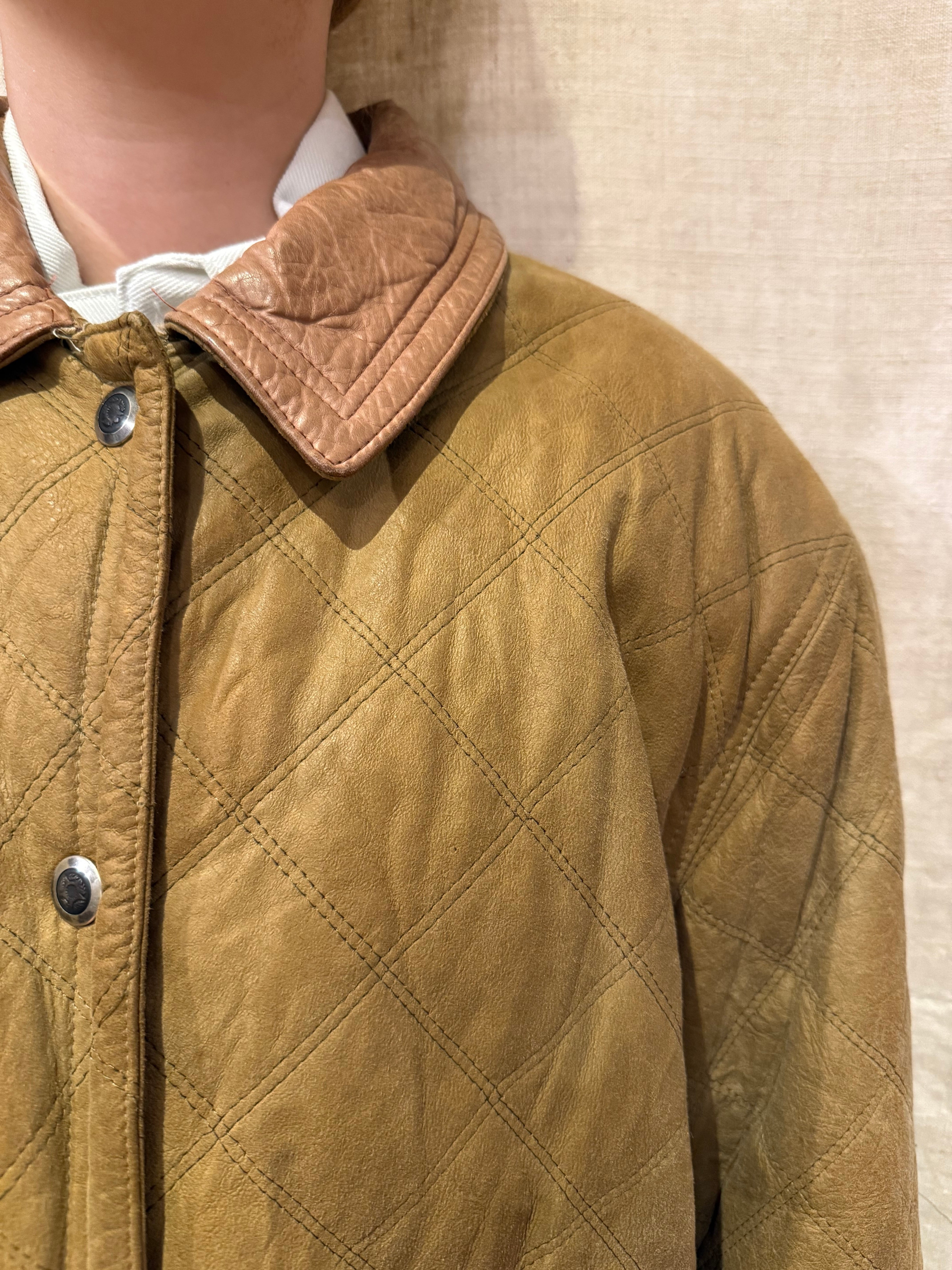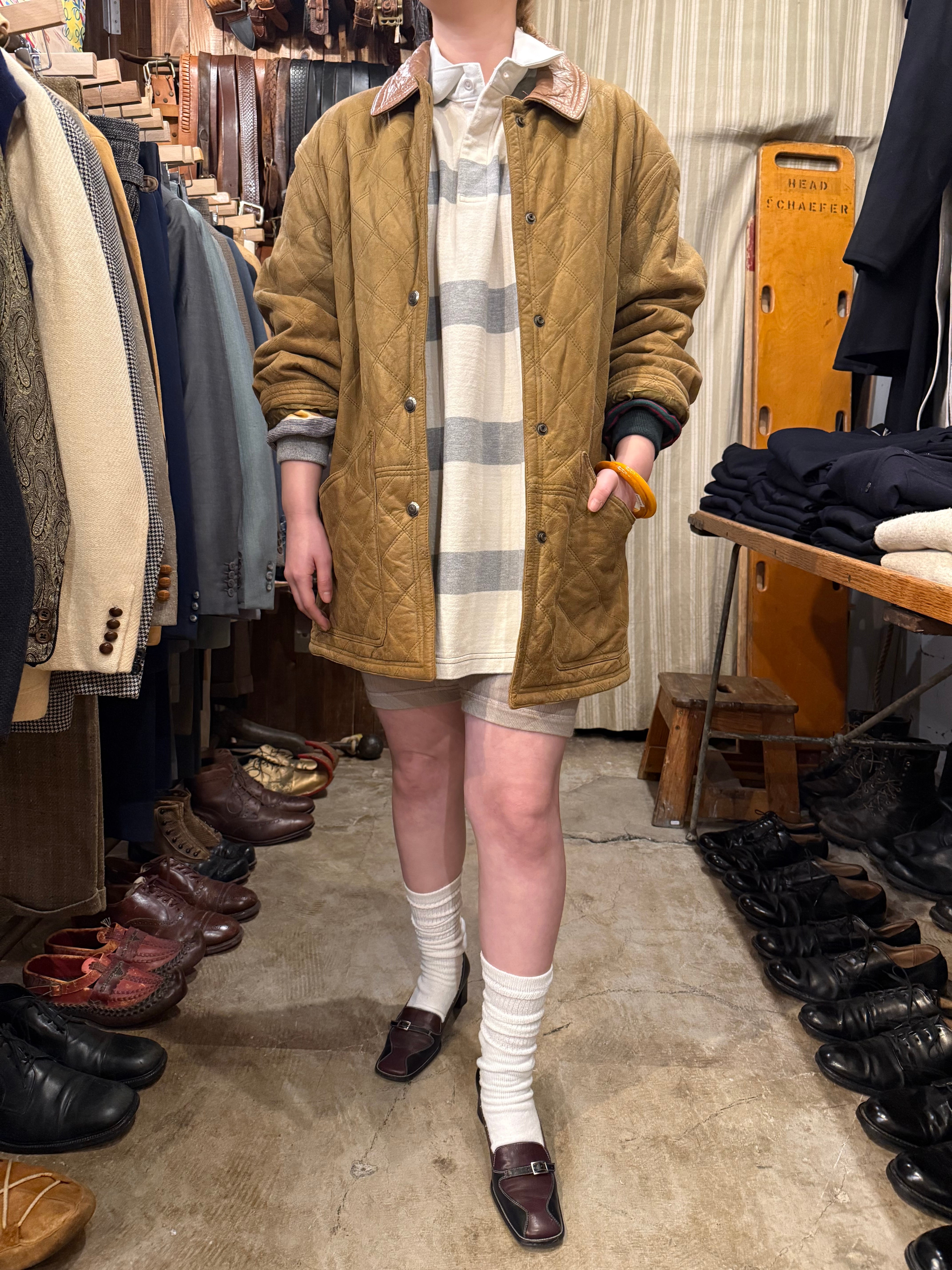 レザーのキルティングジャケットでございます。キャメルのようなカラーが可愛らしく、切り返しでレザーになっている襟もポイントです。レザーですが全体的に軽めで、ややオーバーサイズなので大きめに可愛く着こなす事が出来ます。