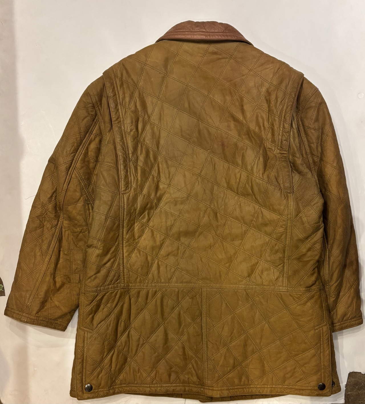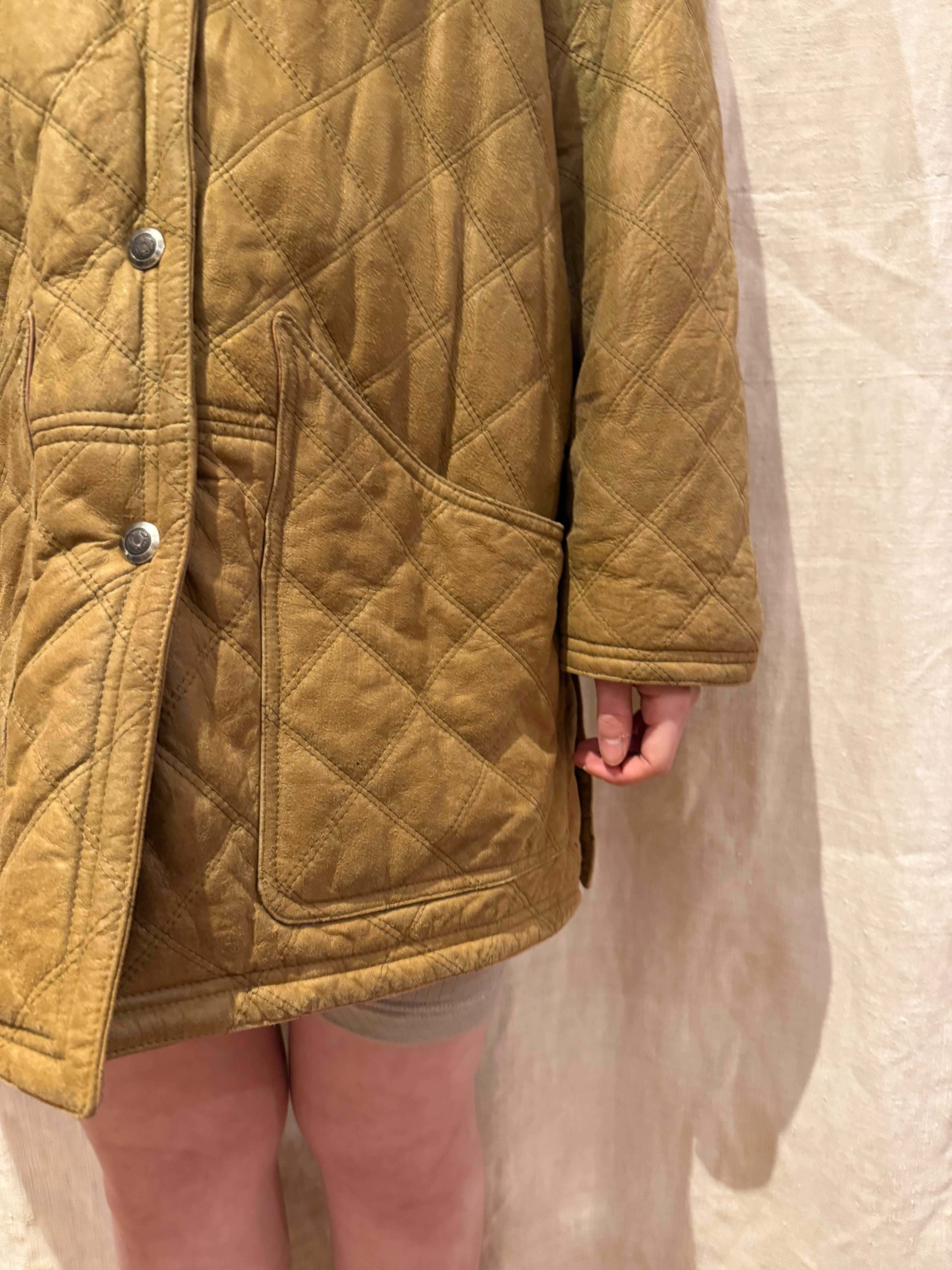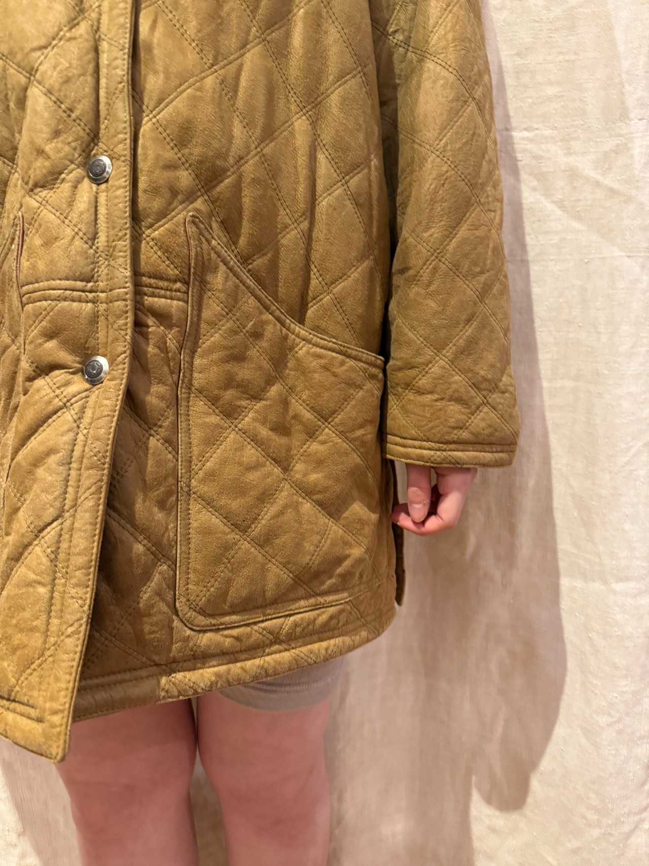 レザーのキルティングジャケットでございます。キャメルのようなカラーが可愛らしく、切り返しでレザーになっている襟もポイントです。レザーですが全体的に軽めで、ややオーバーサイズなので大きめに可愛く着こなす事が出来ます。