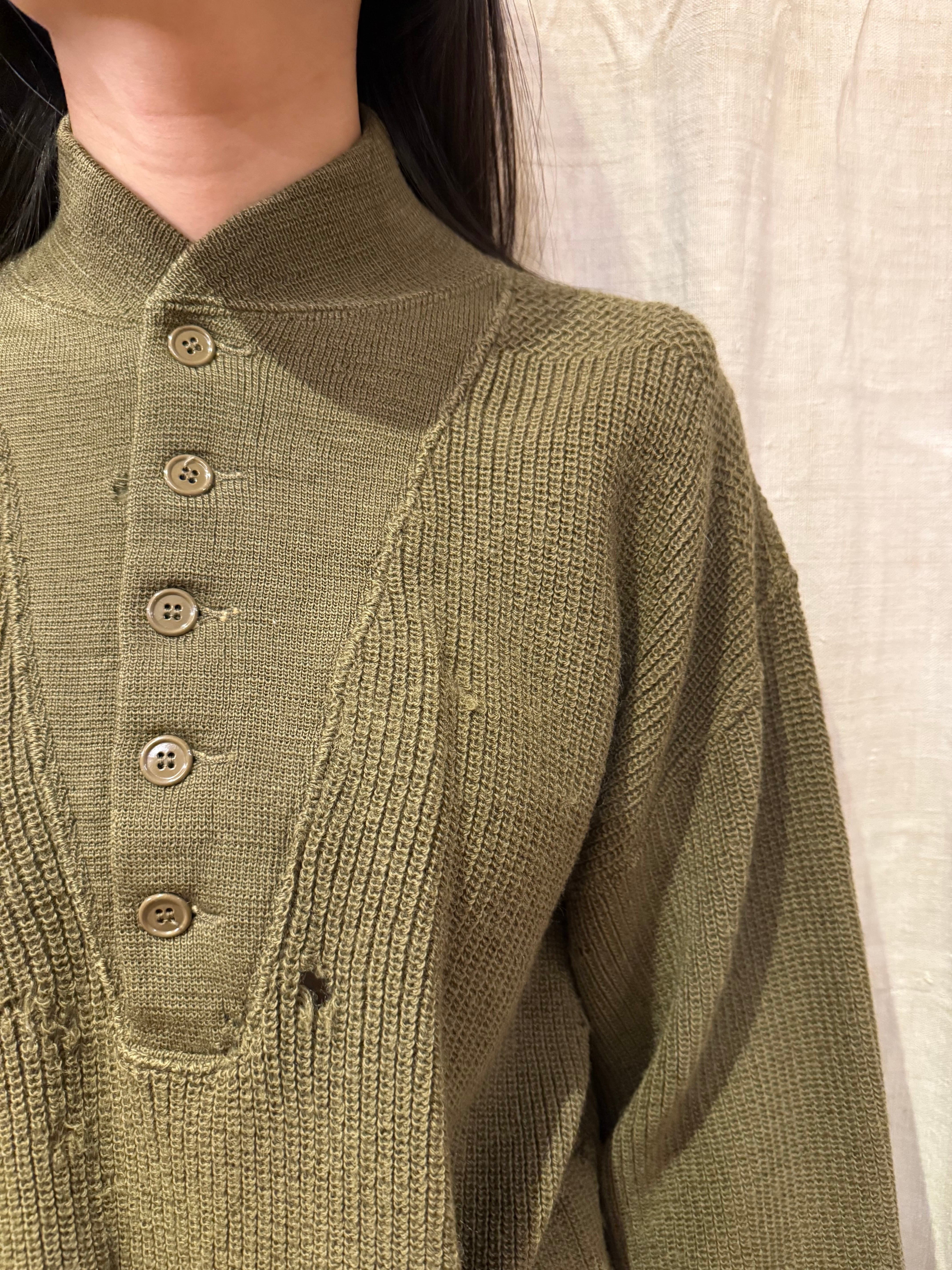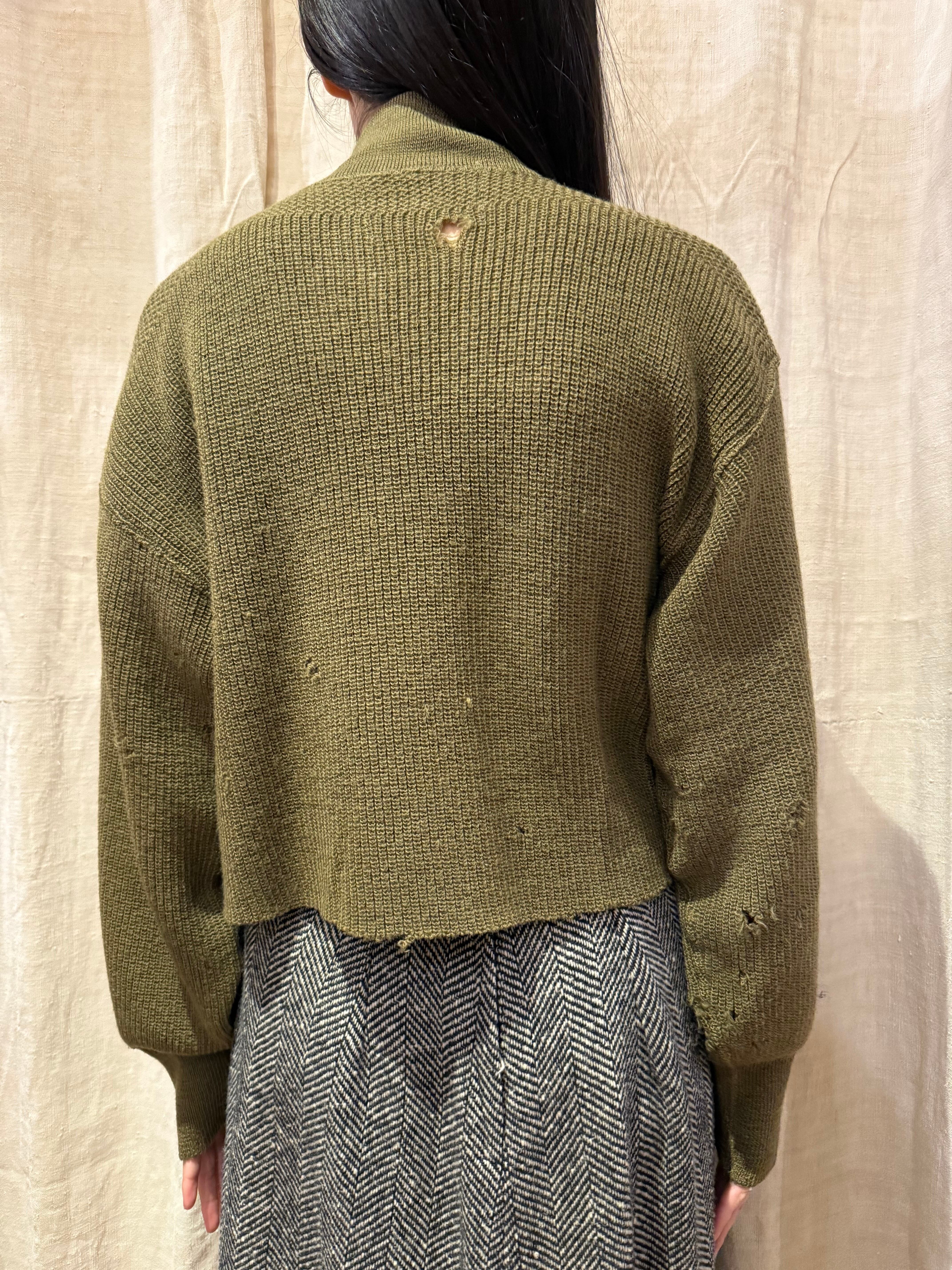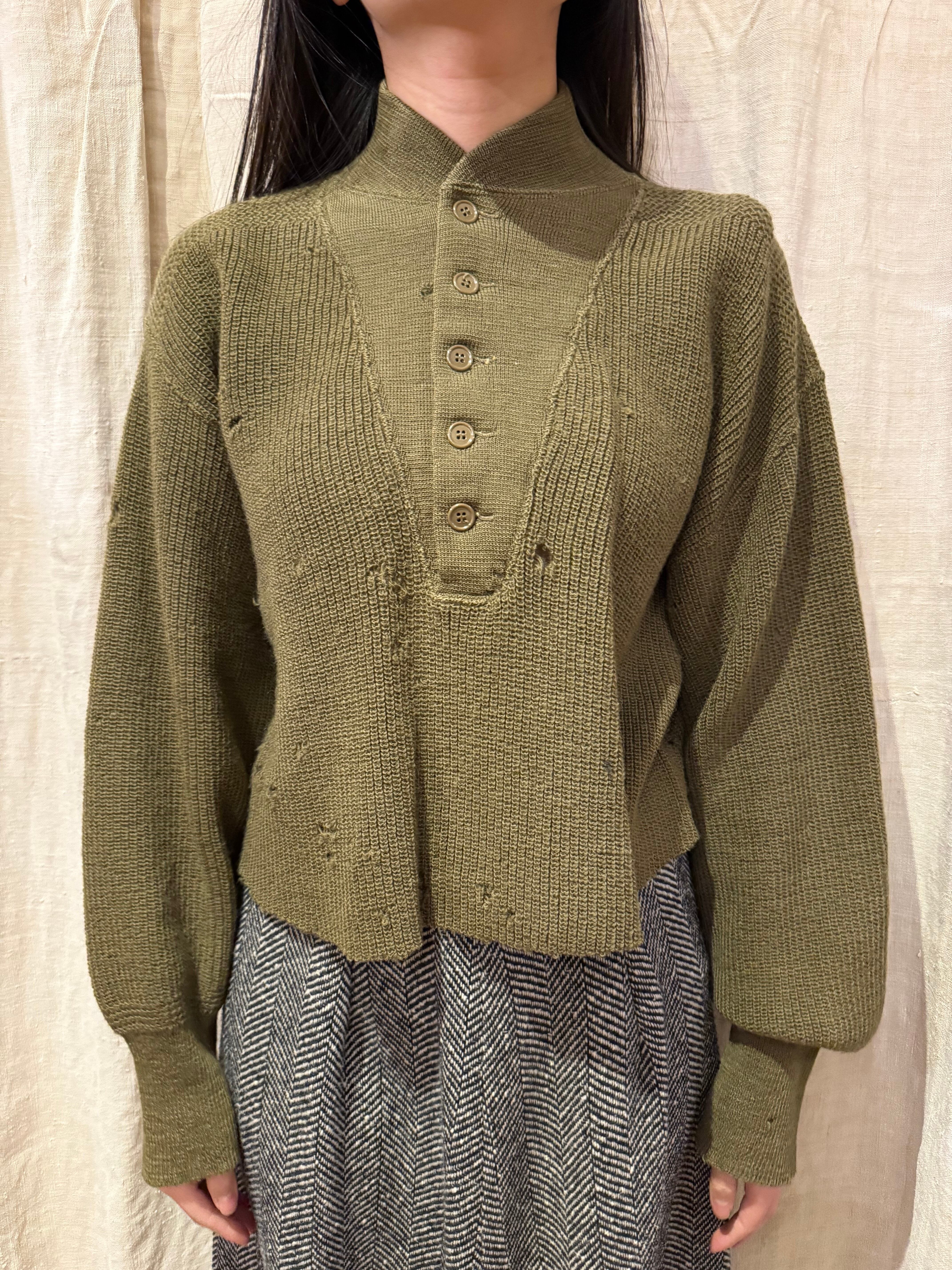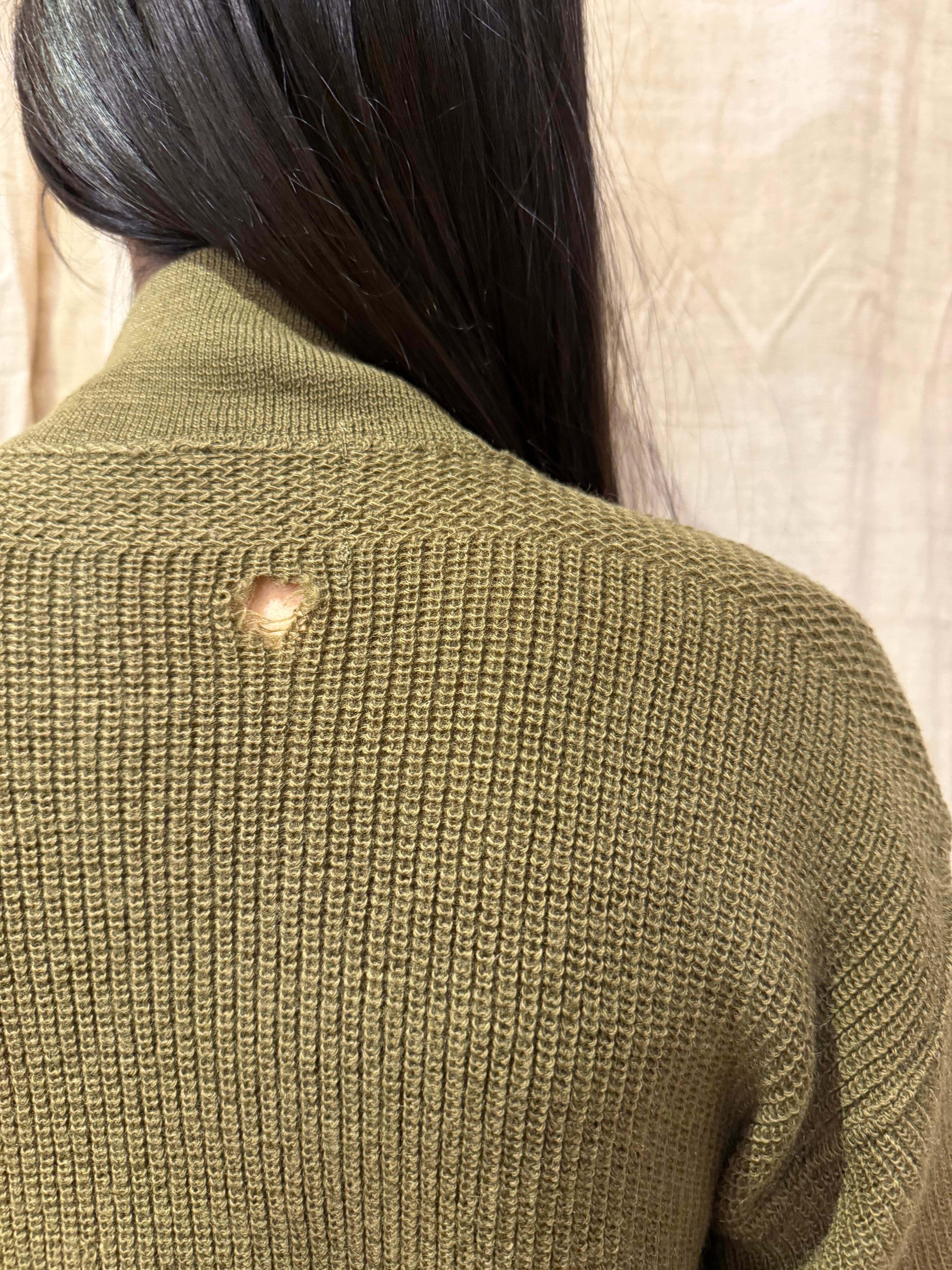 全体的に穴のダメージがあり、雰囲気があります。柔らかい肌触りで一枚で着用して頂けます。ゆったりとしたスリーブにクロップド丈で今っぽいシルエットです。着用写真のようにロング丈のスカートと合わせた女性らしいスタイリングも素敵です。