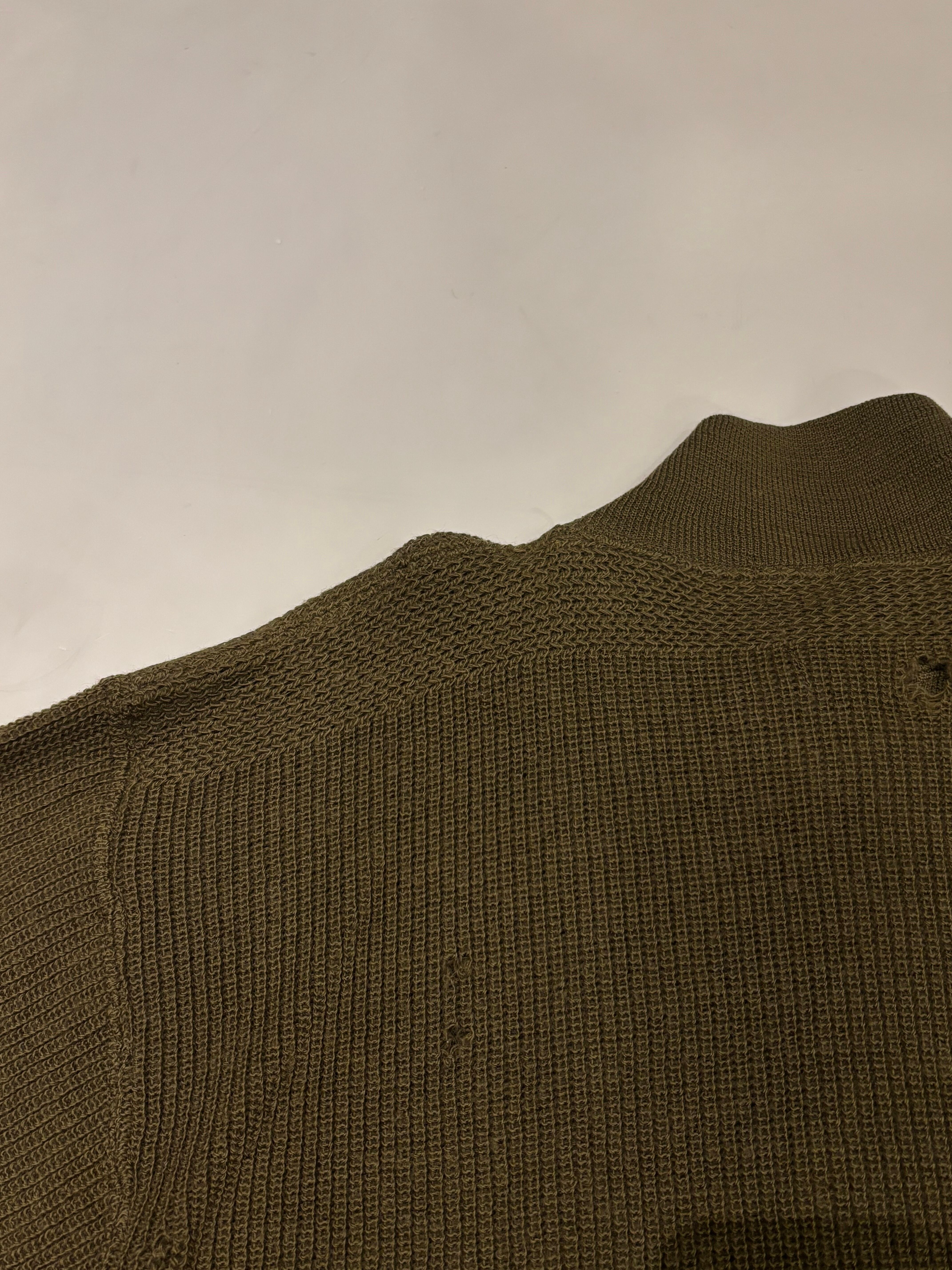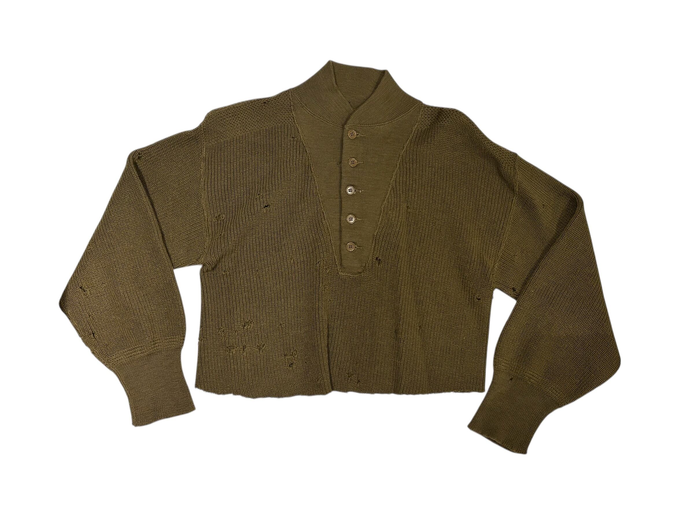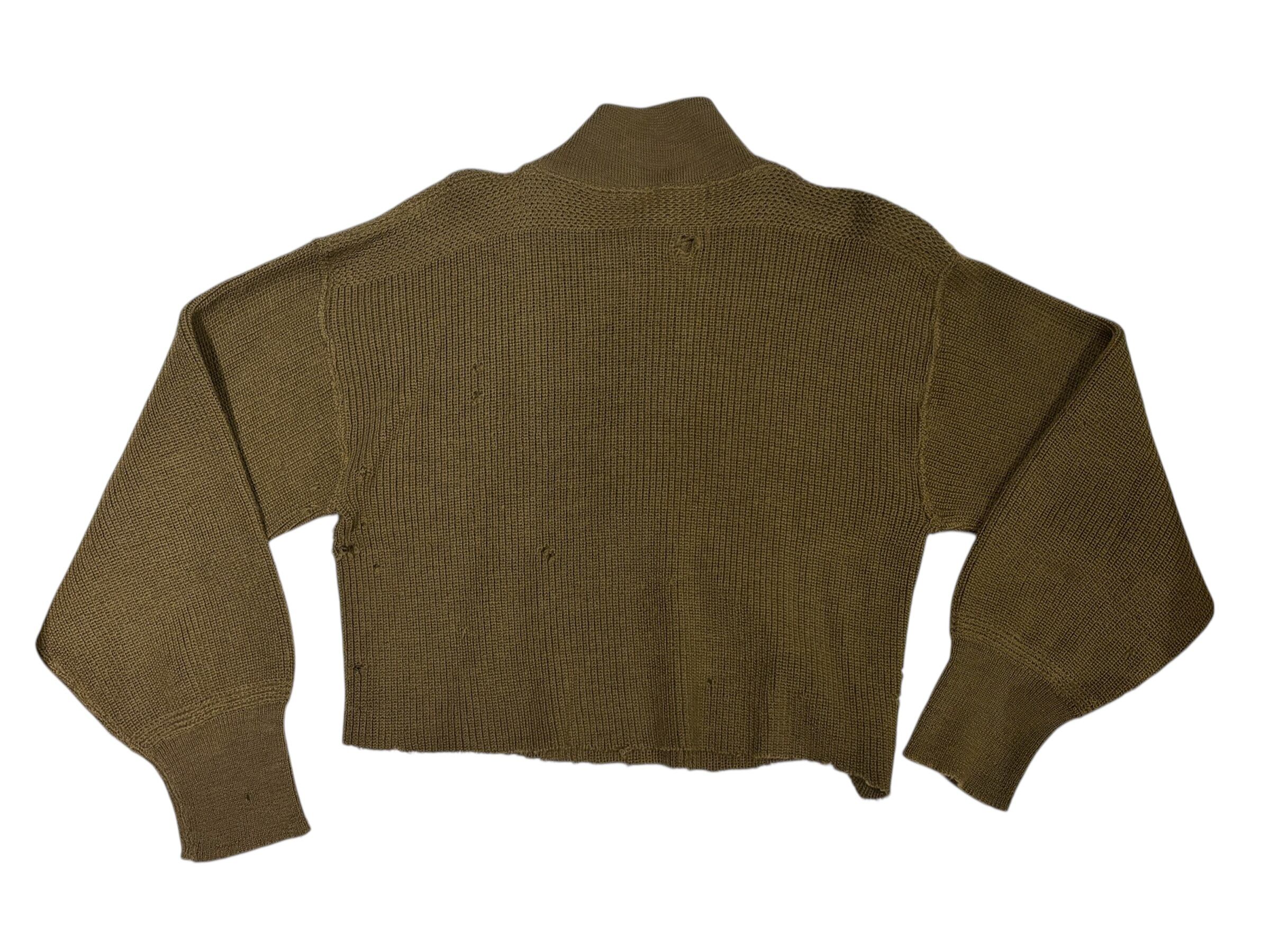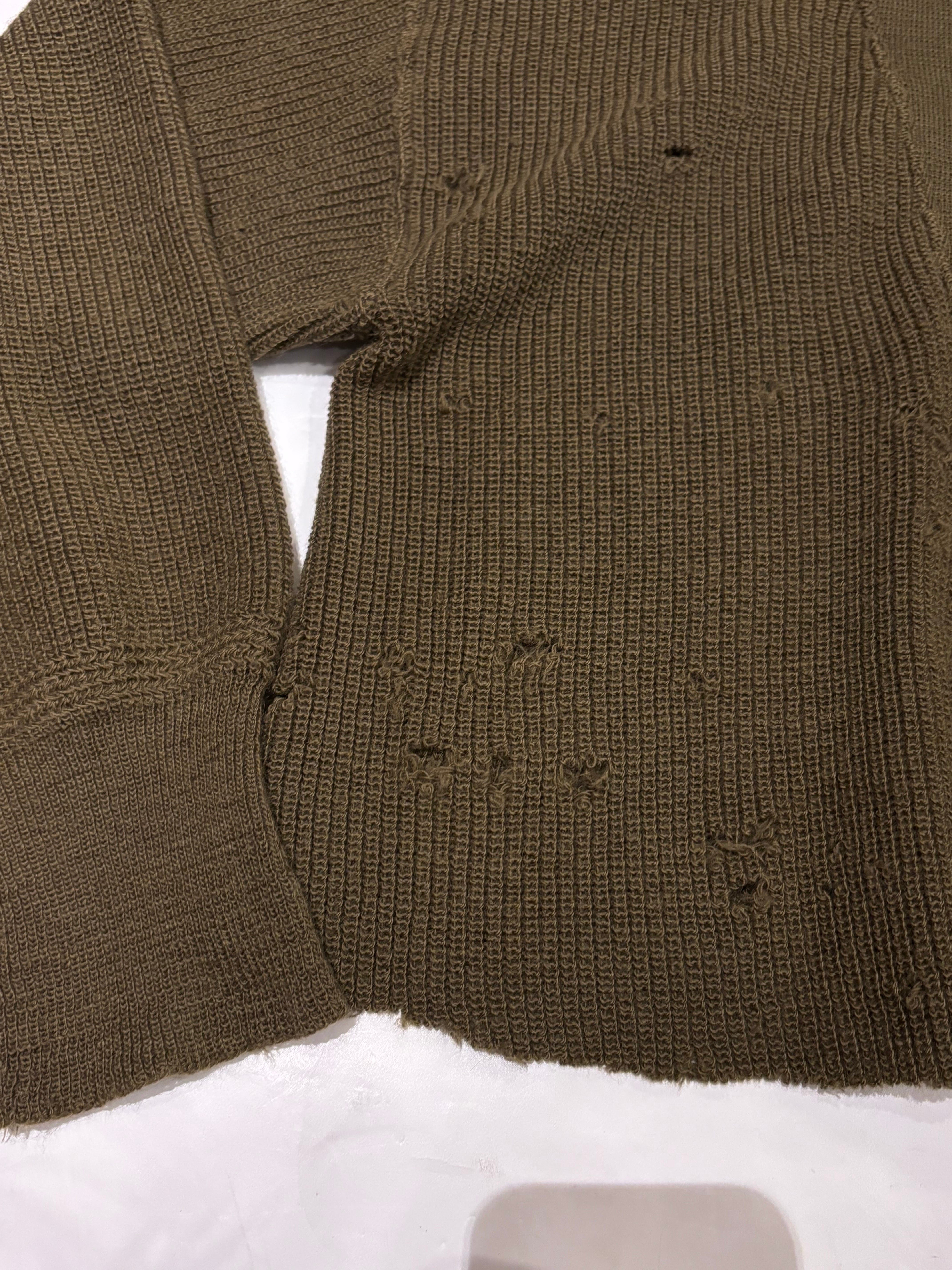 全体的に穴のダメージがあり、雰囲気があります。柔らかい肌触りで一枚で着用して頂けます。ゆったりとしたスリーブにクロップド丈で今っぽいシルエットです。着用写真のようにロング丈のスカートと合わせた女性らしいスタイリングも素敵です。