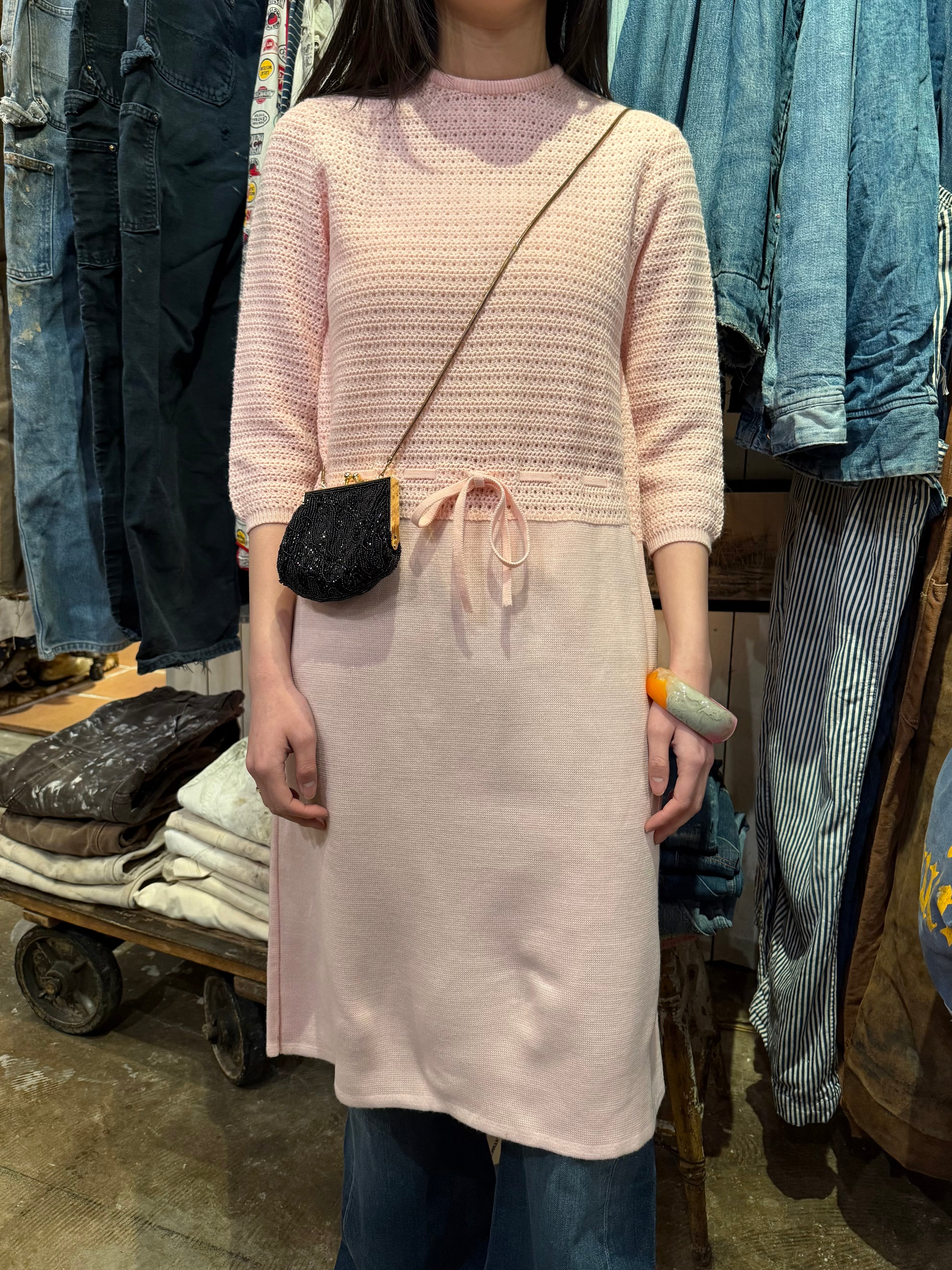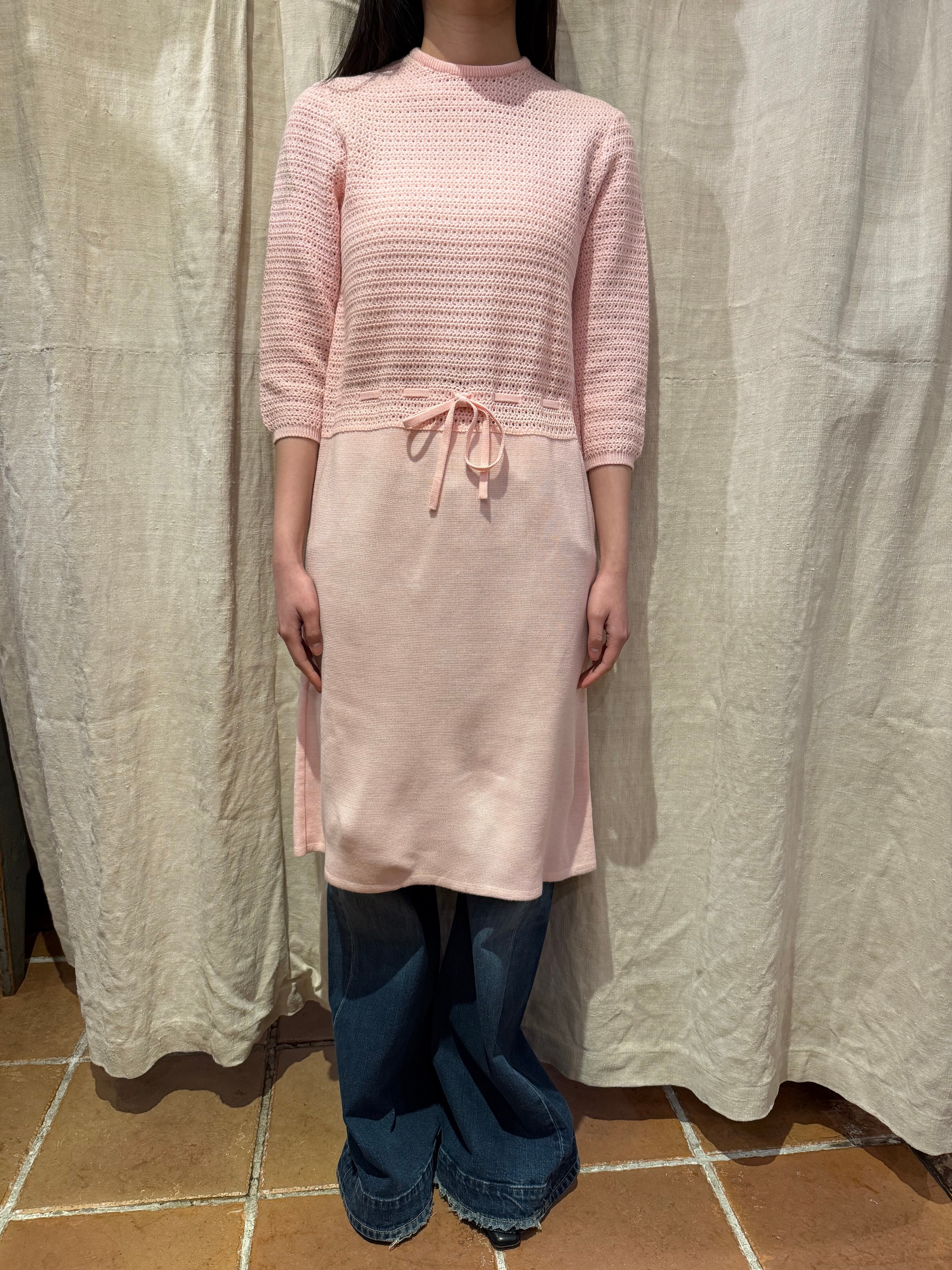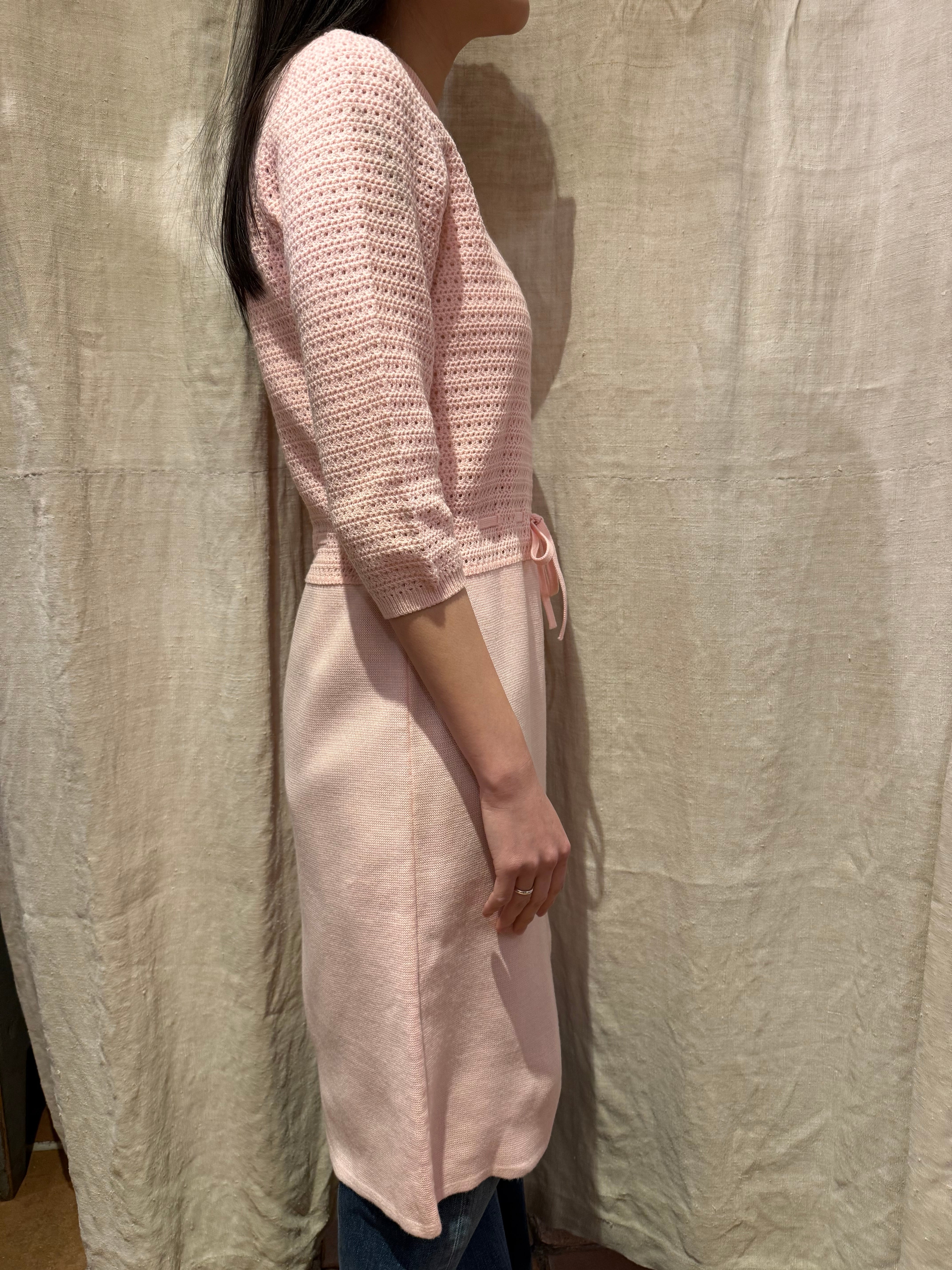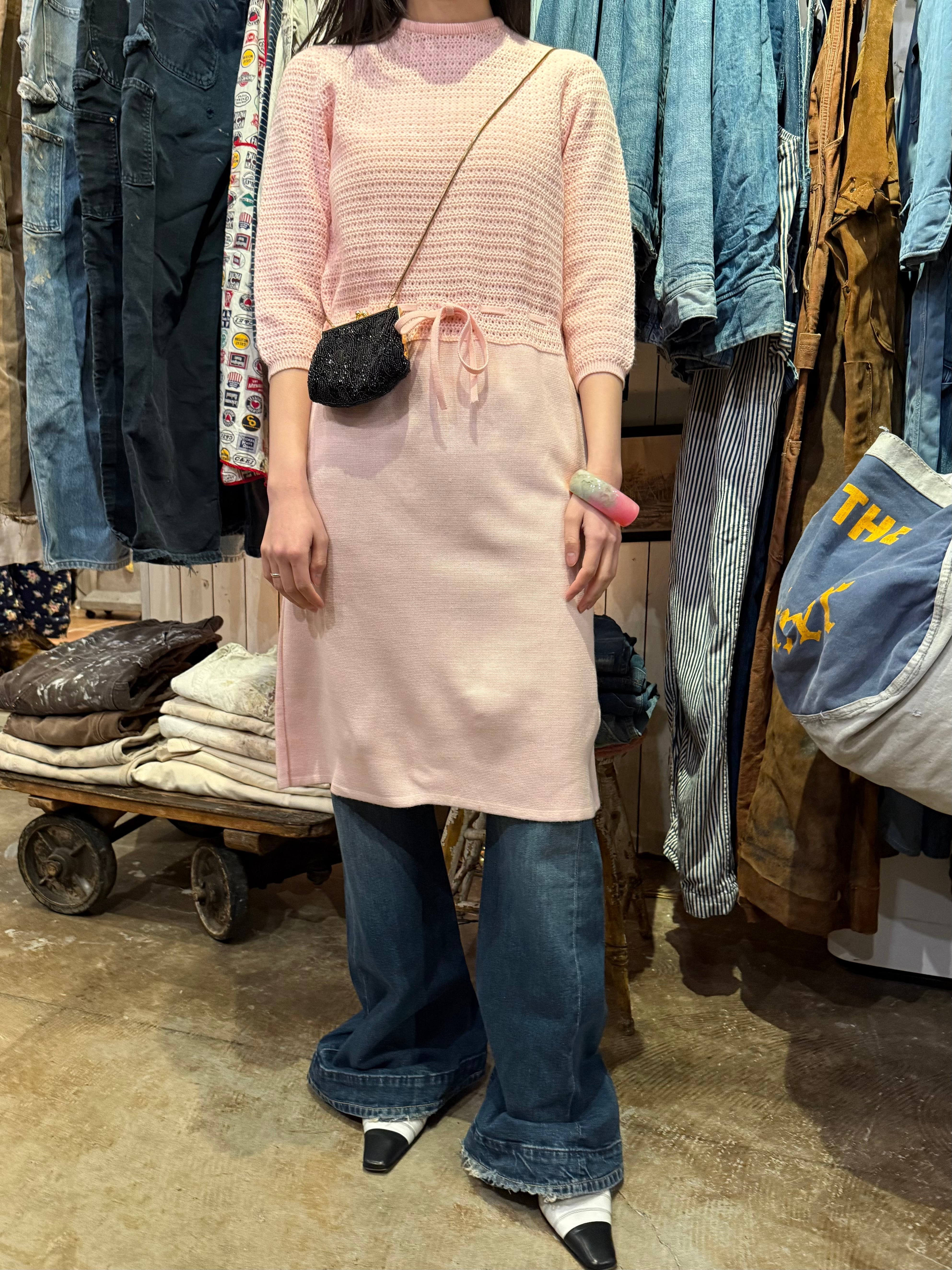 ニットドレスでございます。甘めのピンクのカラーがとても可愛らしいです。上半身のみ模様が入っていてスカートの部分はフラットになっております。ウエストマークのできる仕様でスタイルによってシルエットを変えるのがおすすめです。