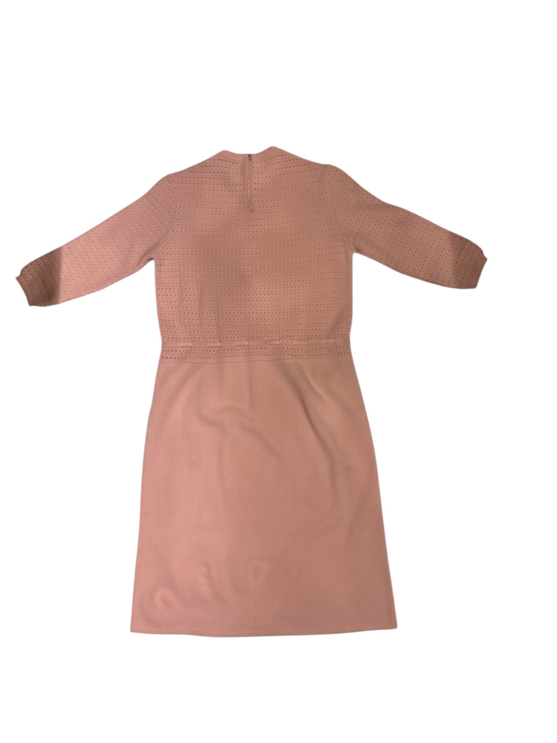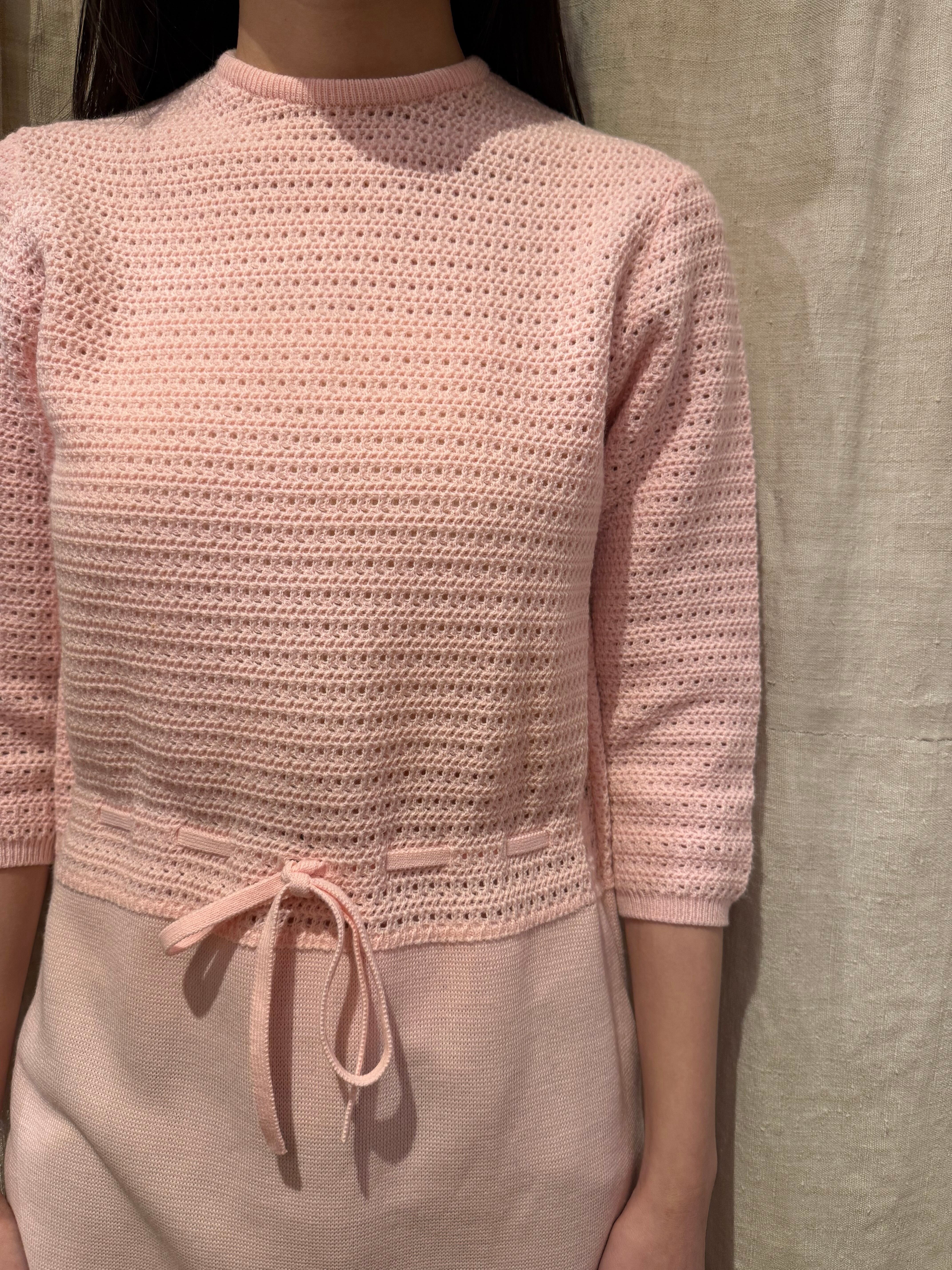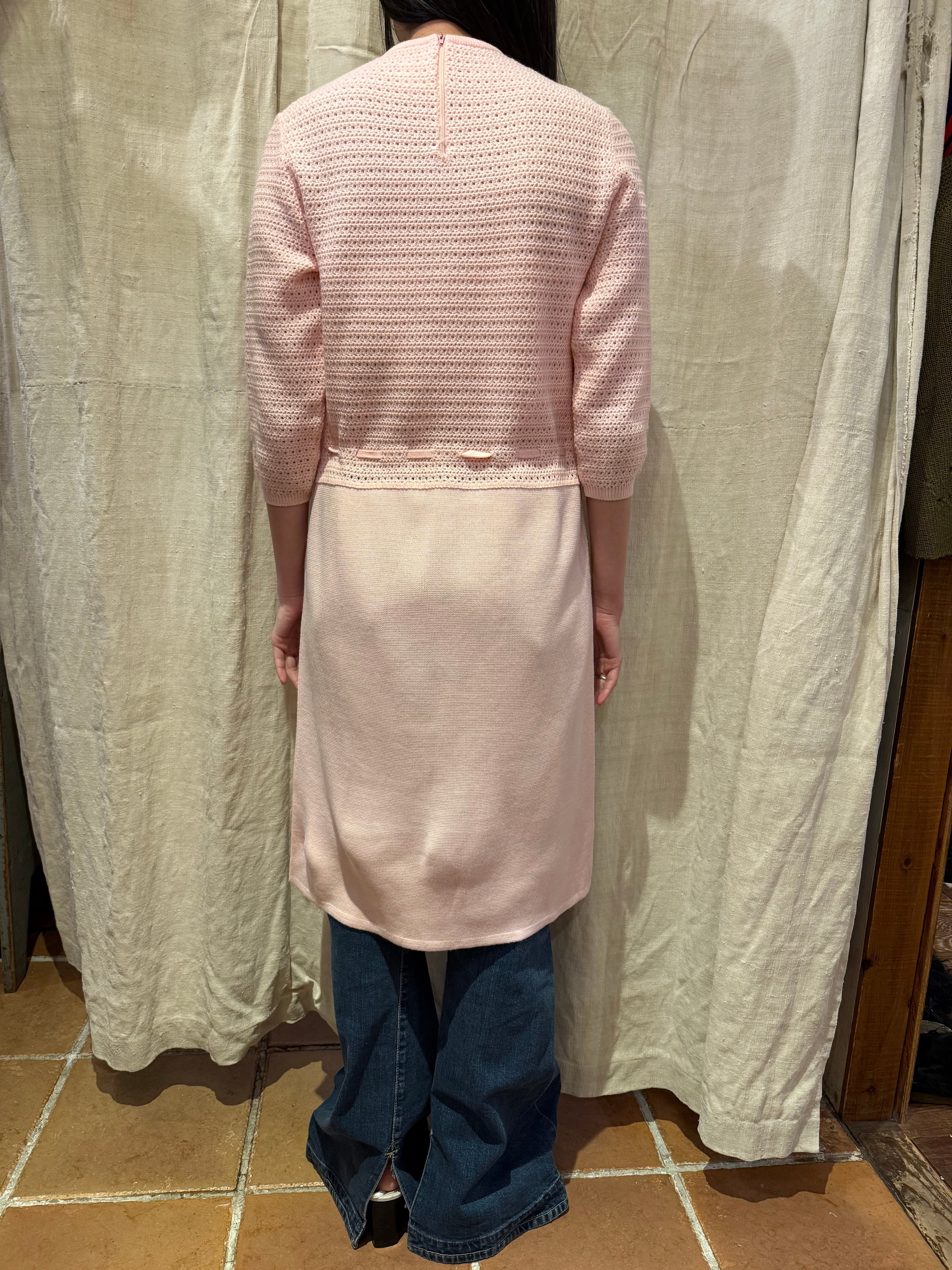 ニットドレスでございます。甘めのピンクのカラーがとても可愛らしいです。上半身のみ模様が入っていてスカートの部分はフラットになっております。ウエストマークのできる仕様でスタイルによってシルエットを変えるのがおすすめです。