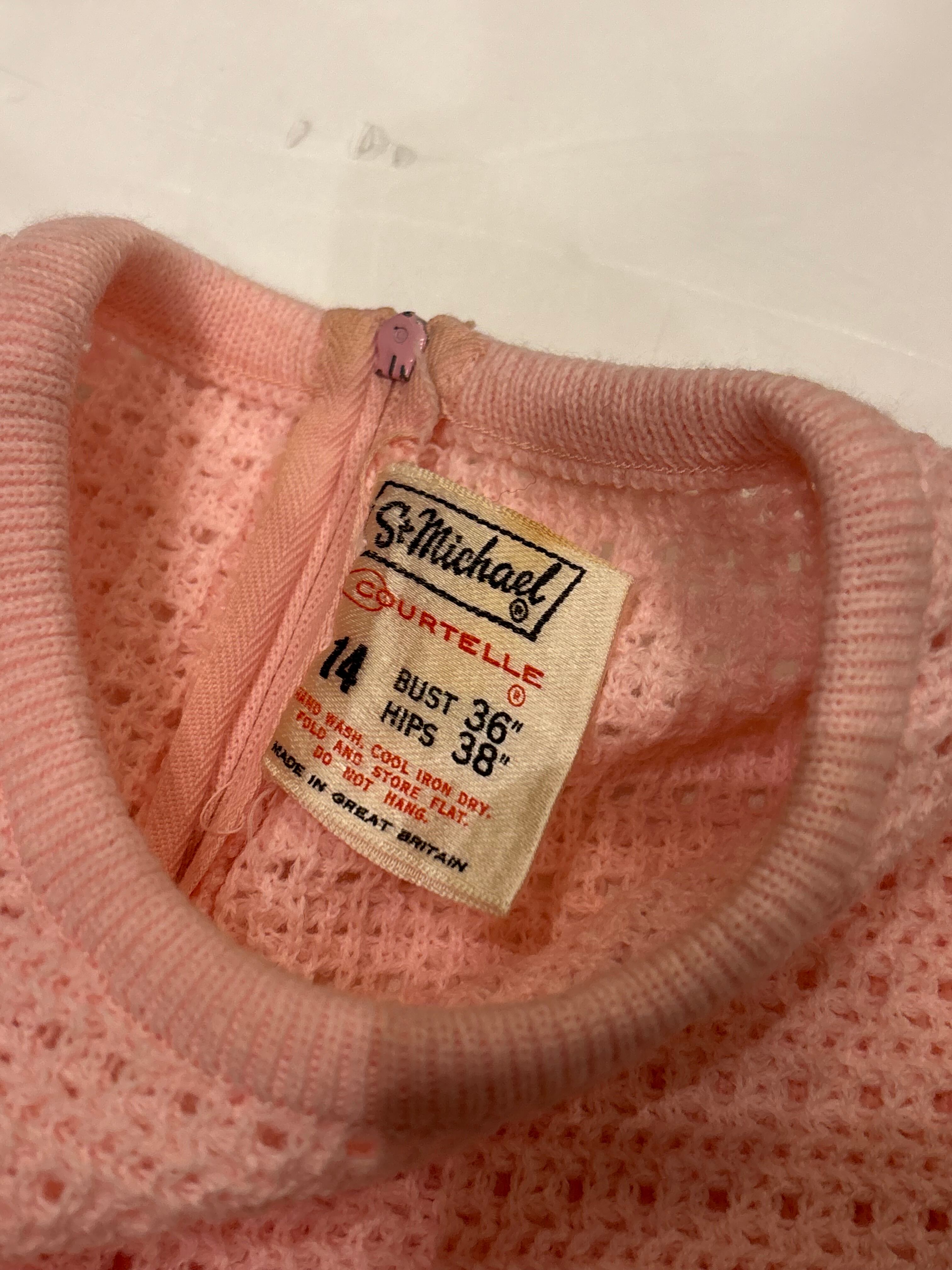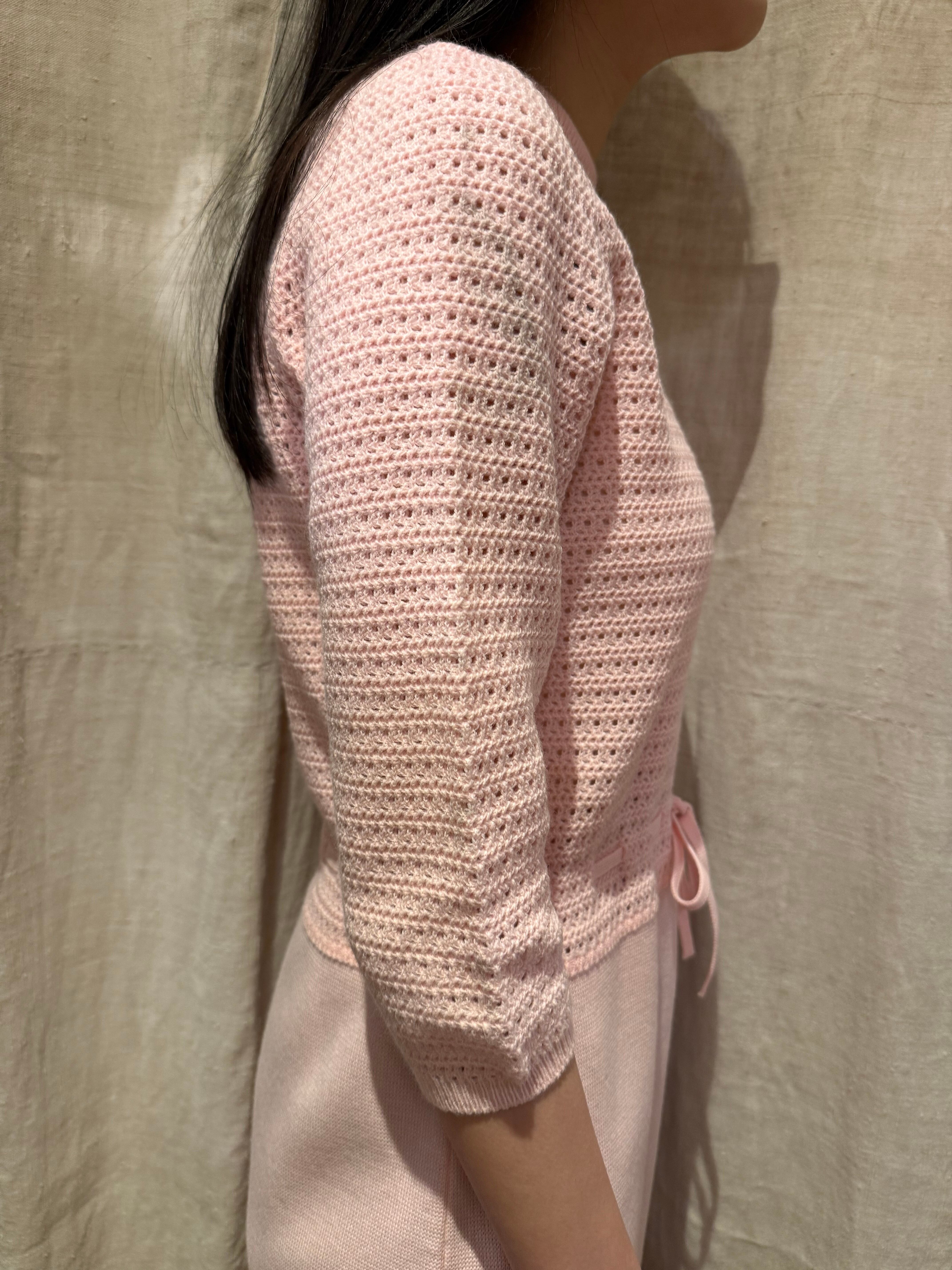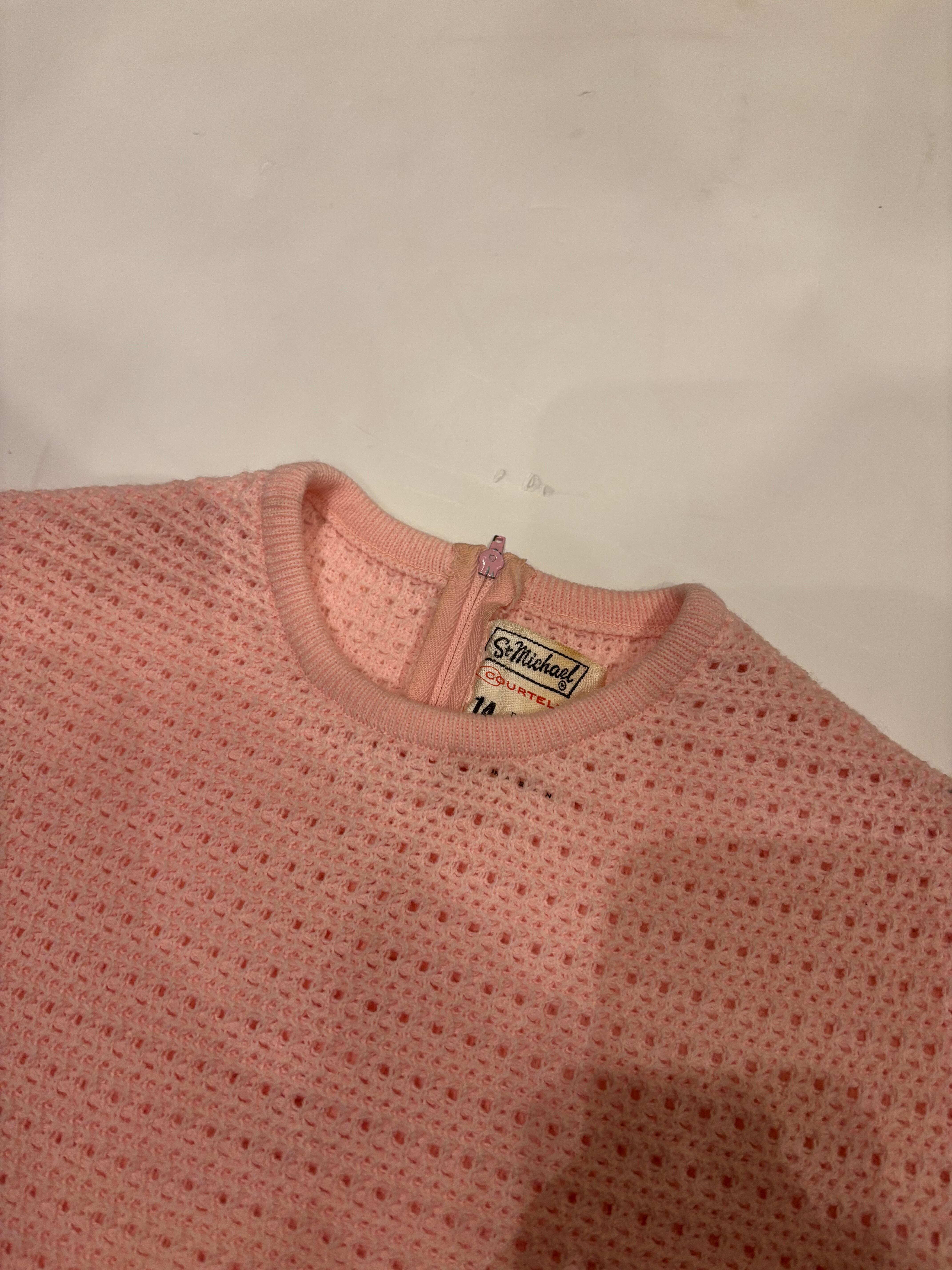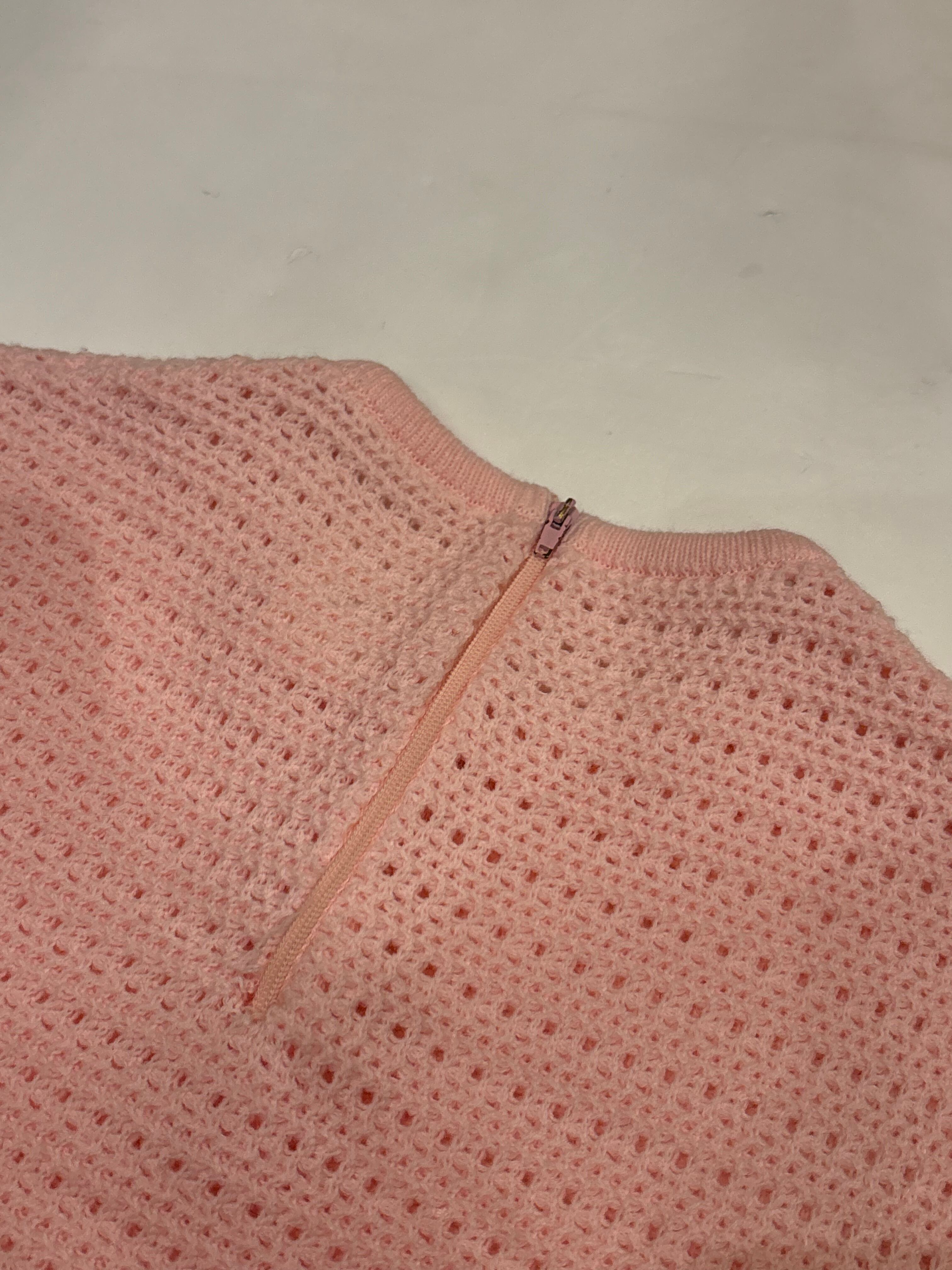 ニットドレスでございます。甘めのピンクのカラーがとても可愛らしいです。上半身のみ模様が入っていてスカートの部分はフラットになっております。ウエストマークのできる仕様でスタイルによってシルエットを変えるのがおすすめです。