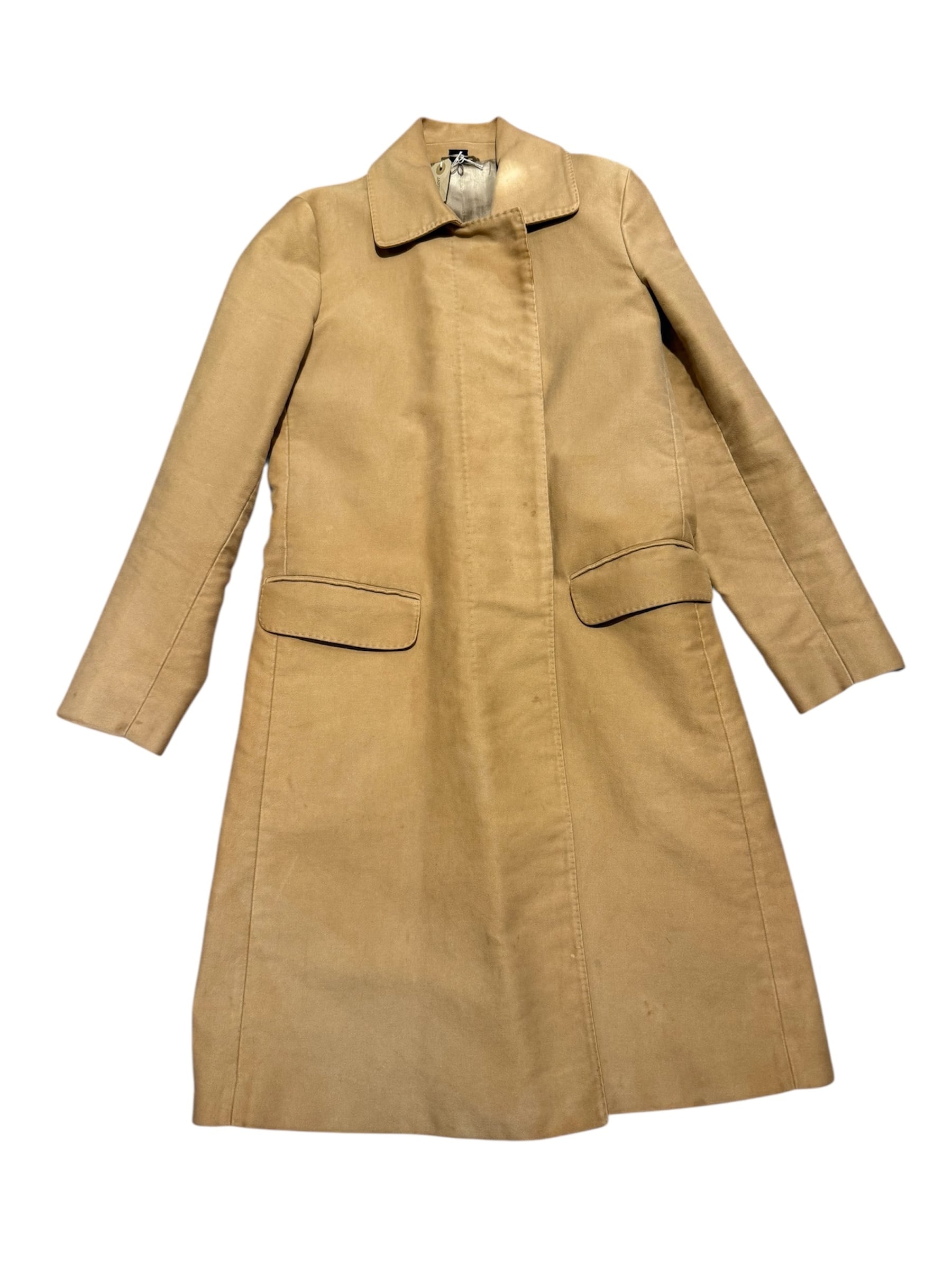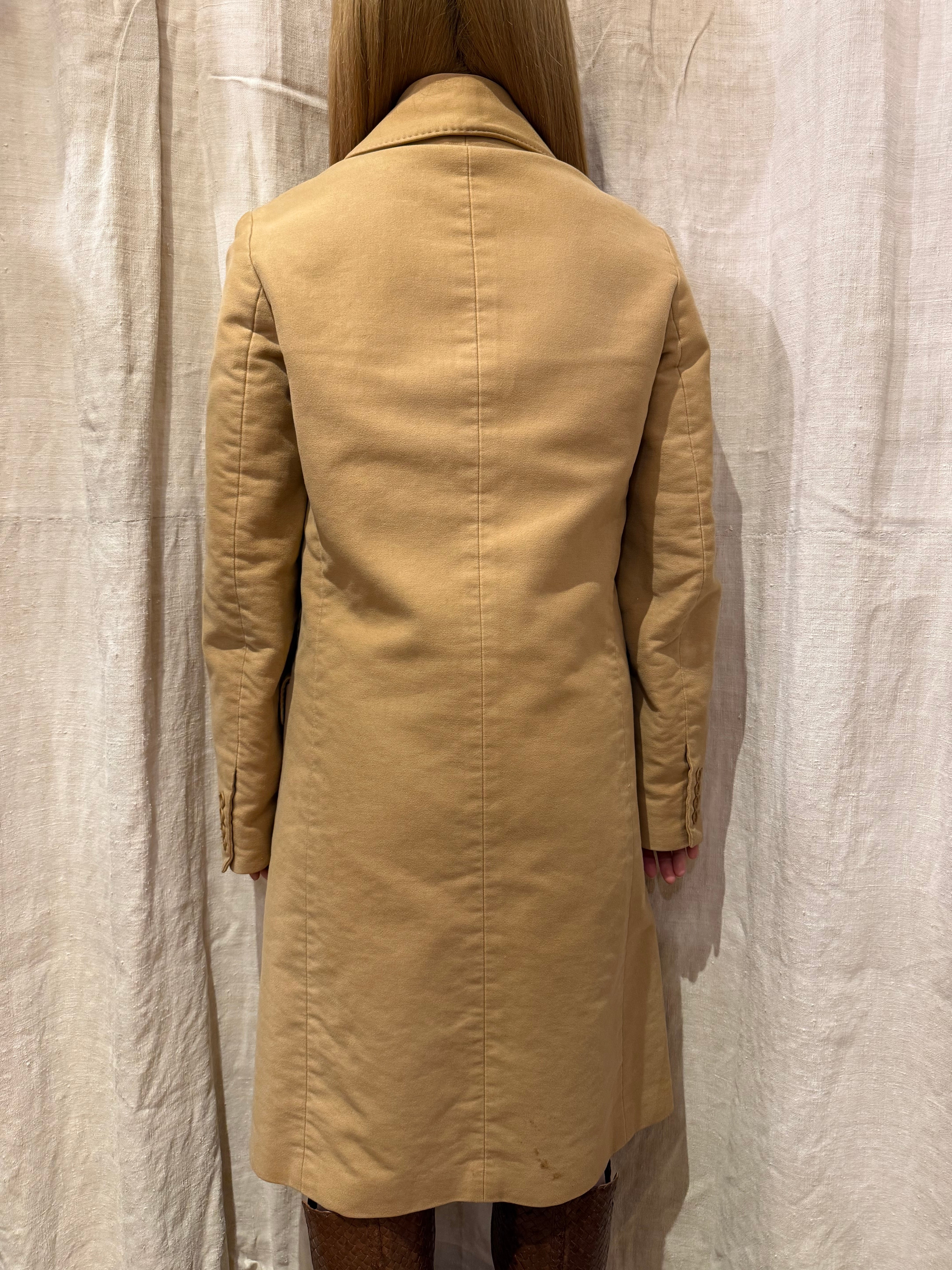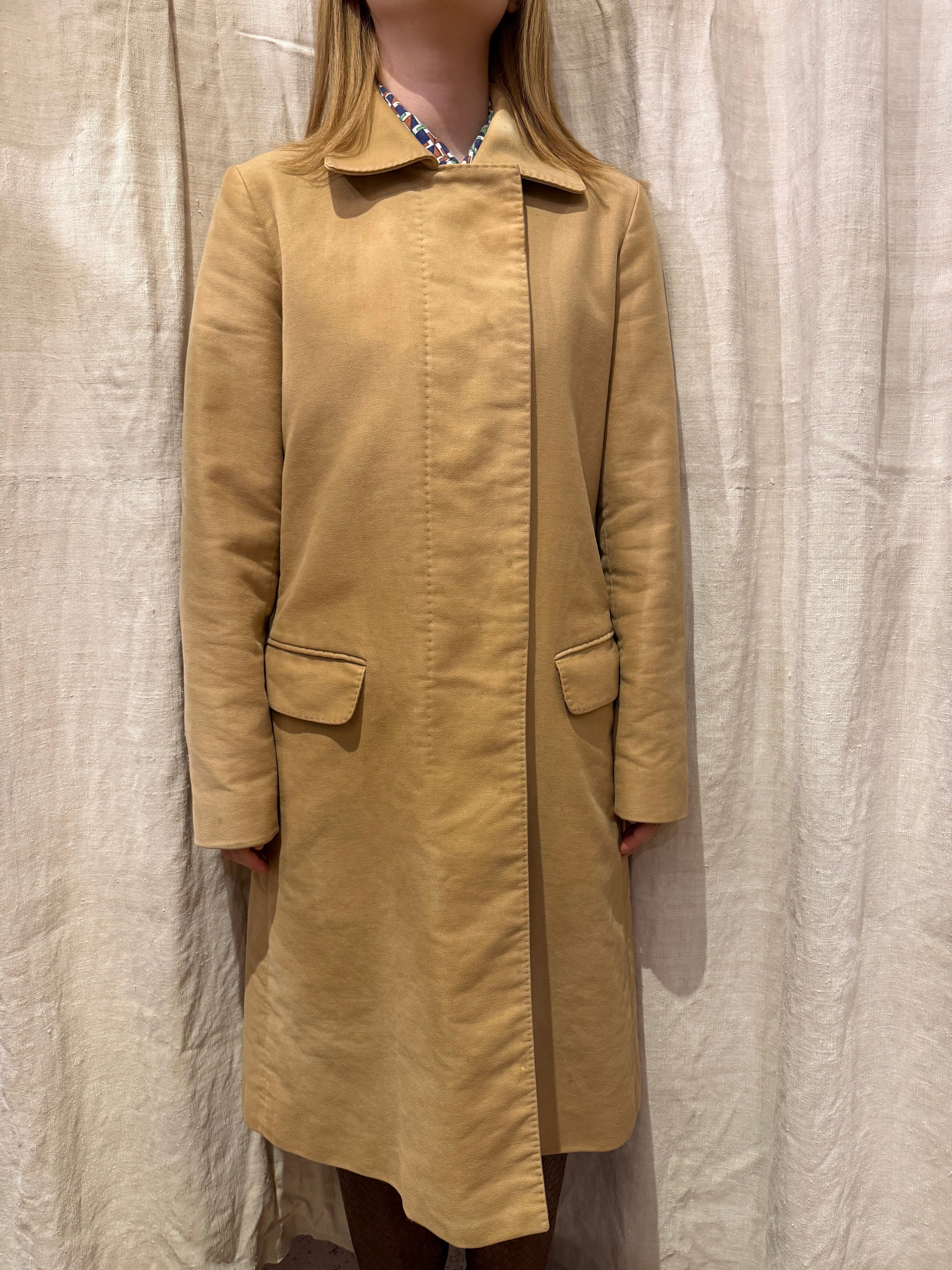 HELMUT LANGのコートです。柔らかなモールスキン素材にベージュカラーが全体の雰囲気を演出してくれます。HELMUT LANGらしいミニマルなデザインで、シンプルなスタイリングがお好きな方にオススメの1着です。