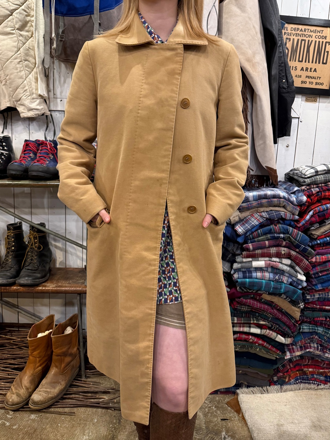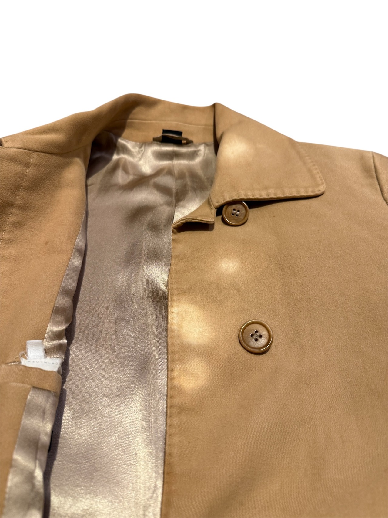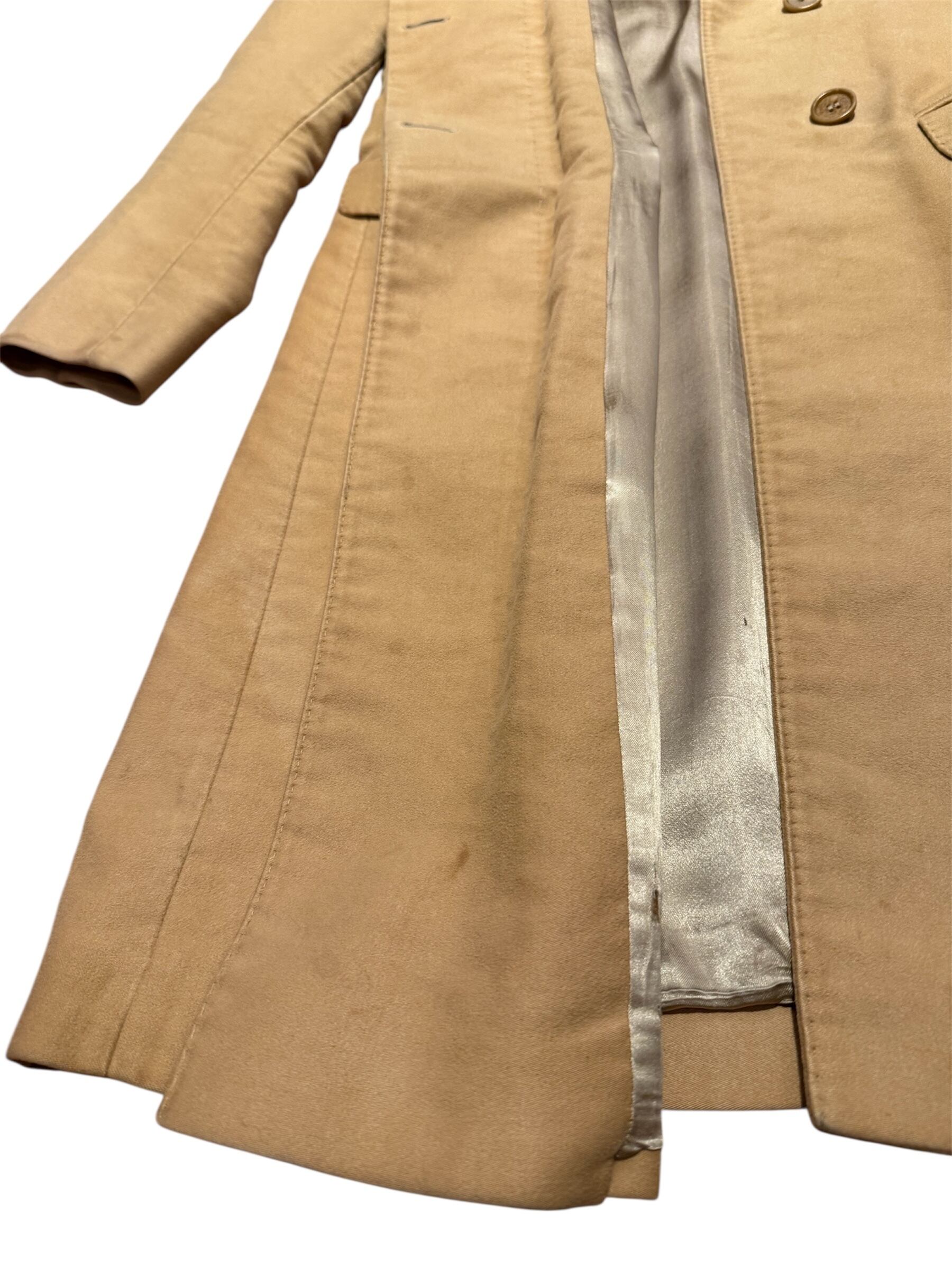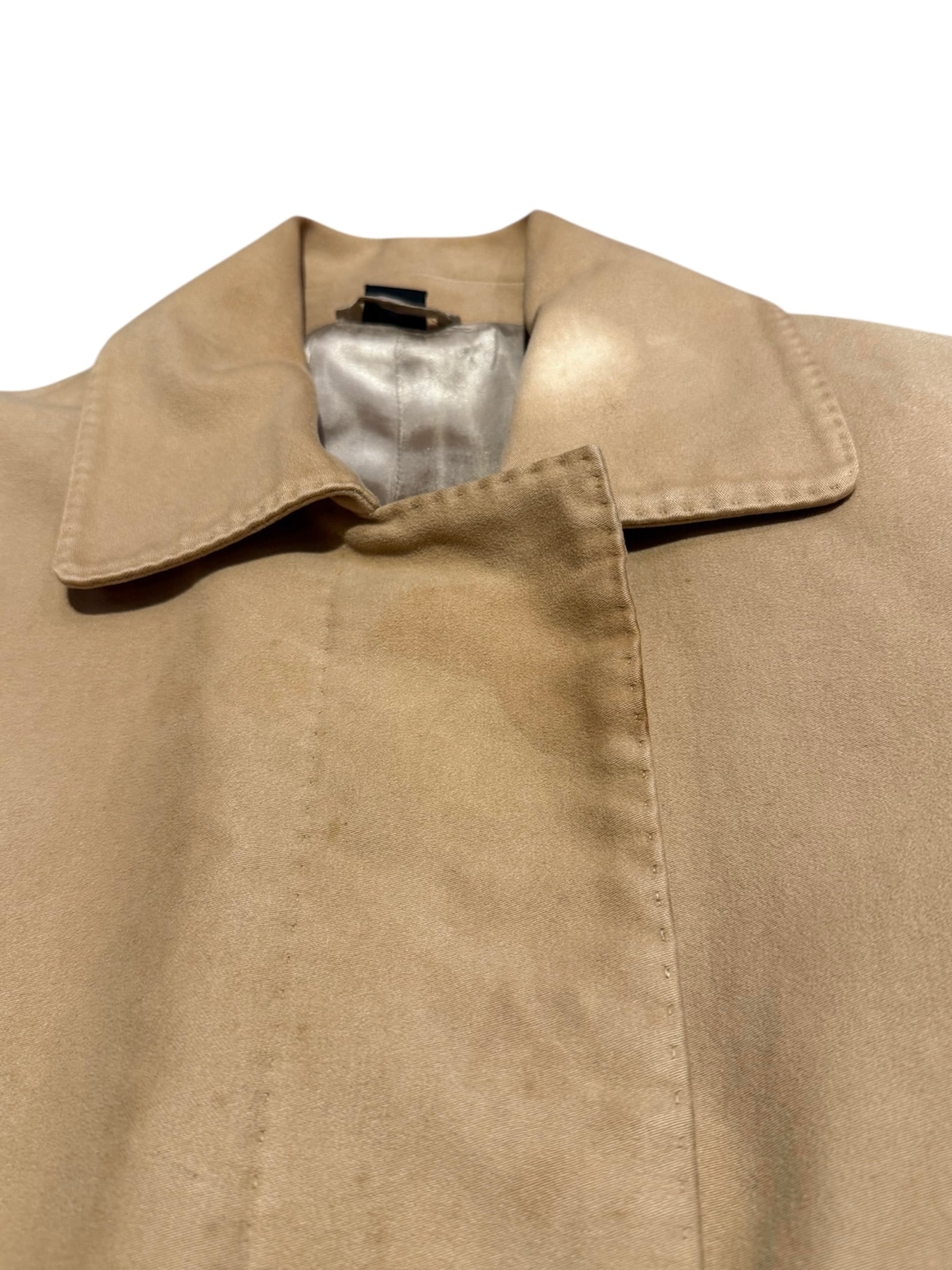 HELMUT LANGのコートです。柔らかなモールスキン素材にベージュカラーが全体の雰囲気を演出してくれます。HELMUT LANGらしいミニマルなデザインで、シンプルなスタイリングがお好きな方にオススメの1着です。