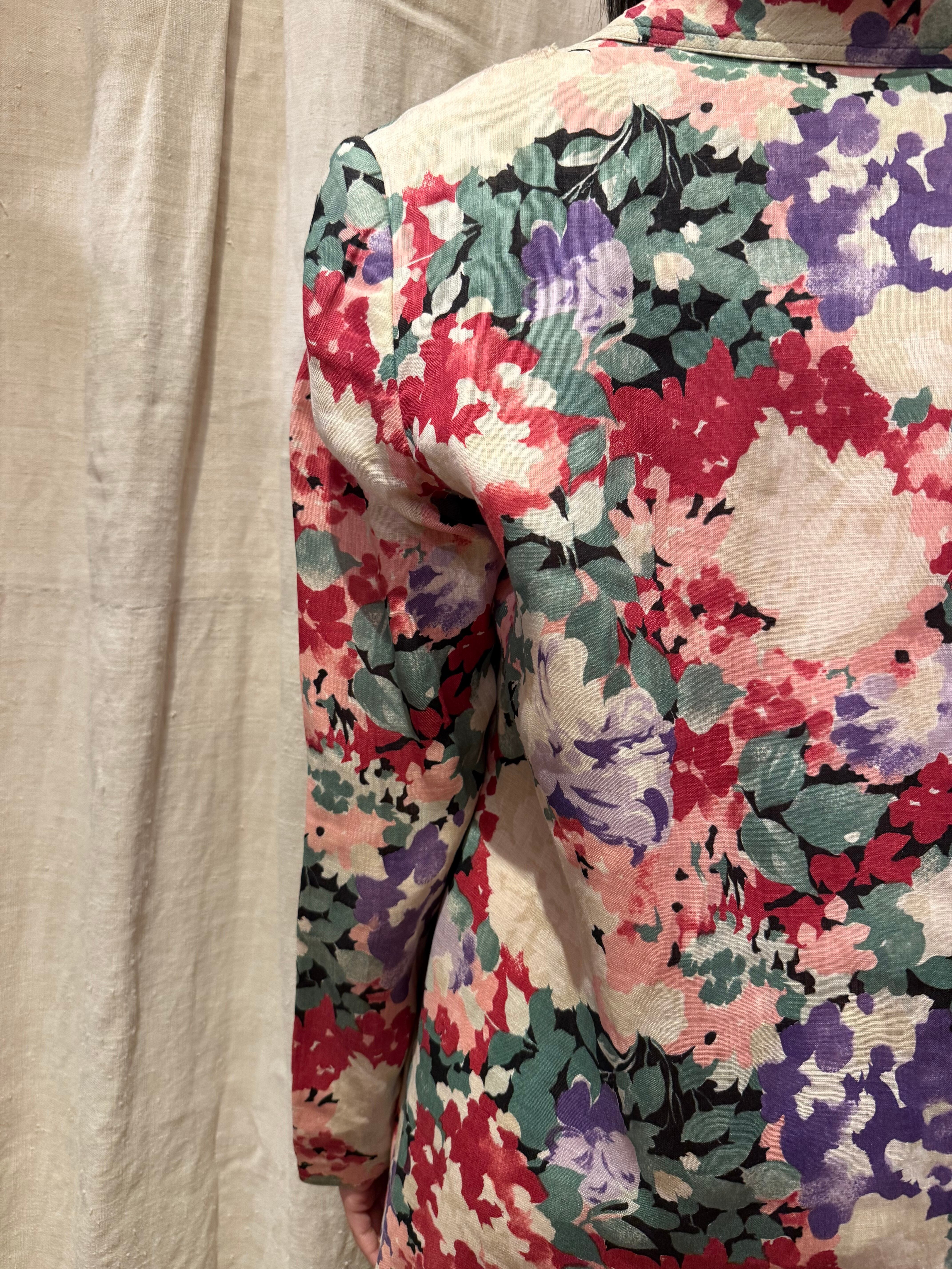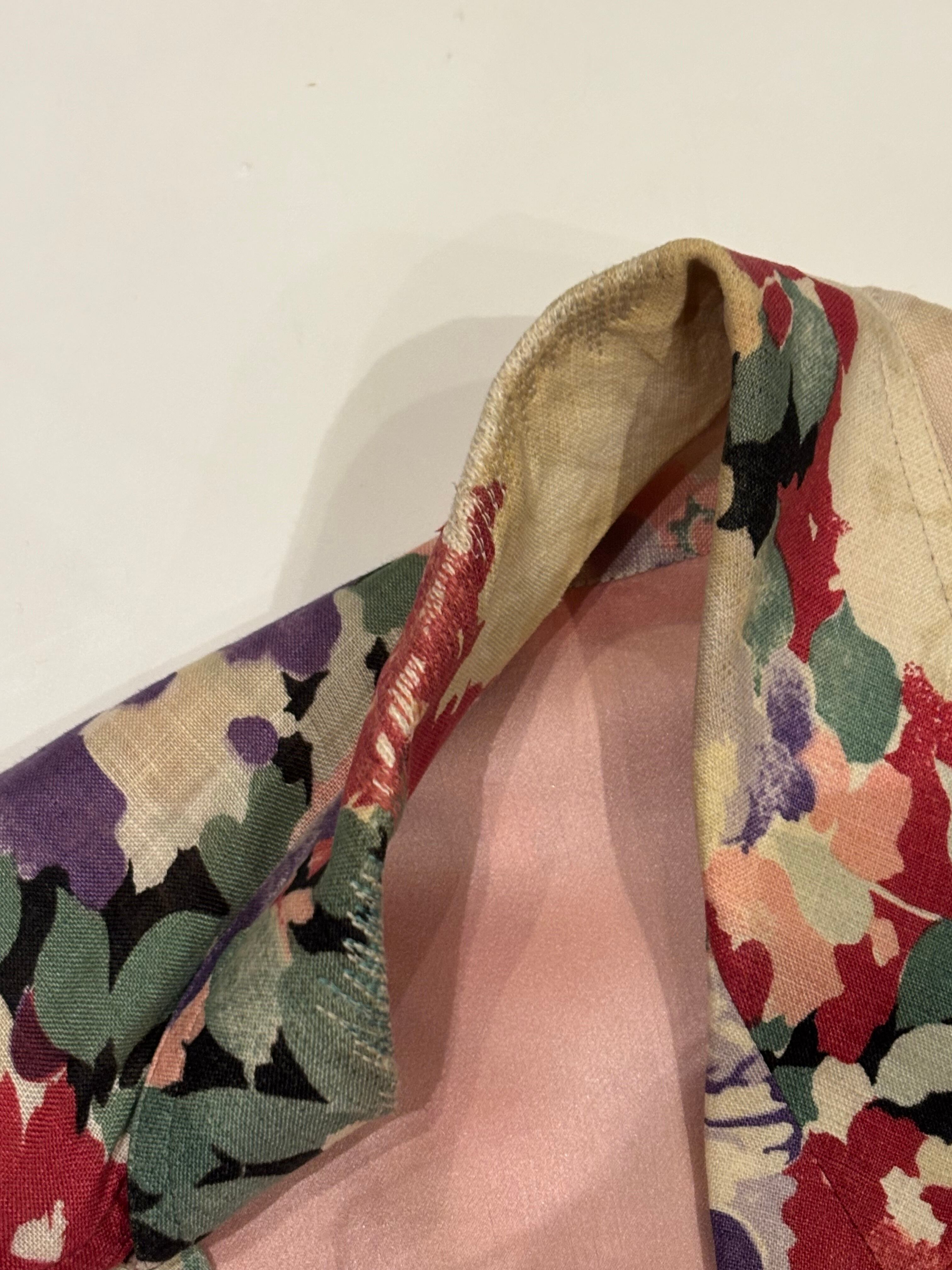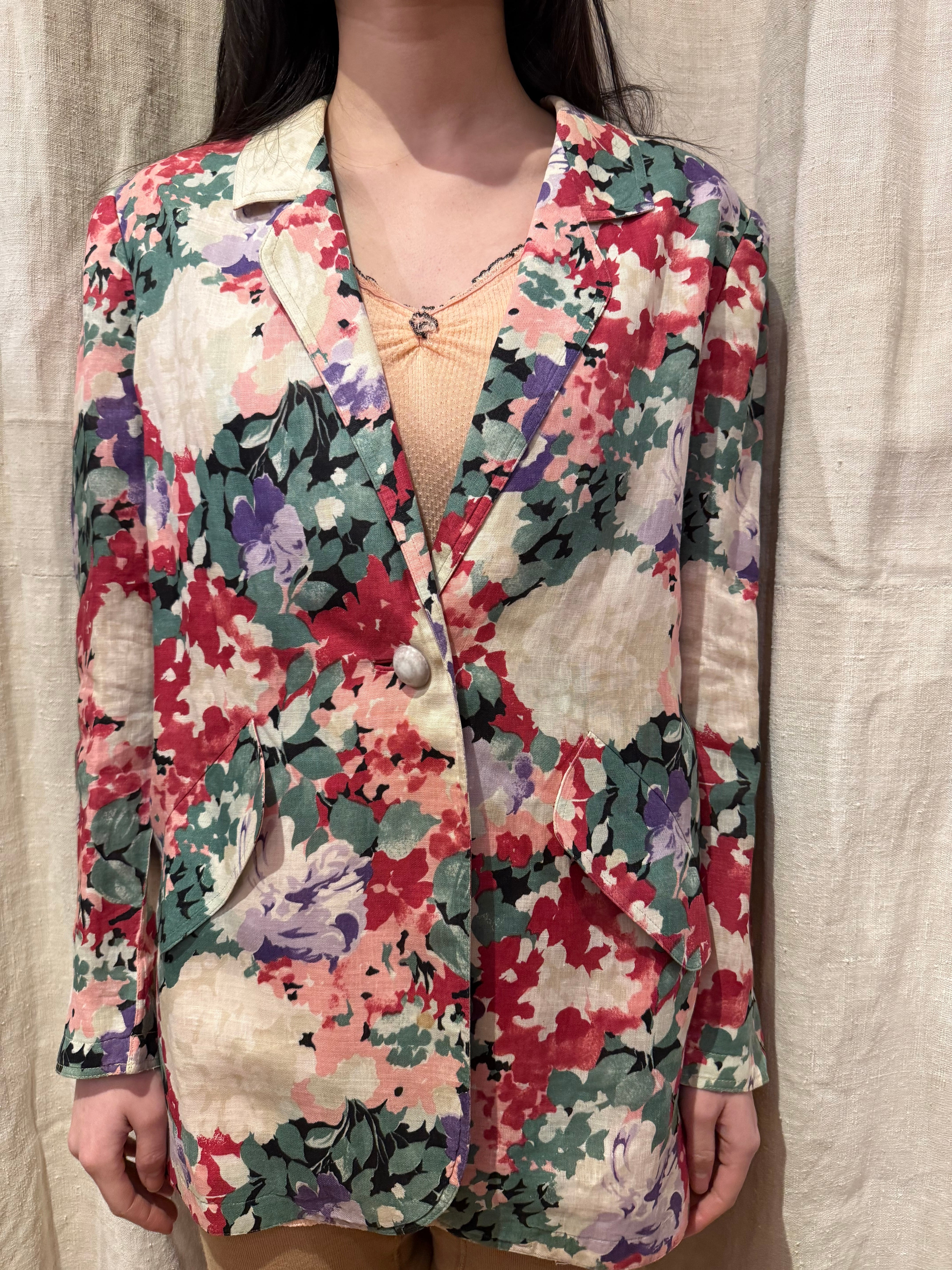 花のプリントが施されたテーラードジャケットでございます。リネンのような肌触りで、軽めの着心地。裏地はピンク色でございます。派手な印象ですが、ランジェリーやヴィンテージのアンダーウェアとも相性が良く、ヴィンテージらしい雰囲気が演出出来ます。
