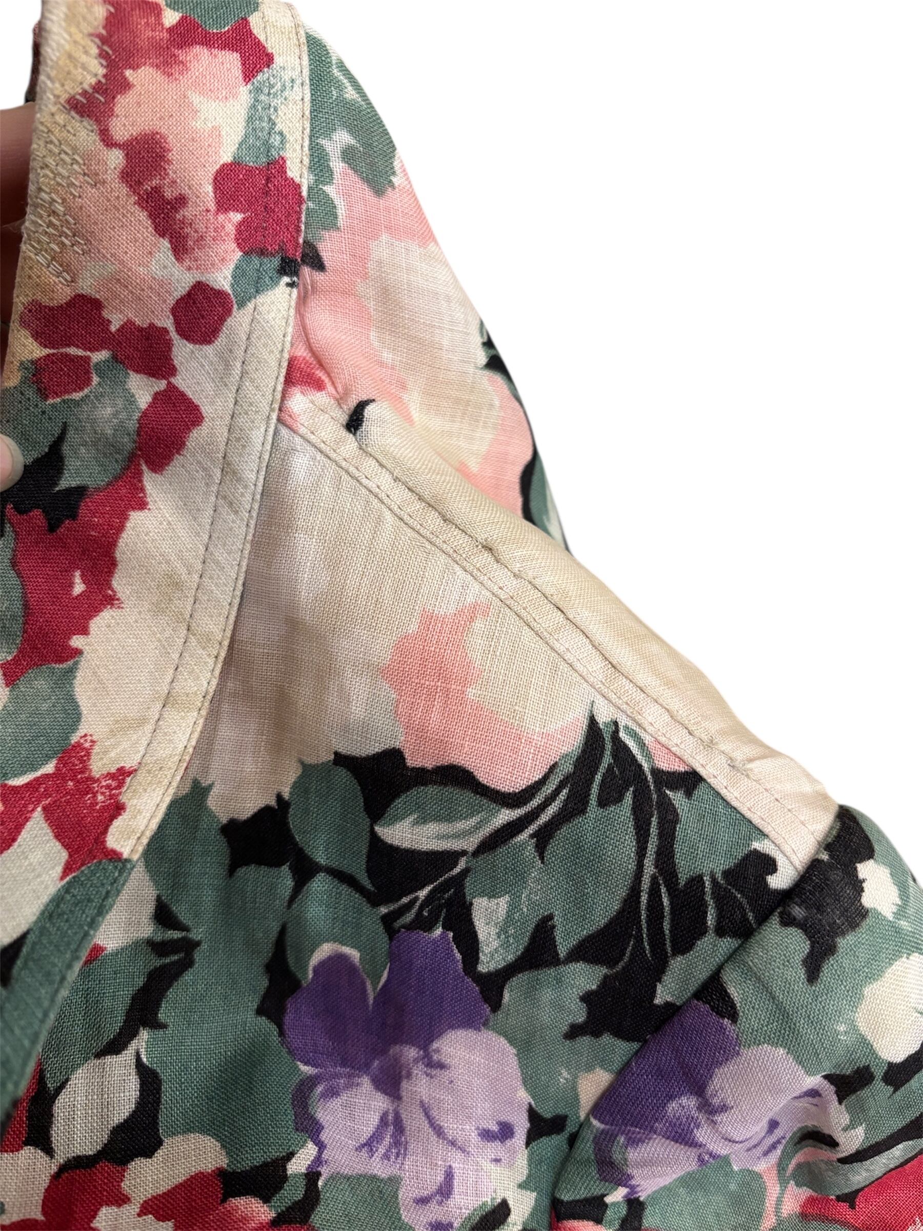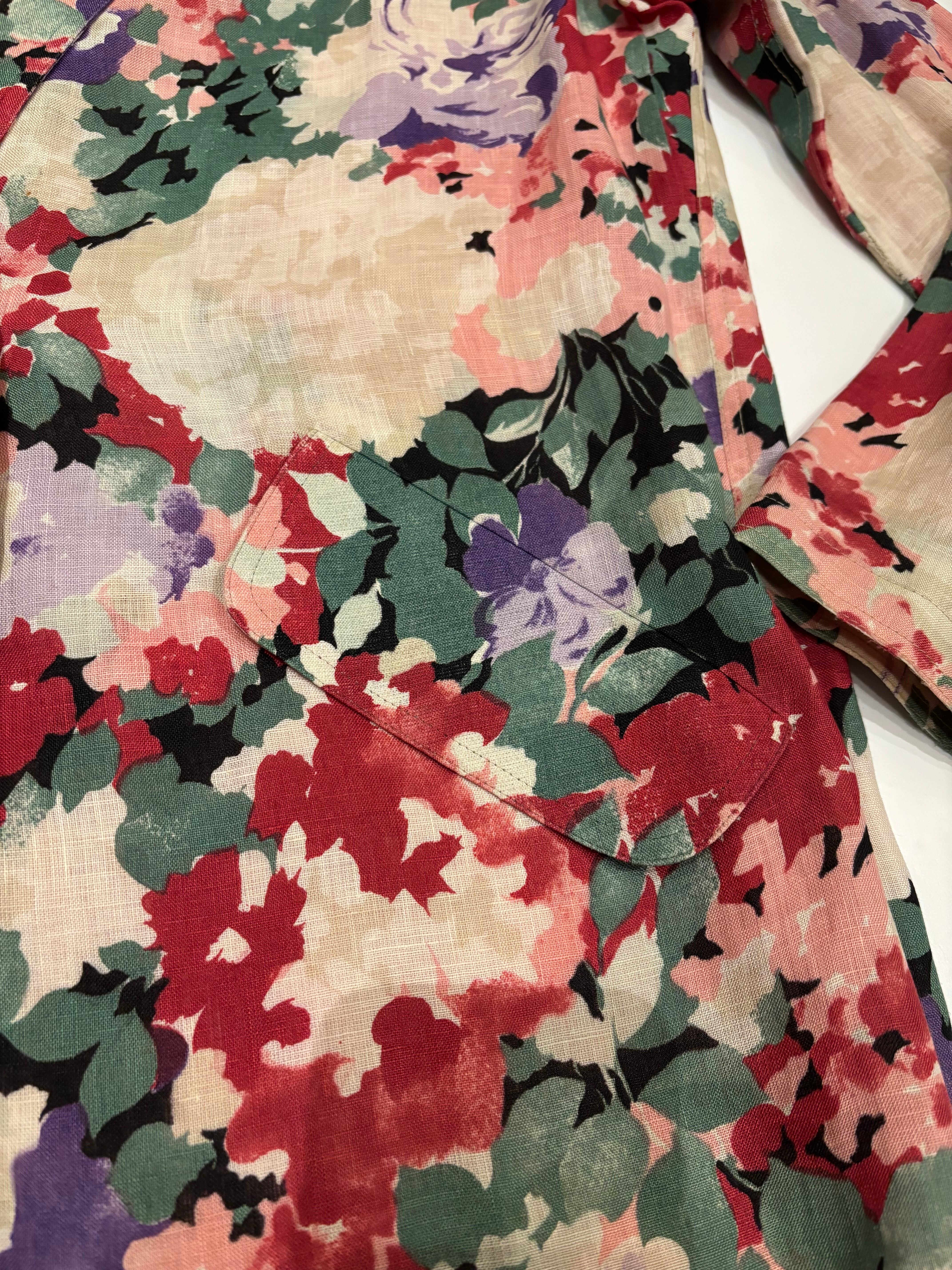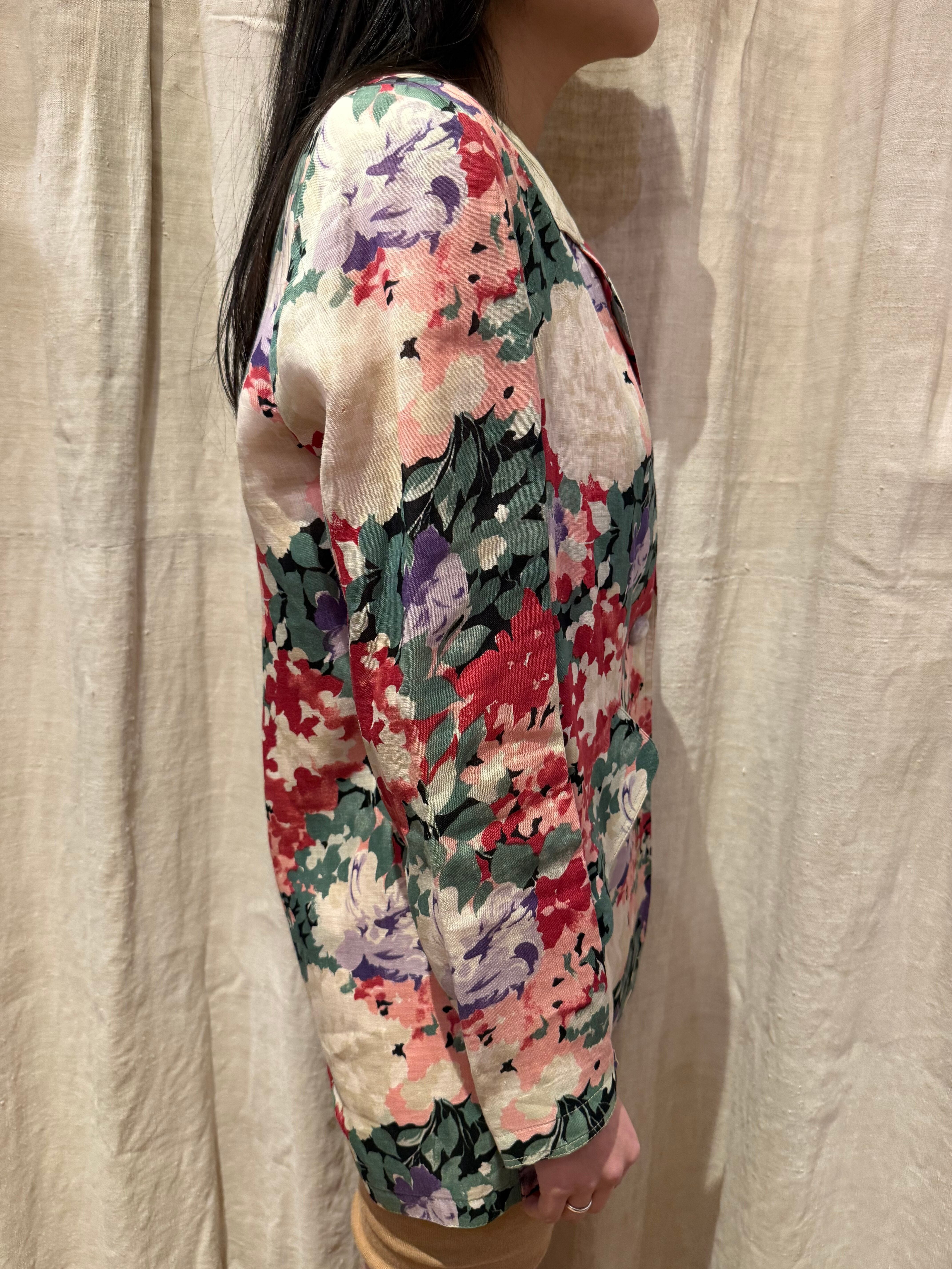 花のプリントが施されたテーラードジャケットでございます。リネンのような肌触りで、軽めの着心地。裏地はピンク色でございます。派手な印象ですが、ランジェリーやヴィンテージのアンダーウェアとも相性が良く、ヴィンテージらしい雰囲気が演出出来ます。