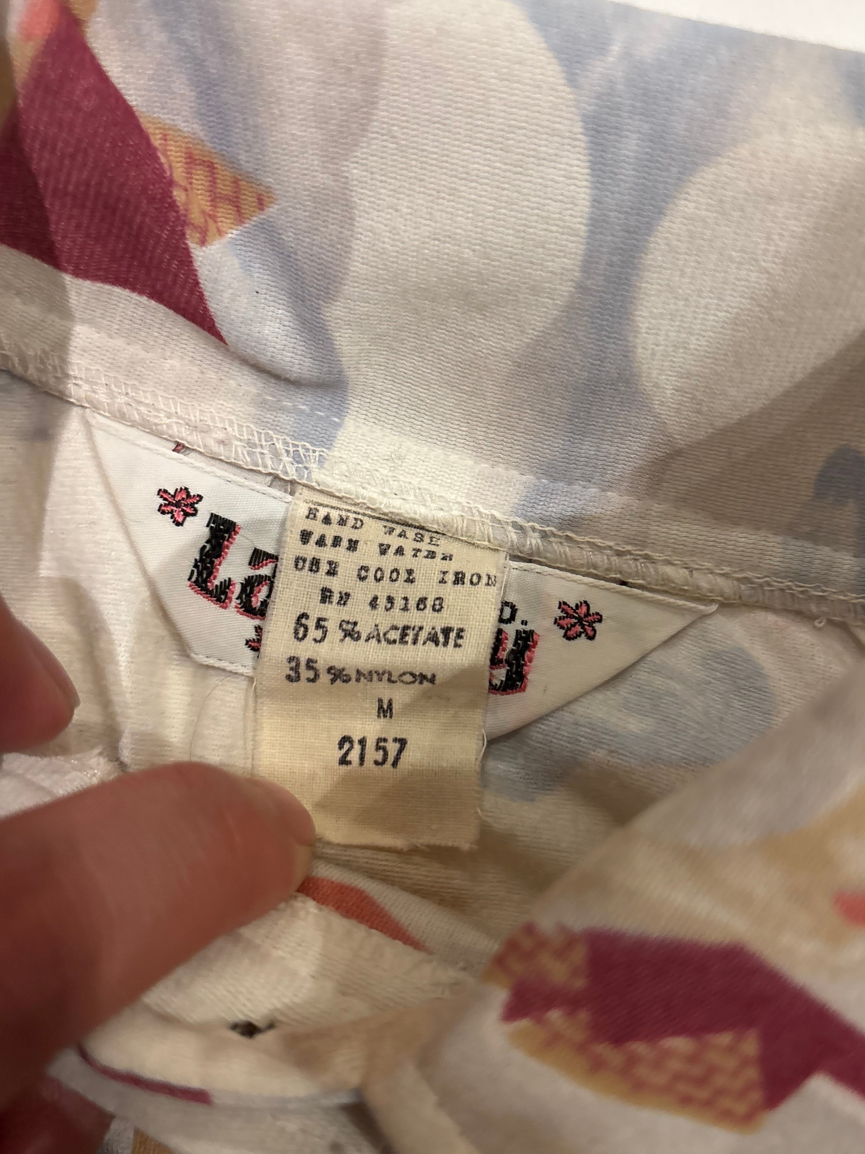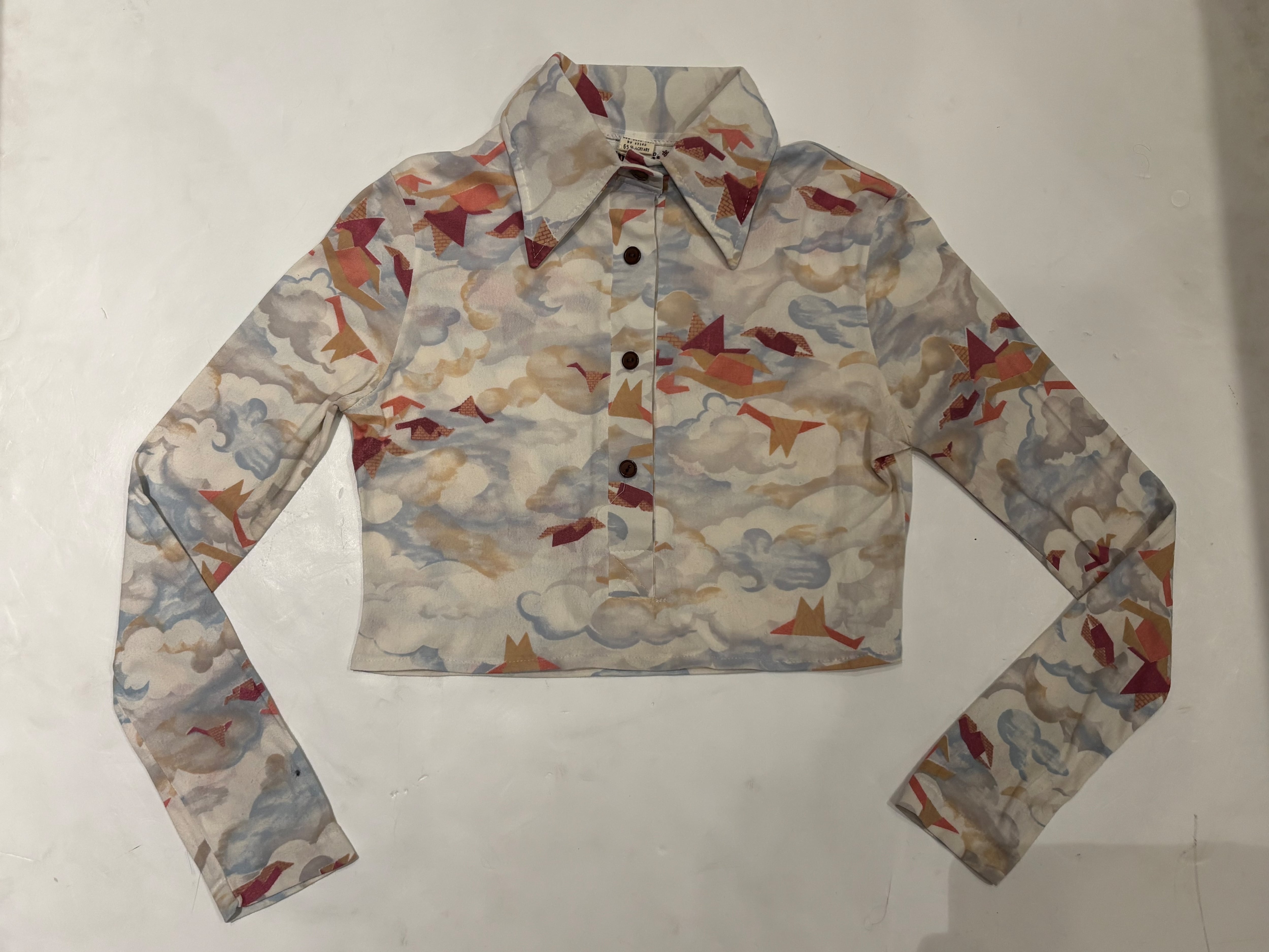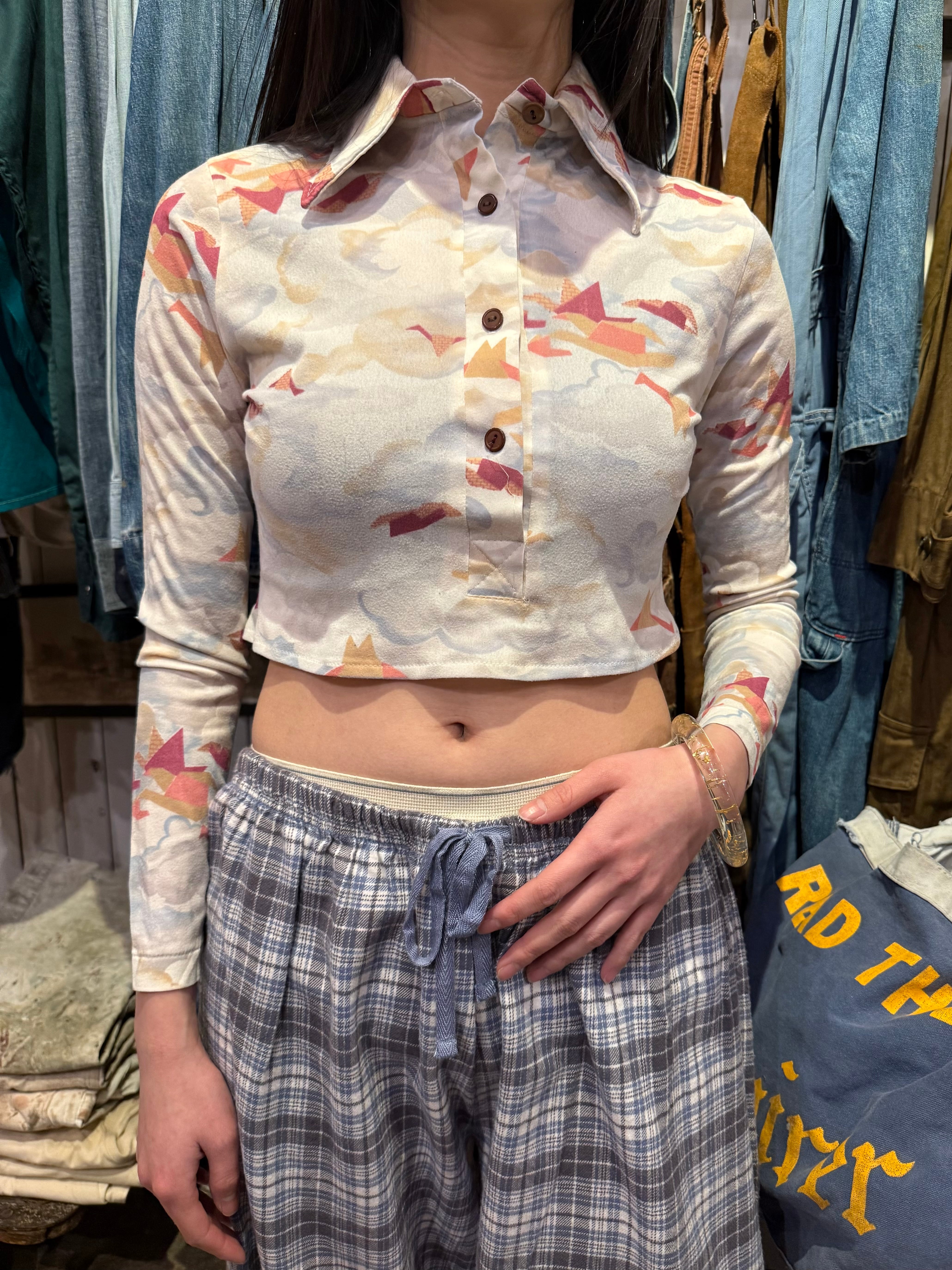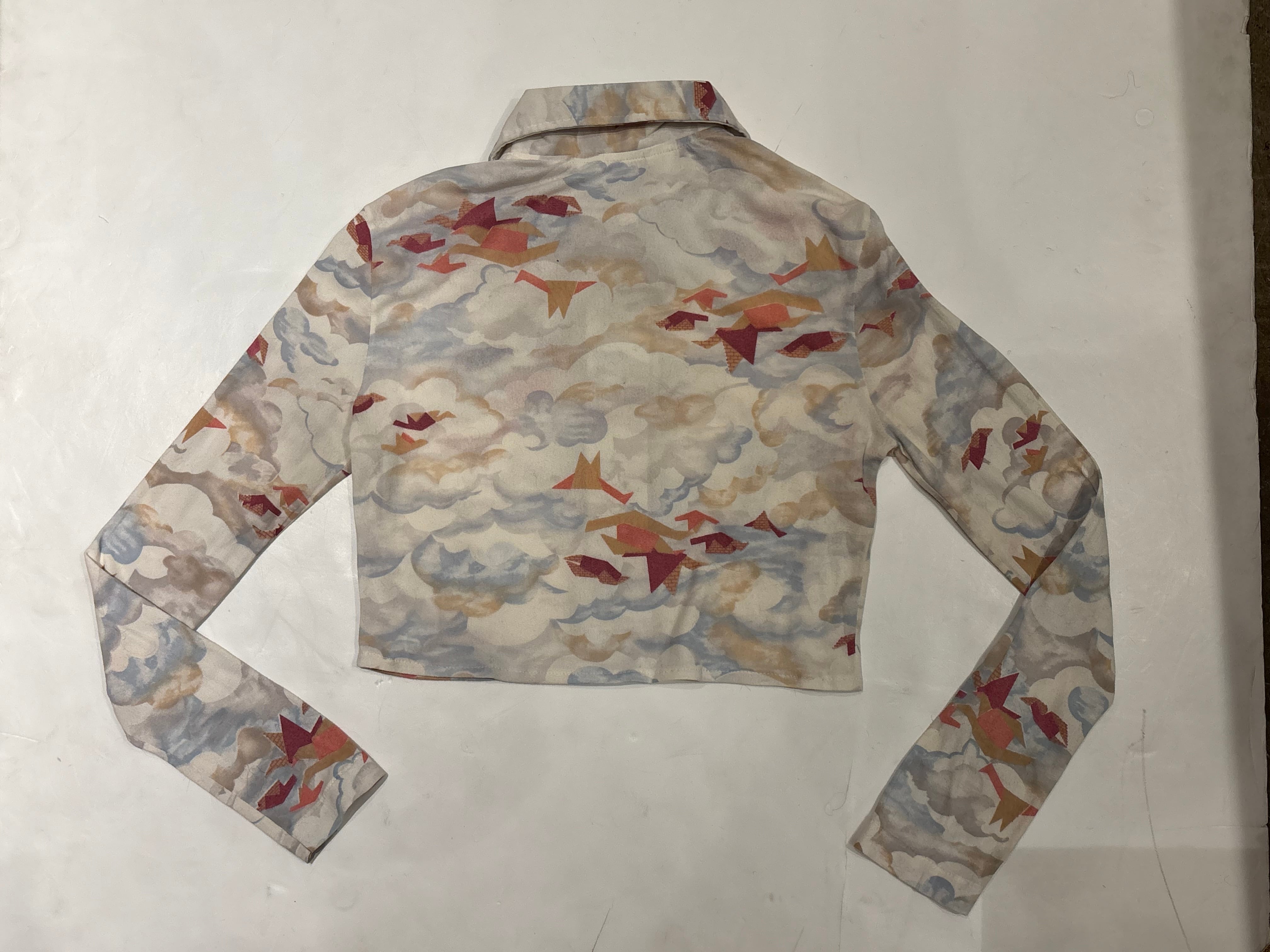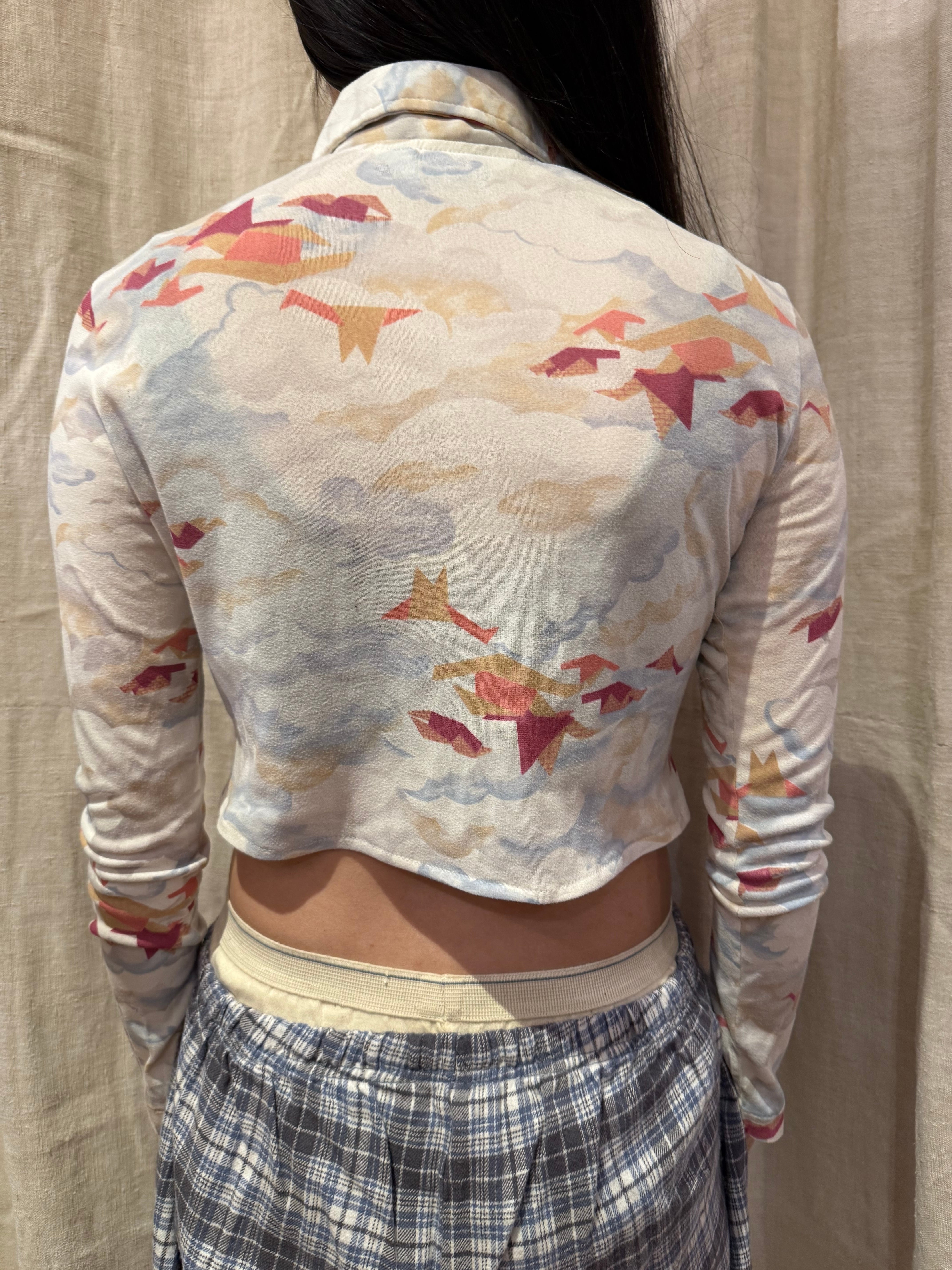 淡い配色で鳥が描かれたシャツでございます。ピタッとしたサイズ感とクロップド丈なのが可愛らしいです。インナーにレース素材のものを合わせたり、ハイウェスト、ローウェストで合わせても◎春らしいデザインでこれからの季節にいかがでしょうか。
