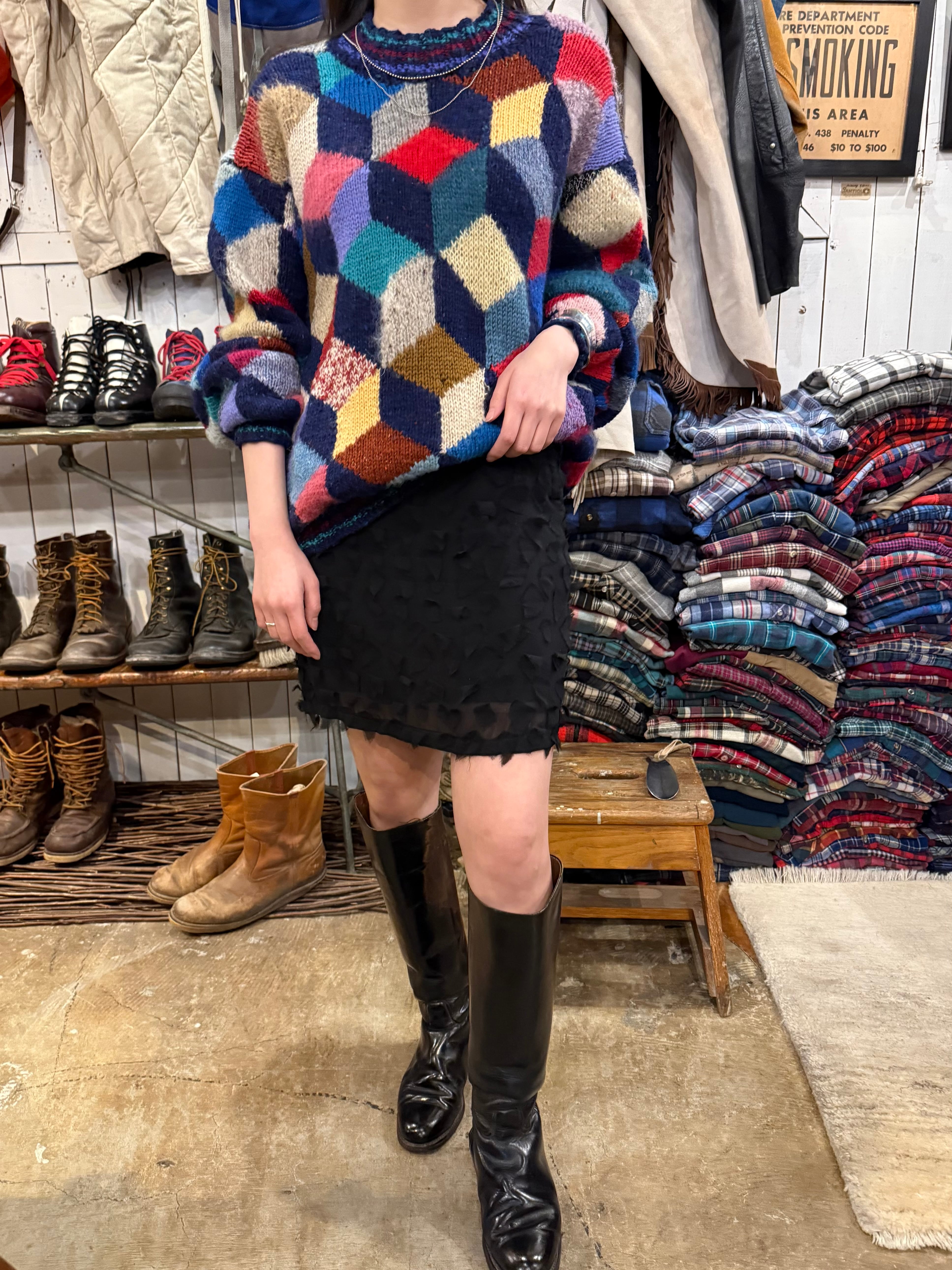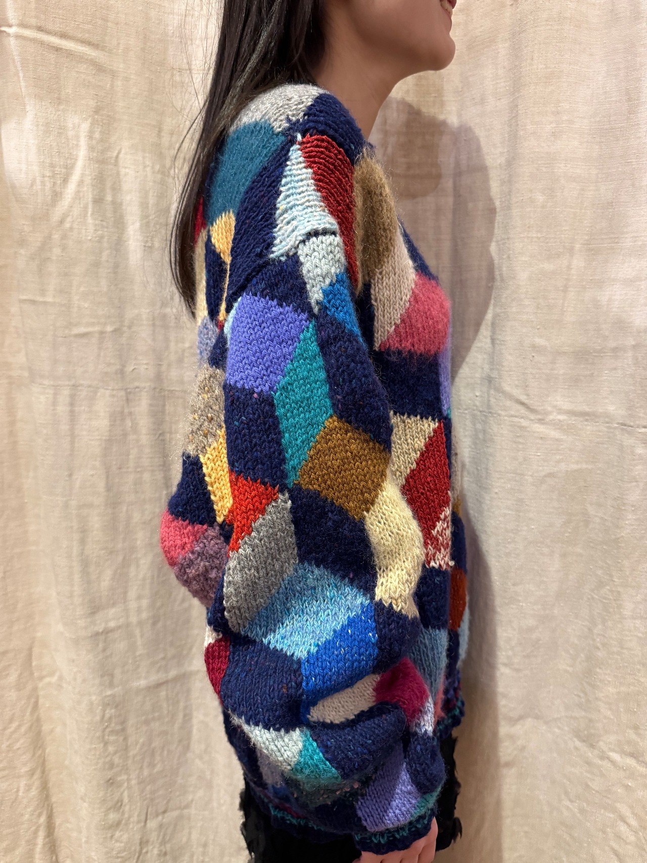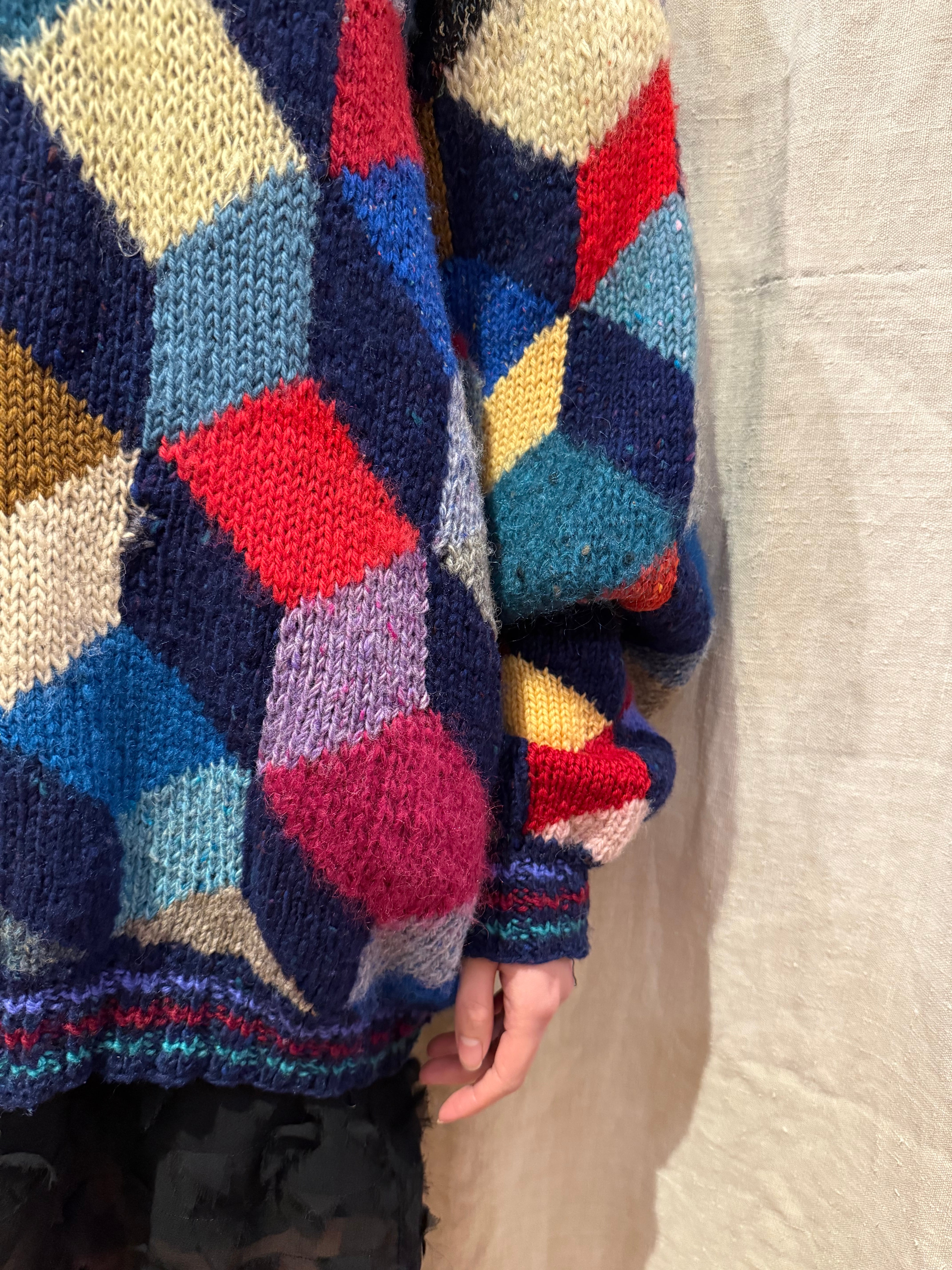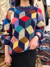 ニット素材のパッチワークセーターです。カラフルなカラーに、素材の違ったニットが特徴的で、ホワホワとしたモヘヤなども入ってきます。立体感のあるパターンが個性を演出してくれて、とても可愛らしいです。