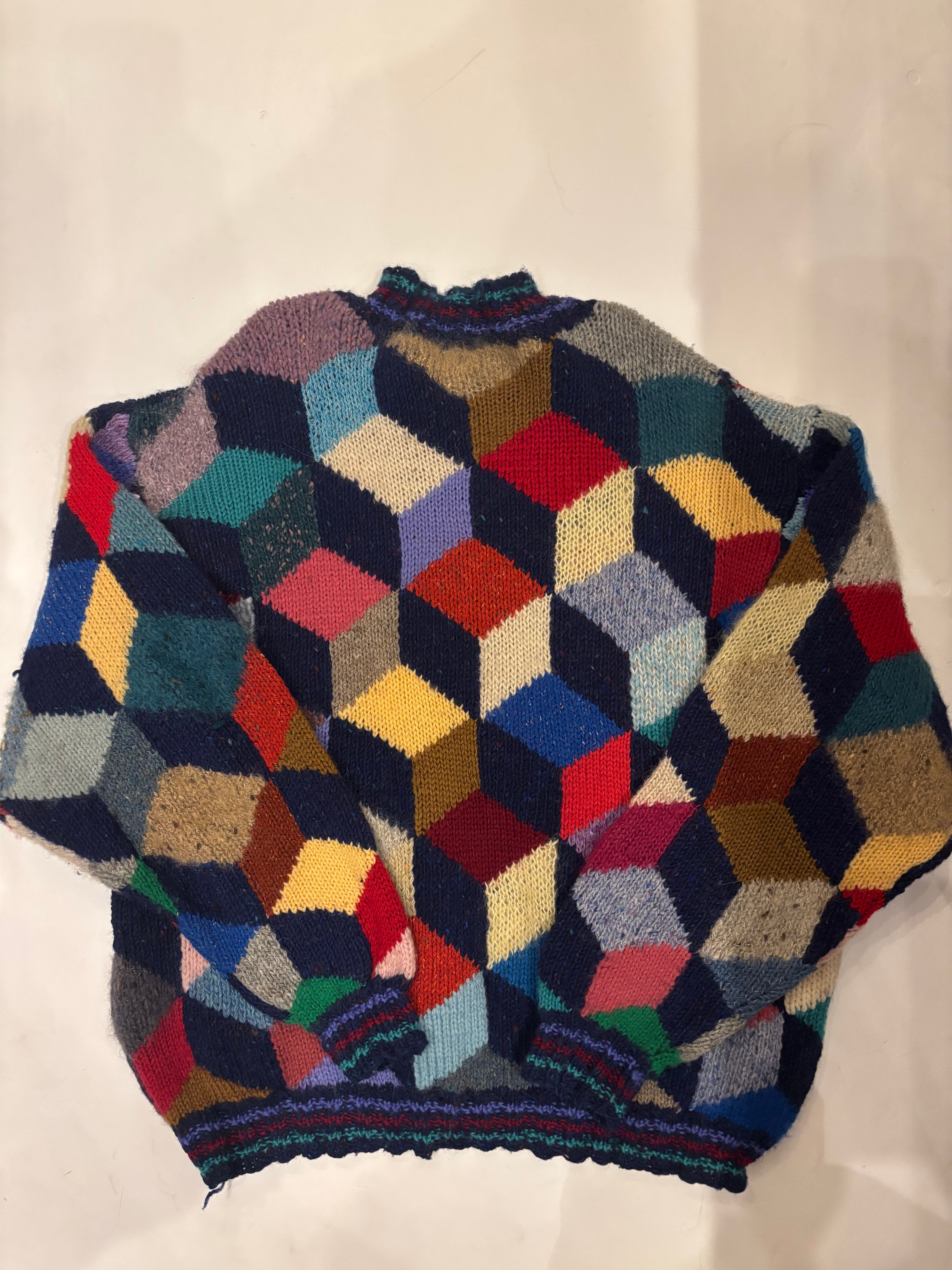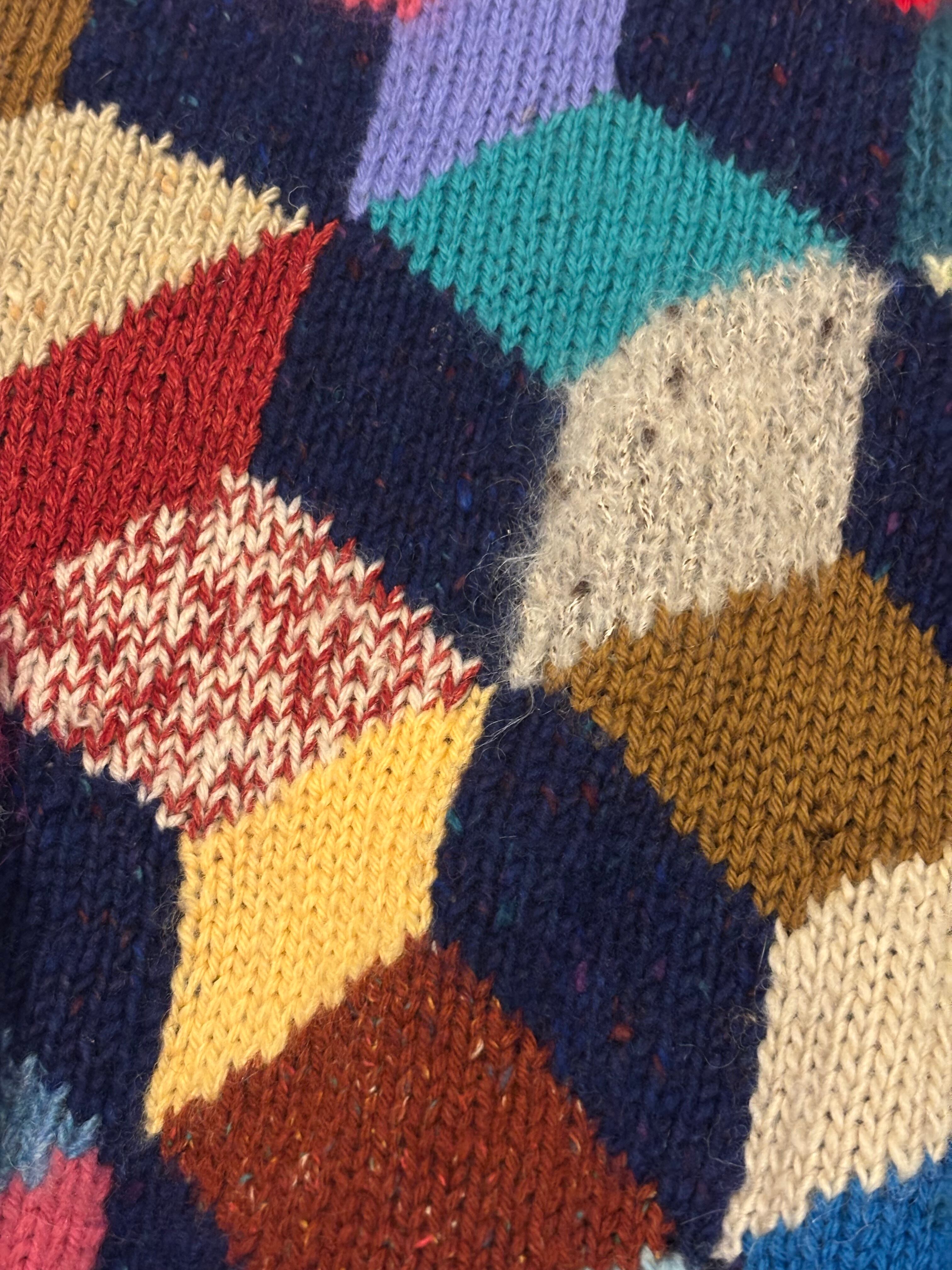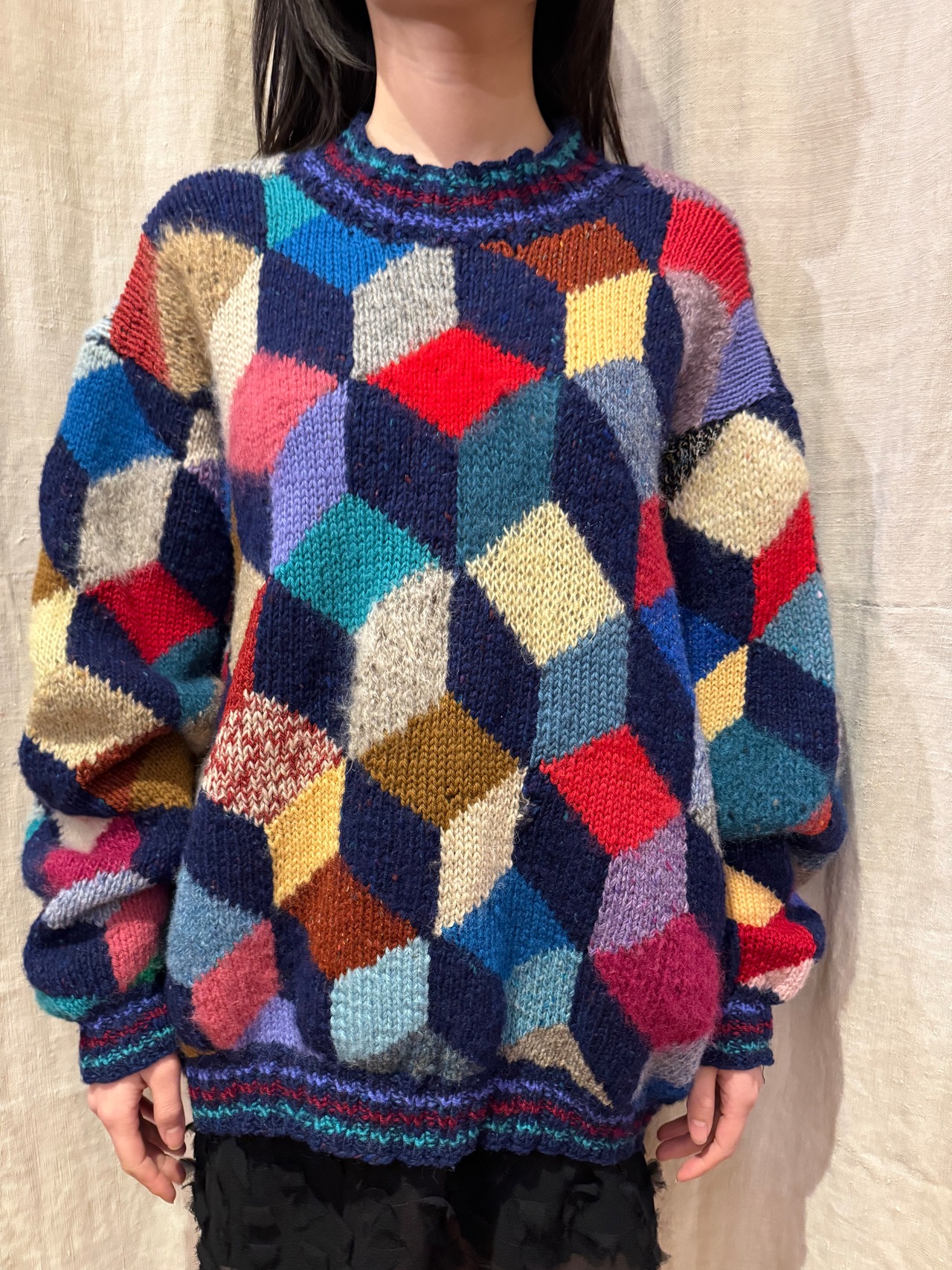 ニット素材のパッチワークセーターです。カラフルなカラーに、素材の違ったニットが特徴的で、ホワホワとしたモヘヤなども入ってきます。立体感のあるパターンが個性を演出してくれて、とても可愛らしいです。