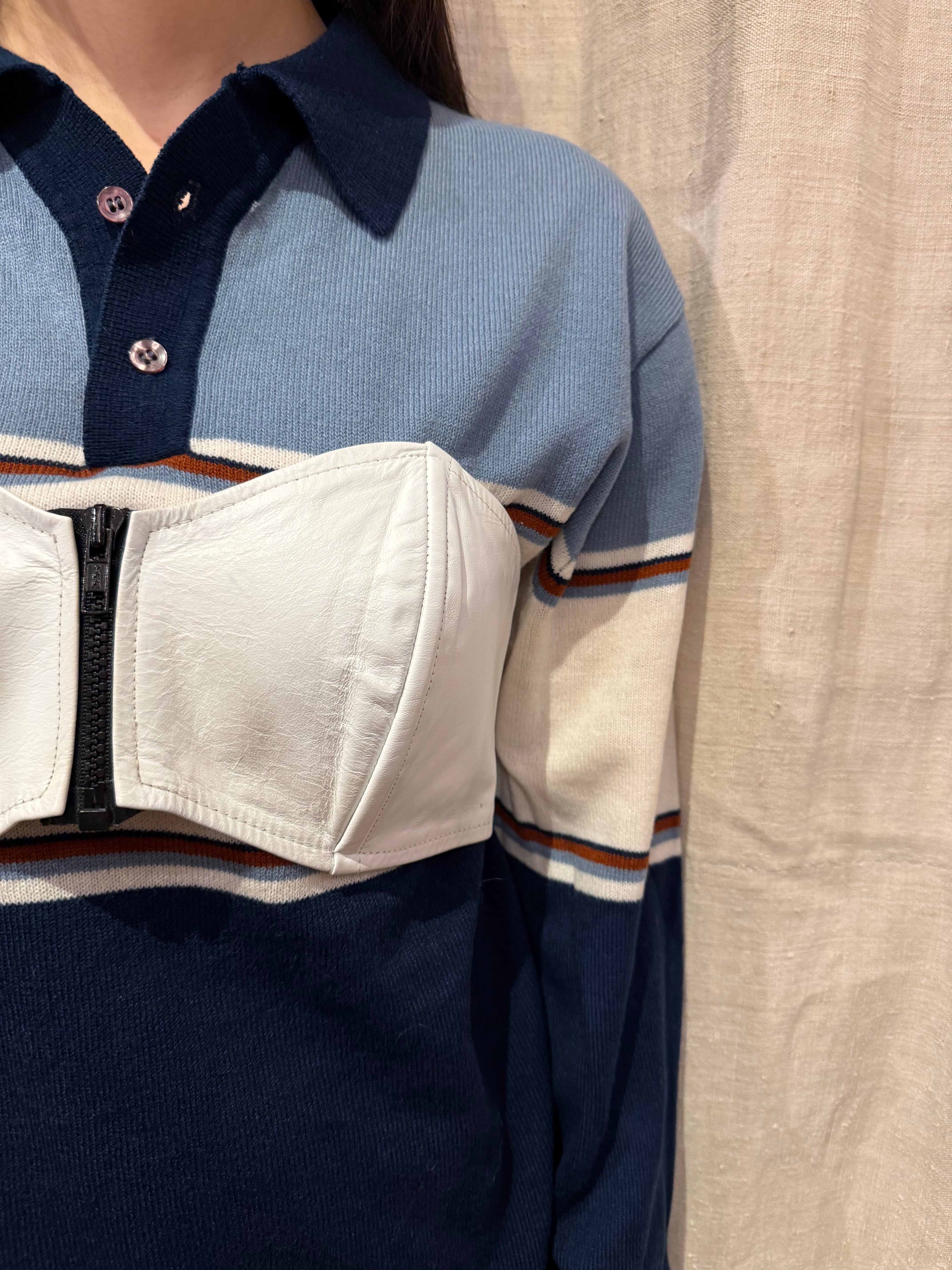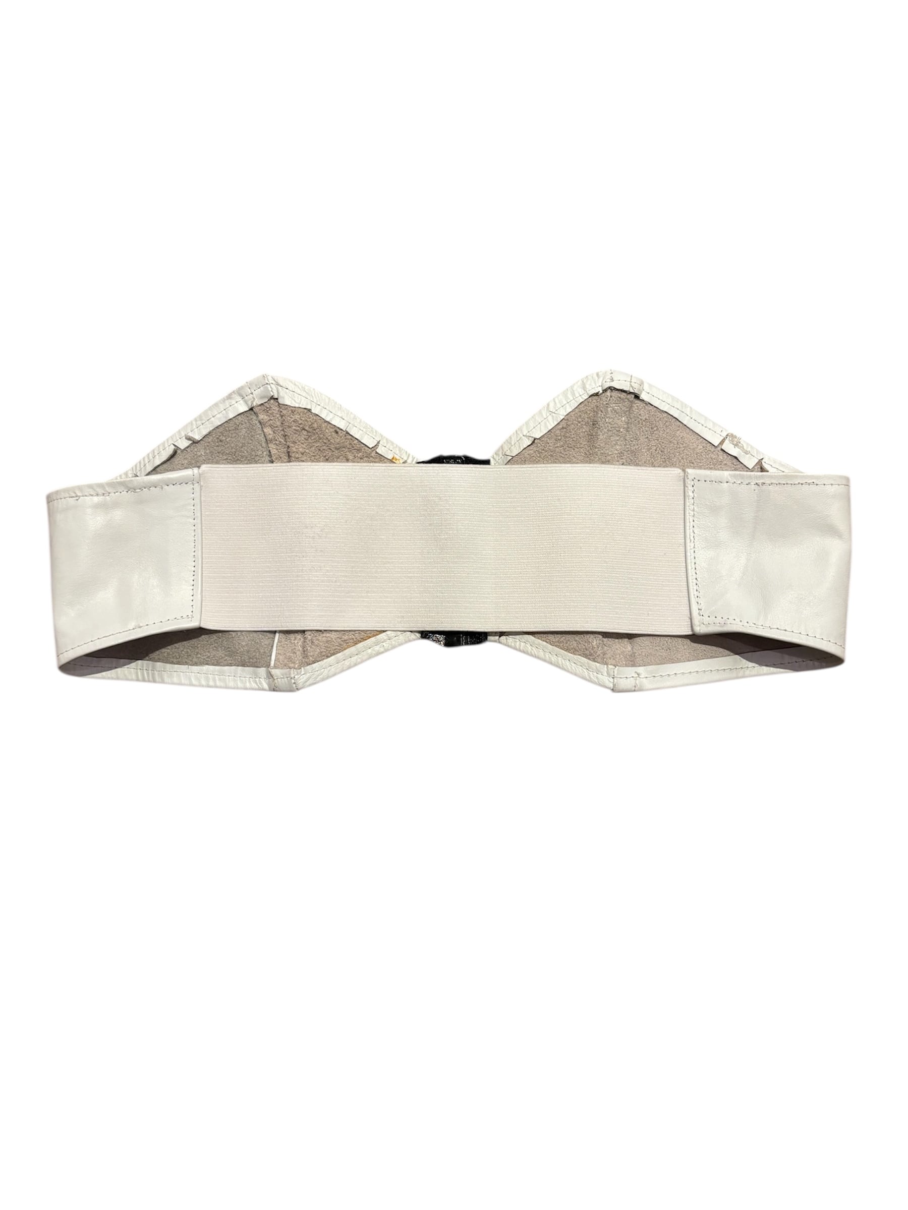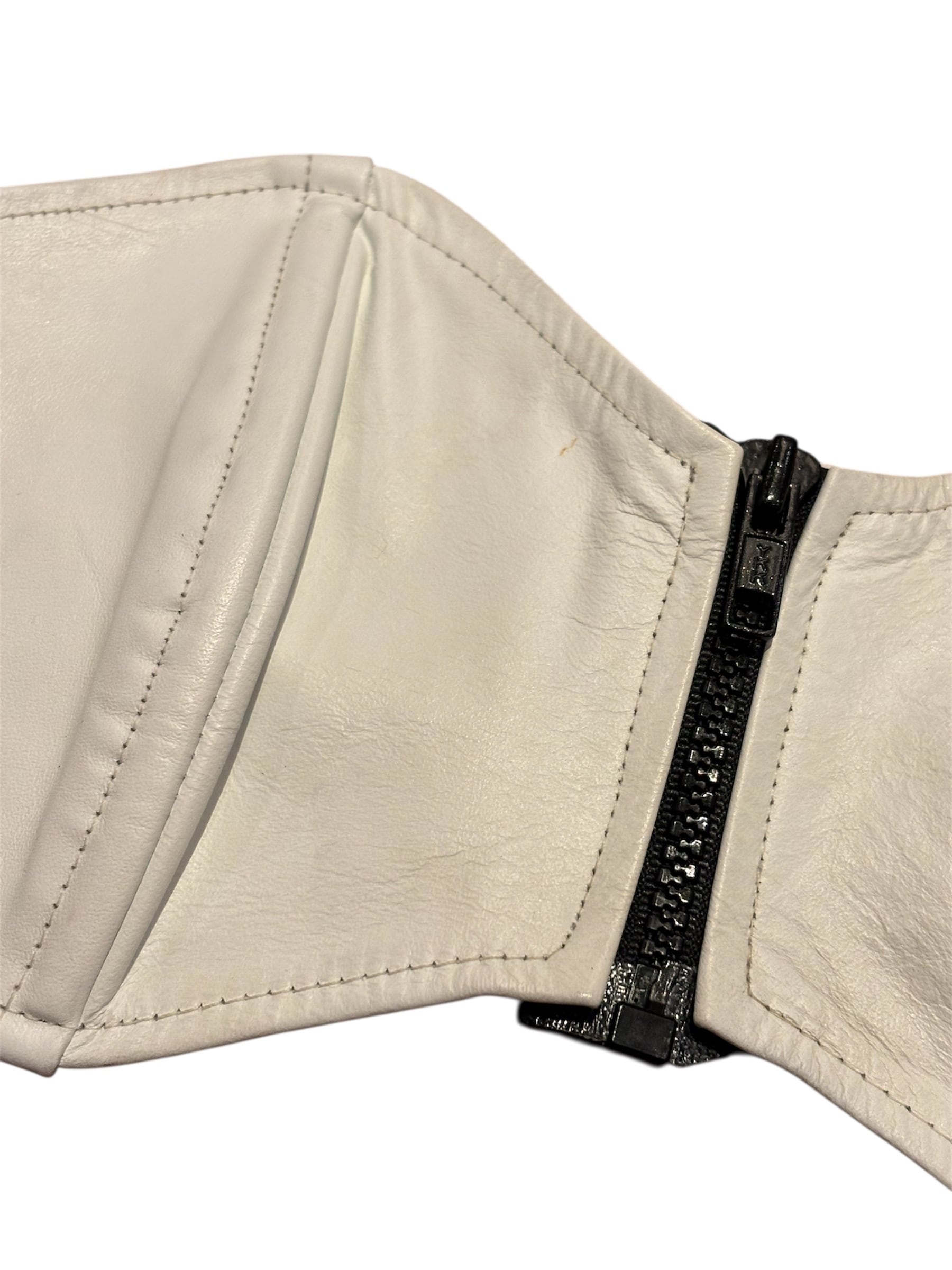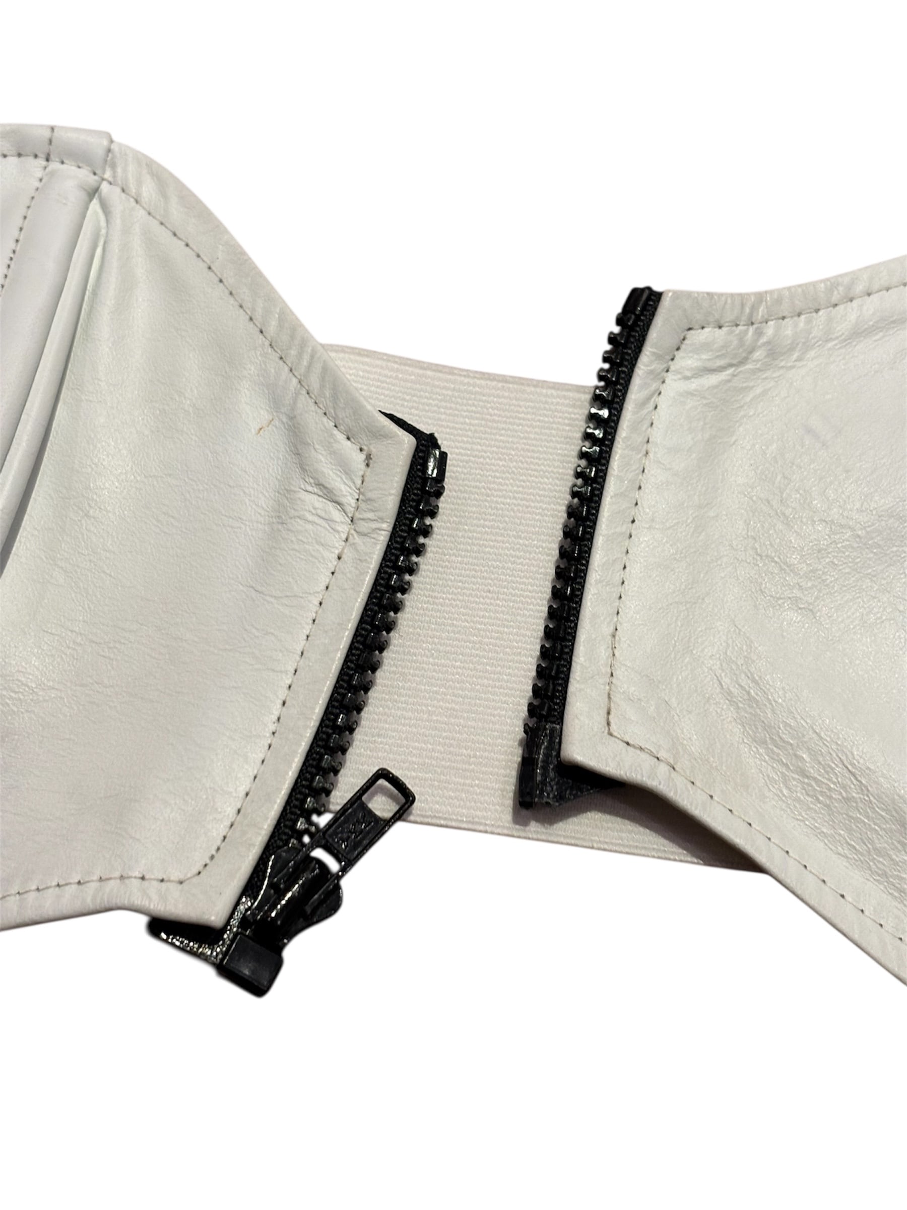 レザーのビスチェでございます。前あきのジッパーで着脱がしやすく、後ろばゴムになっているので、幅広いサイズ感でトップスを選んで着ることが出来ます。季節問わずレイヤードを楽しんでいただけるアイテムです。ホワイトなので、あえてフェミニンなスタイリングと合わせても素敵です。