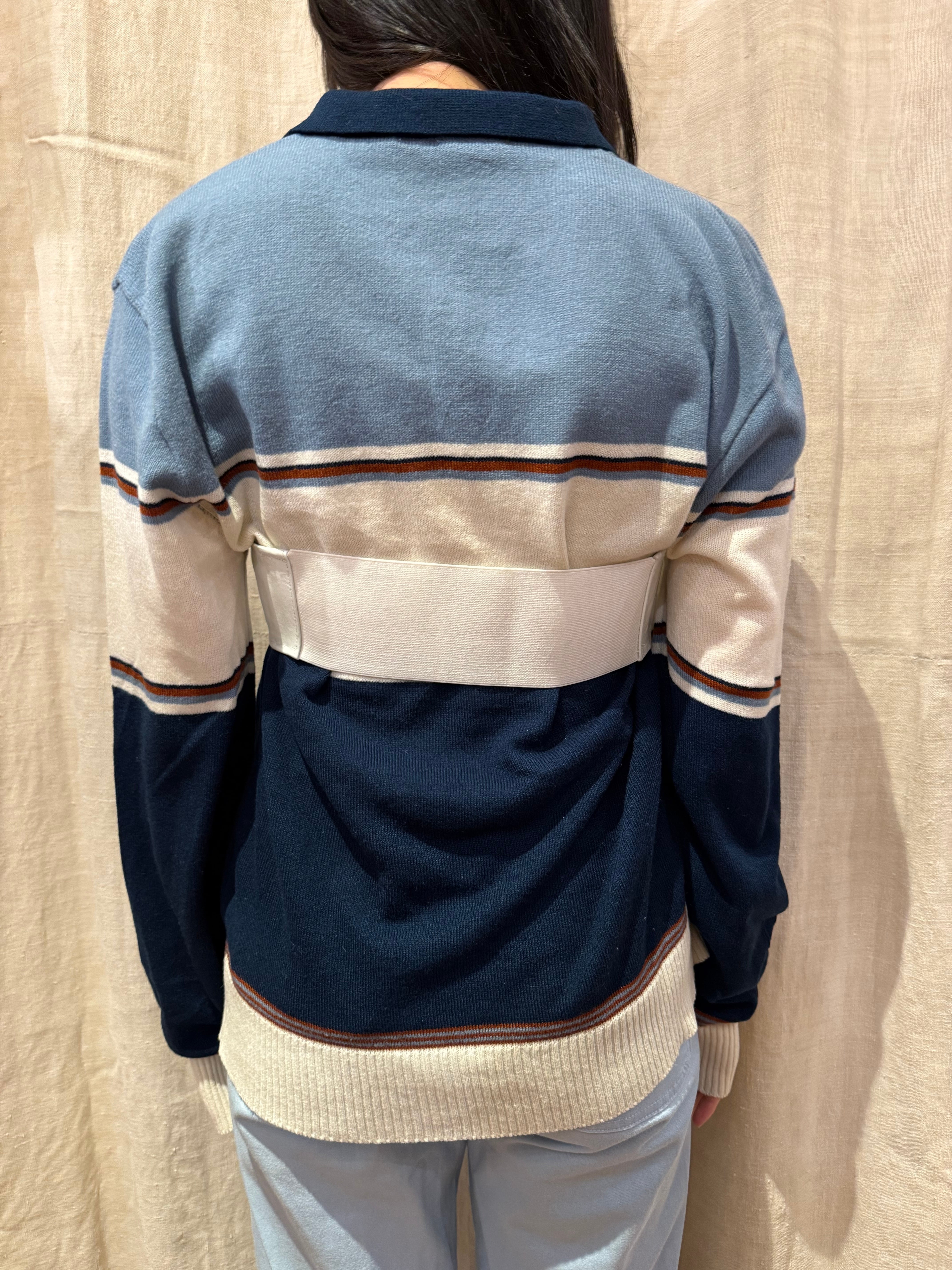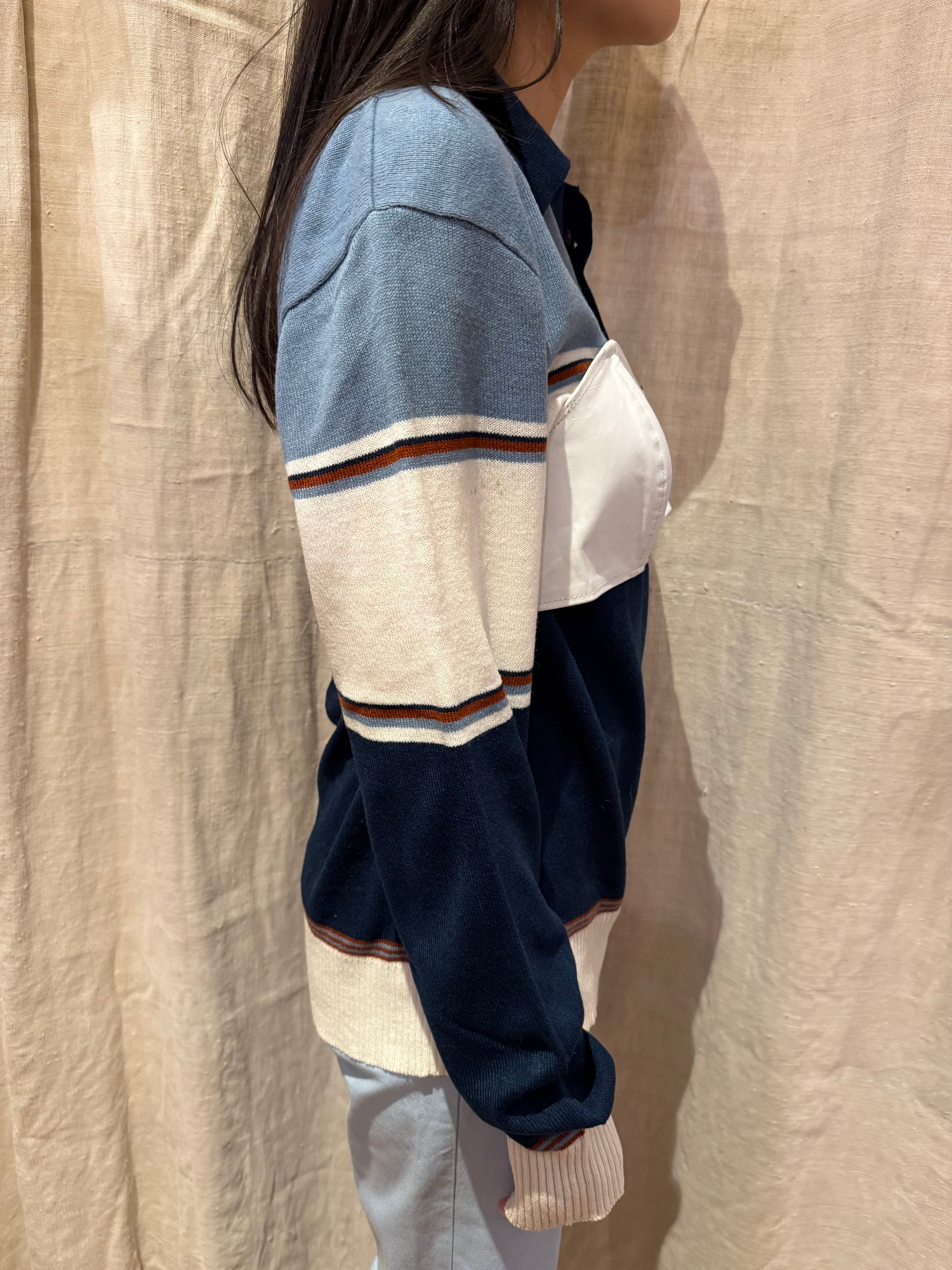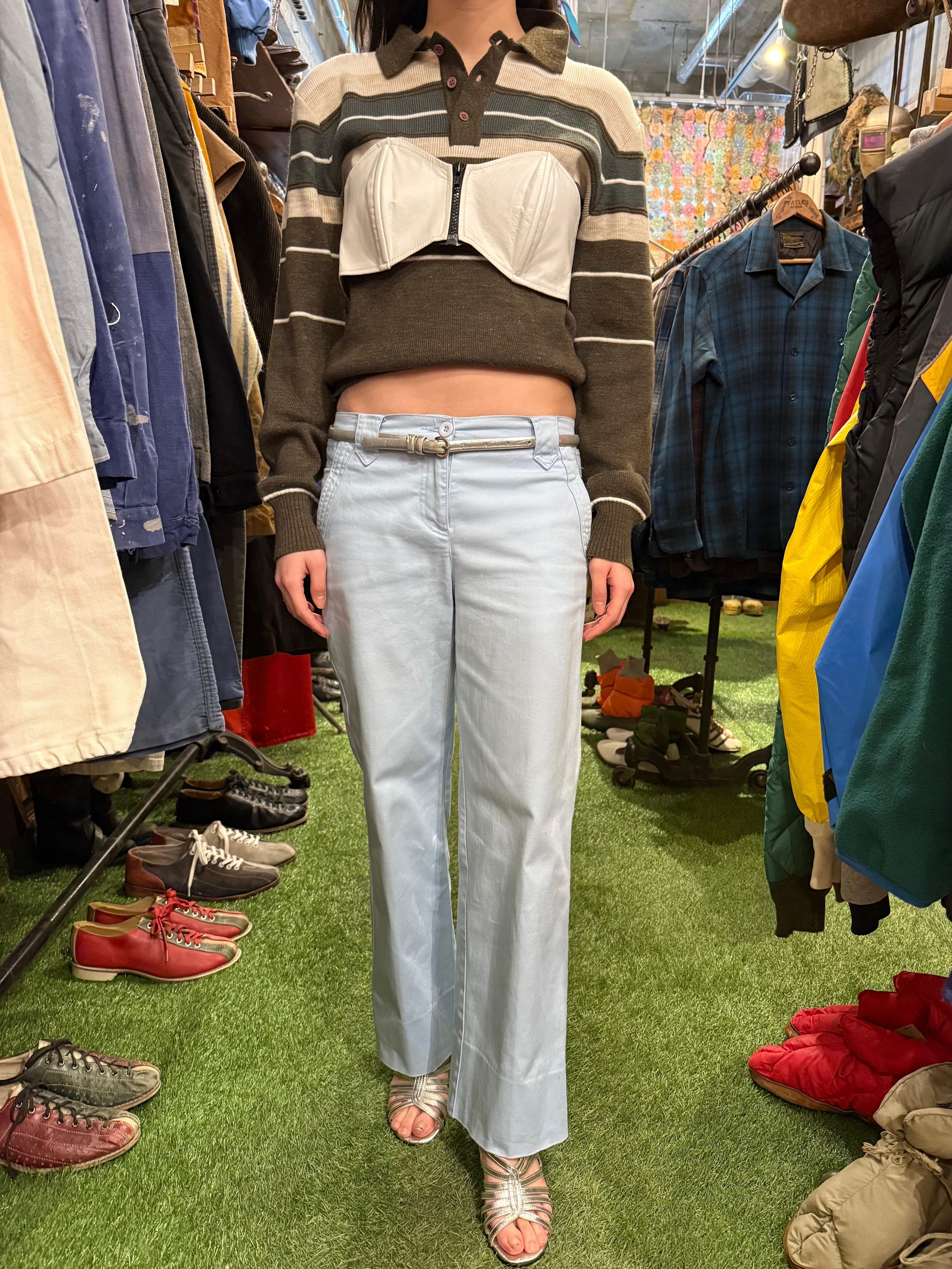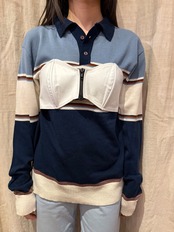 レザーのビスチェでございます。前あきのジッパーで着脱がしやすく、後ろばゴムになっているので、幅広いサイズ感でトップスを選んで着ることが出来ます。季節問わずレイヤードを楽しんでいただけるアイテムです。ホワイトなので、あえてフェミニンなスタイリングと合わせても素敵です。