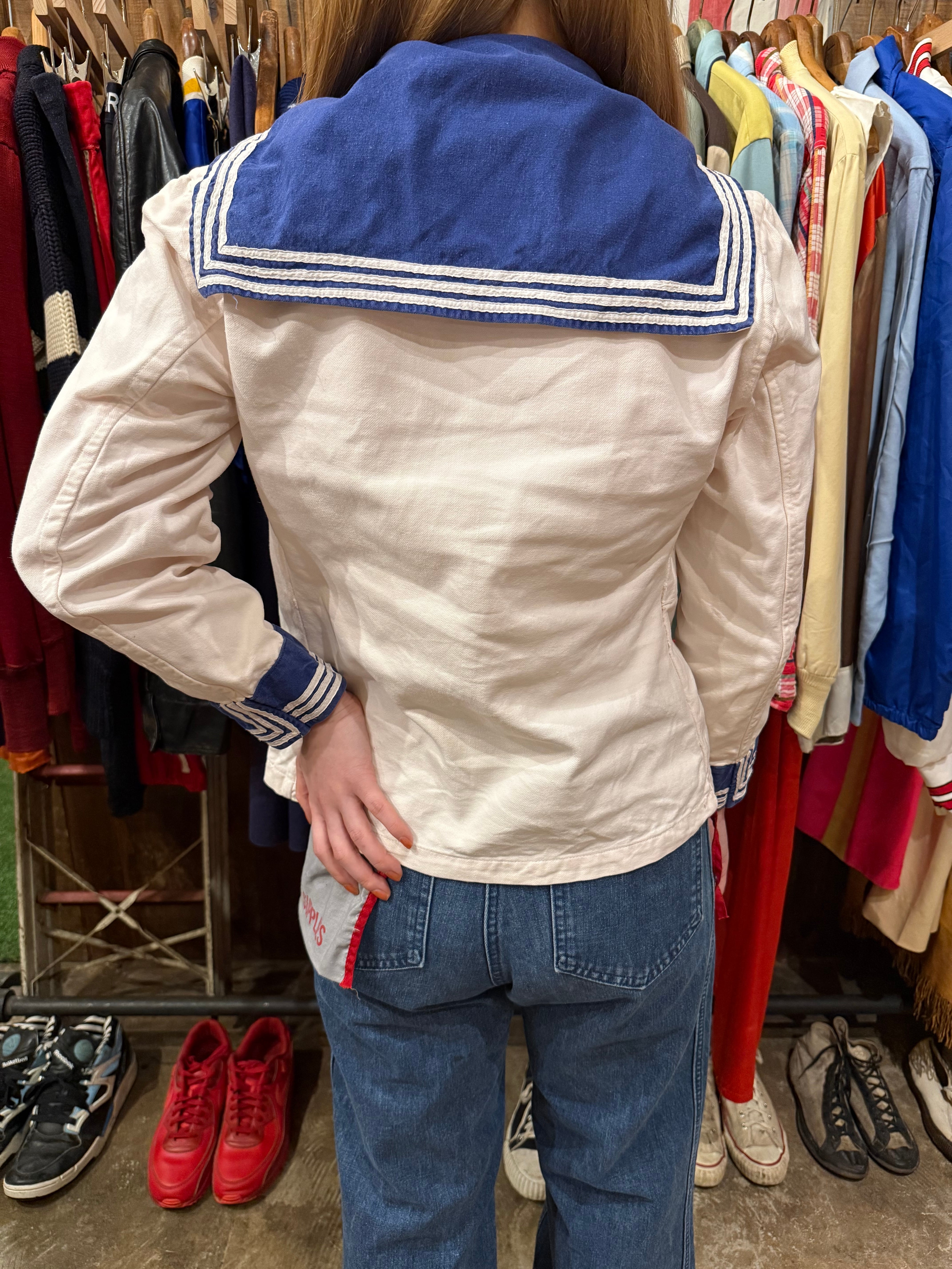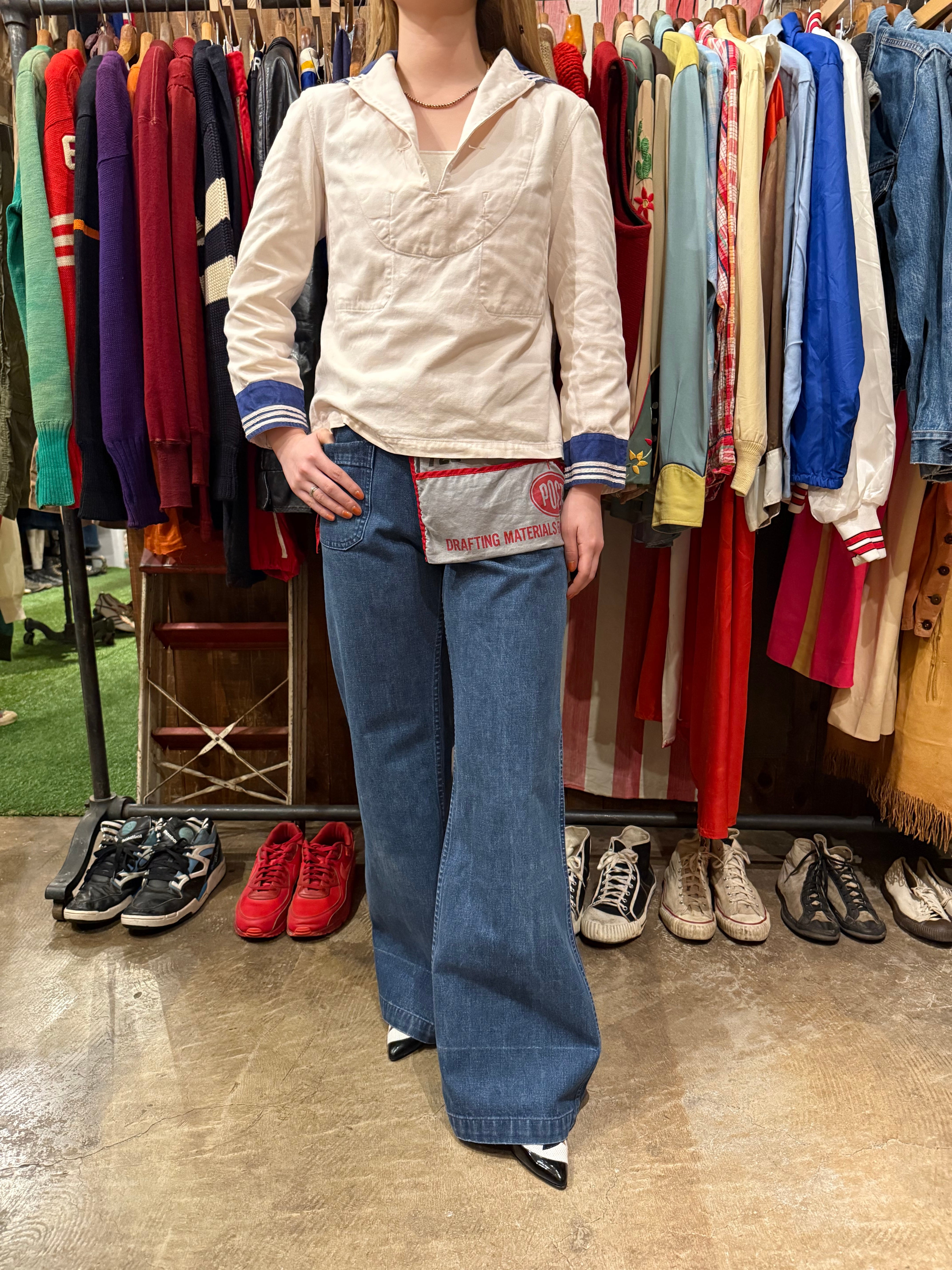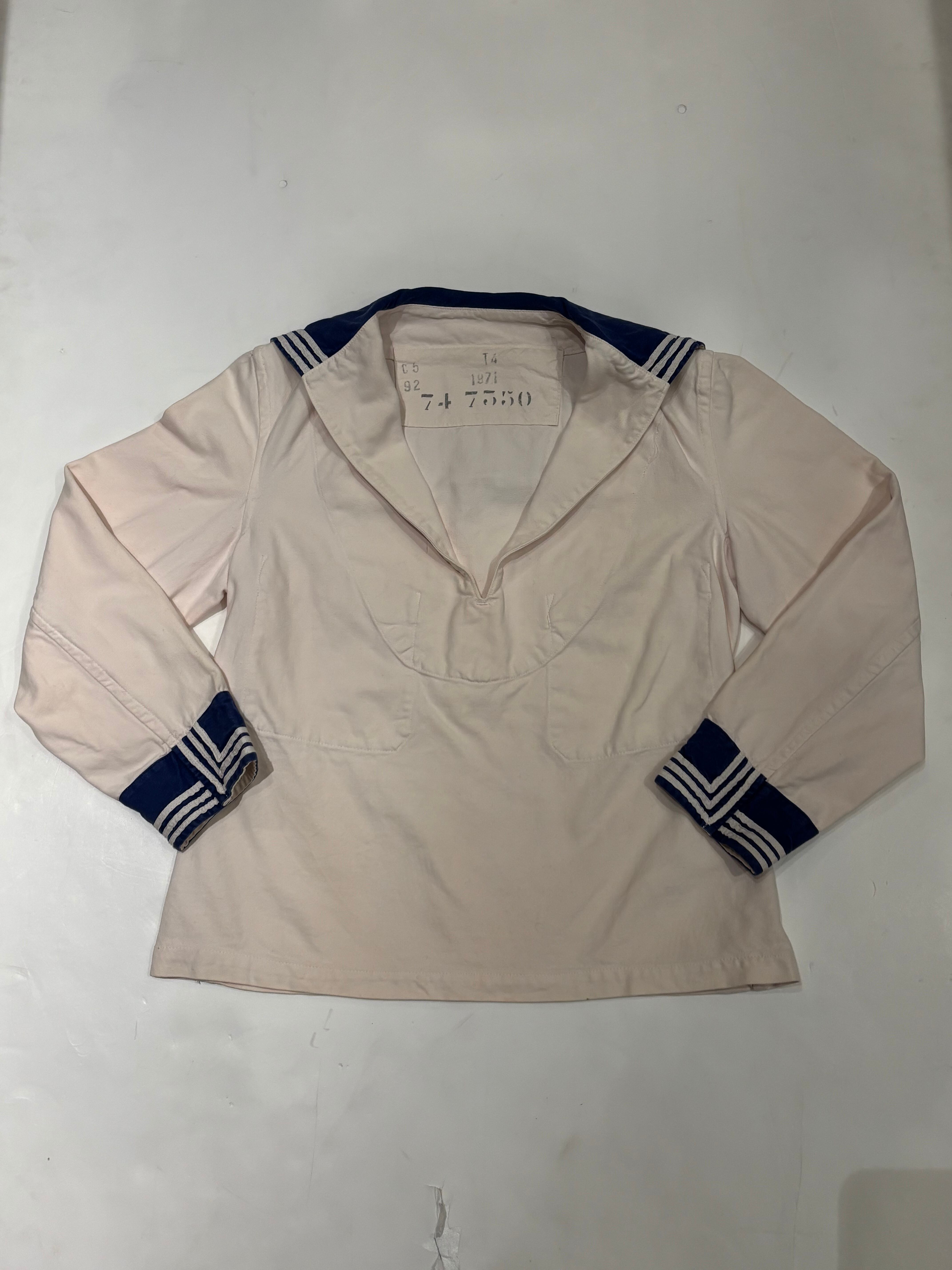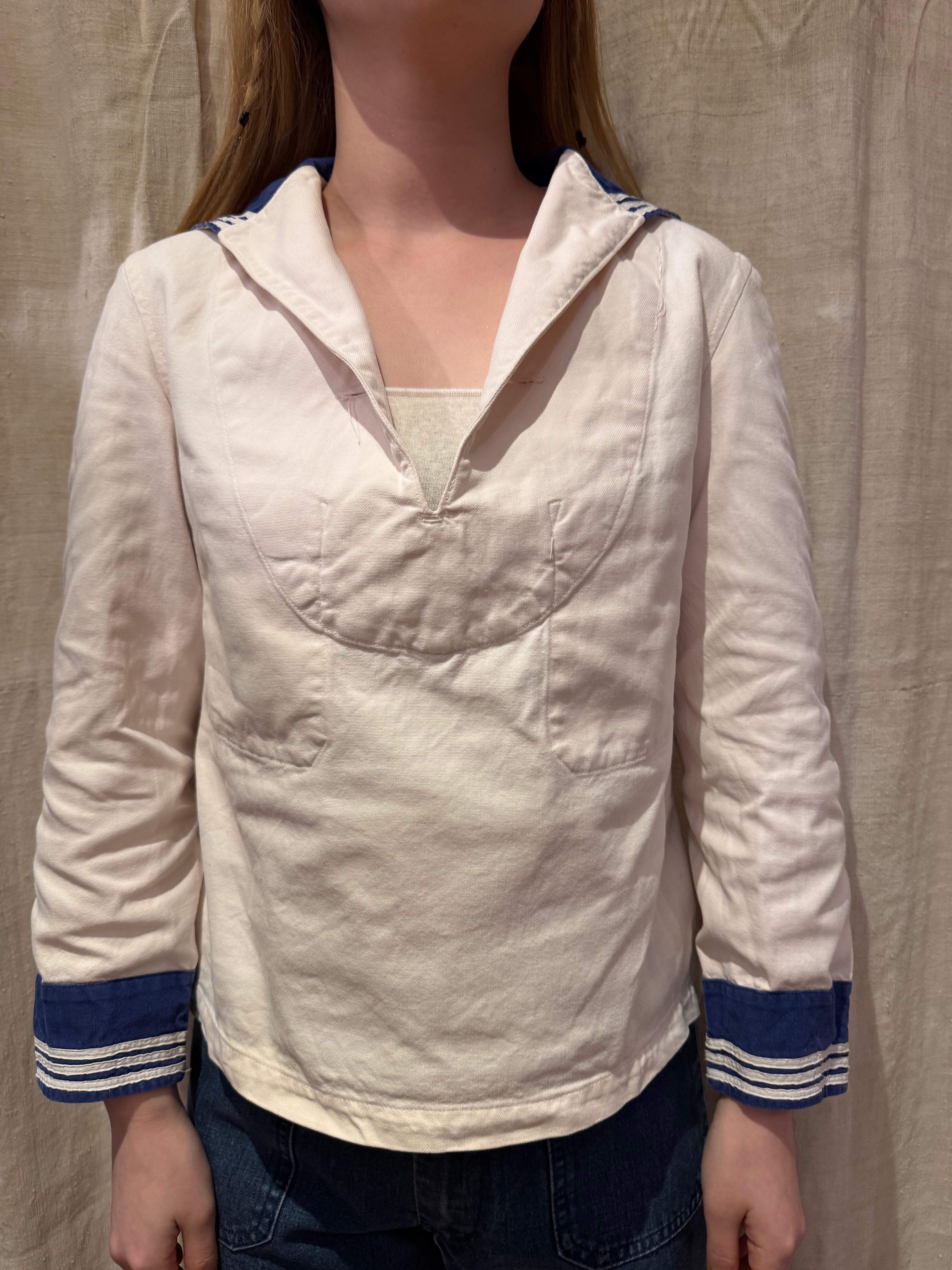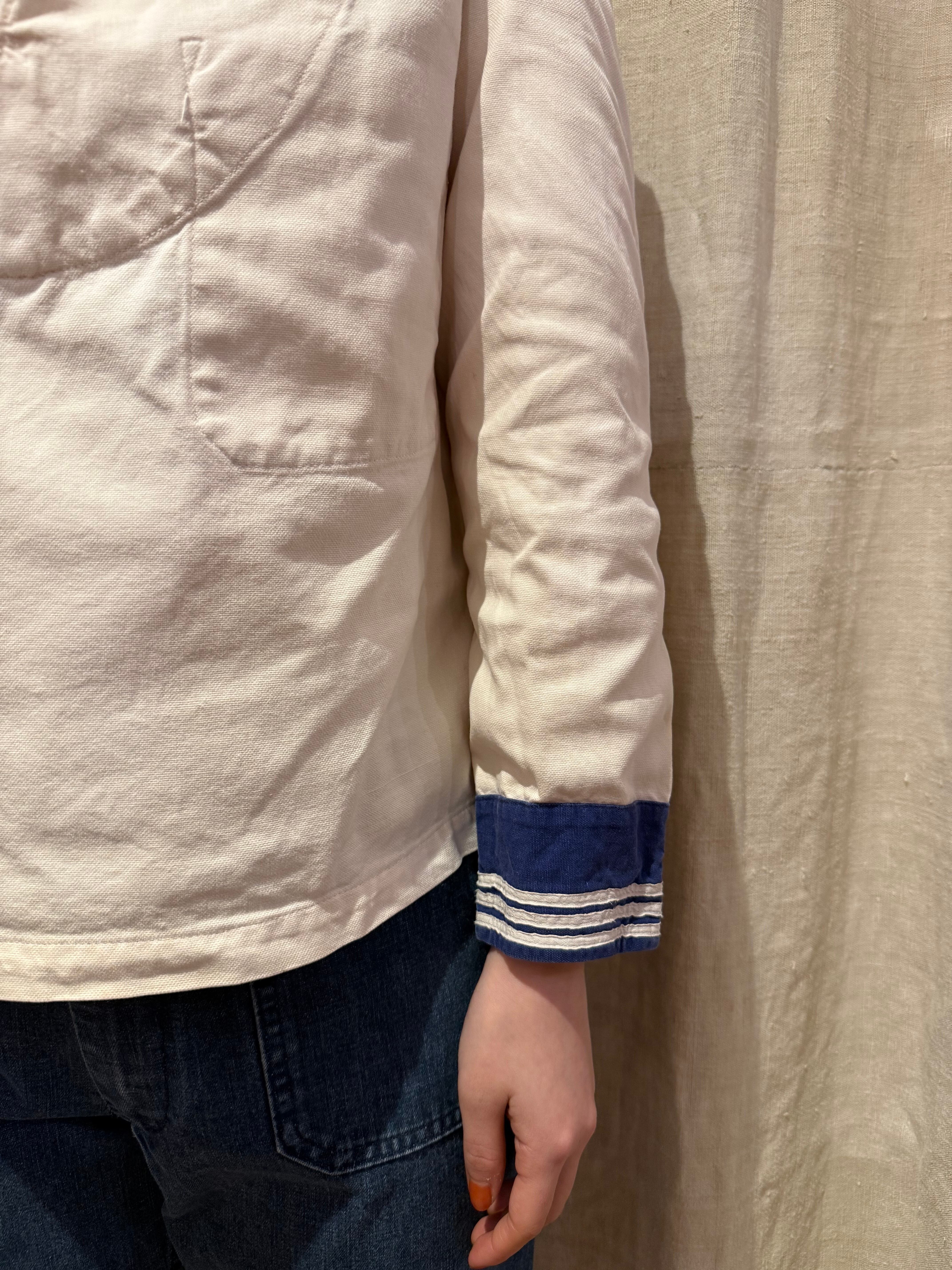 セーラーシャツでございます。ホワイトにネイビーの切り替え、三本ラインが印象的な一着。当時の作業に支障をきたさない為にポケットは内側についた仕様になっています。ダック地のような、程よくしっかりとしたコットン生地で伸縮性はなく、プルオーバーなので着脱はしにくいですが、ざっくりと空いた襟のデザインが可愛らしいです。空いたデニムやスラックスにさらっと合わせるだけでも良い一着です。