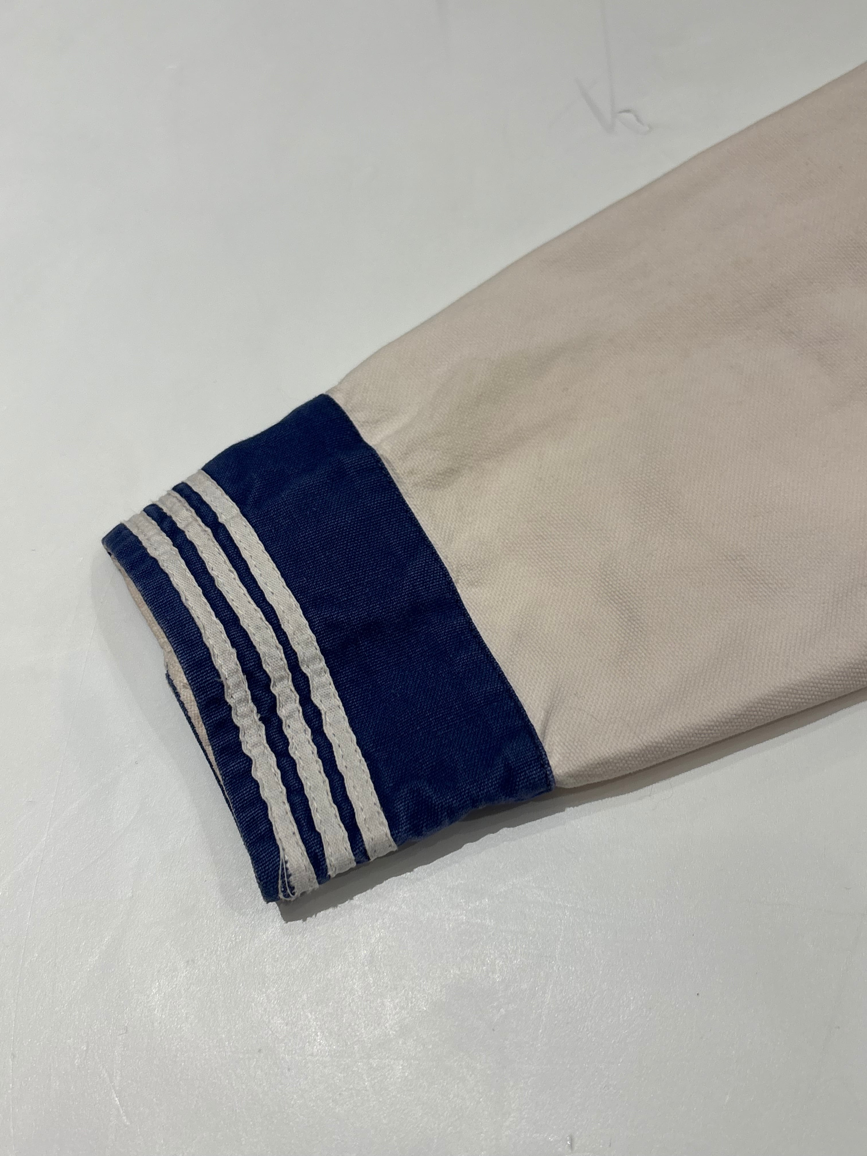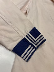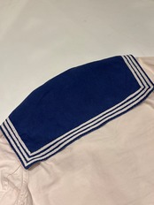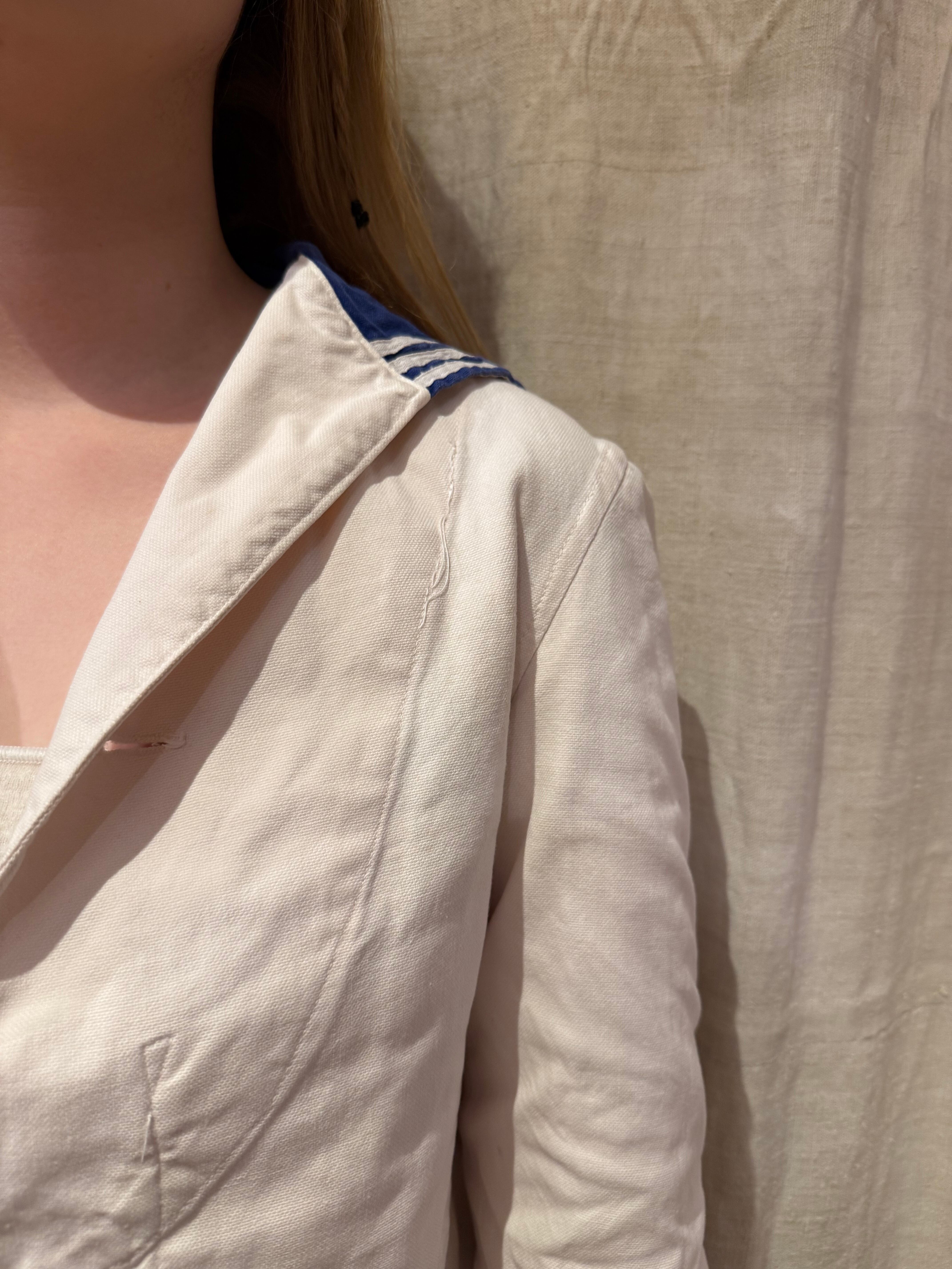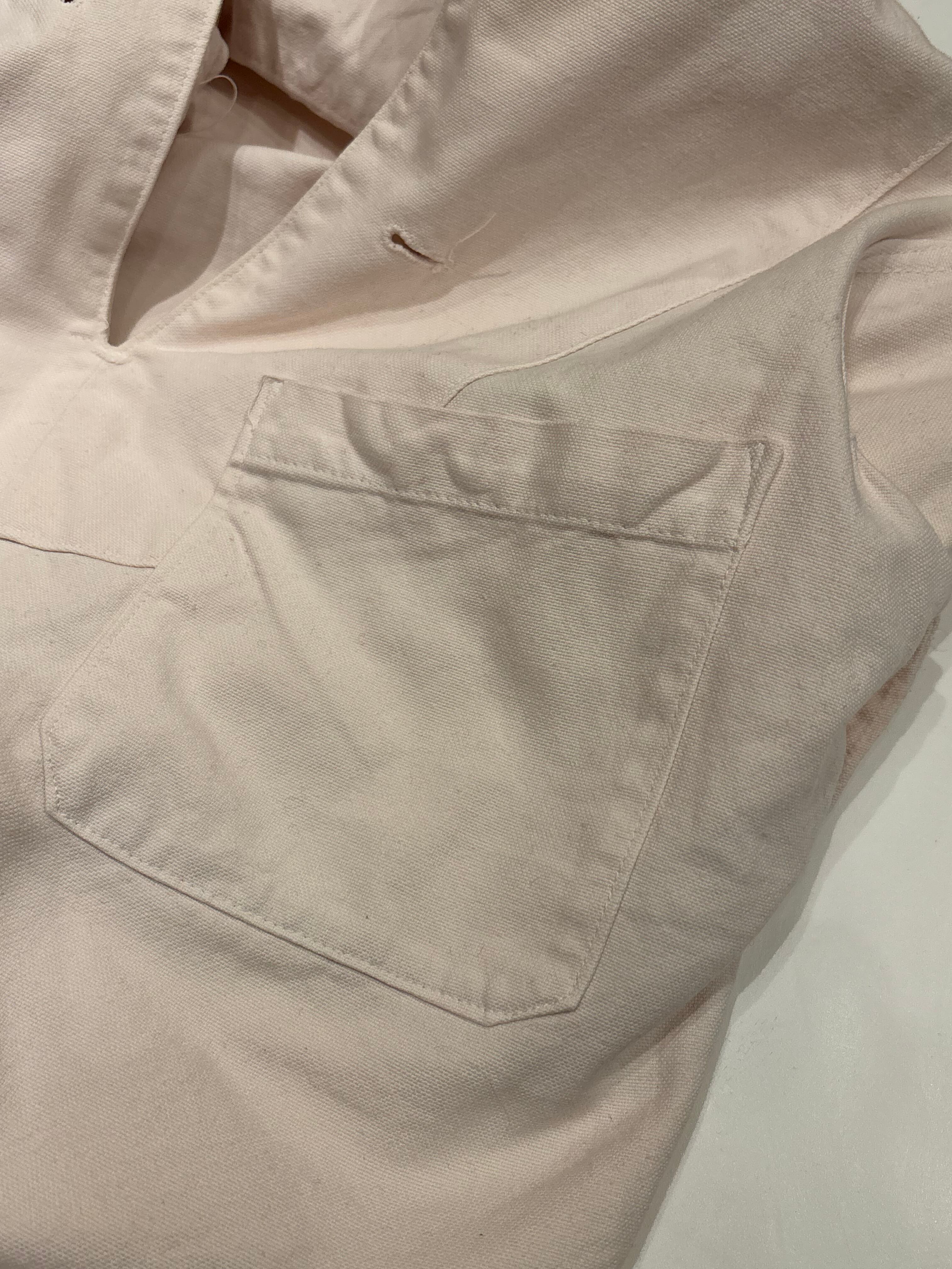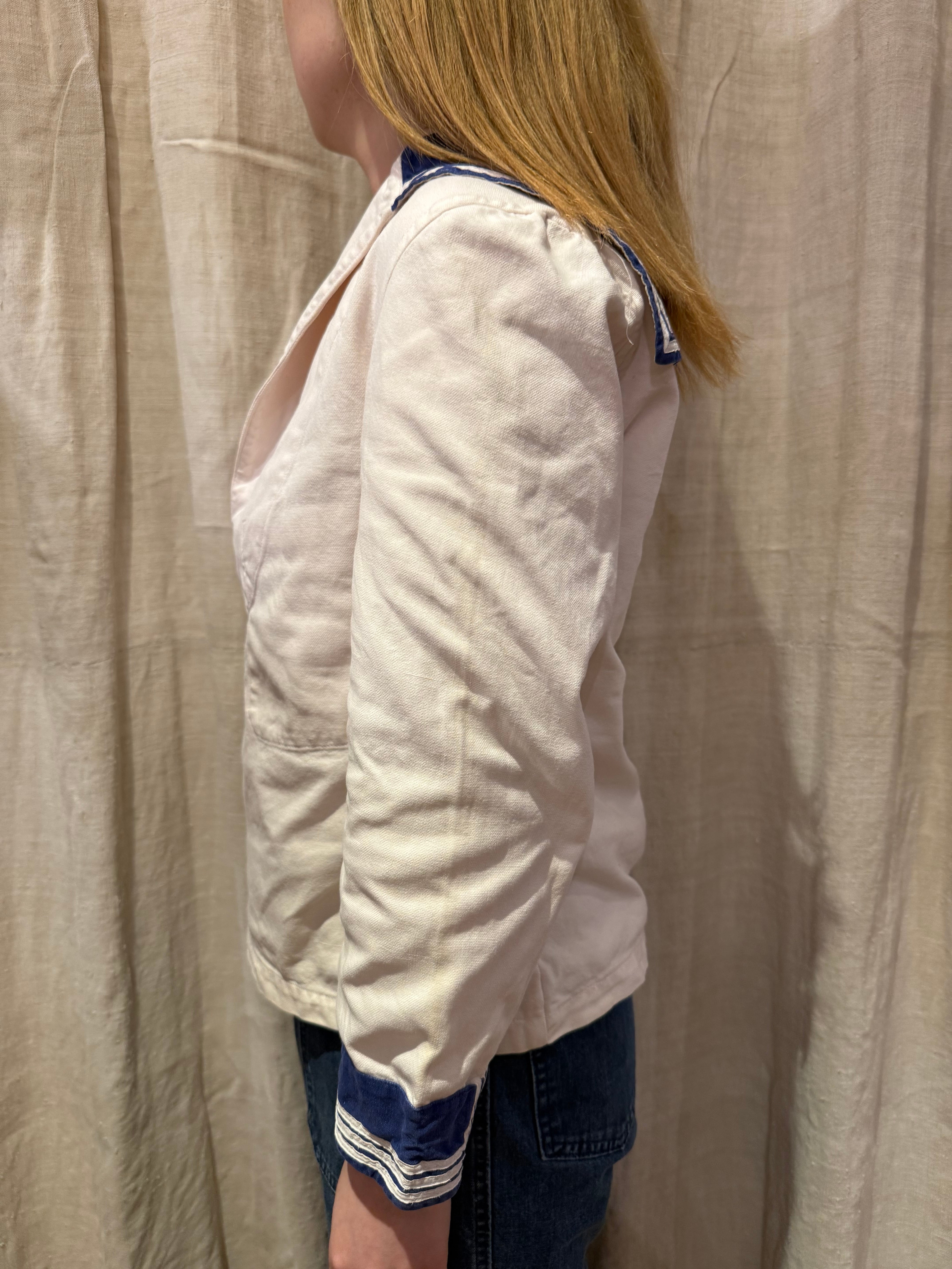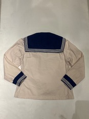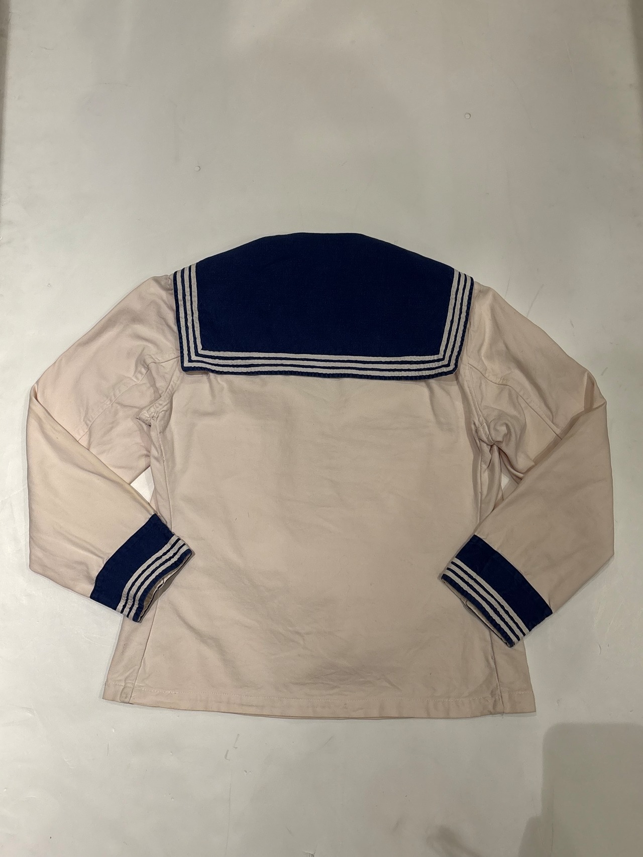 セーラーシャツでございます。ホワイトにネイビーの切り替え、三本ラインが印象的な一着。当時の作業に支障をきたさない為にポケットは内側についた仕様になっています。ダック地のような、程よくしっかりとしたコットン生地で伸縮性はなく、プルオーバーなので着脱はしにくいですが、ざっくりと空いた襟のデザインが可愛らしいです。空いたデニムやスラックスにさらっと合わせるだけでも良い一着です。