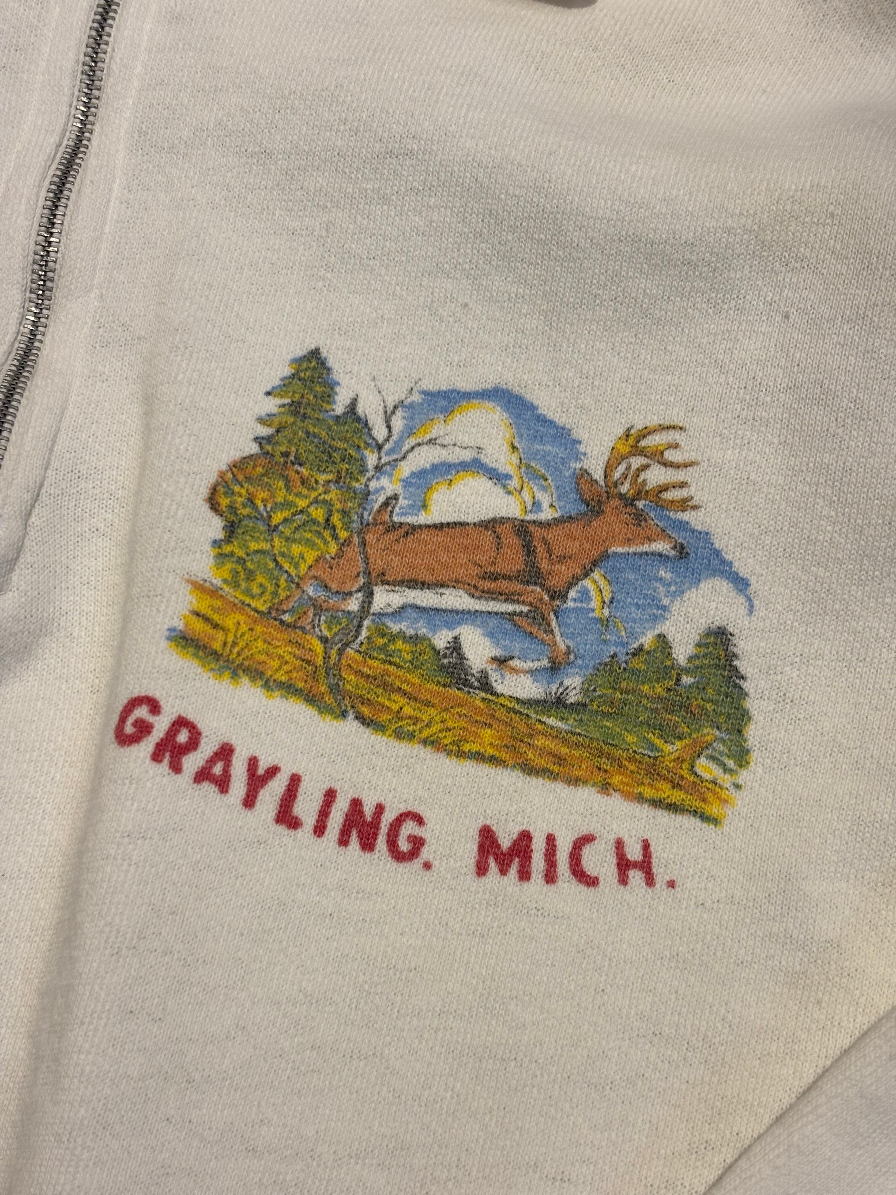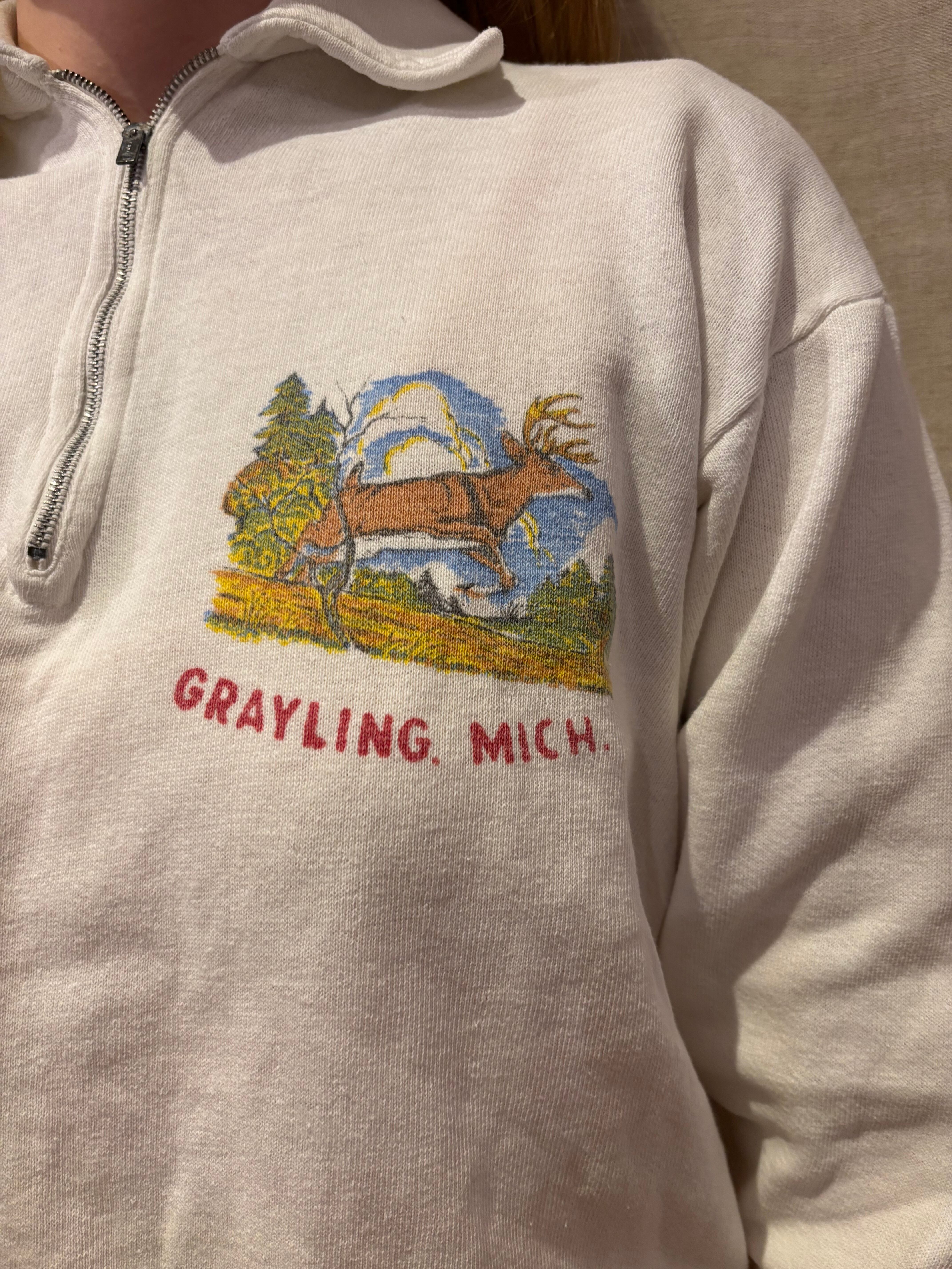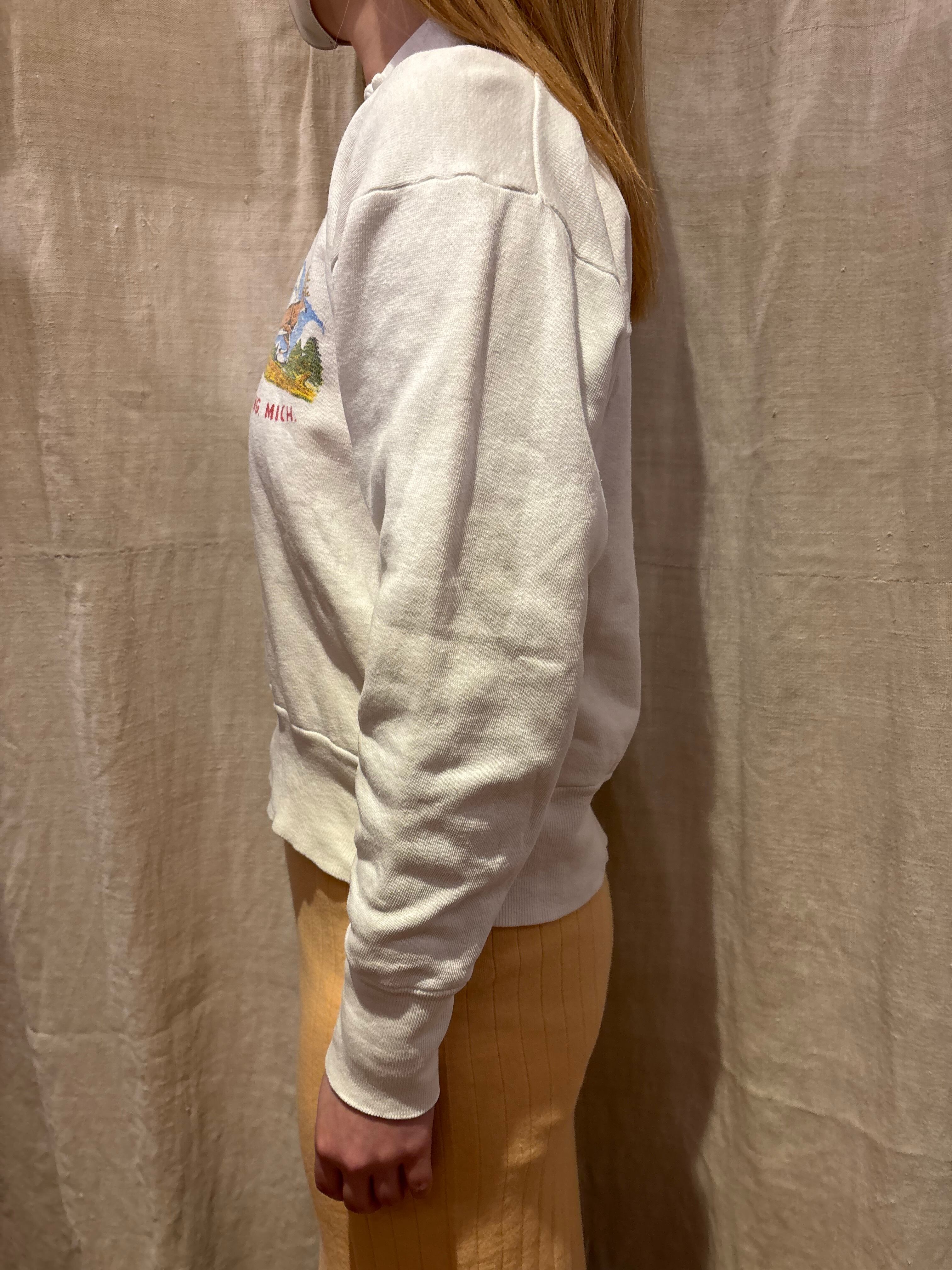 古いスウェットです。まだまだ肉厚な肌触りです。胸元の鹿の染み込みプリントが特徴でミシガン州の、釣りや環境保全の文脈だと思われます。
