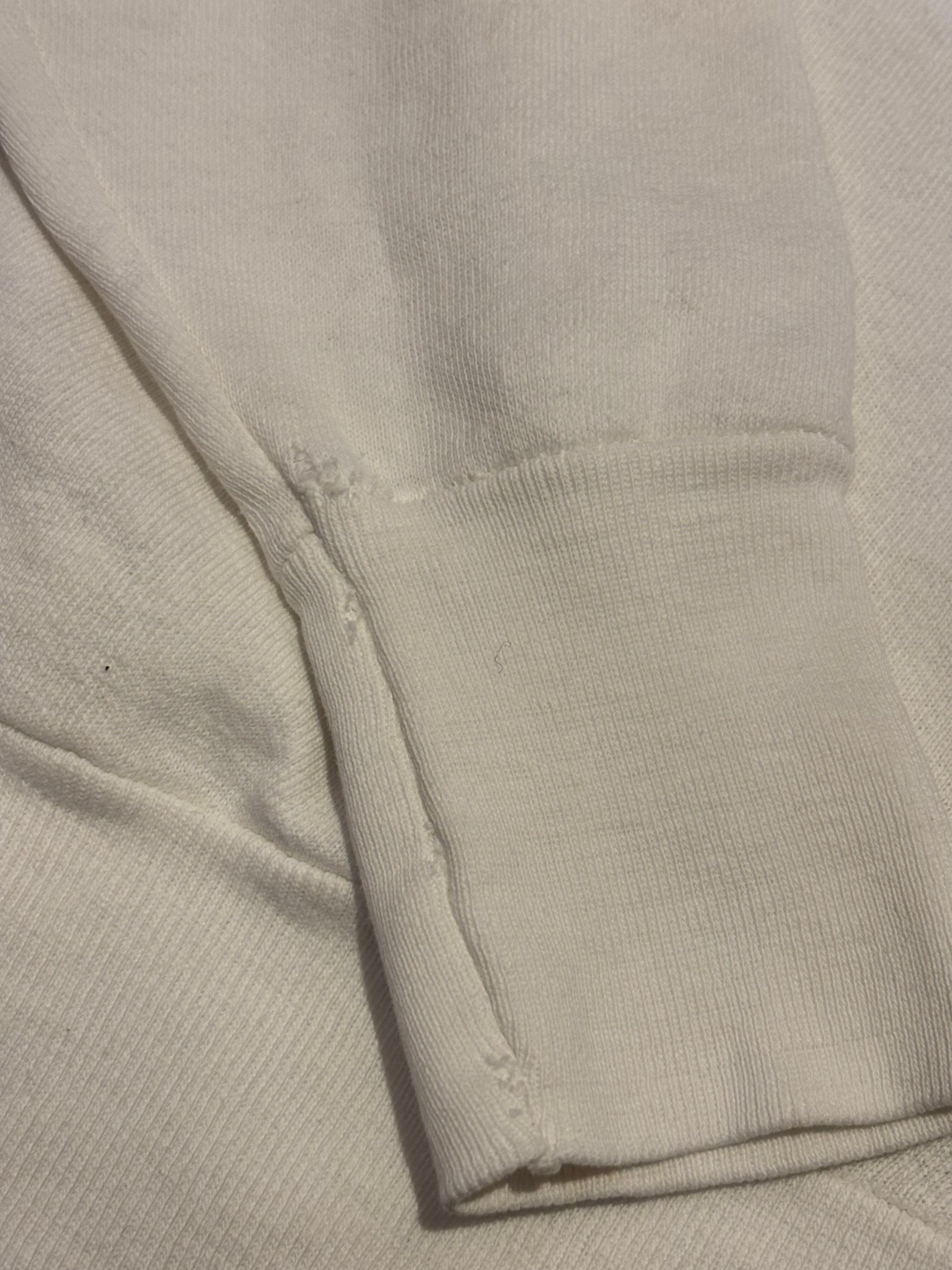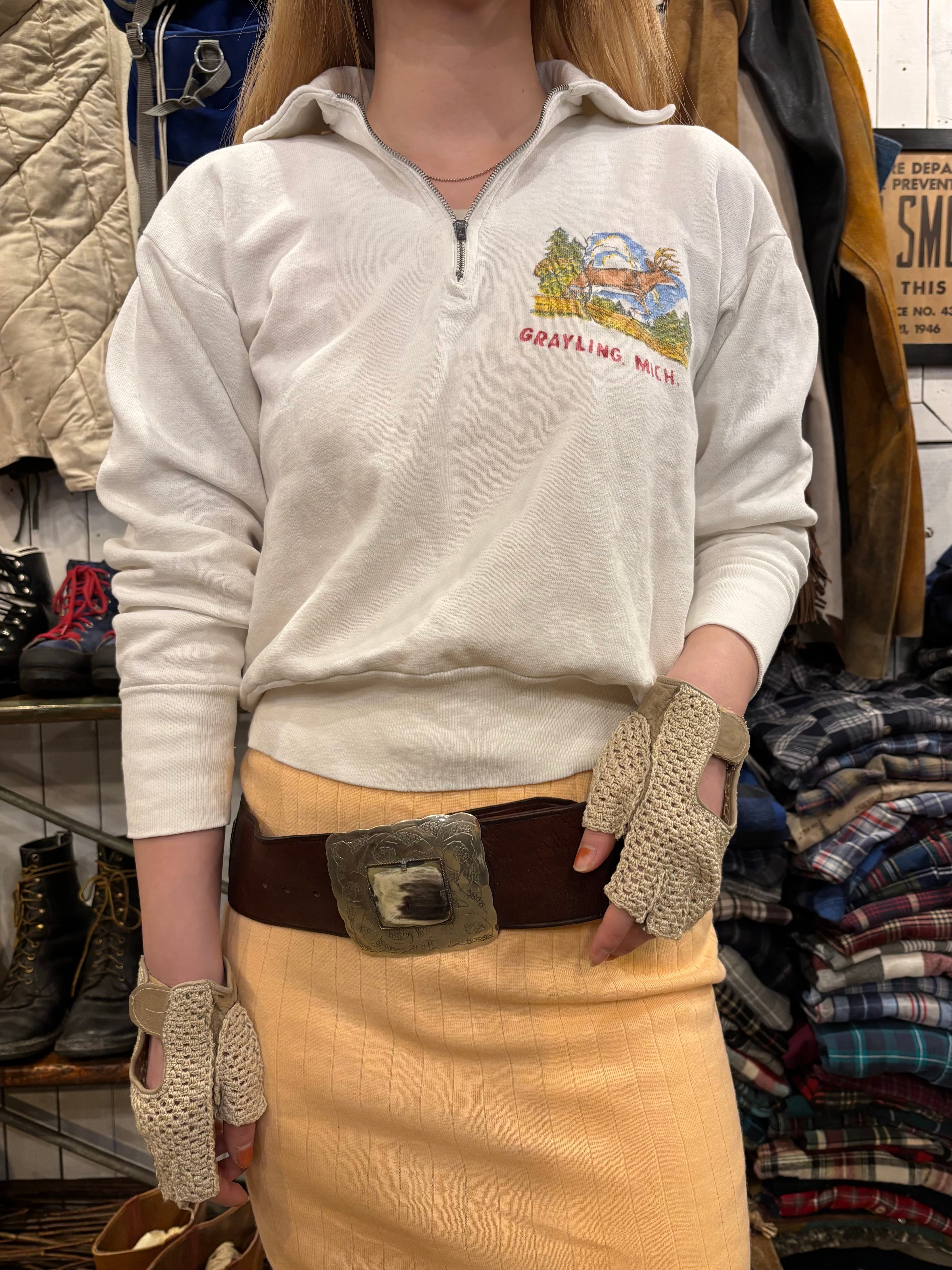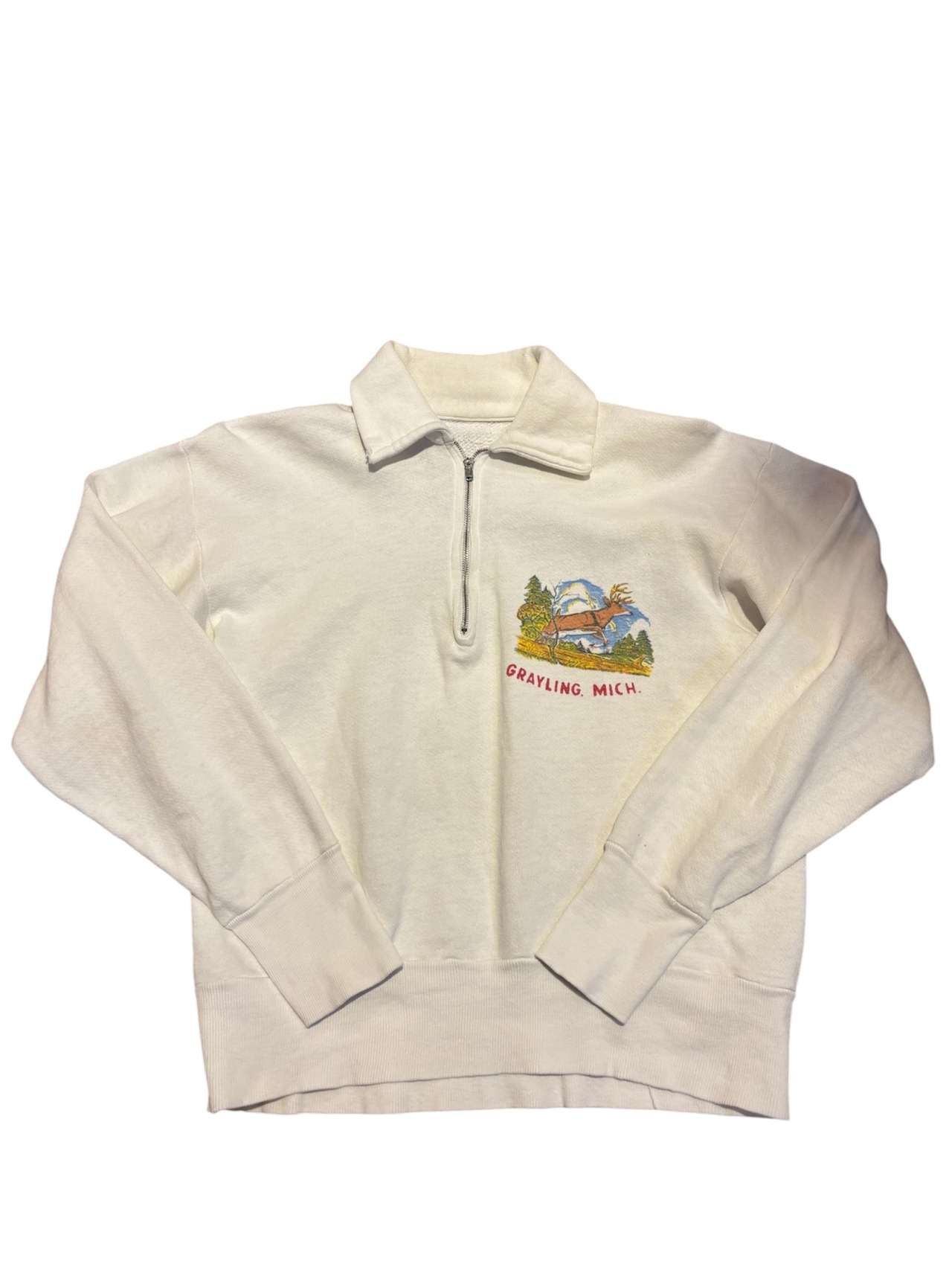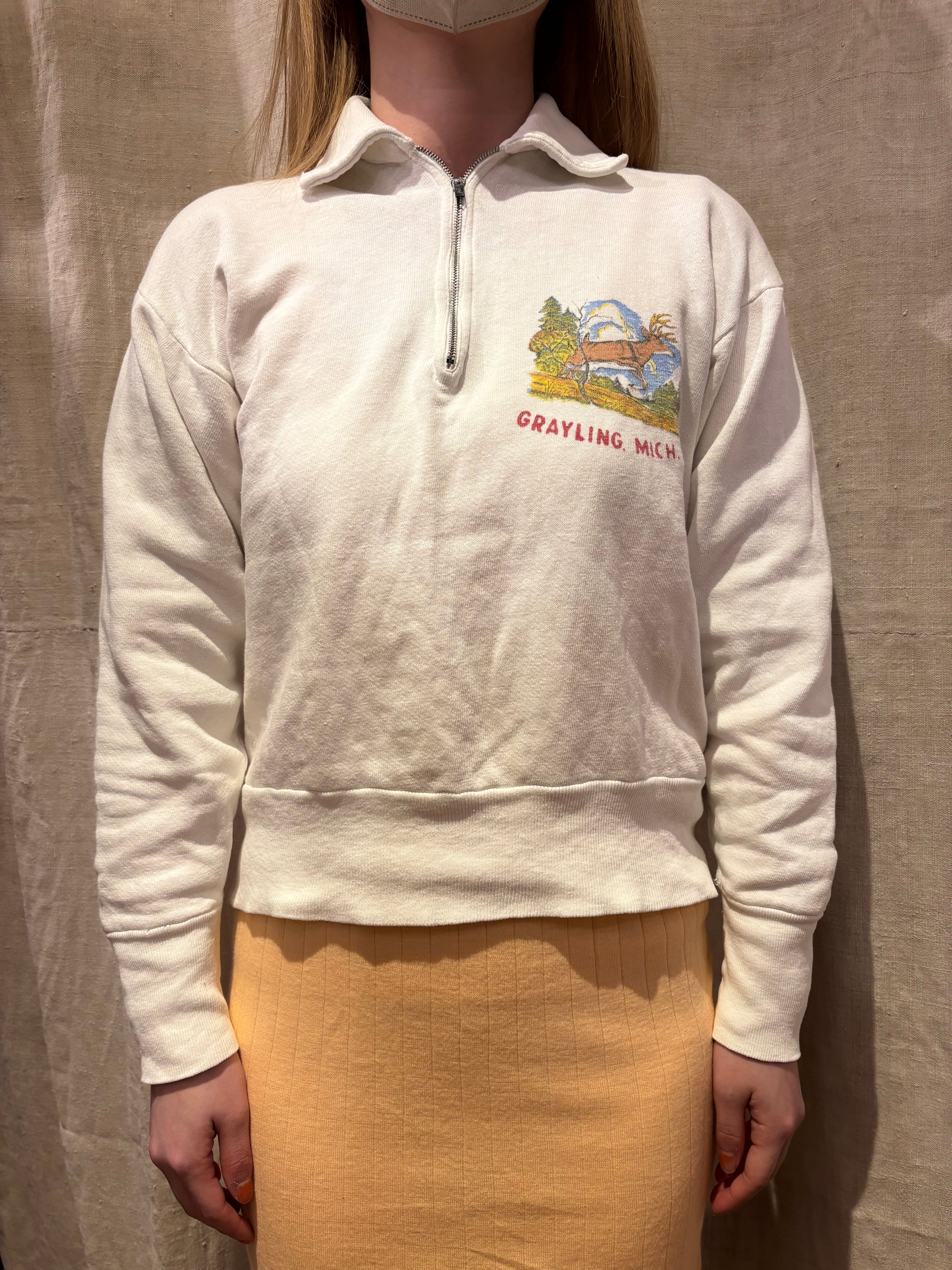 古いスウェットです。まだまだ肉厚な肌触りです。胸元の鹿の染み込みプリントが特徴でミシガン州の、釣りや環境保全の文脈だと思われます。