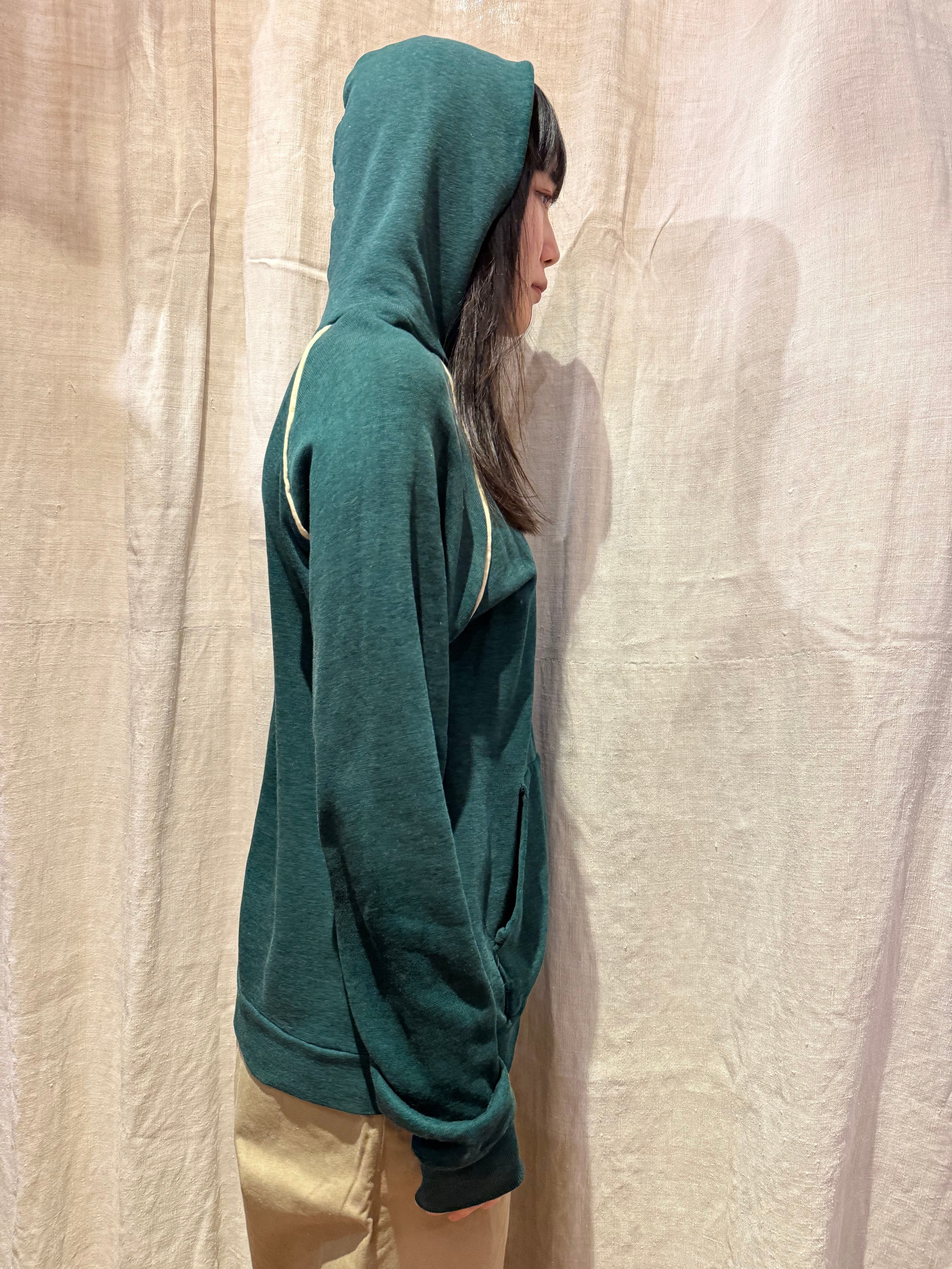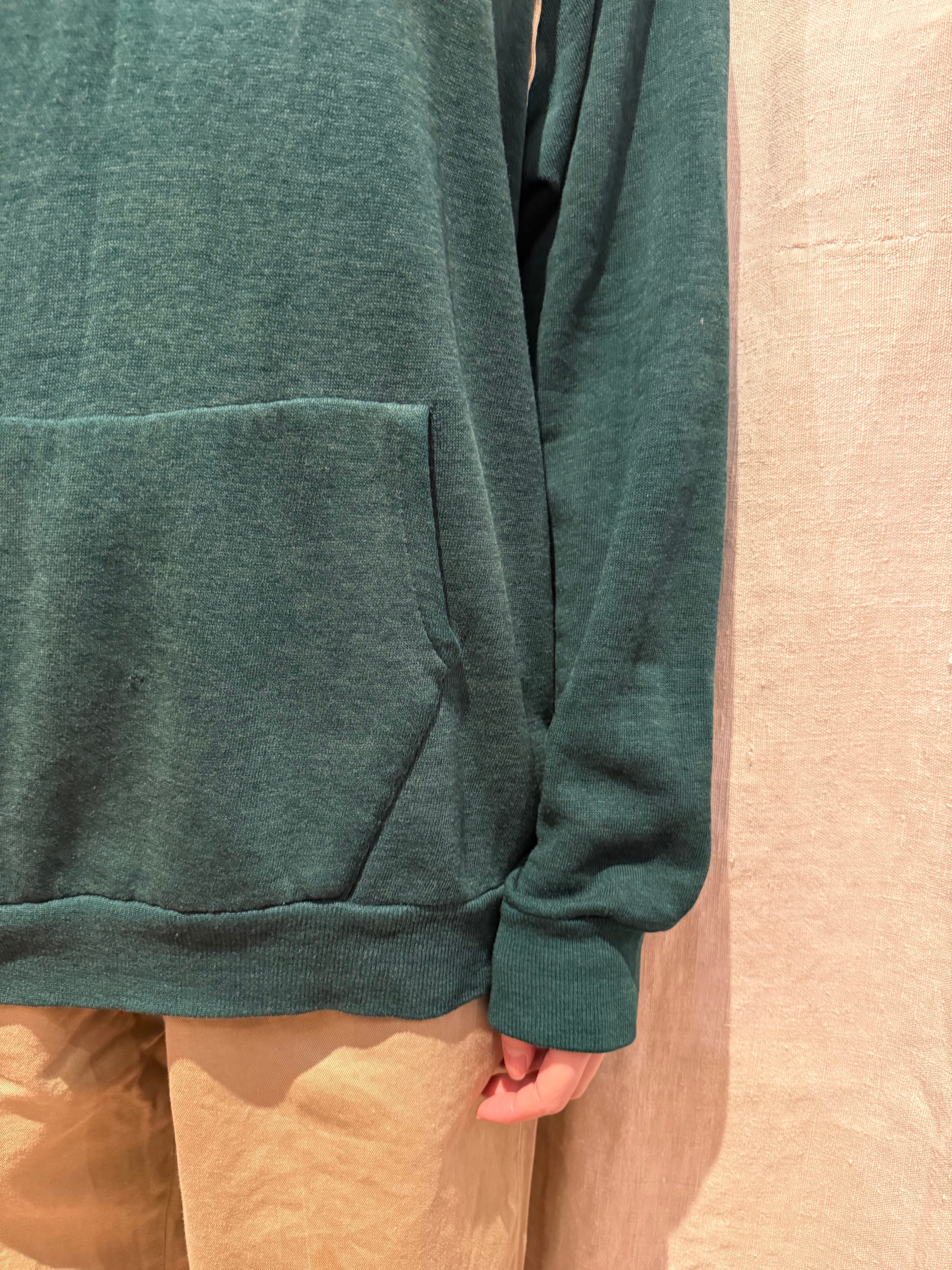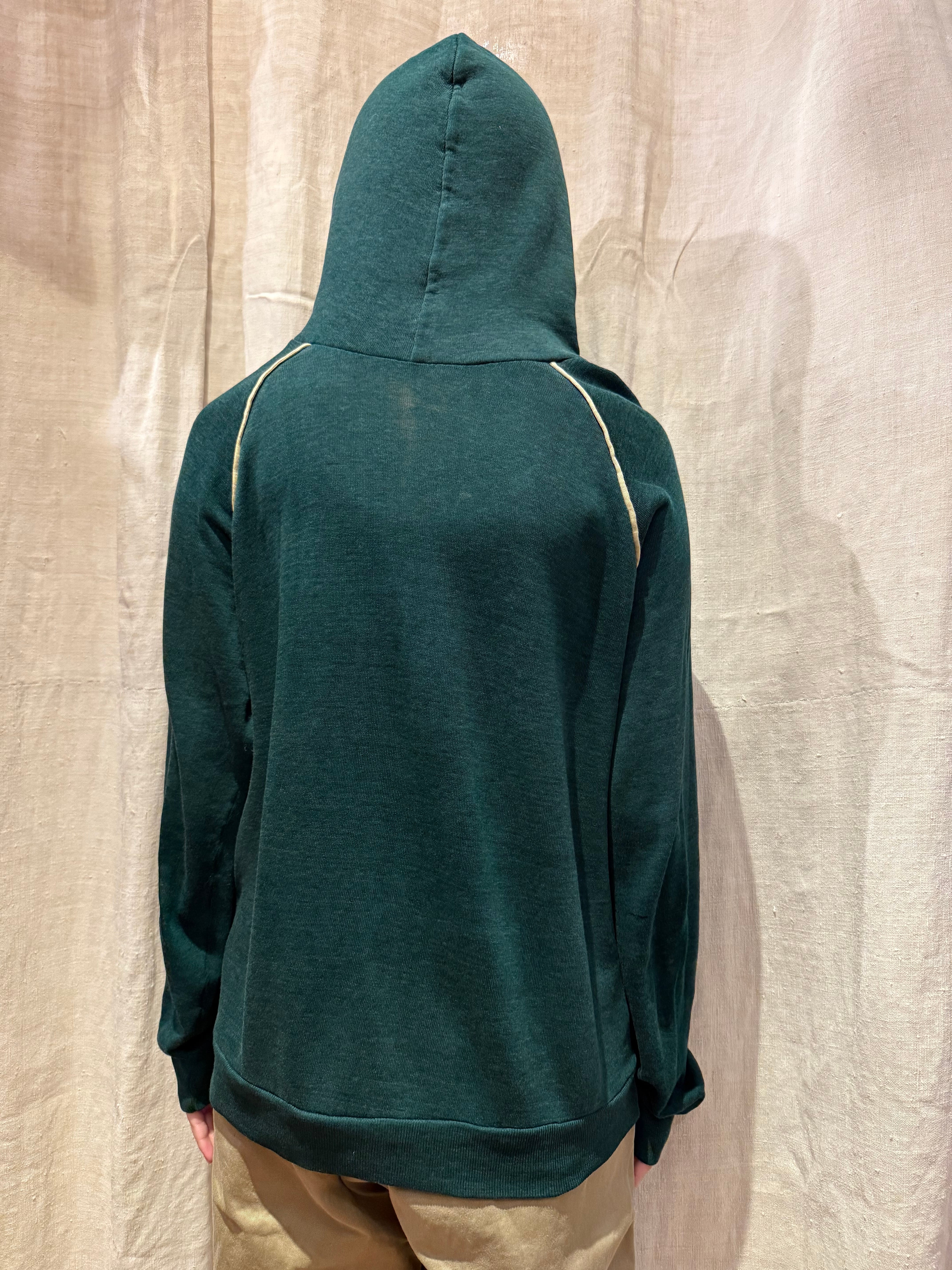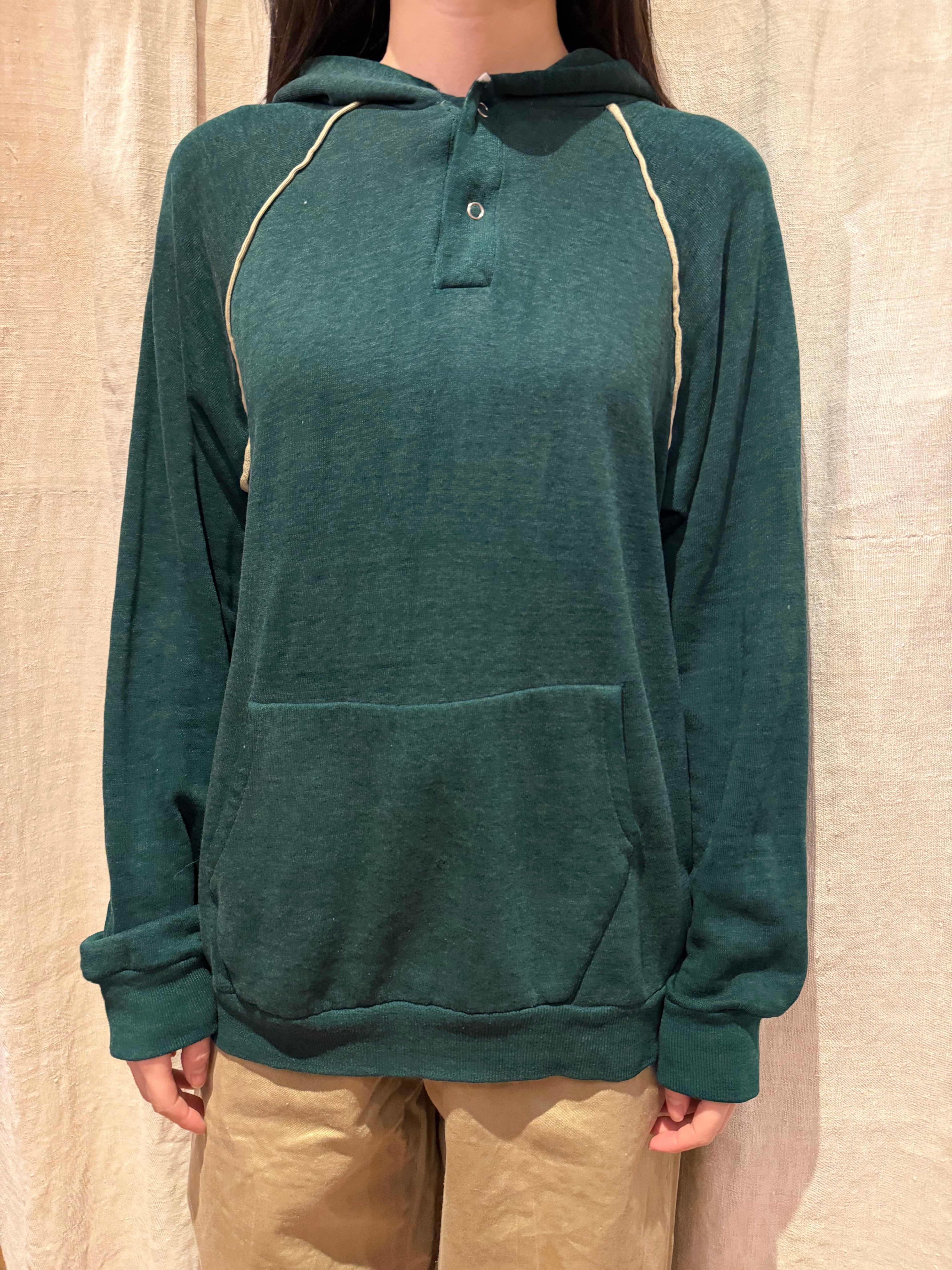 プルオーバーのフーディでございます。ポリエステルの混ざったスウェット生地で、軽い着心地です。深めのグリーンが可愛らしく、ラグランの部分に白いラインが入っているのもポイントです。春先にも使えるのでオススメです。