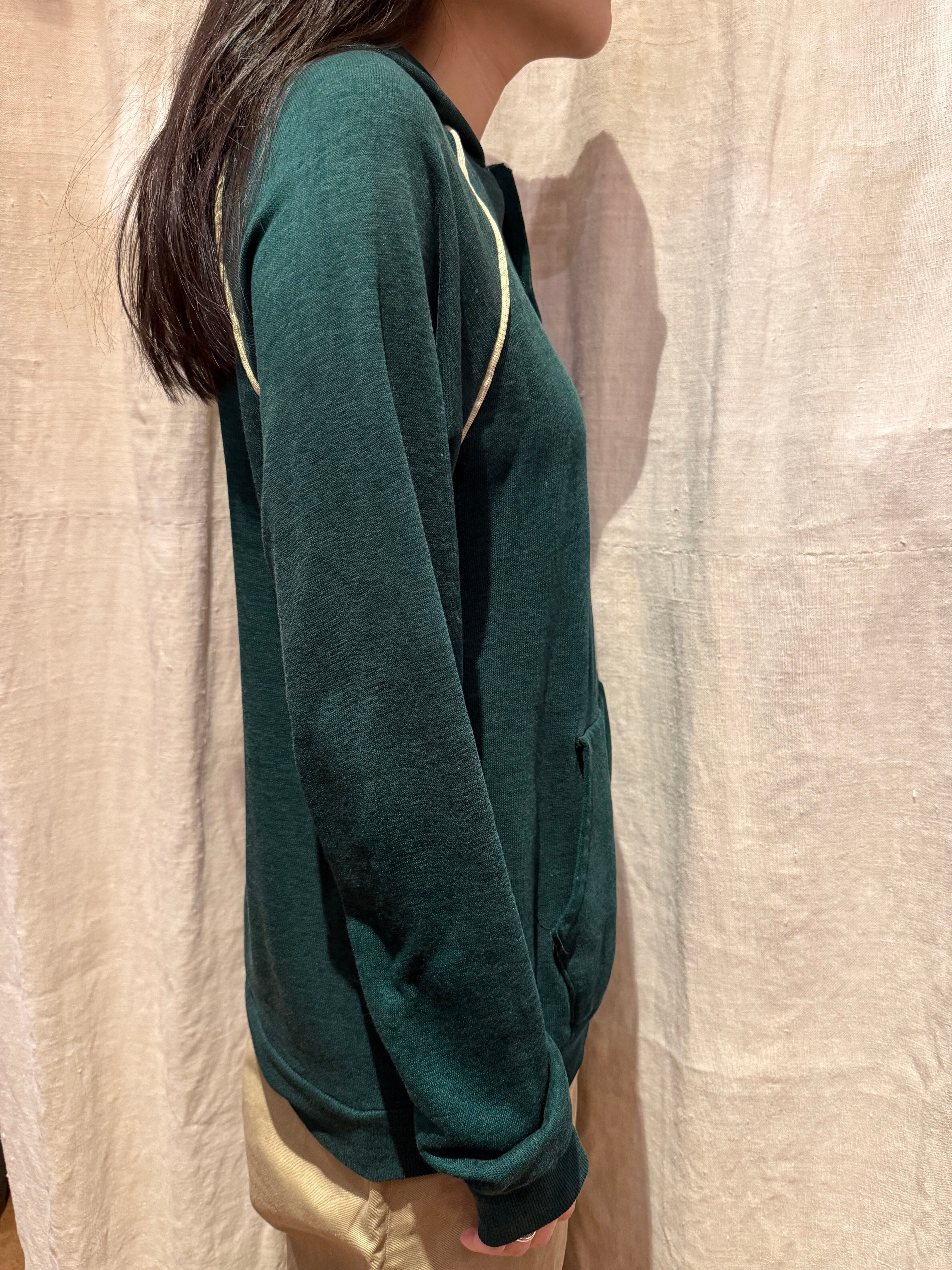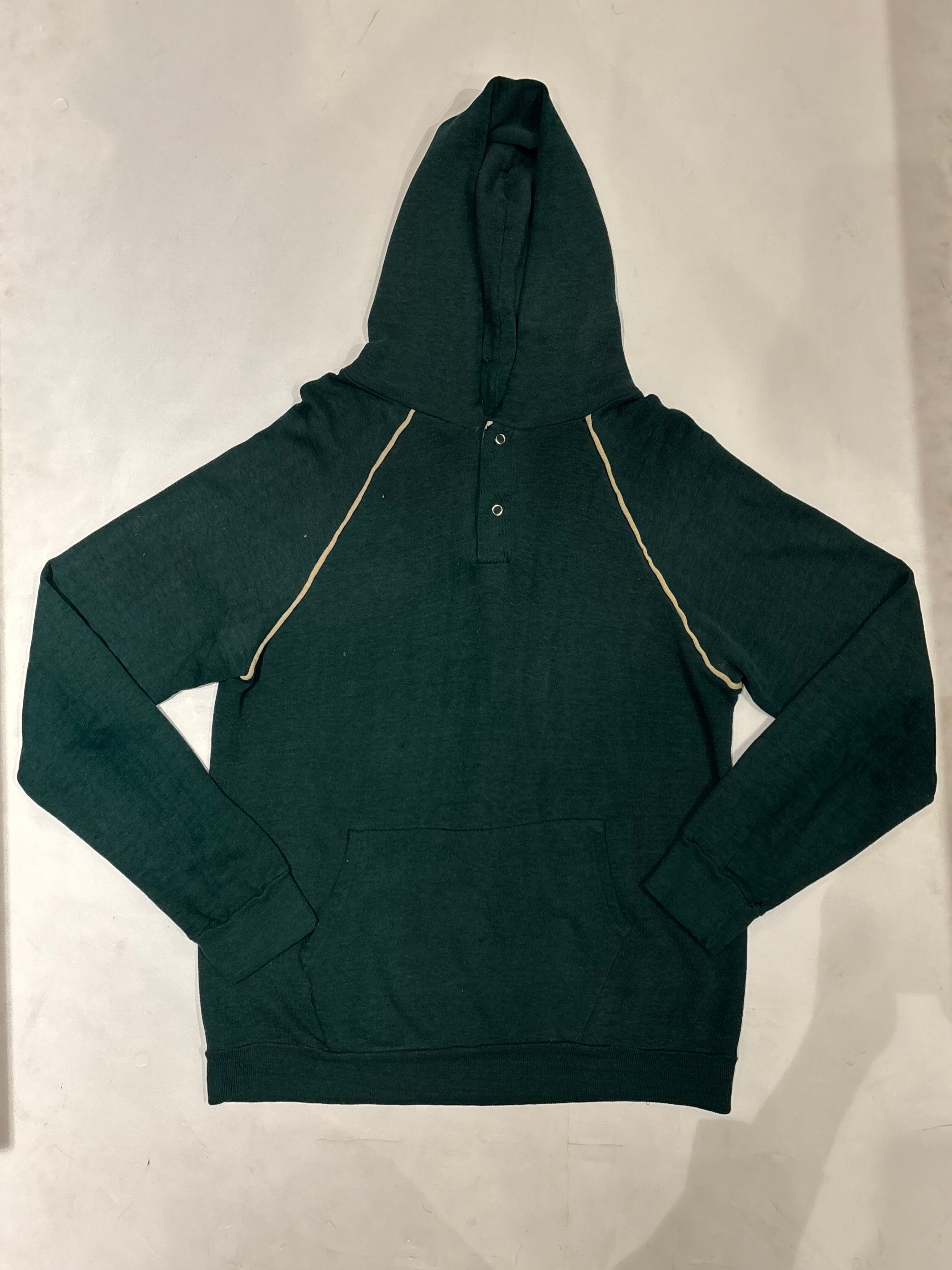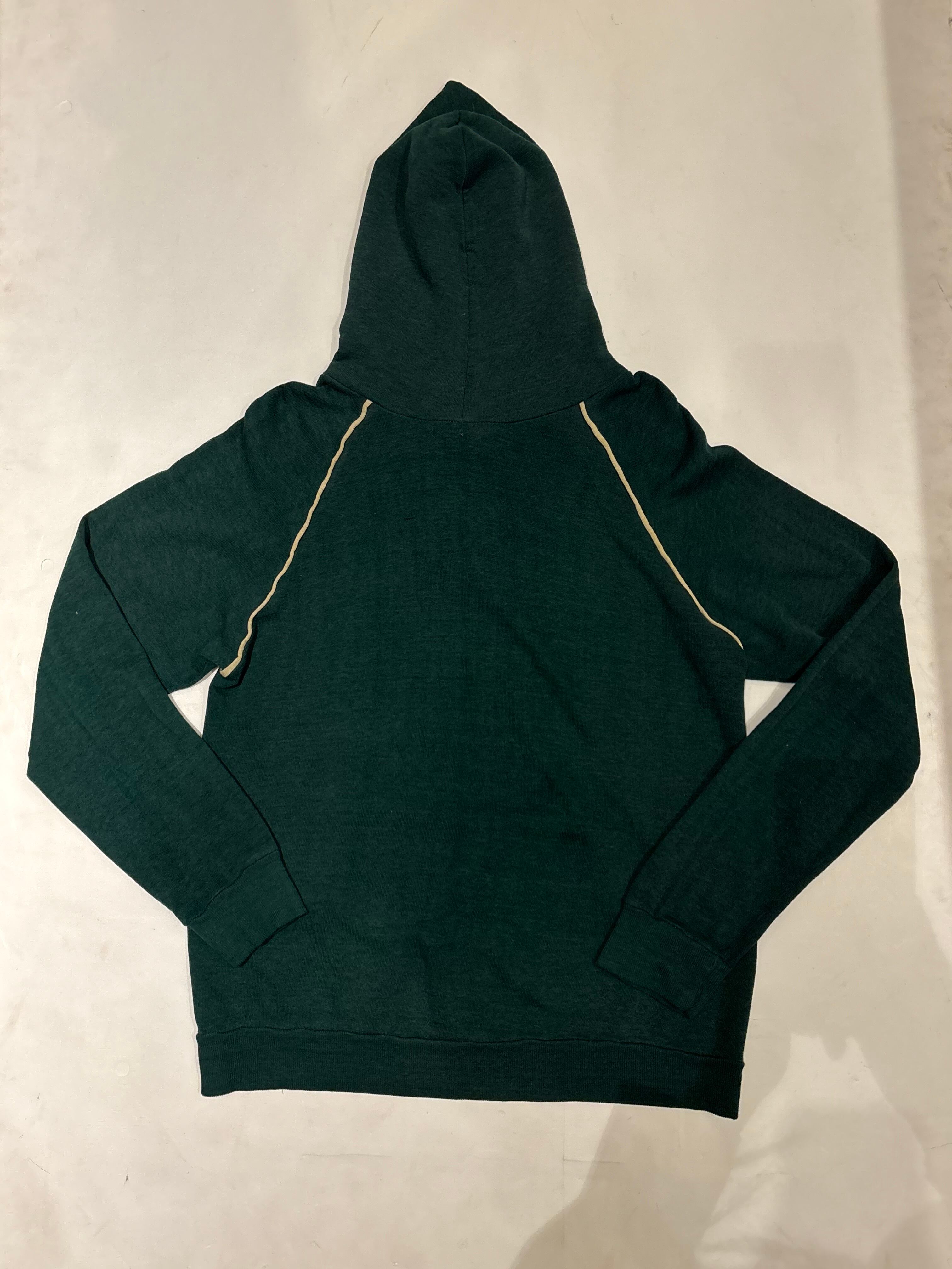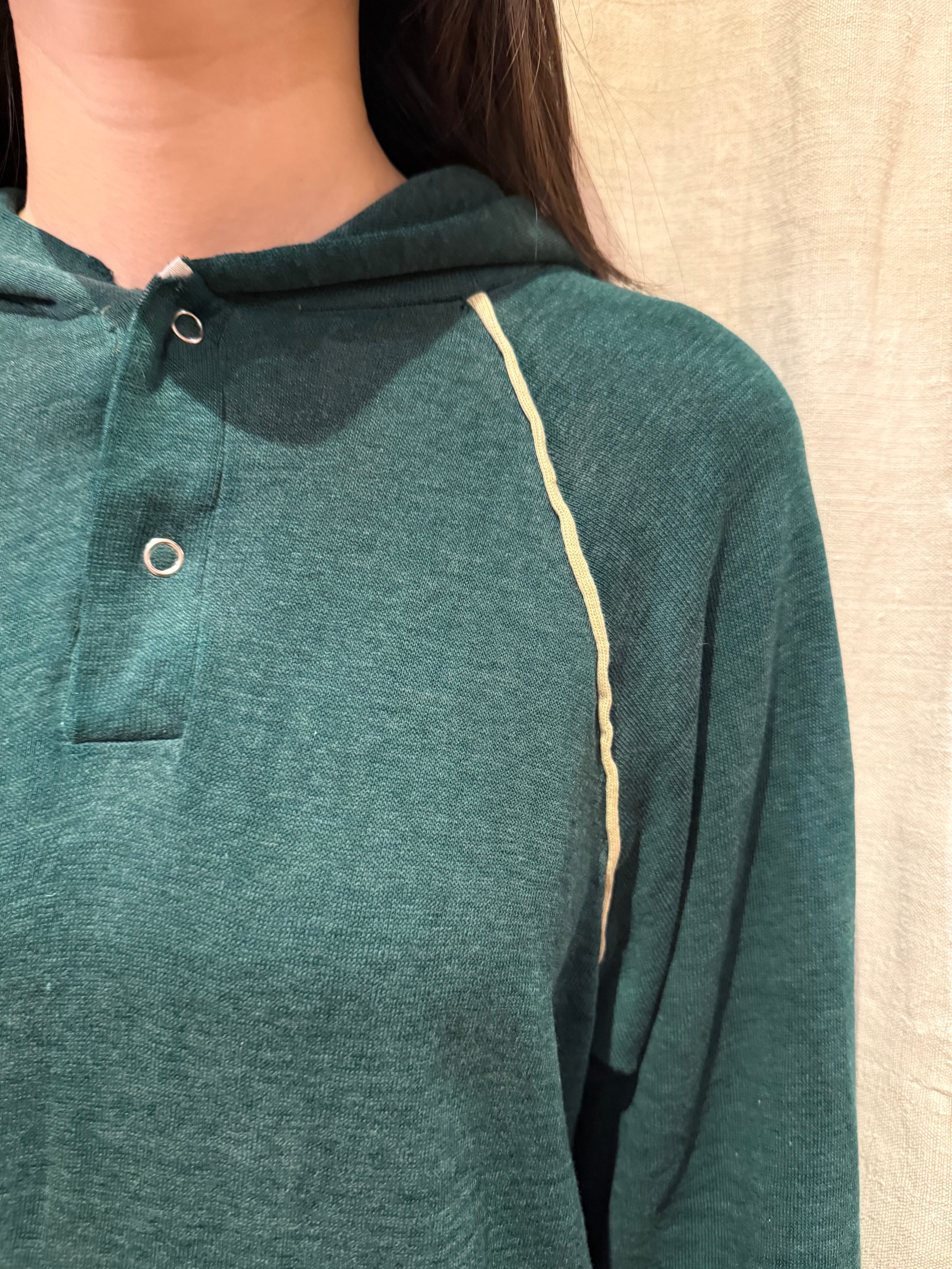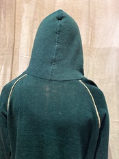 プルオーバーのフーディでございます。ポリエステルの混ざったスウェット生地で、軽い着心地です。深めのグリーンが可愛らしく、ラグランの部分に白いラインが入っているのもポイントです。春先にも使えるのでオススメです。