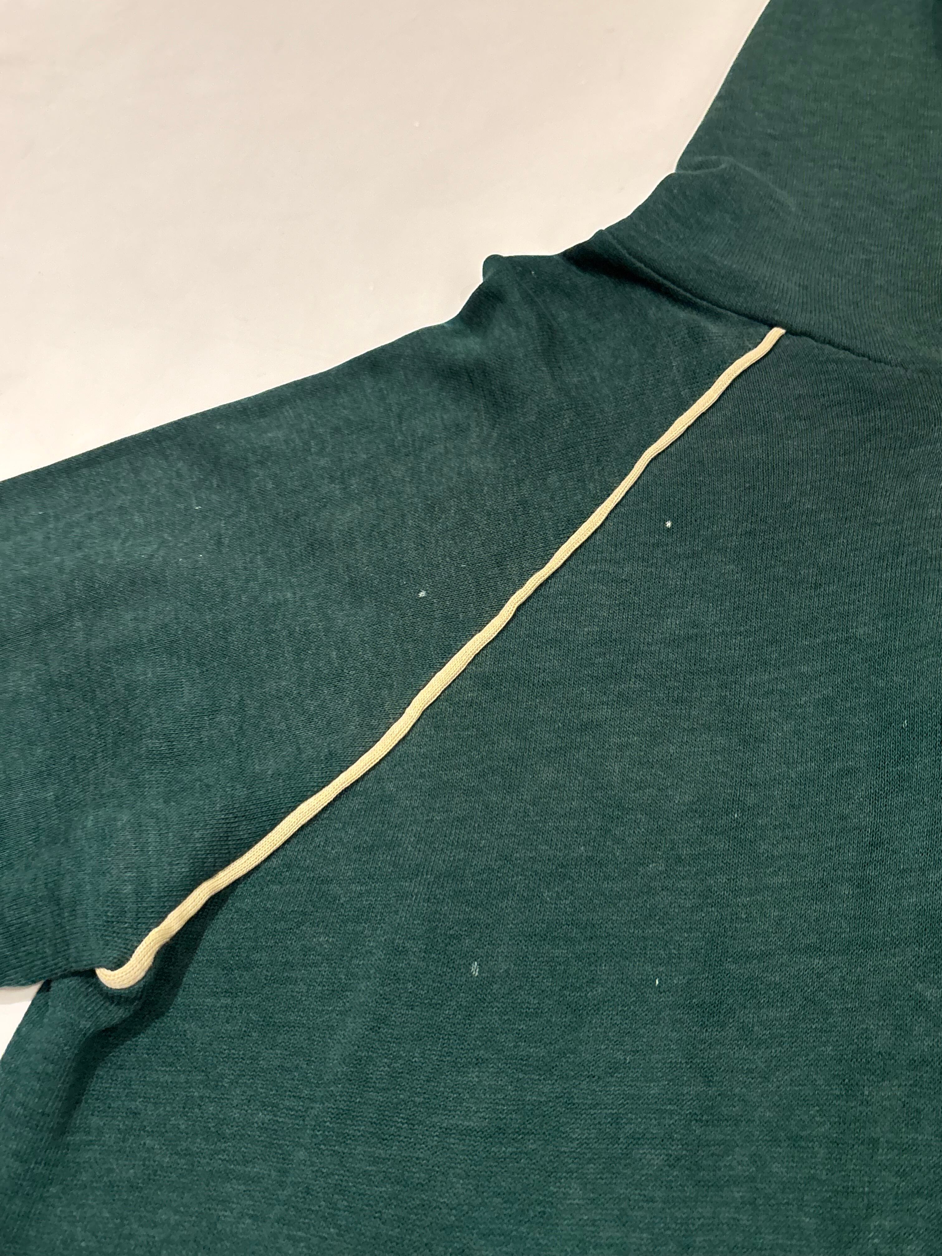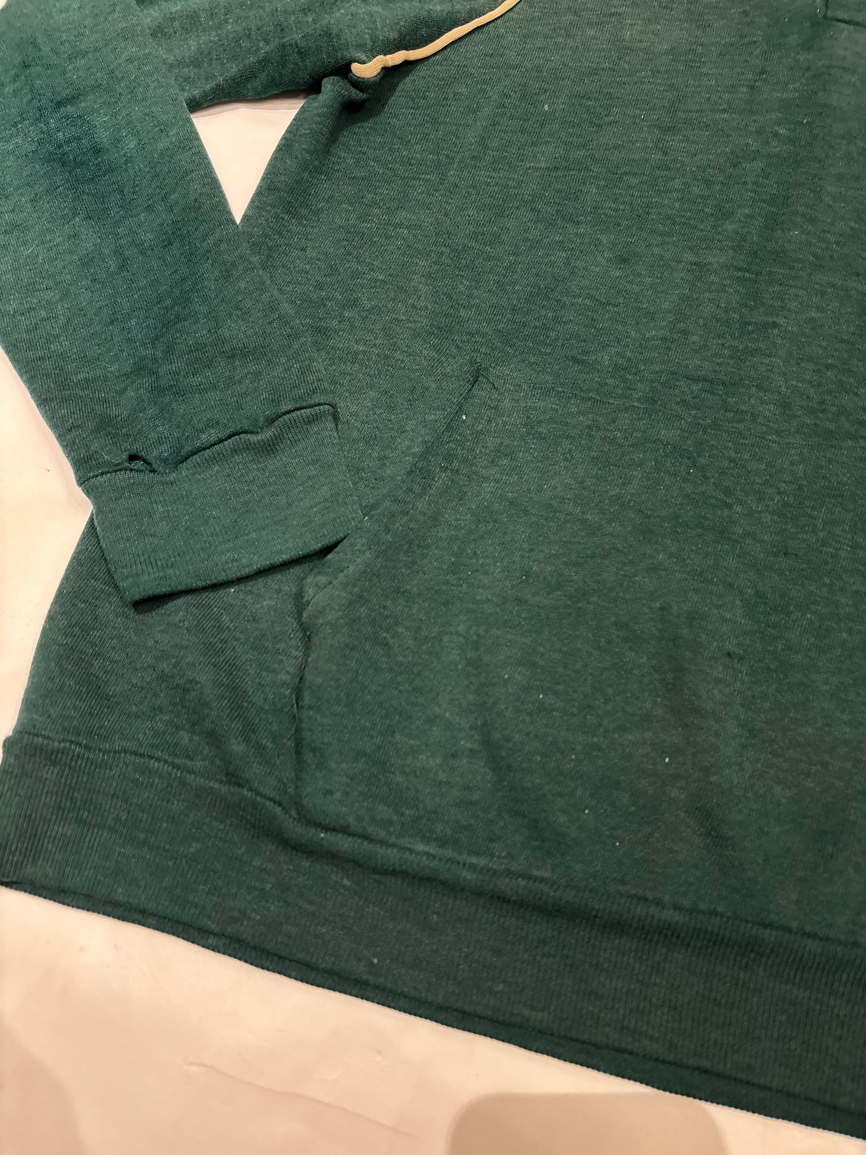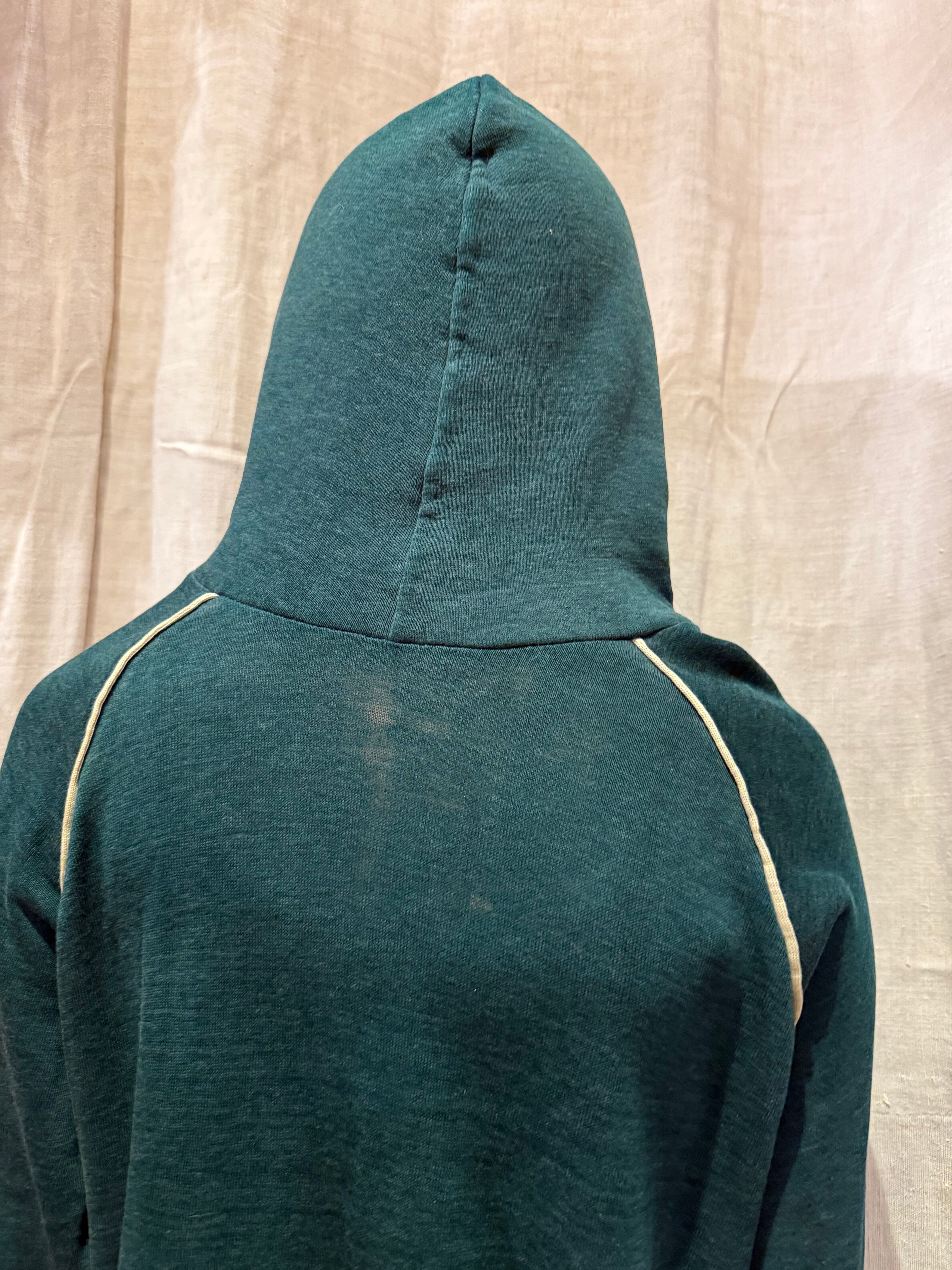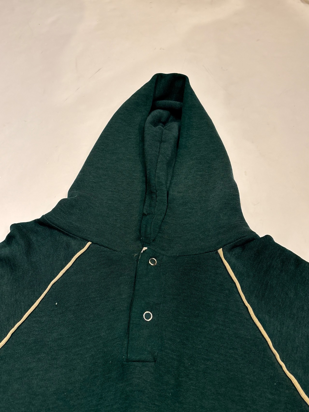 プルオーバーのフーディでございます。ポリエステルの混ざったスウェット生地で、軽い着心地です。深めのグリーンが可愛らしく、ラグランの部分に白いラインが入っているのもポイントです。春先にも使えるのでオススメです。