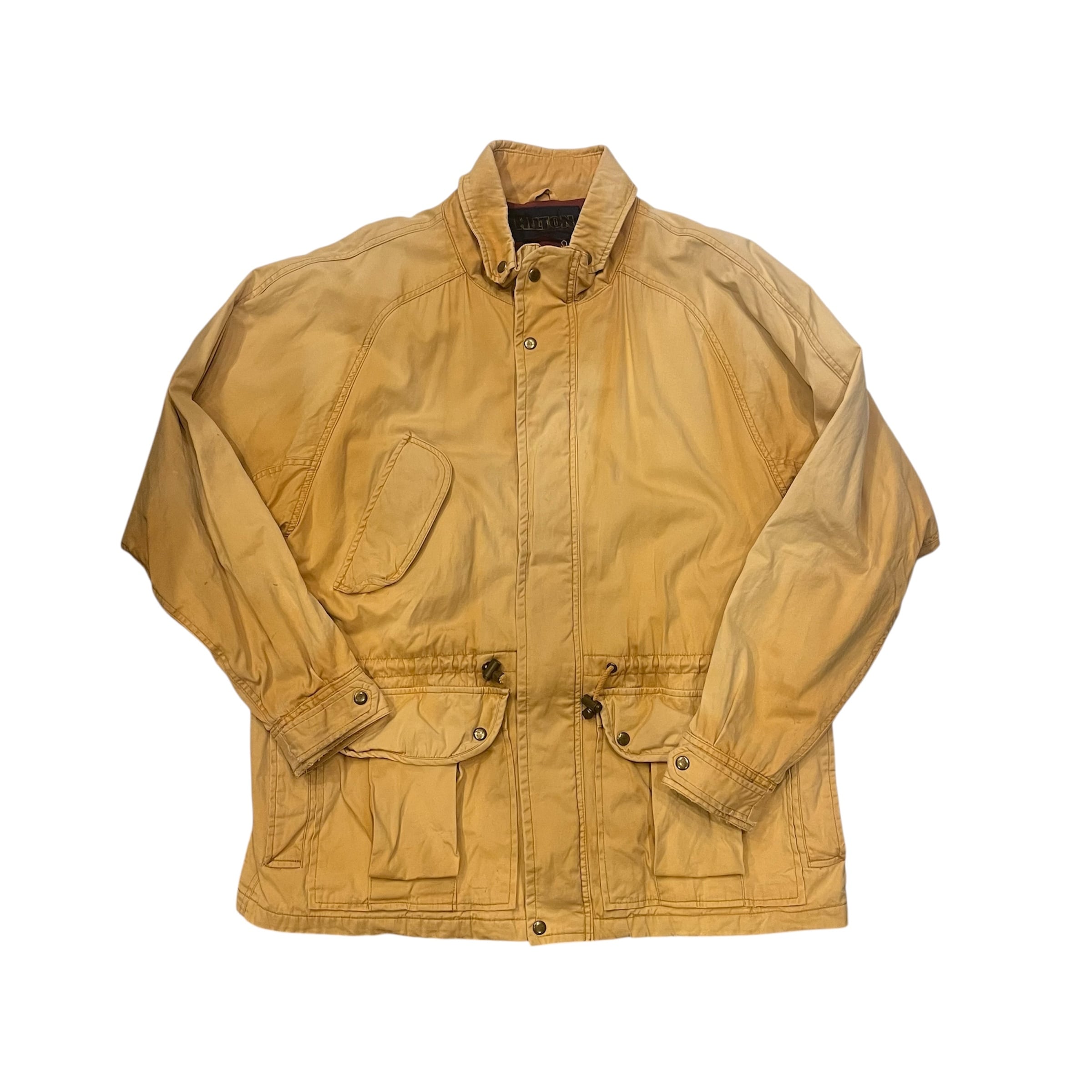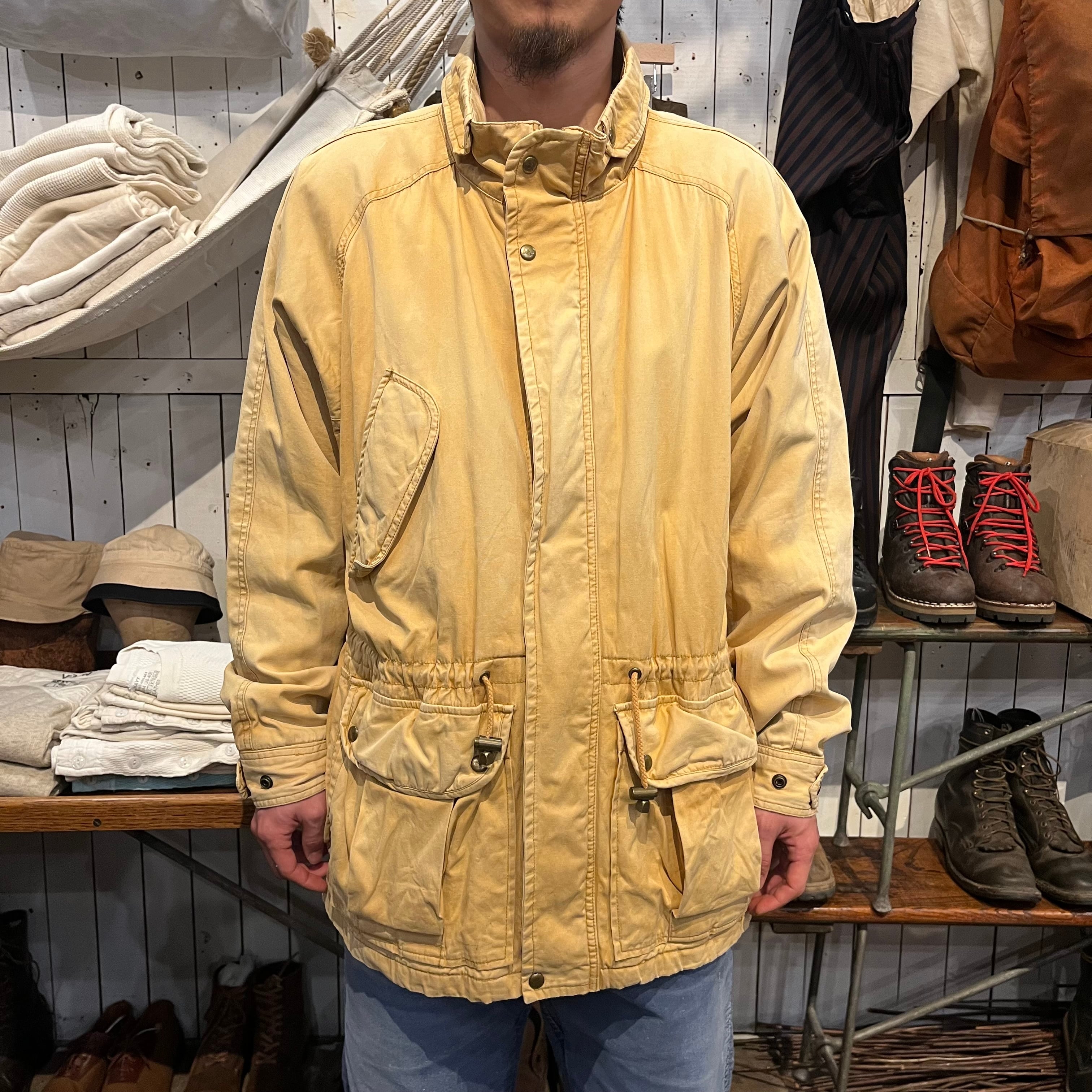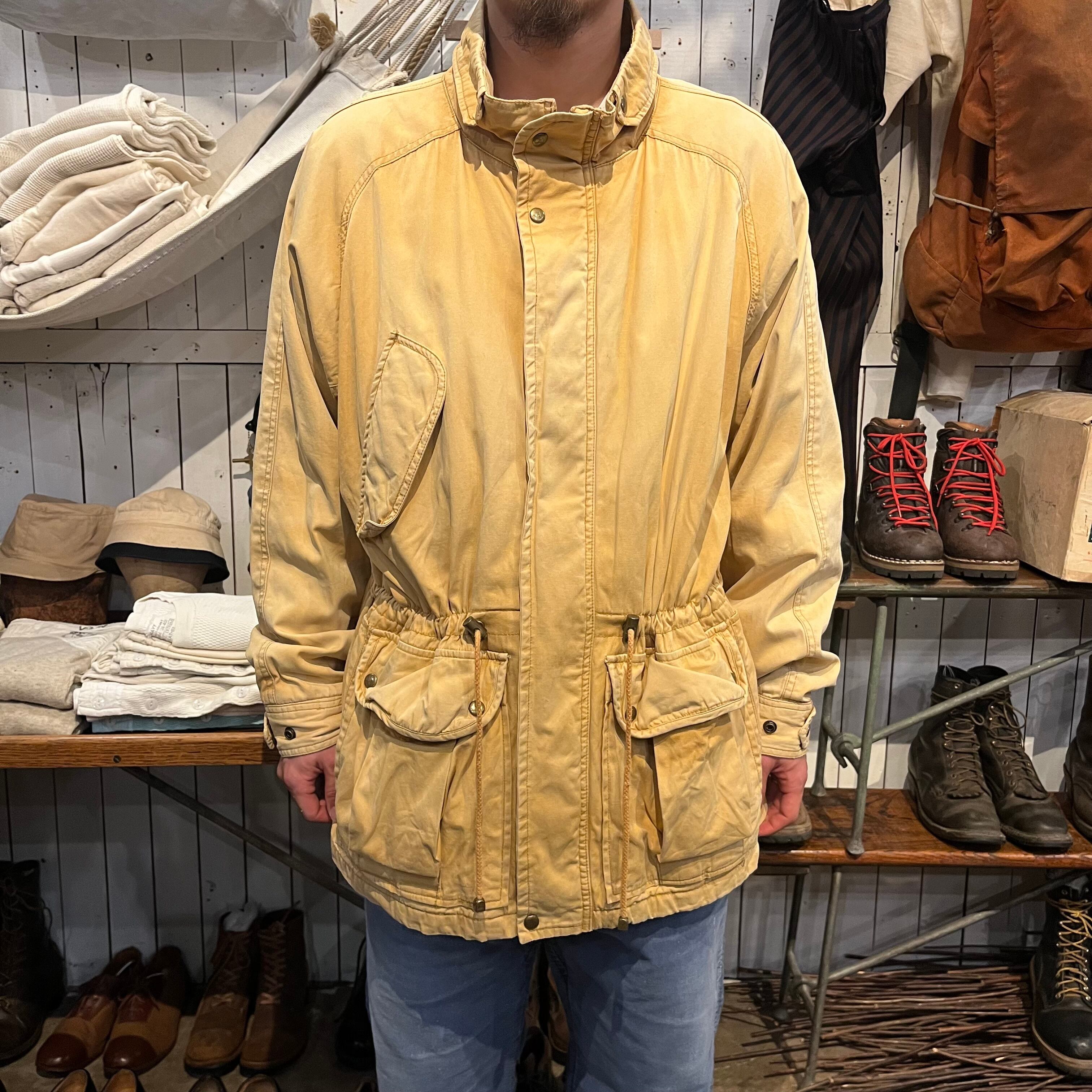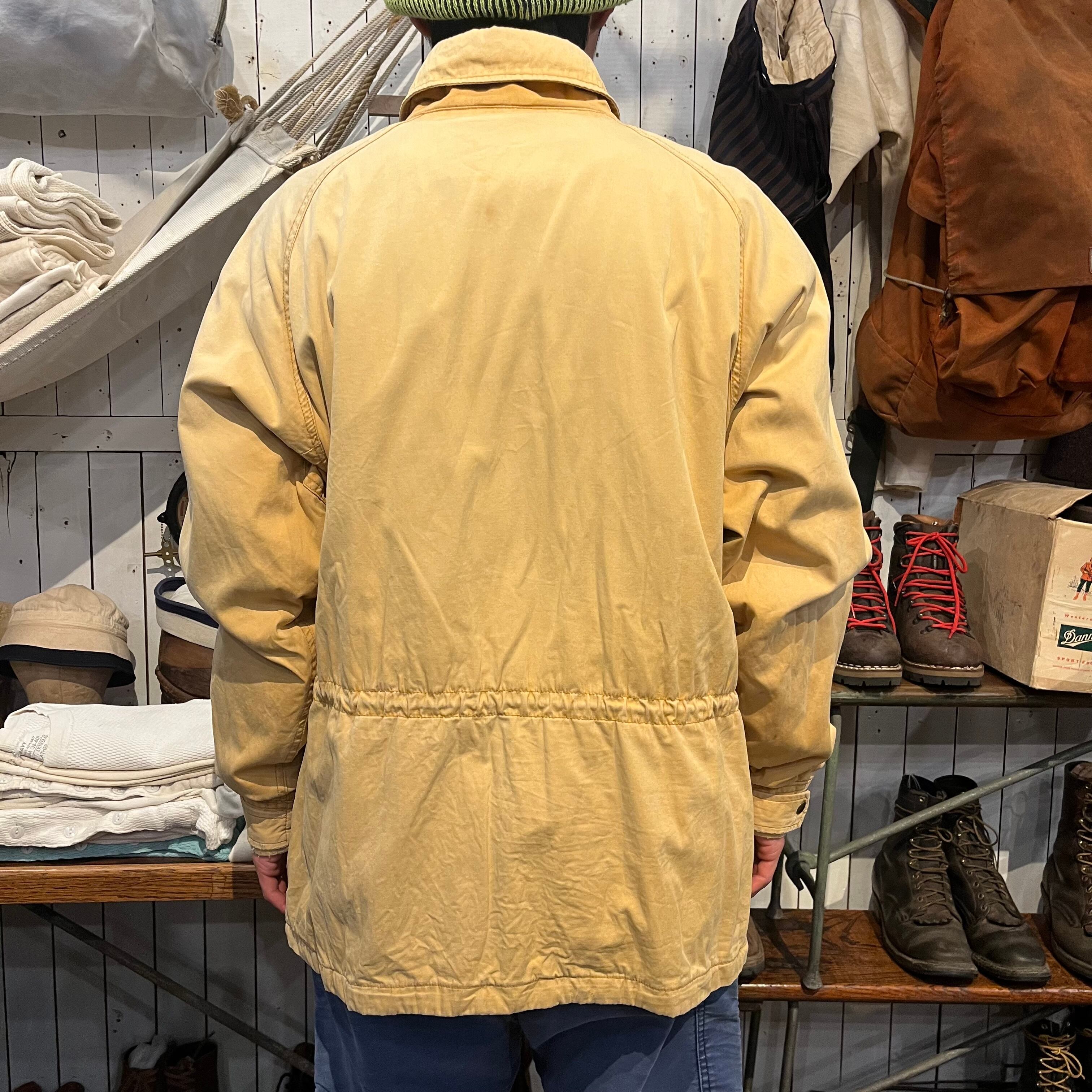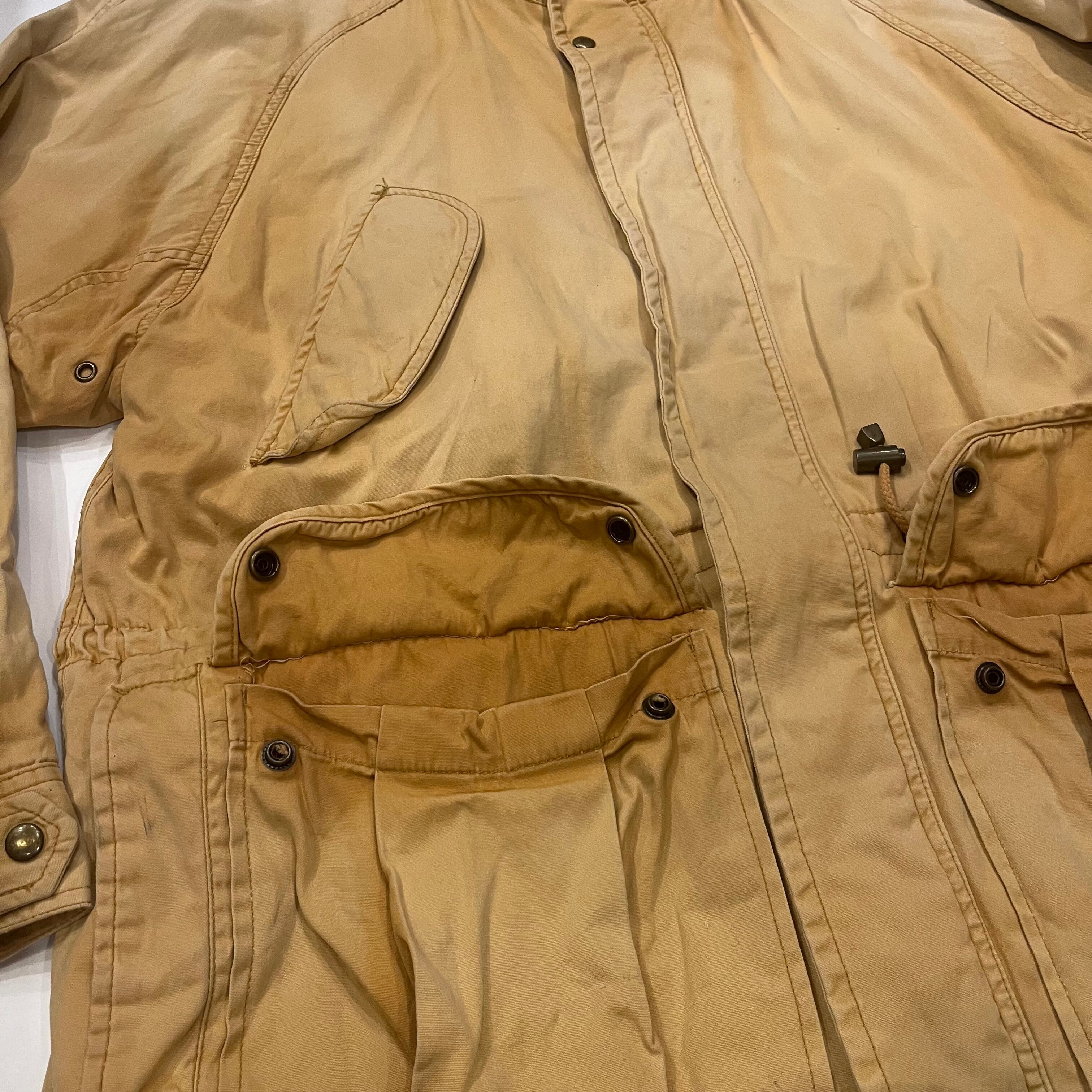 ヒルトンから90年代頃のマウンテンパーカーになります。表記Lサイズ。表、裏と共にコットン100%になります。着画のように腹付近にドローカードが入っていてかなり紐を絞って着用することもできます。ポケットの裏や、襟の裏の写真の通り元の色からかなり焼けて良いフェードの色味になっています。裏地の色もとても良くヴァーガンディーのような色味で鮮やかで良いです。