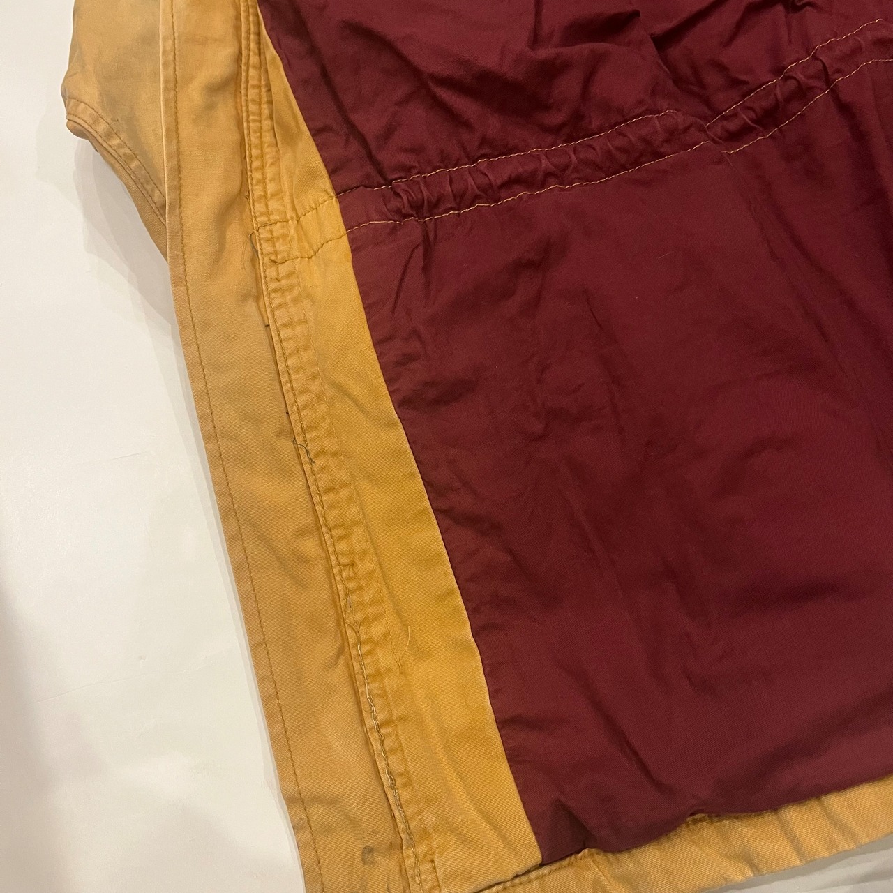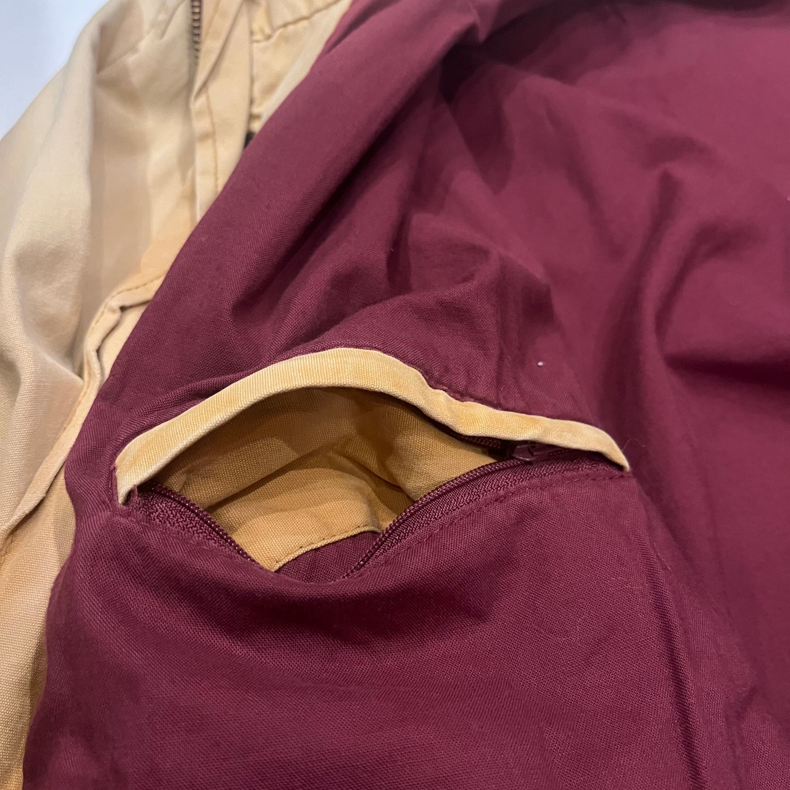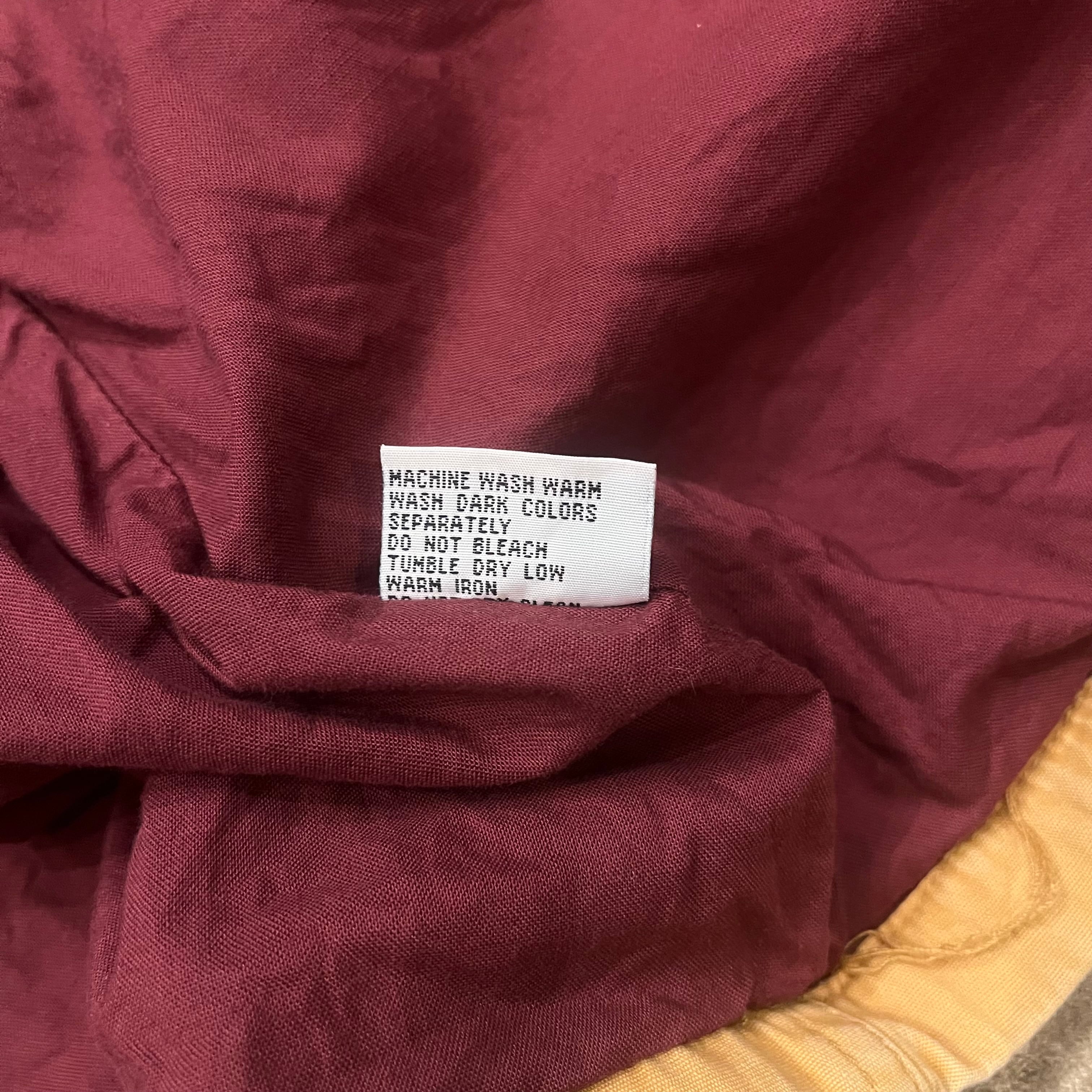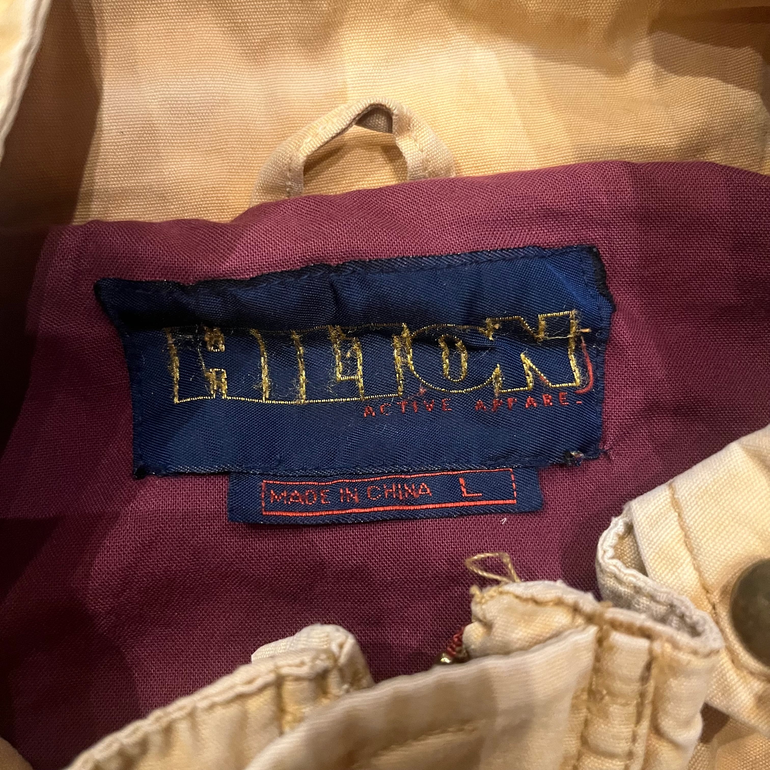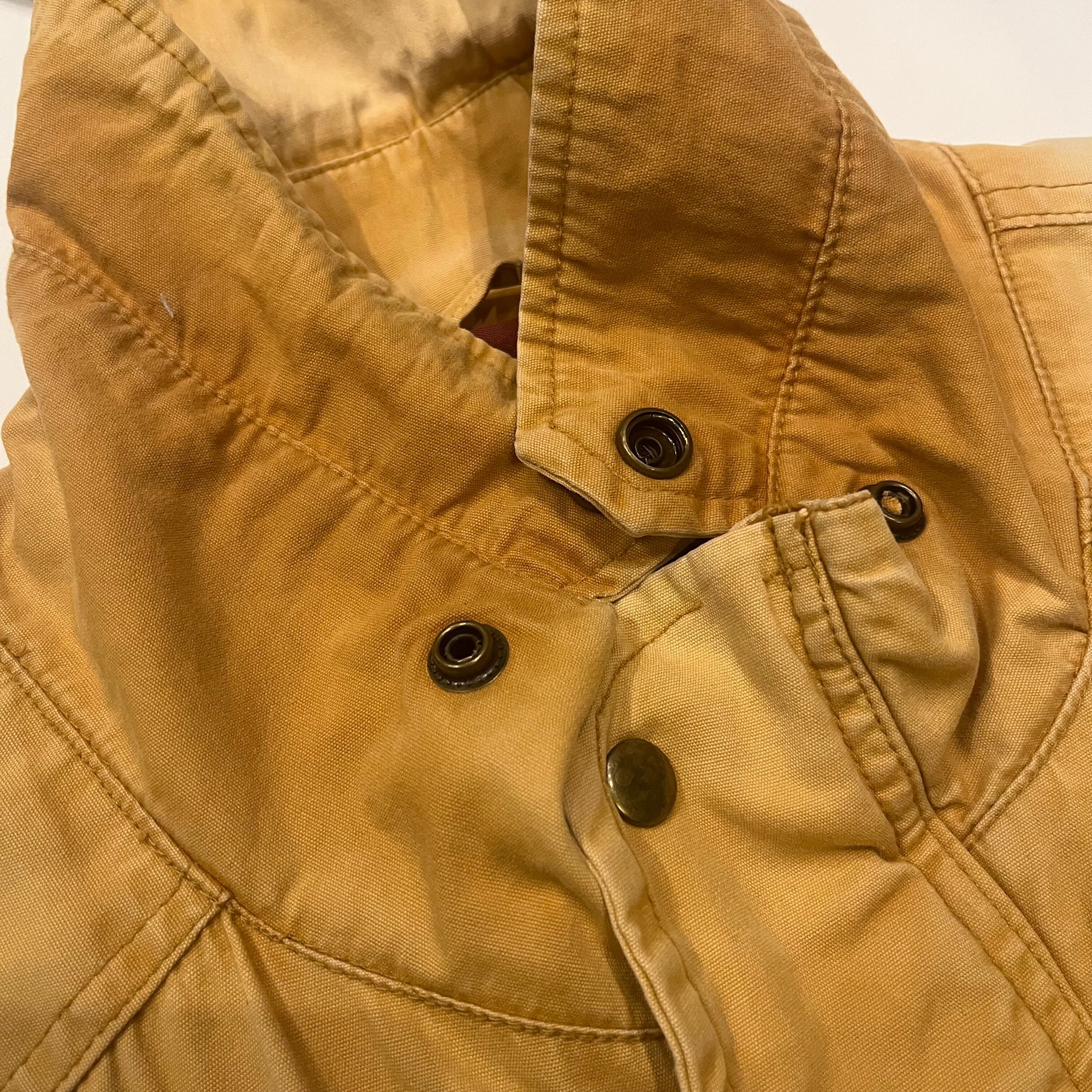 ヒルトンから90年代頃のマウンテンパーカーになります。表記Lサイズ。表、裏と共にコットン100%になります。着画のように腹付近にドローカードが入っていてかなり紐を絞って着用することもできます。ポケットの裏や、襟の裏の写真の通り元の色からかなり焼けて良いフェードの色味になっています。裏地の色もとても良くヴァーガンディーのような色味で鮮やかで良いです。