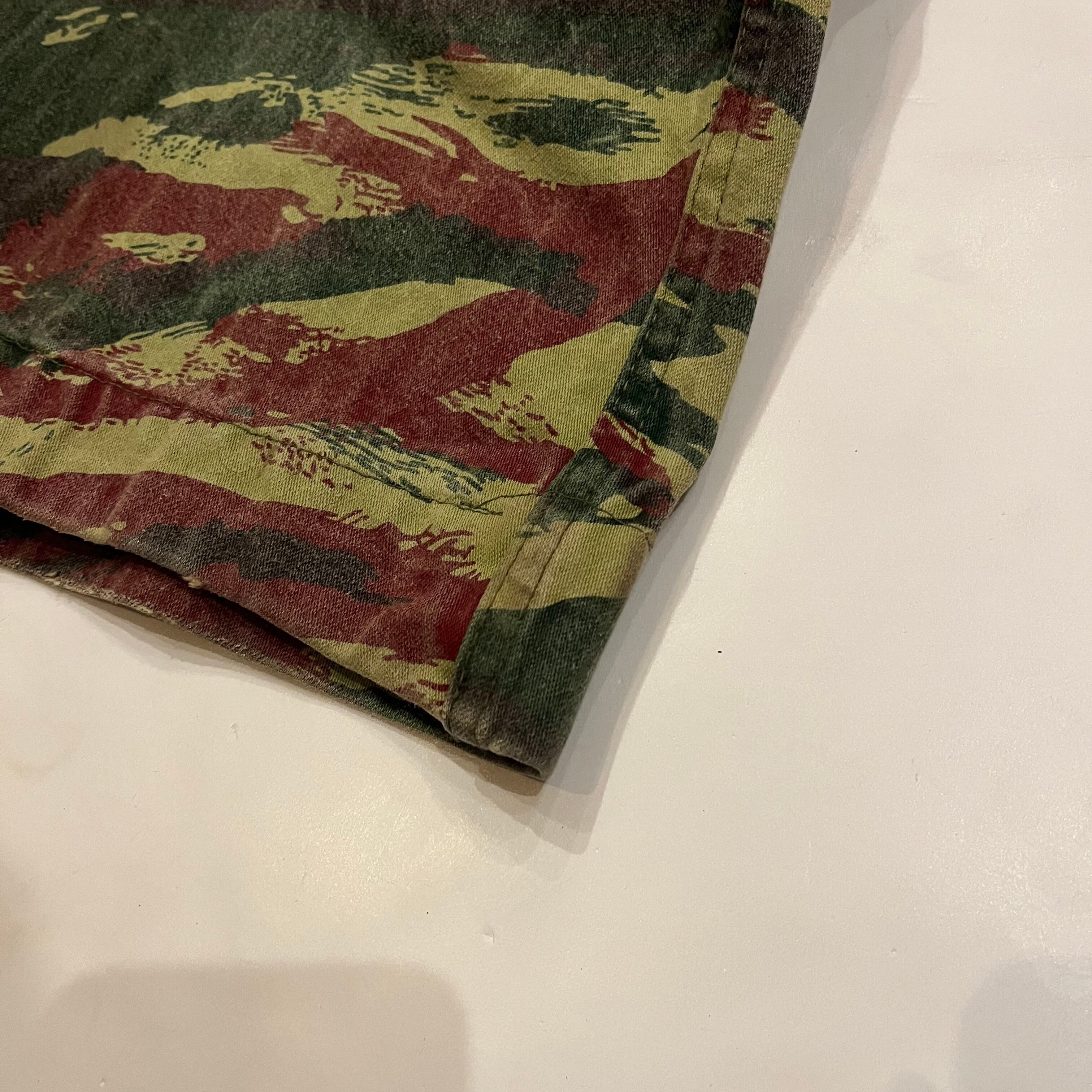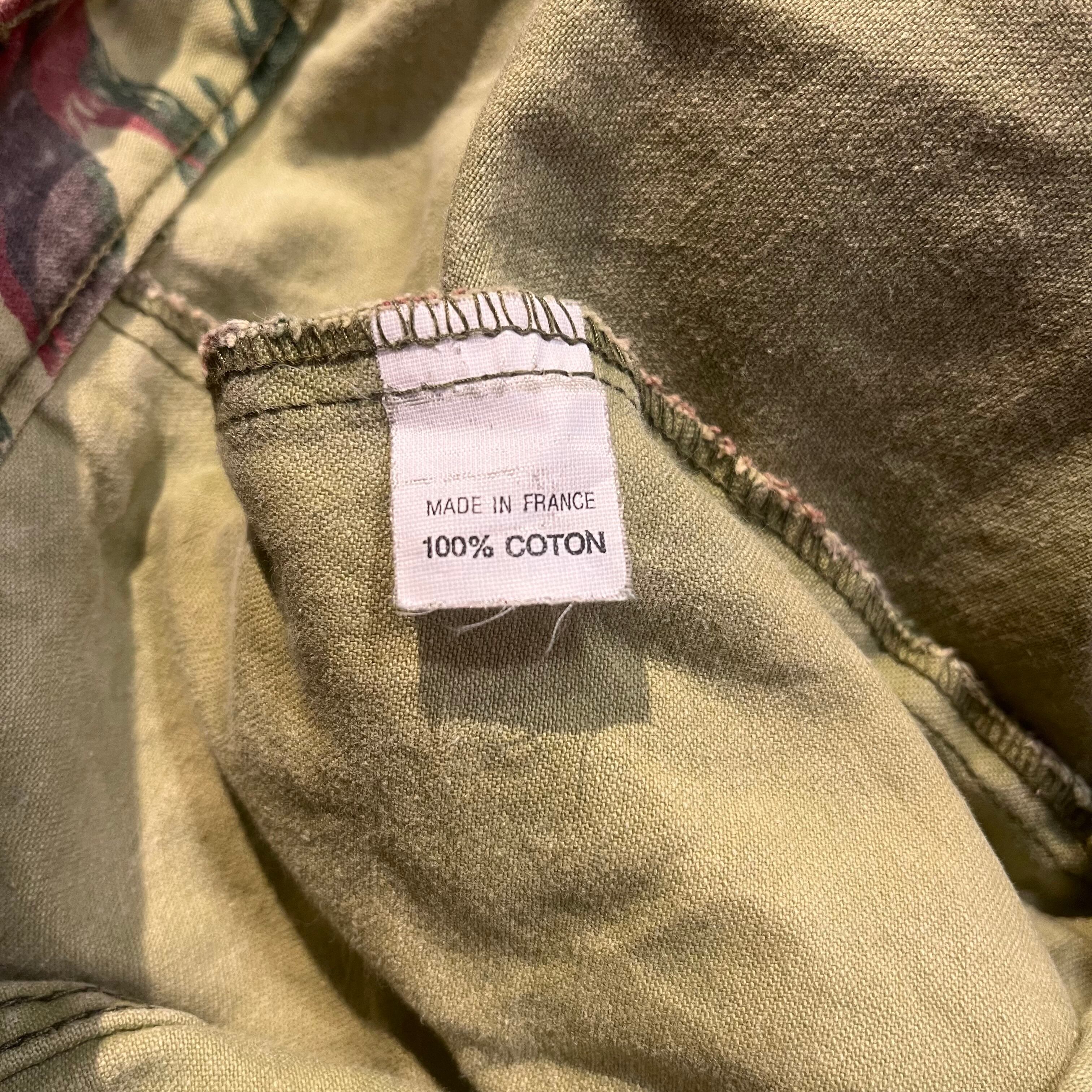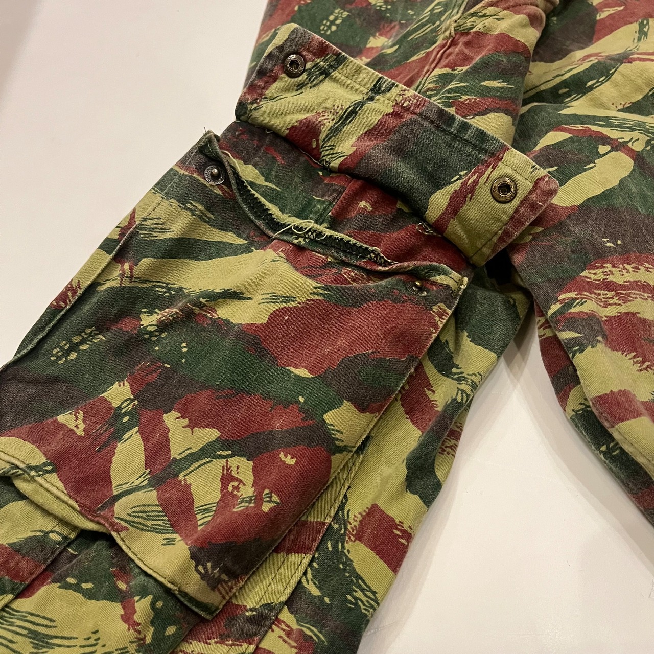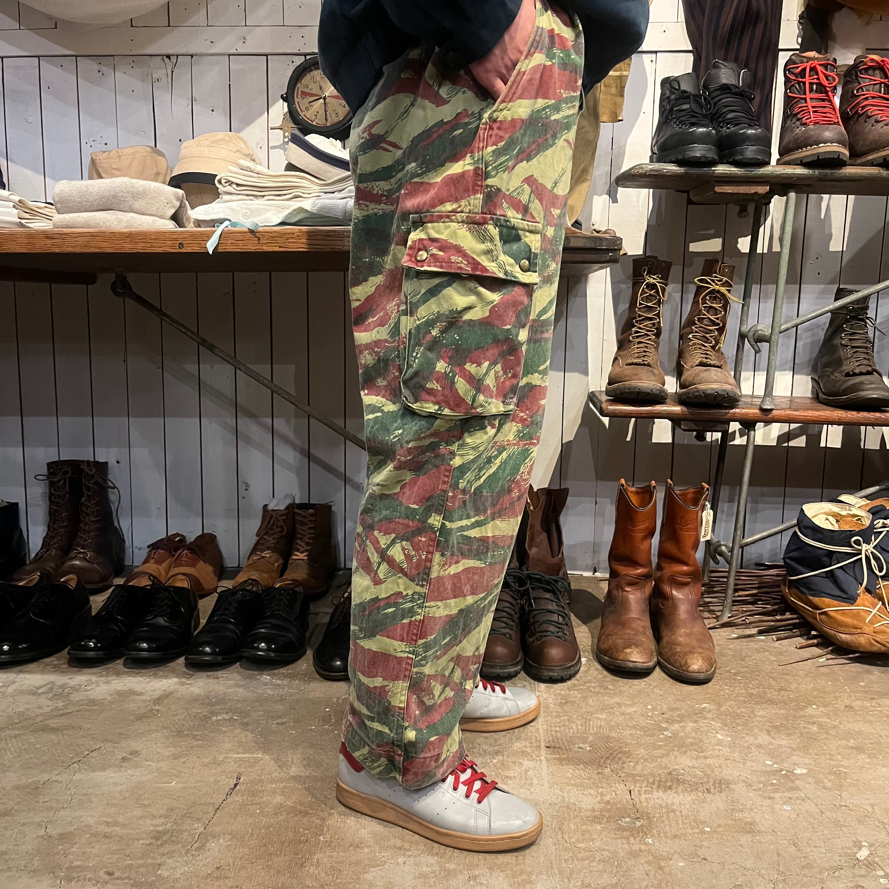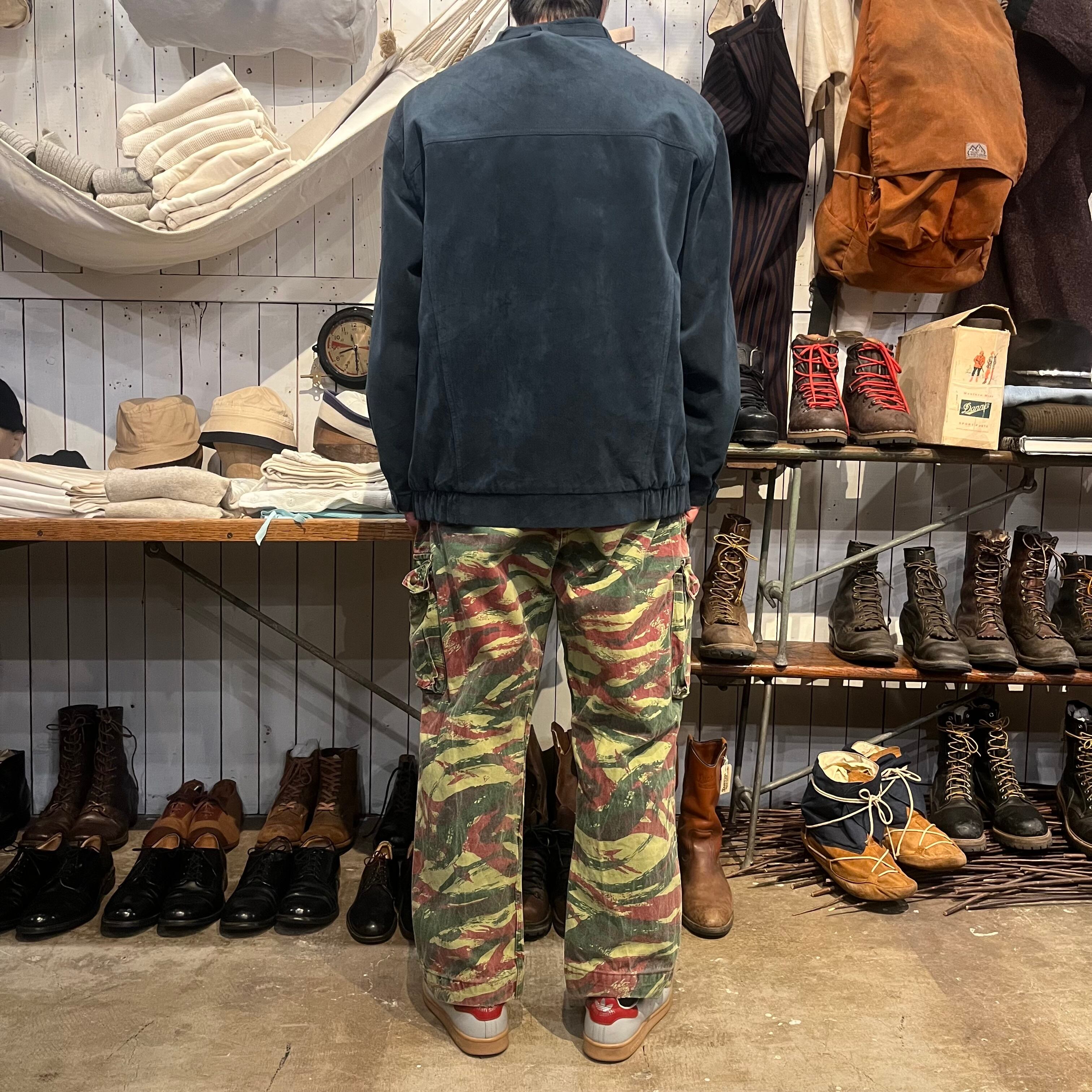 フランス製の民間のリザードカモカーゴパンツになります。かなりウエストが大きめなのでギュッと絞って履くスタイルのパンツです。ウエストは実寸44になるのでかなり大きめです。
