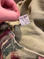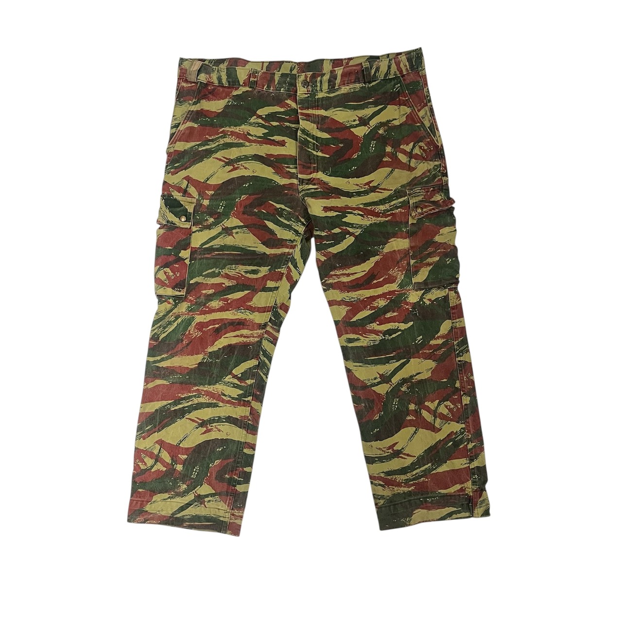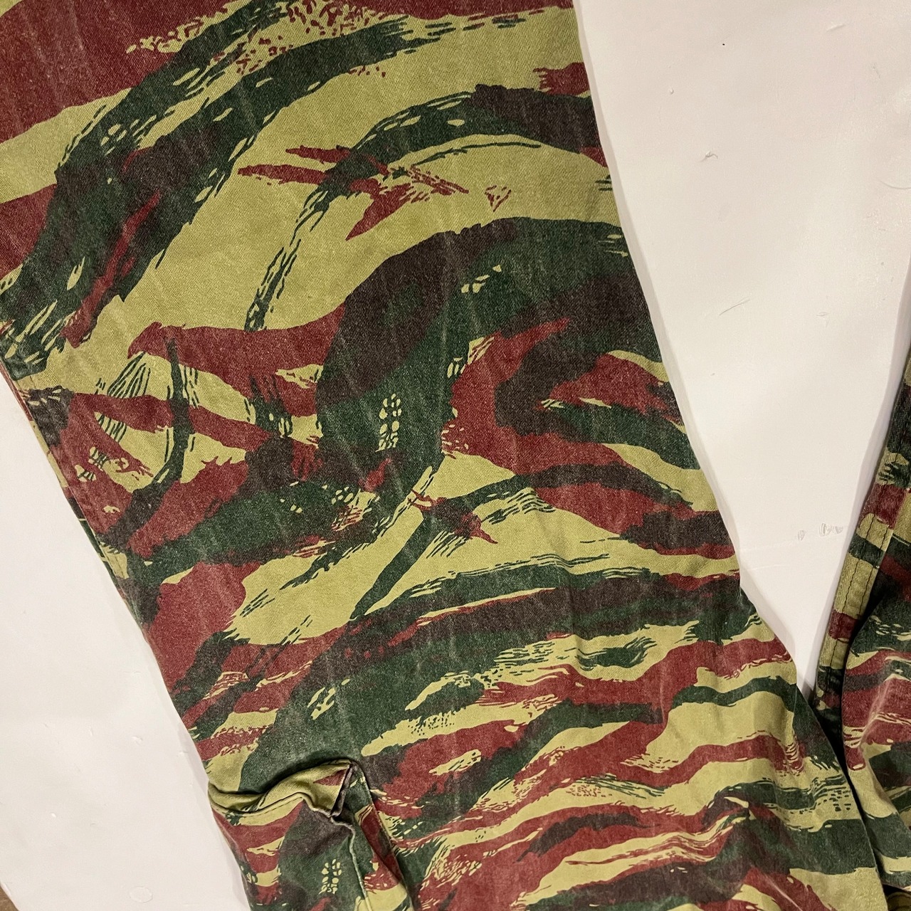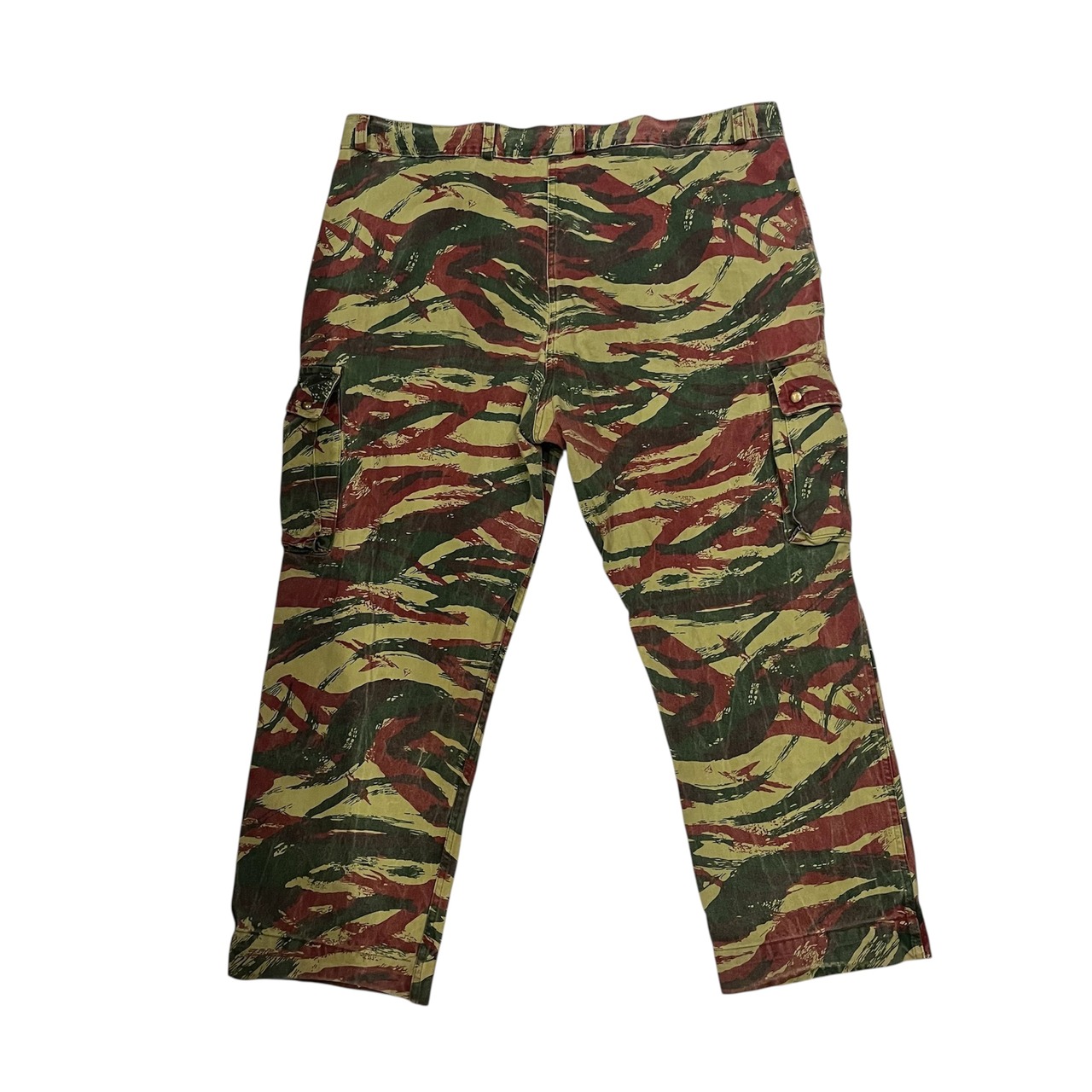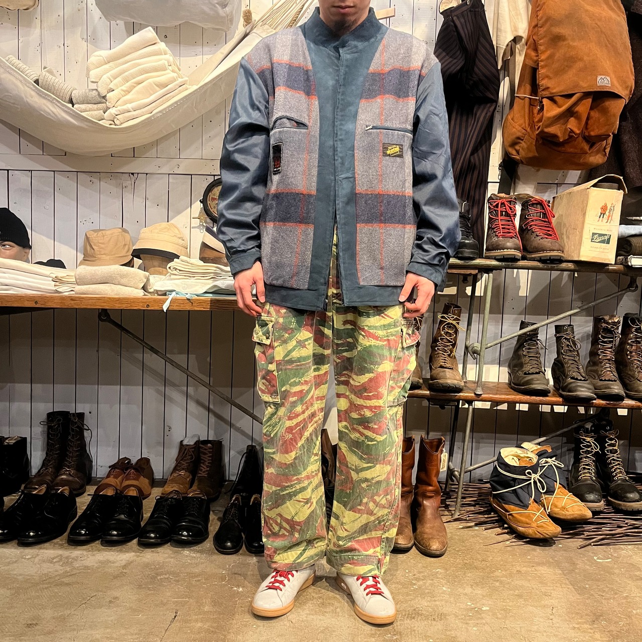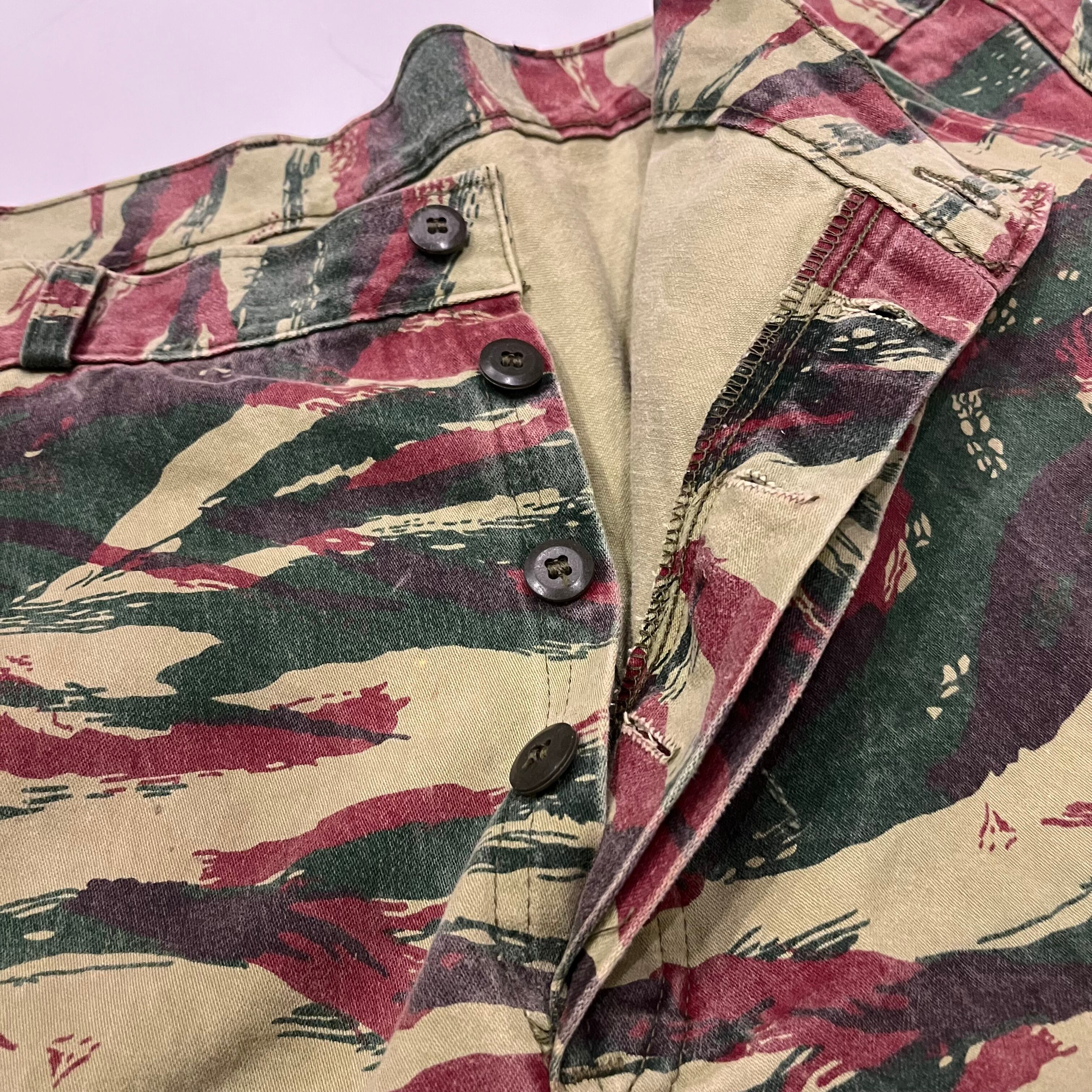 フランス製の民間のリザードカモカーゴパンツになります。かなりウエストが大きめなのでギュッと絞って履くスタイルのパンツです。ウエストは実寸44になるのでかなり大きめです。