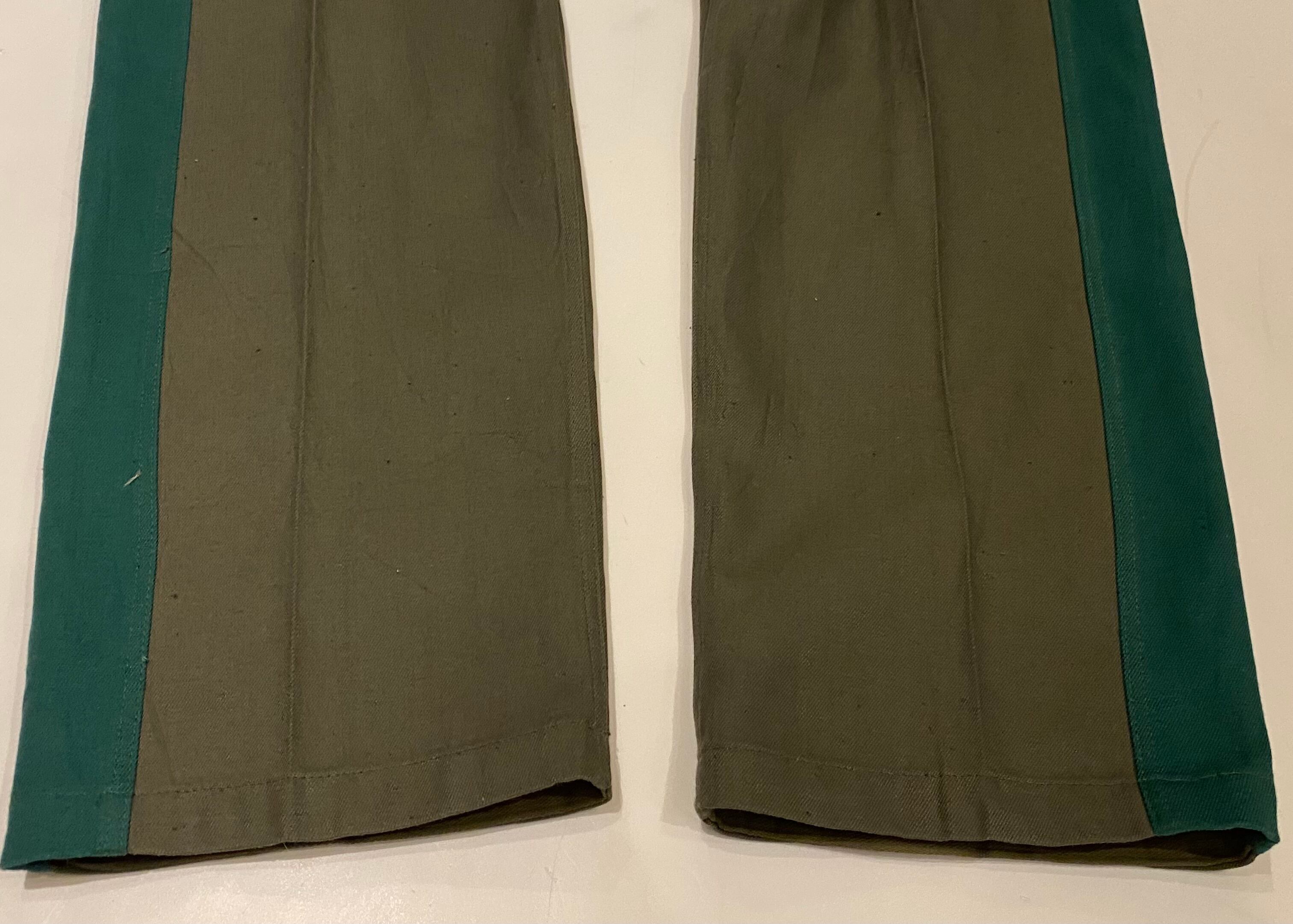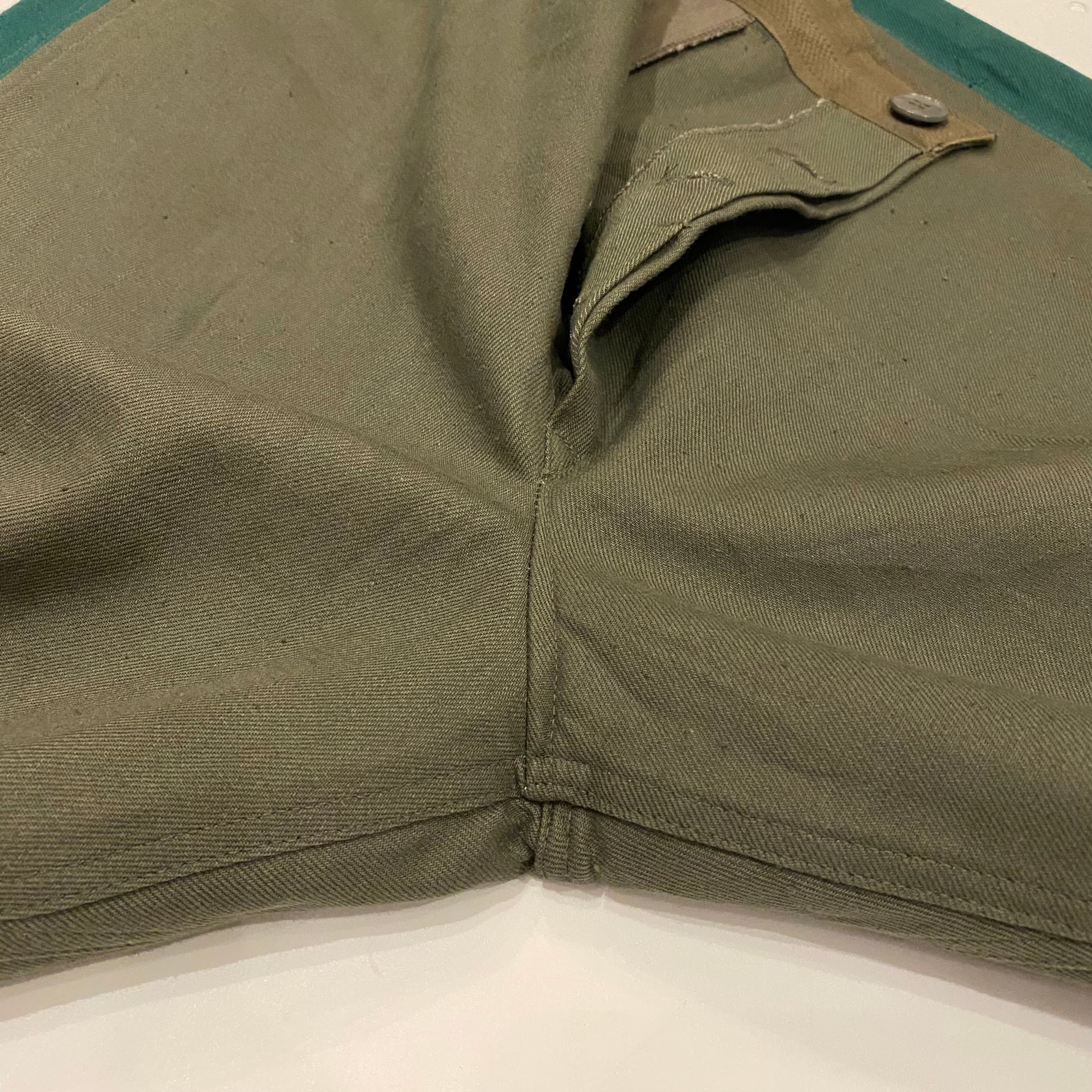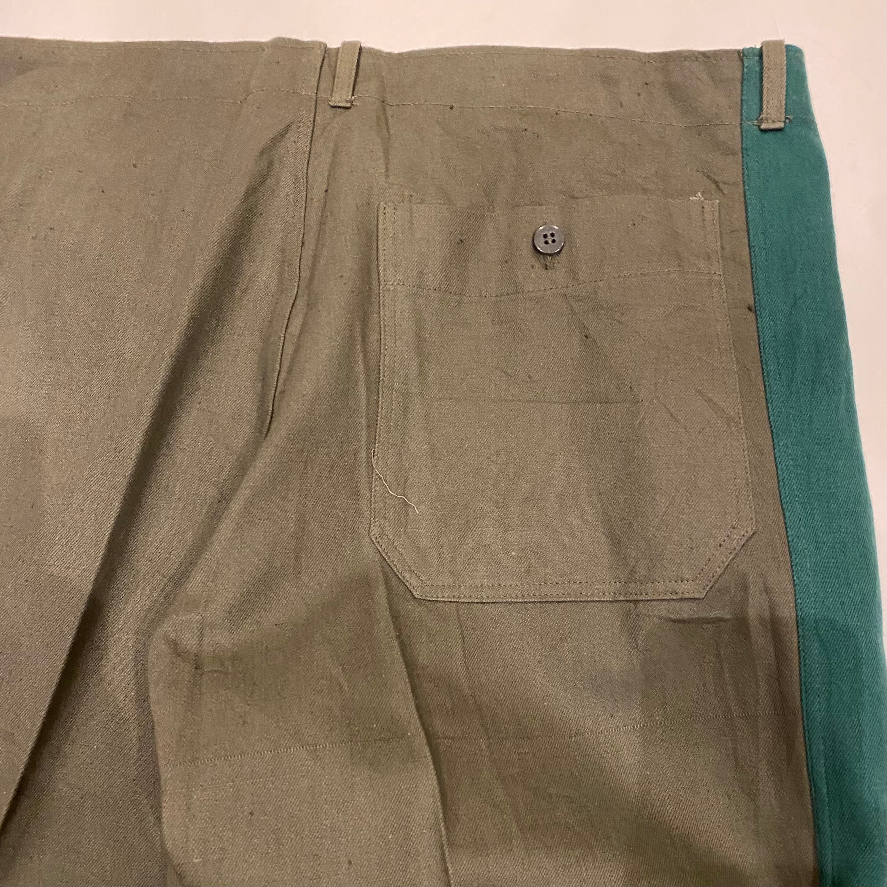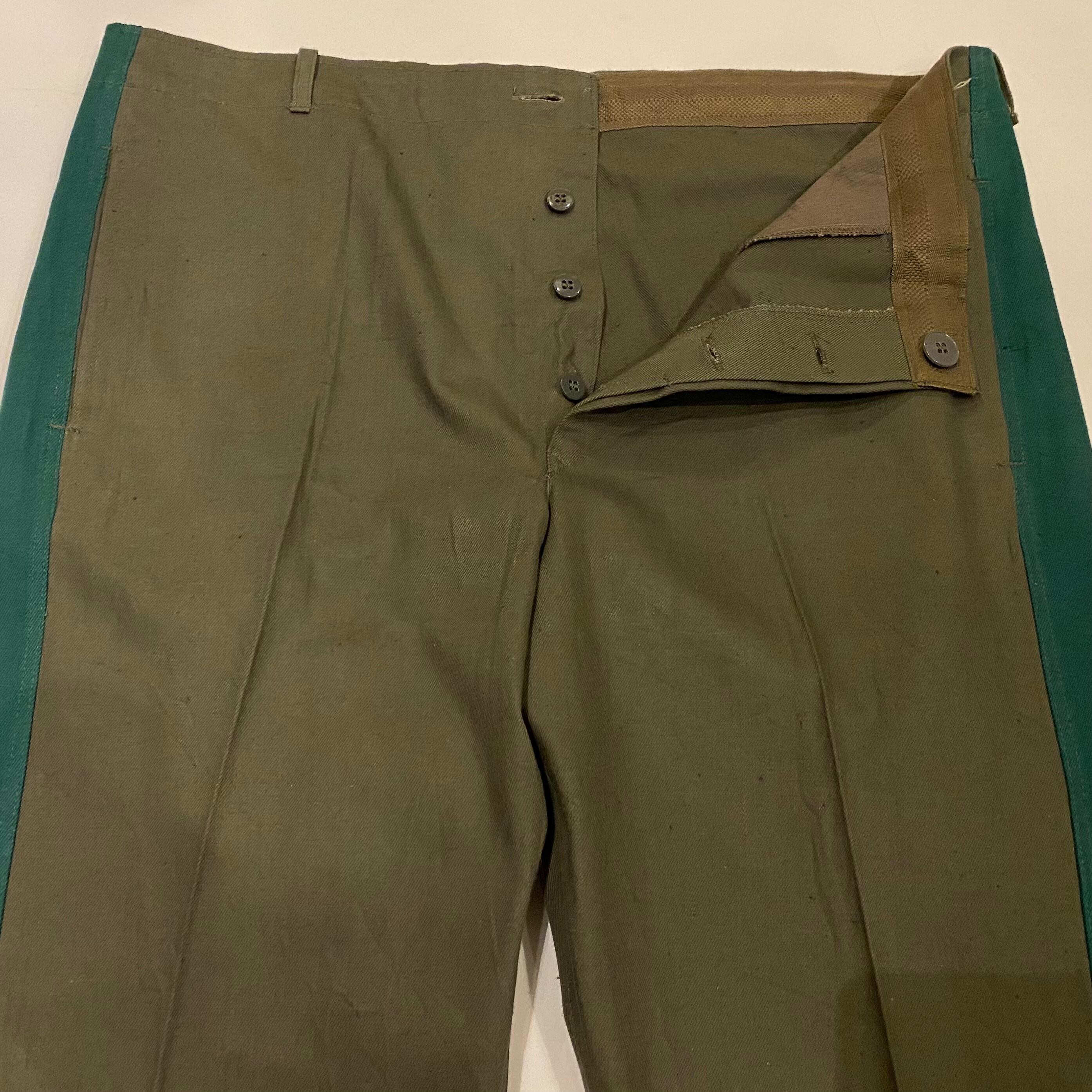 古めの東ドイツのラインパンツになります。コットンのグレー地にグリーンのはぎの太いサイドラインが特徴的です。フロントボタンフライのストレートシルエットです。珍しいカラーリングでグレーの色味が良く他の人と、かぶらなそうでそれも良いです。コットン地なので穿いていくとまた味もでてくると思います。