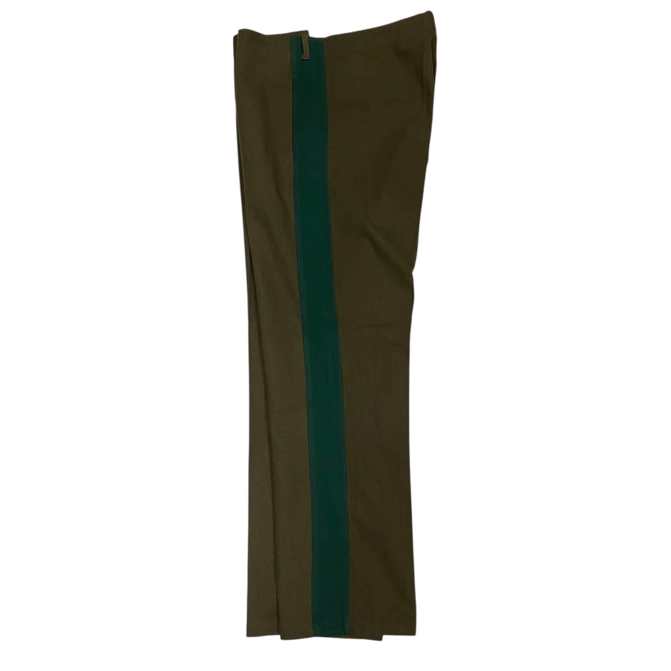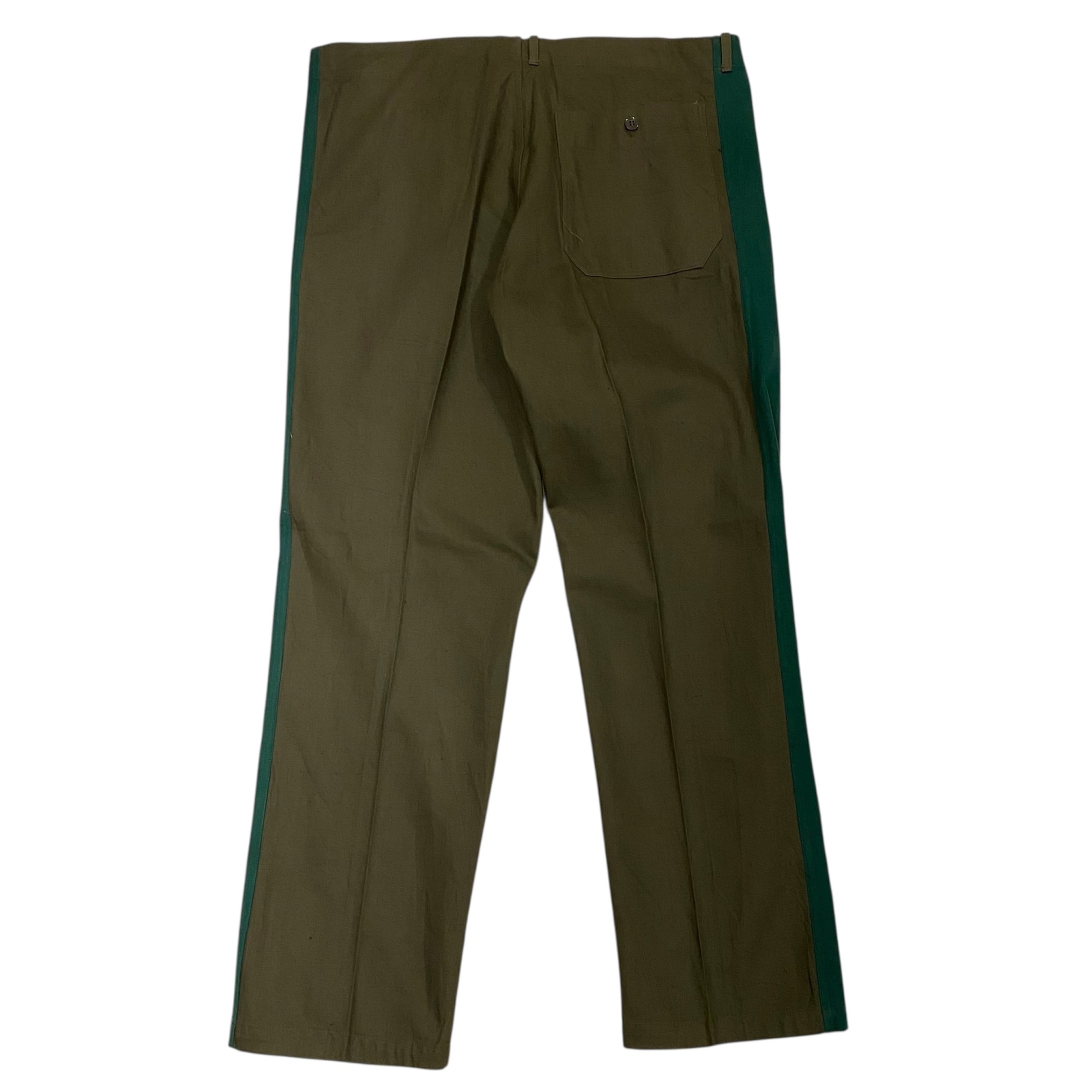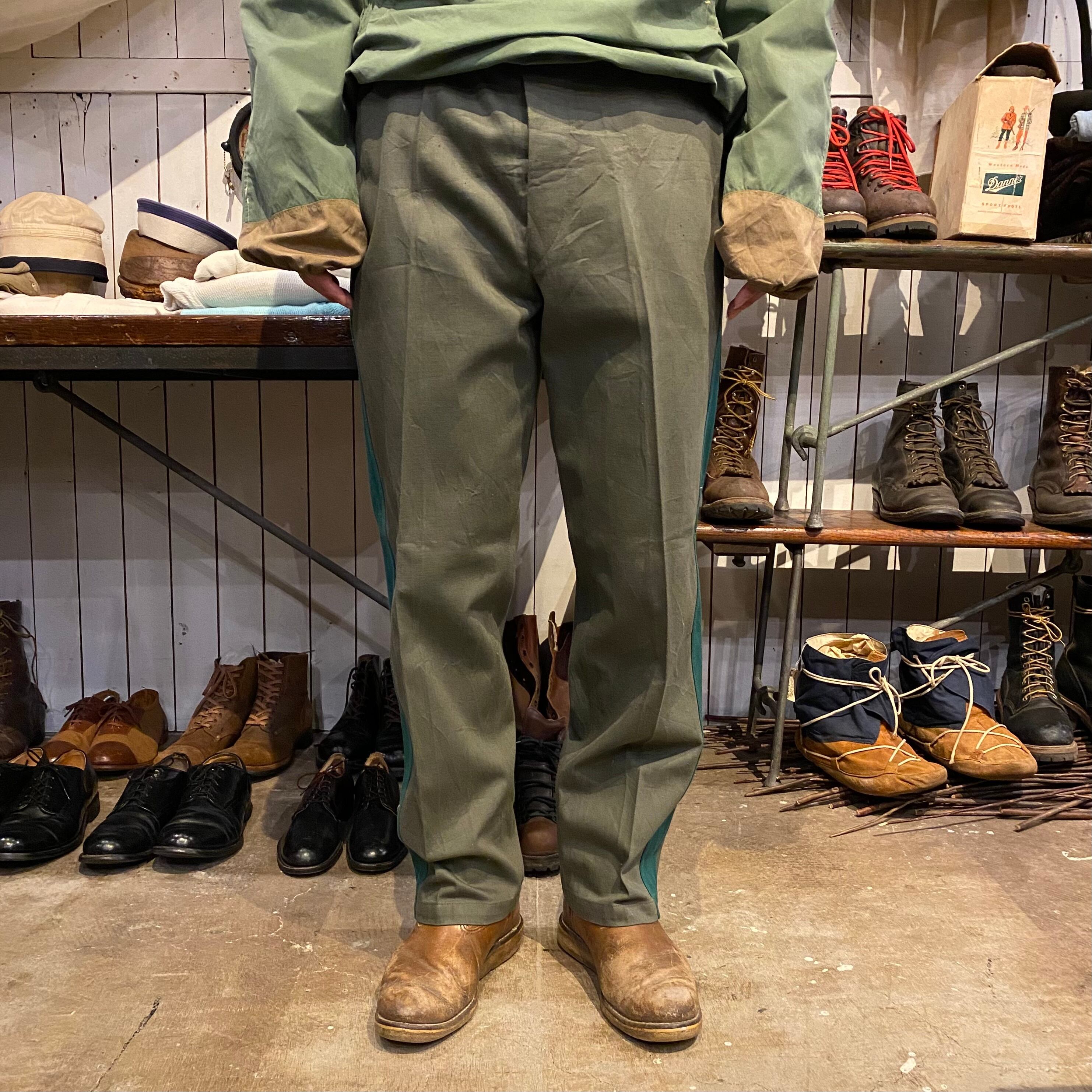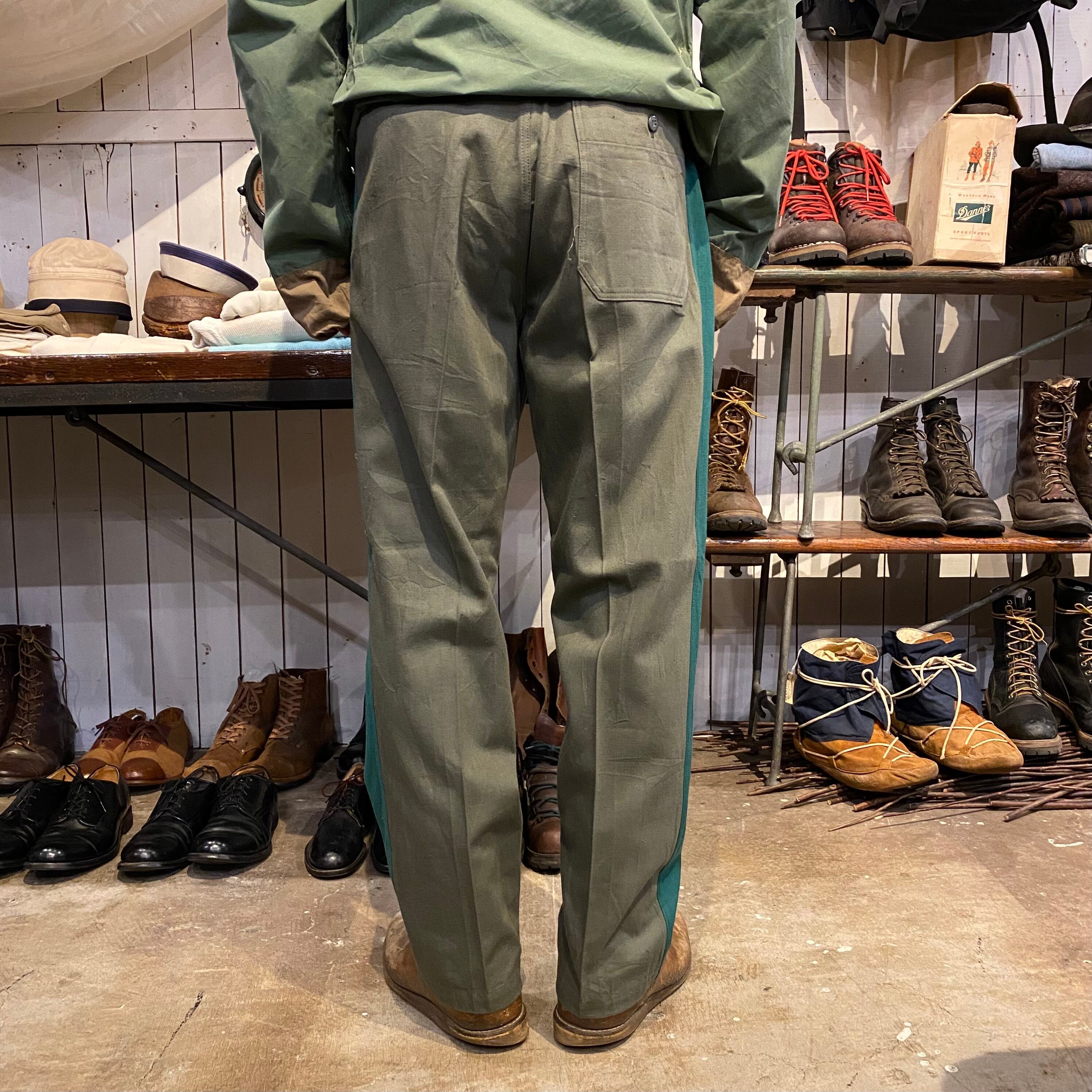 古めの東ドイツのラインパンツになります。コットンのグレー地にグリーンのはぎの太いサイドラインが特徴的です。フロントボタンフライのストレートシルエットです。珍しいカラーリングでグレーの色味が良く他の人と、かぶらなそうでそれも良いです。コットン地なので穿いていくとまた味もでてくると思います。