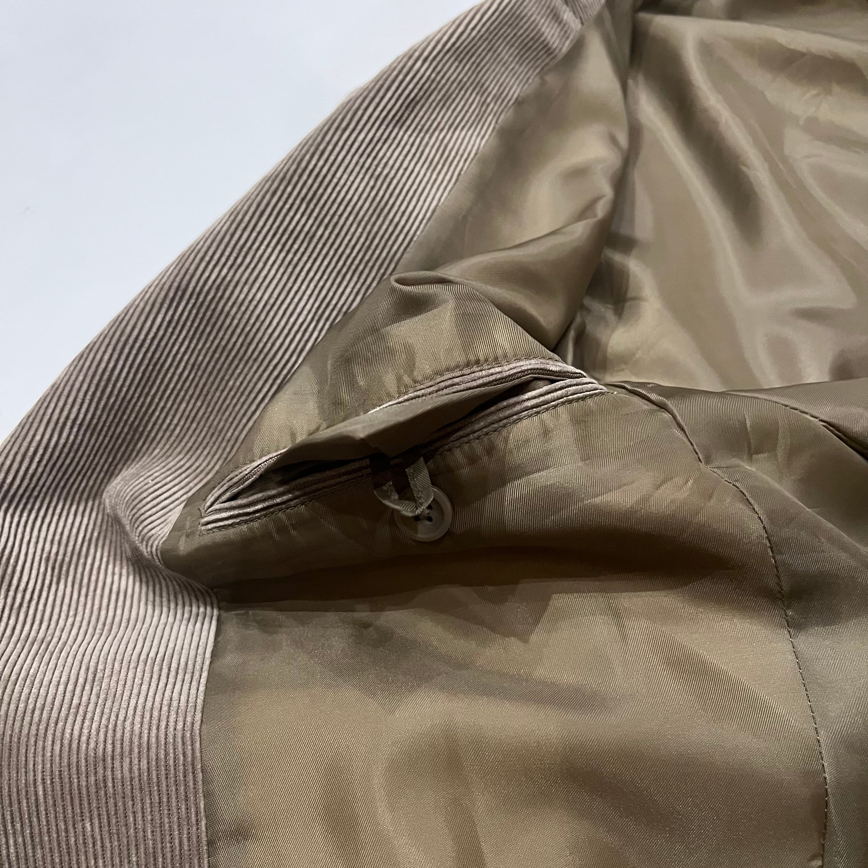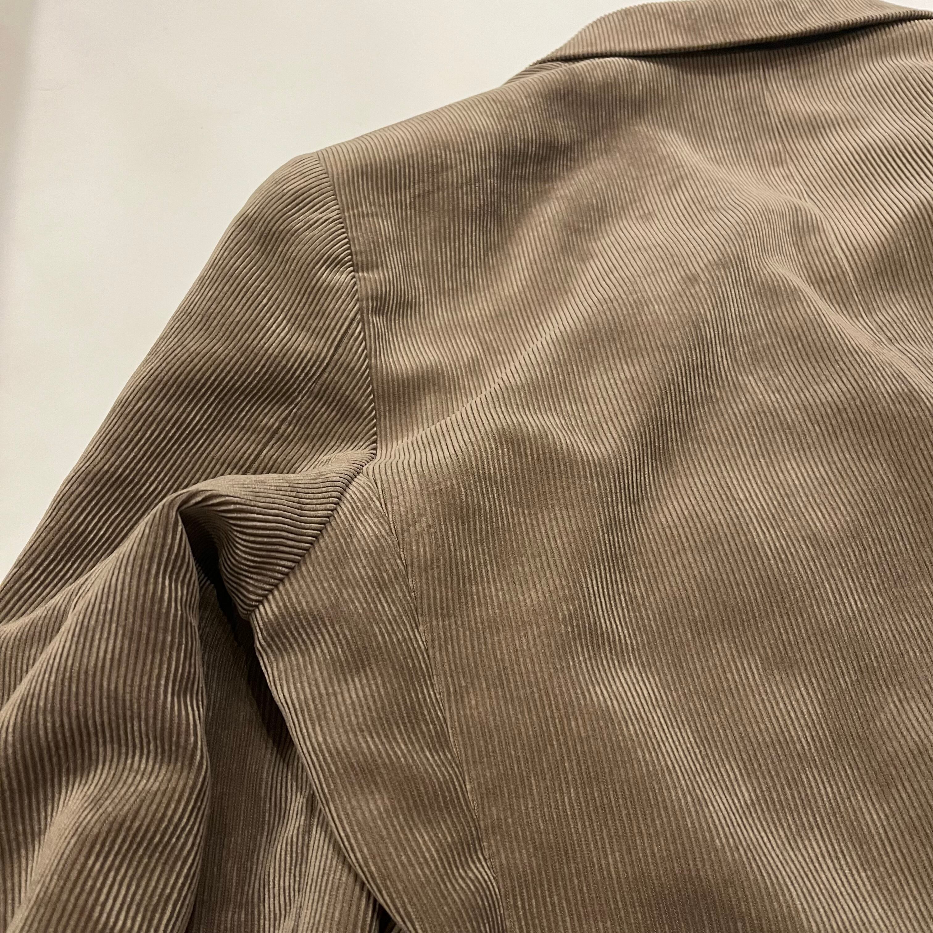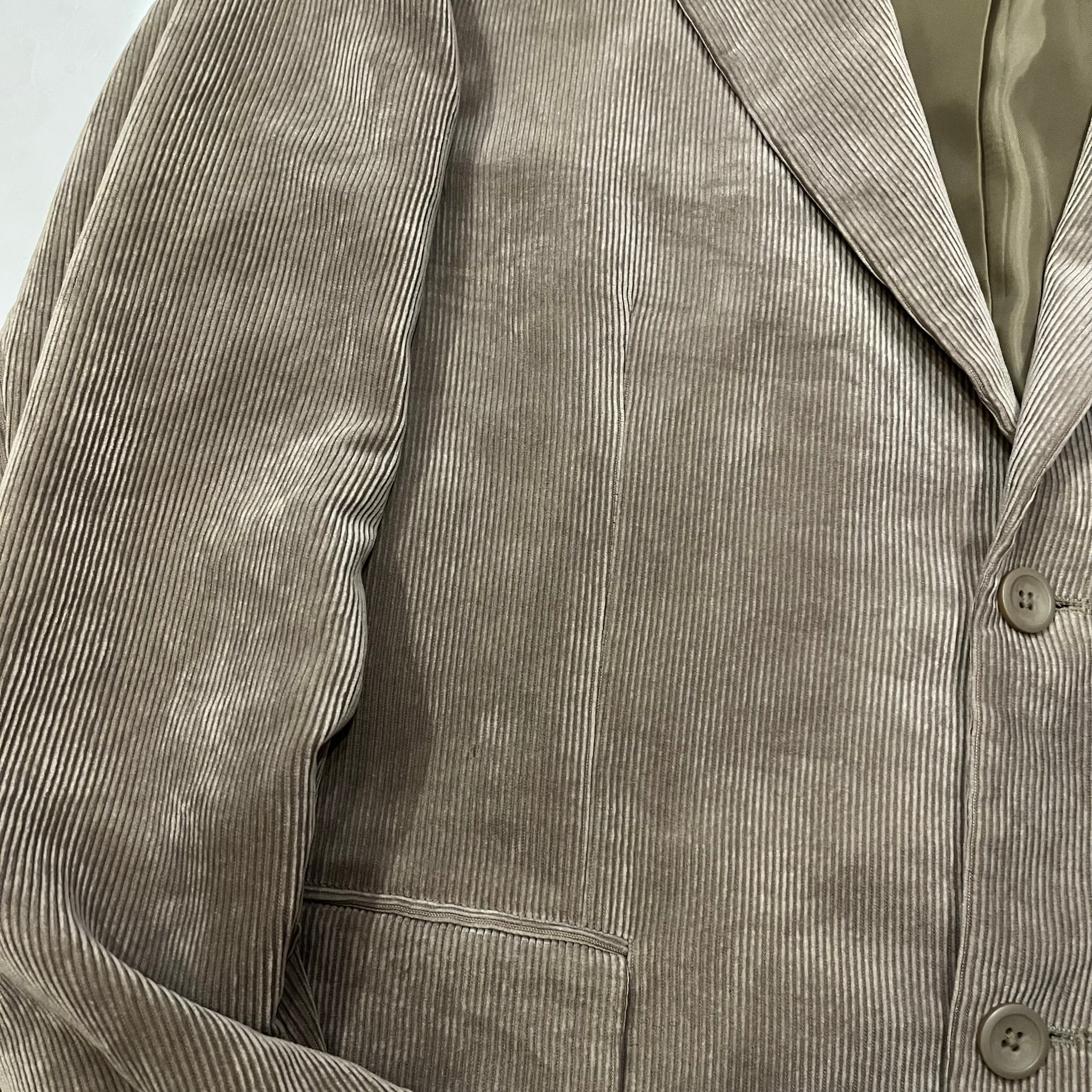 コーデュロイのテーラードジャケットになります。表地素材はポリエステル84%、ナイロン16%。裏地はポリエステル100%でツルッとした生地の感触です。