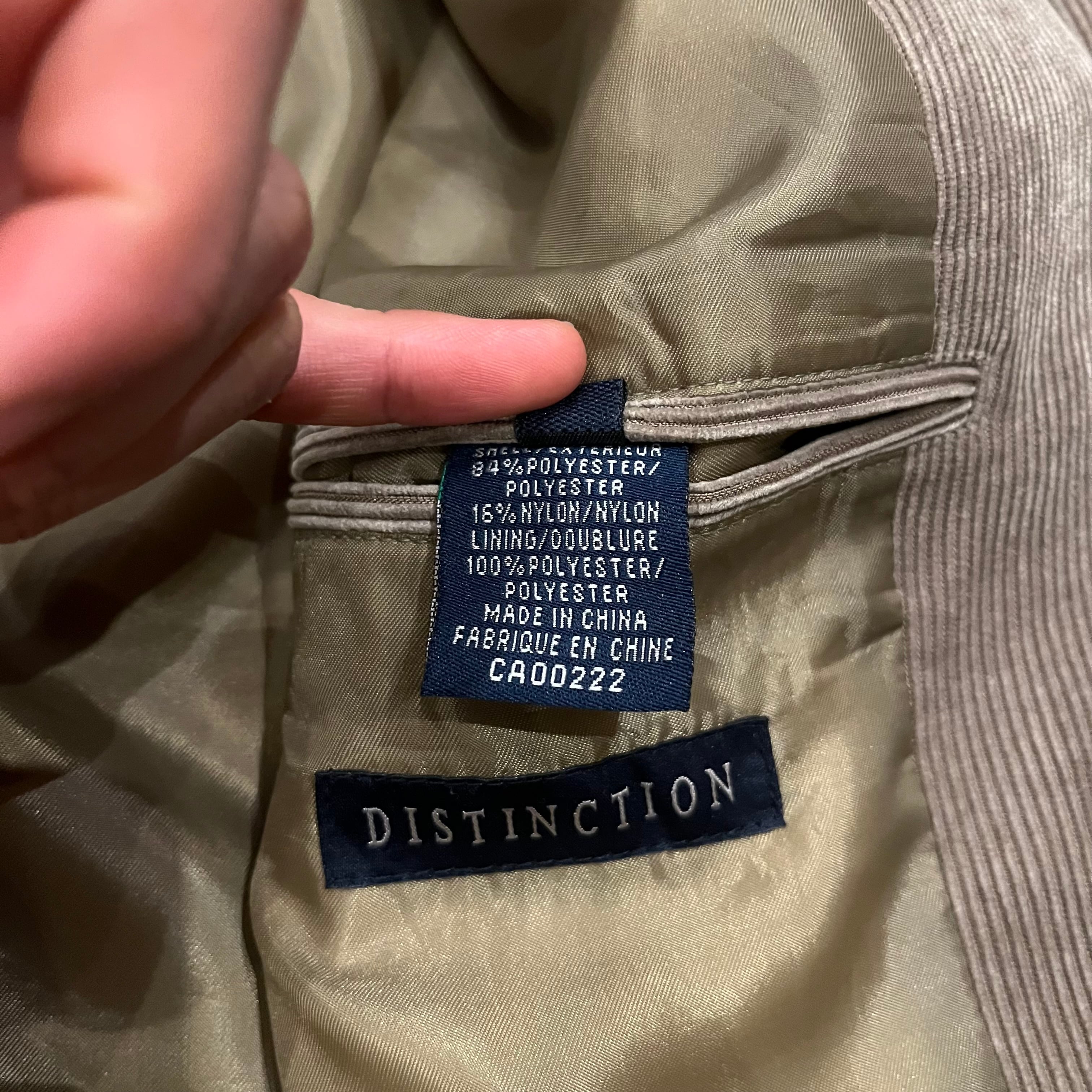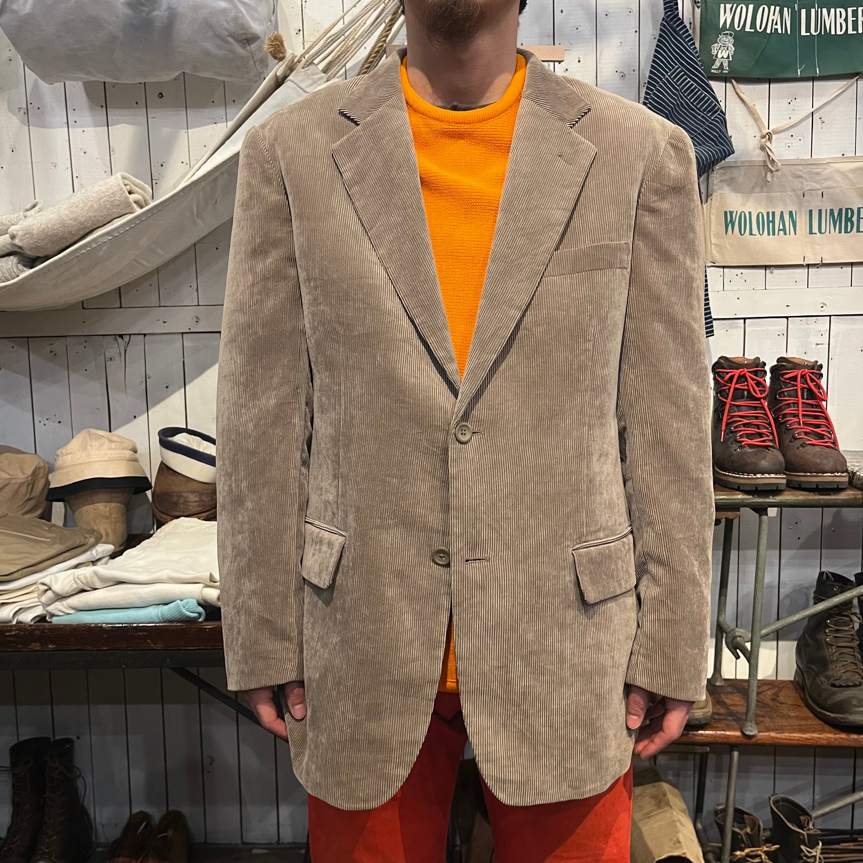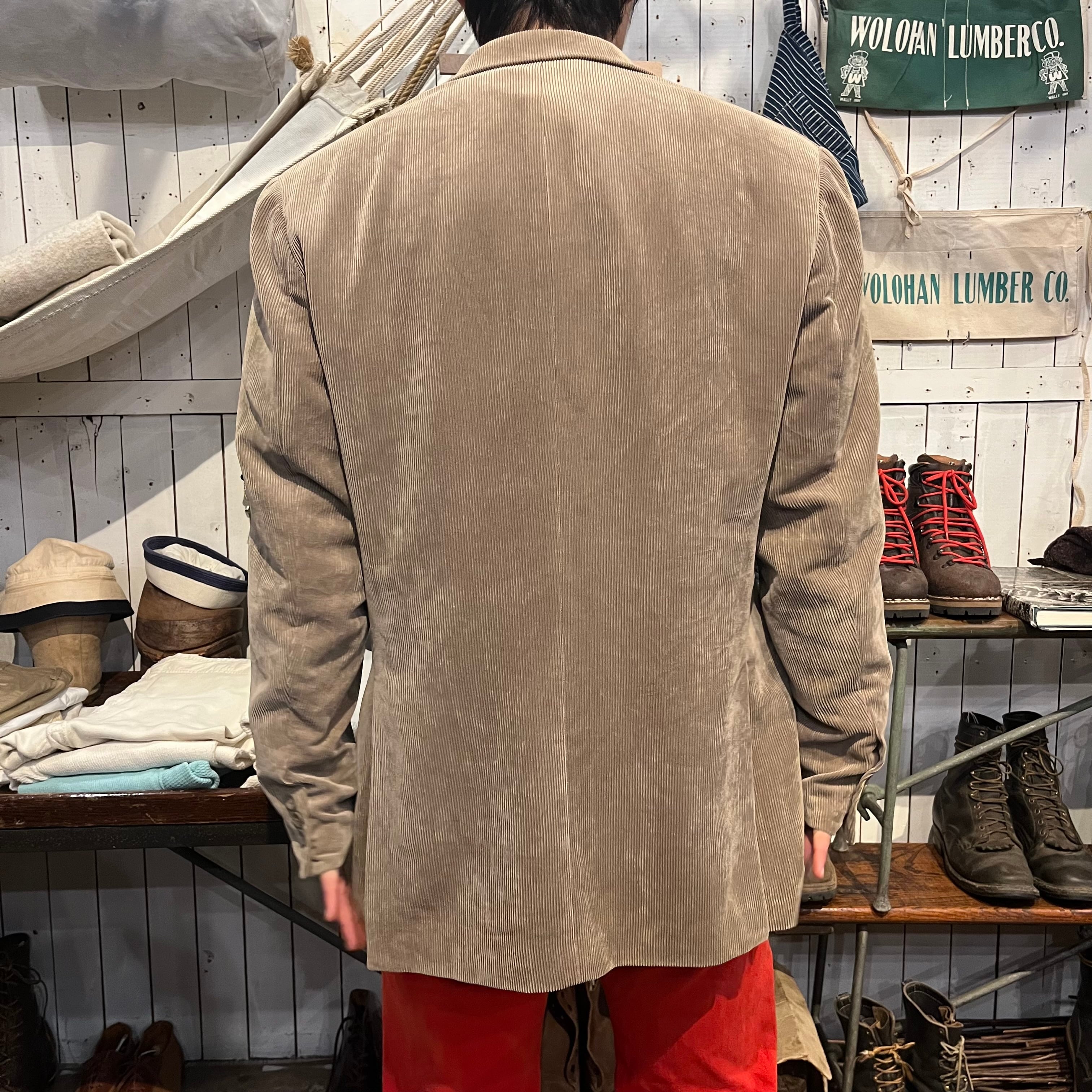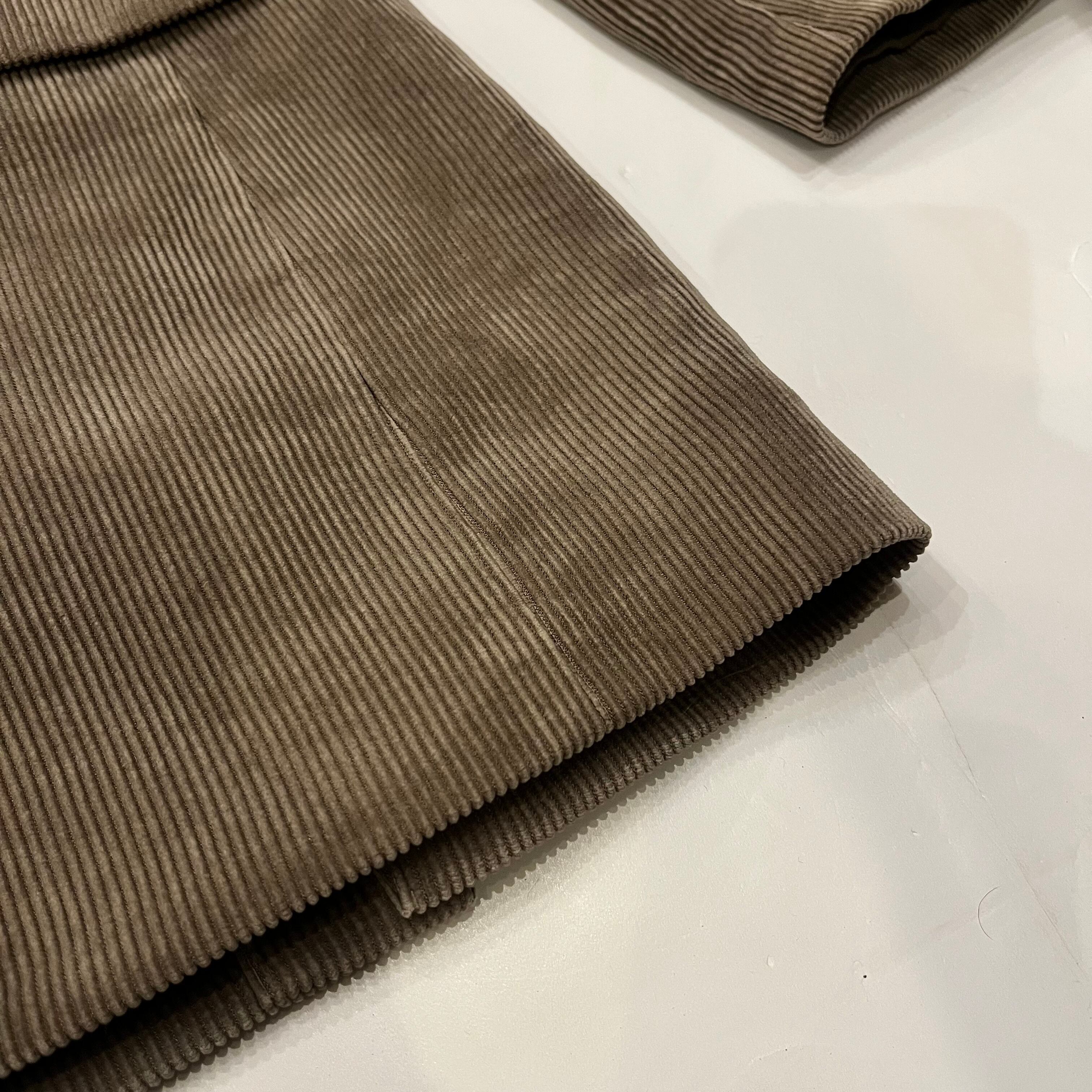 コーデュロイのテーラードジャケットになります。表地素材はポリエステル84%、ナイロン16%。裏地はポリエステル100%でツルッとした生地の感触です。