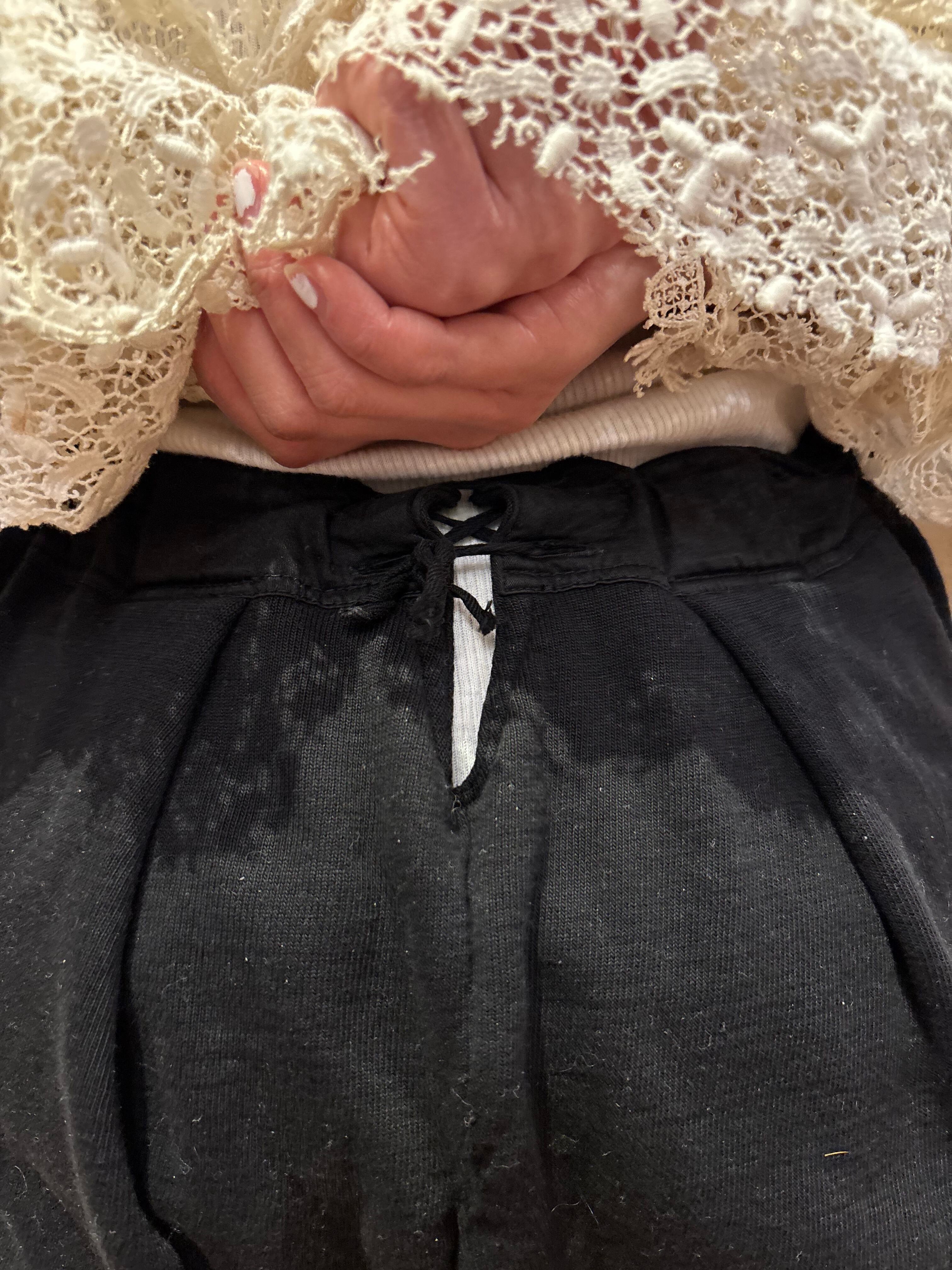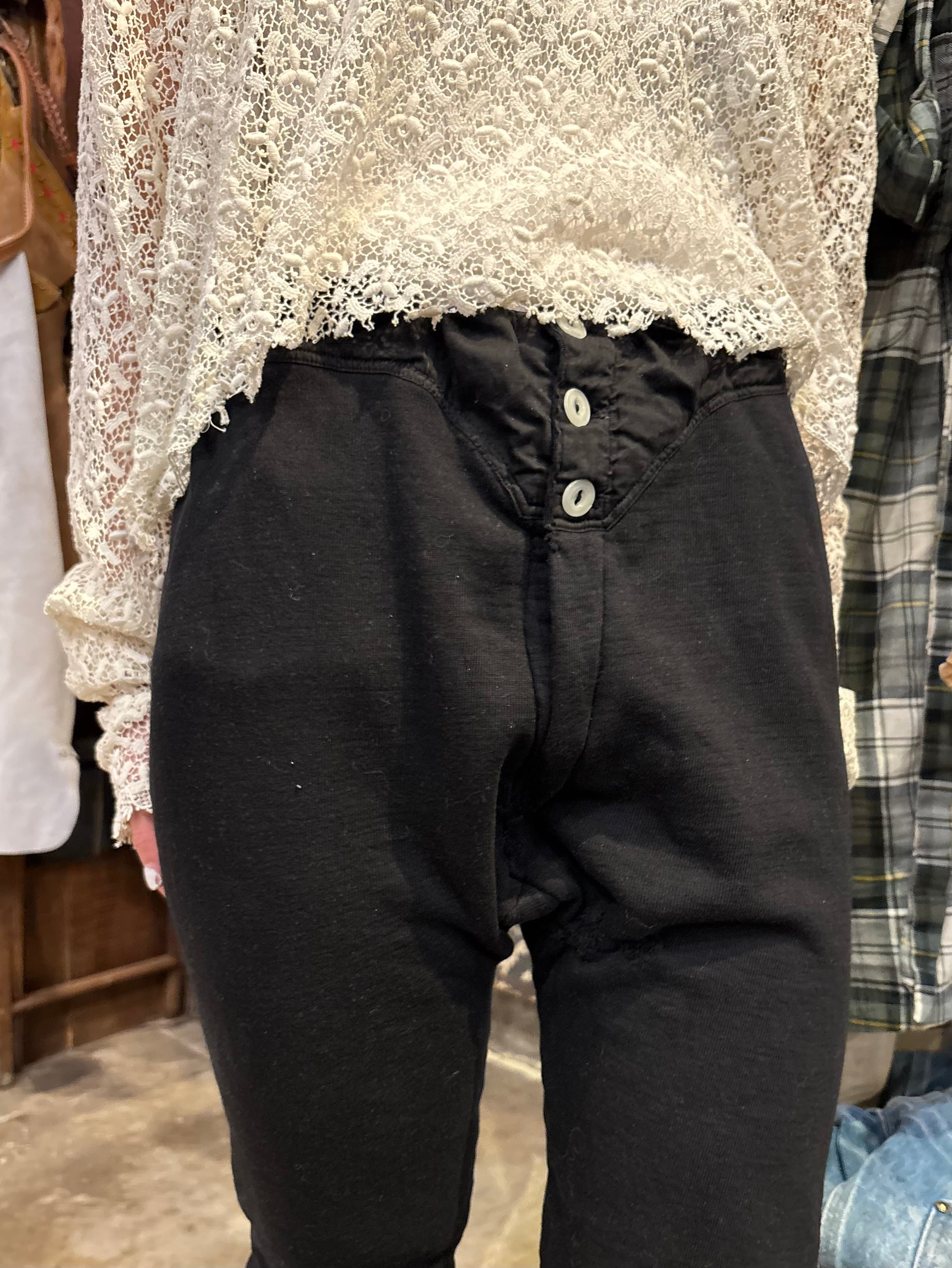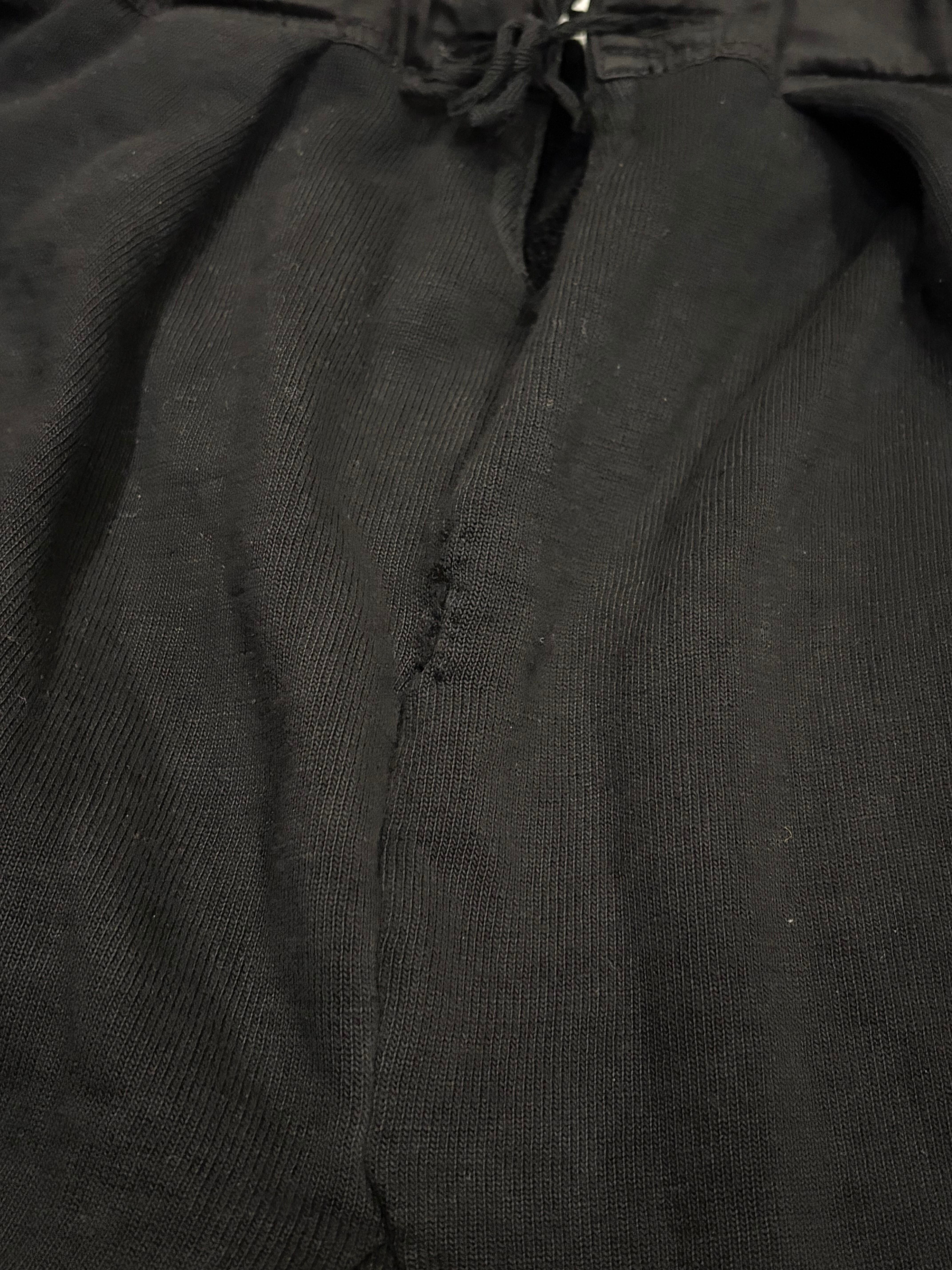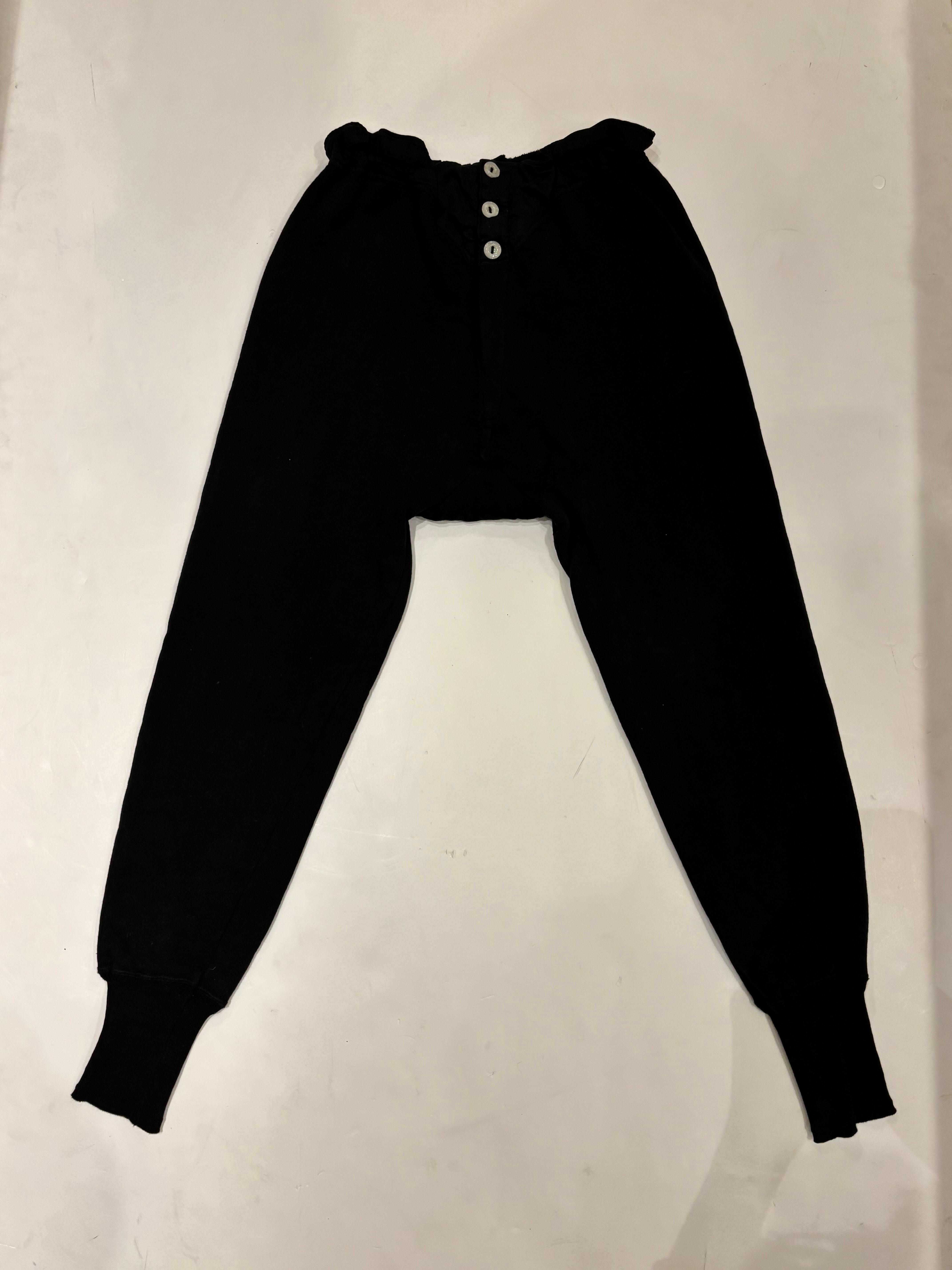 ミリタリーのアンダーパンツでございます。おそらくヨーロッパ製で、染められたブラックの個体です。内側は細かいパイルになっていて外側はスウェット、柔らかく肌触りがいいので着用写真のように一枚でパンツとして履くのも良いかと思います。ブーツやサンダルなどと合わせて履いても良いです。
