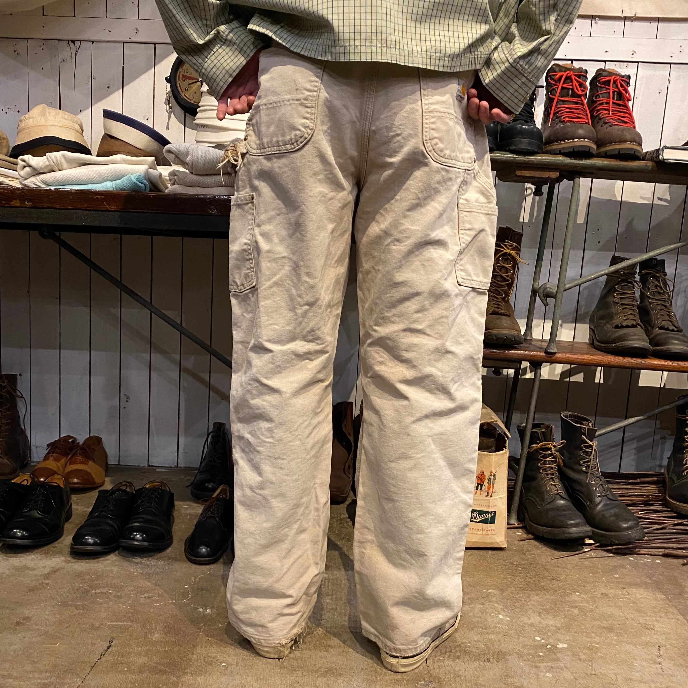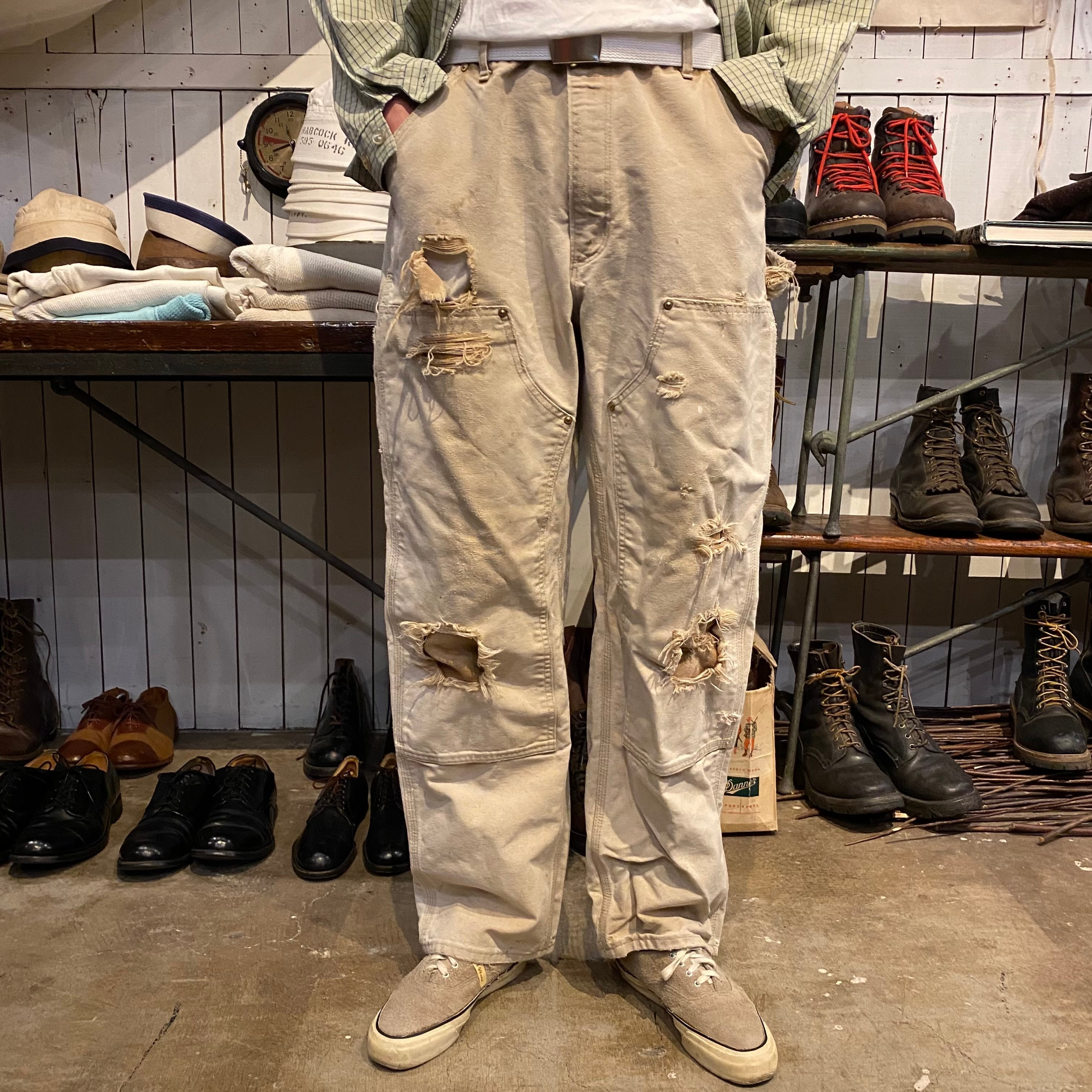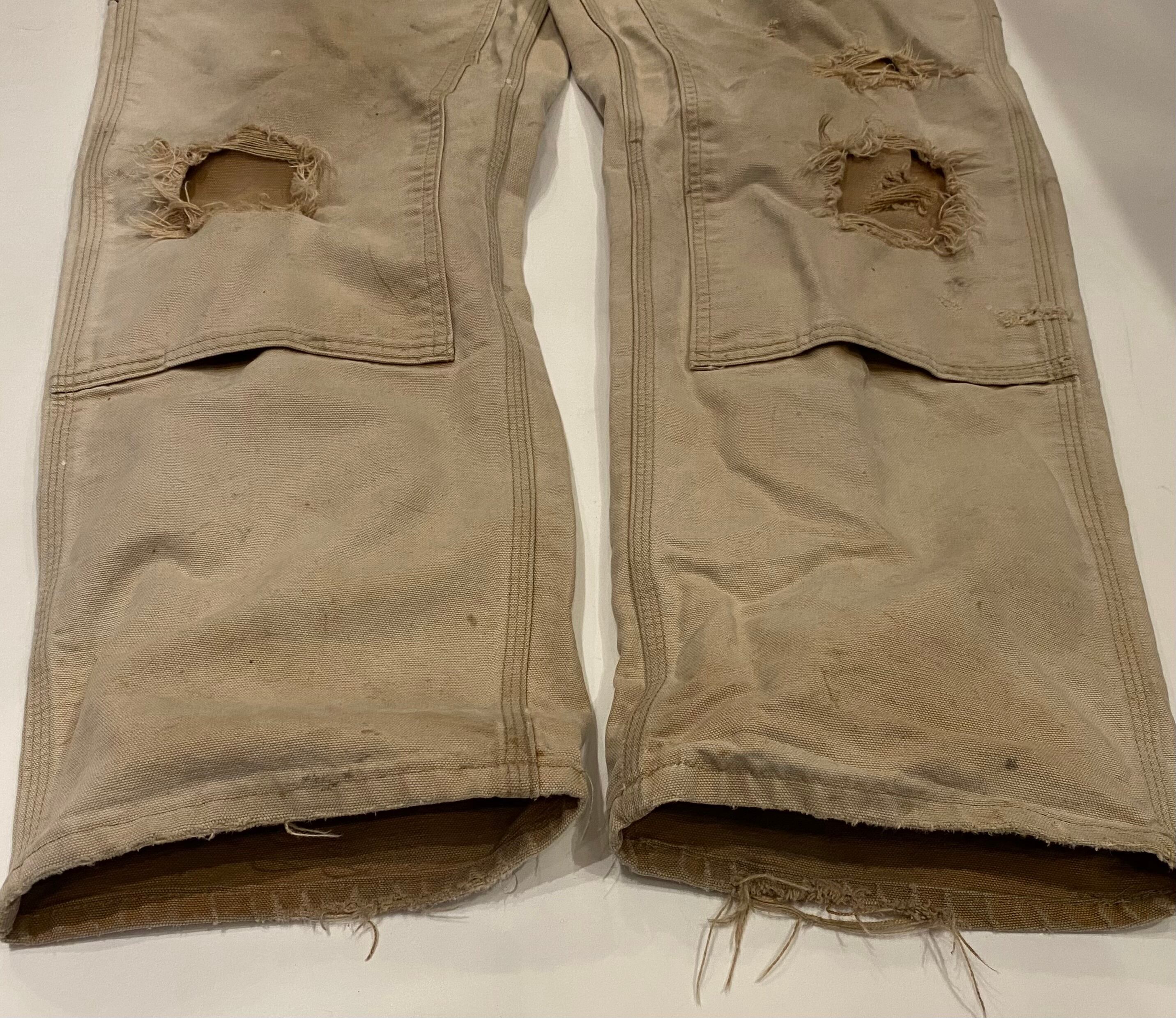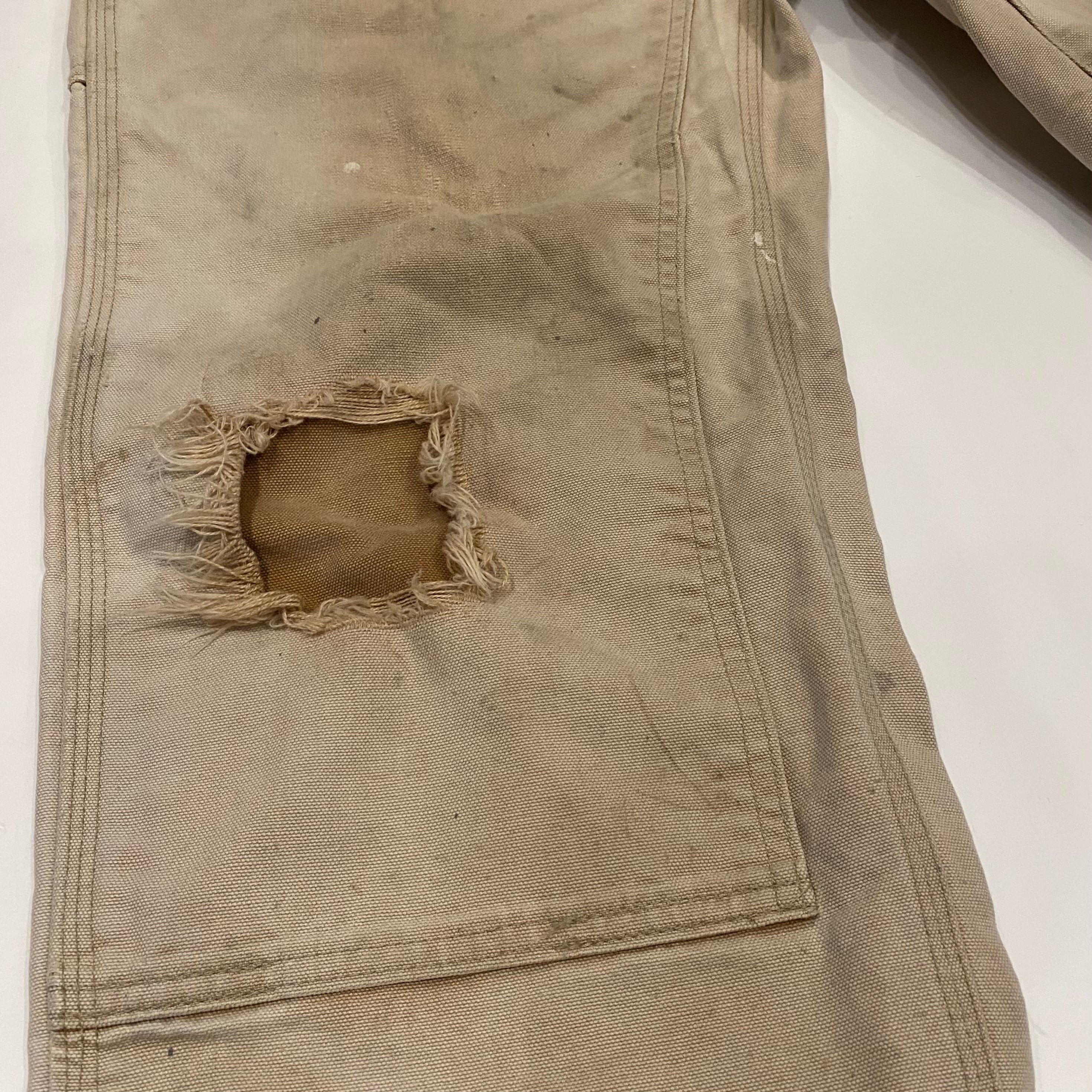 USA製のカーハート、全体的にダメージのあるカラーも白っぽくフェードしたダブルニーのワークパンツになります。洗濯済みです。しっかりとしたダック地でここまで穿きこまれた雰囲気は古着ならではでしょう。ダブルニー部分の穴から下の生地が見えてきている破れ方とか最高です。明るめのトーンのコーディネートにもぴったりだと思います。